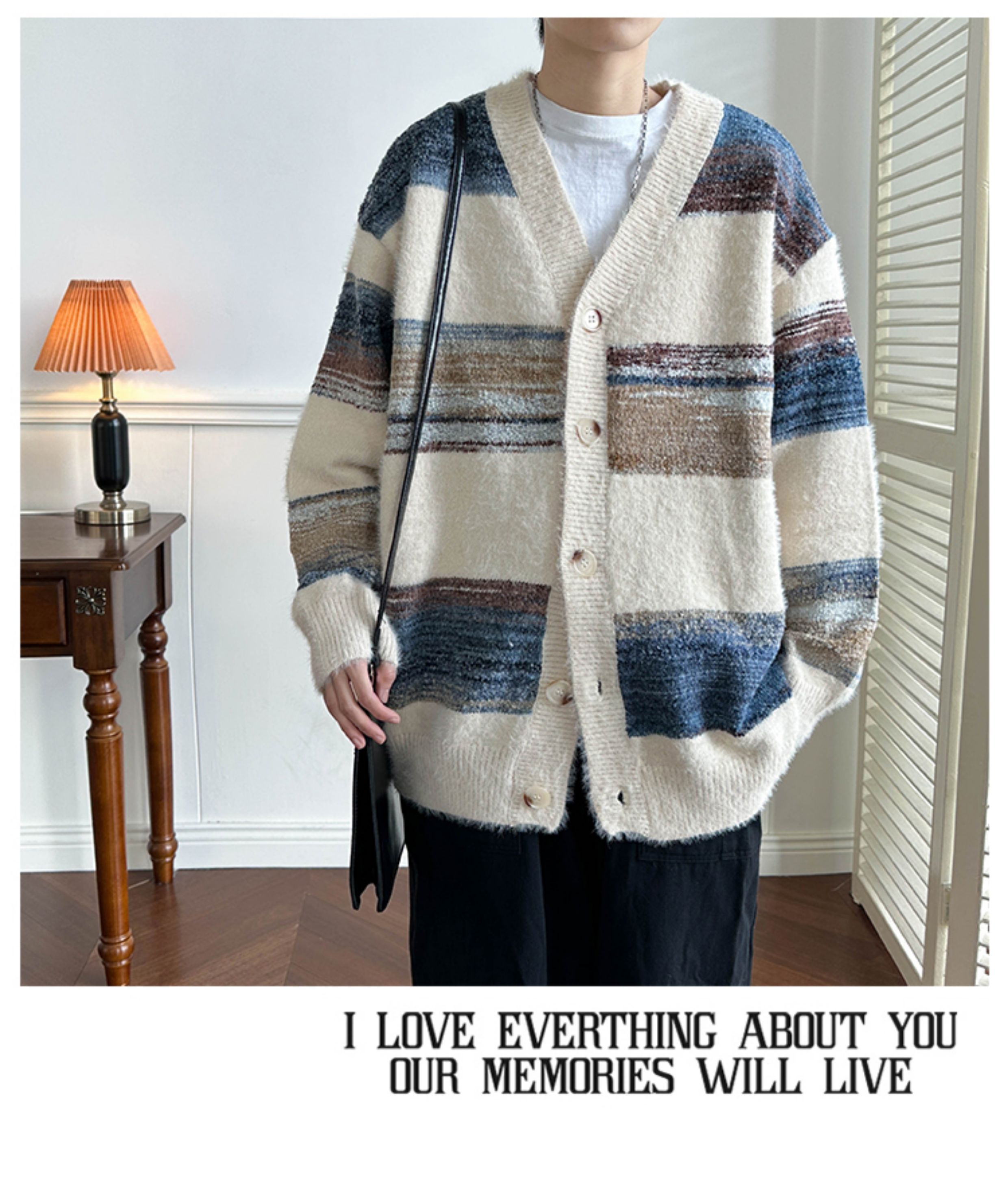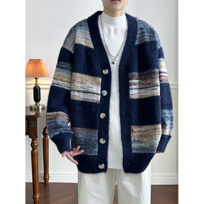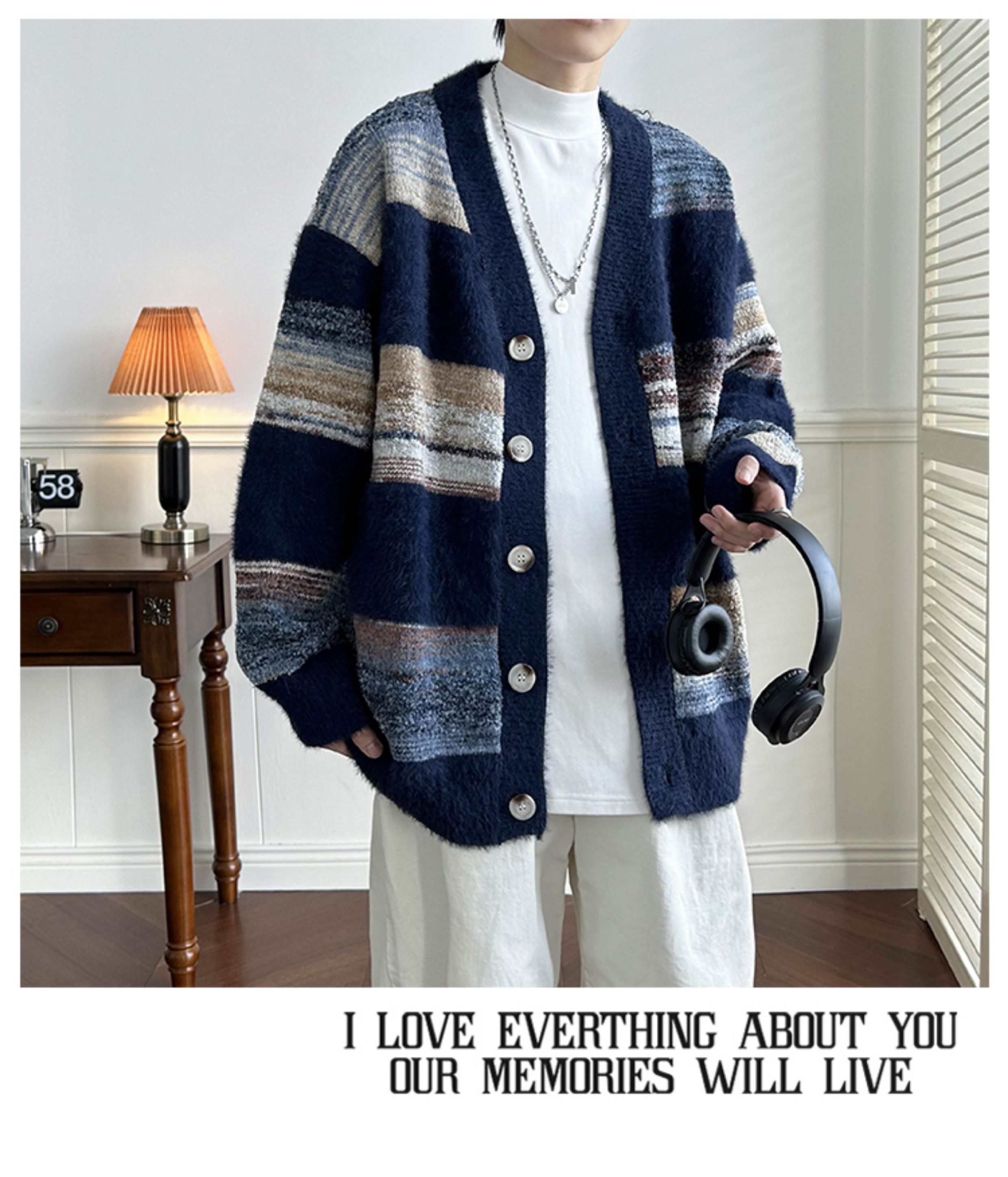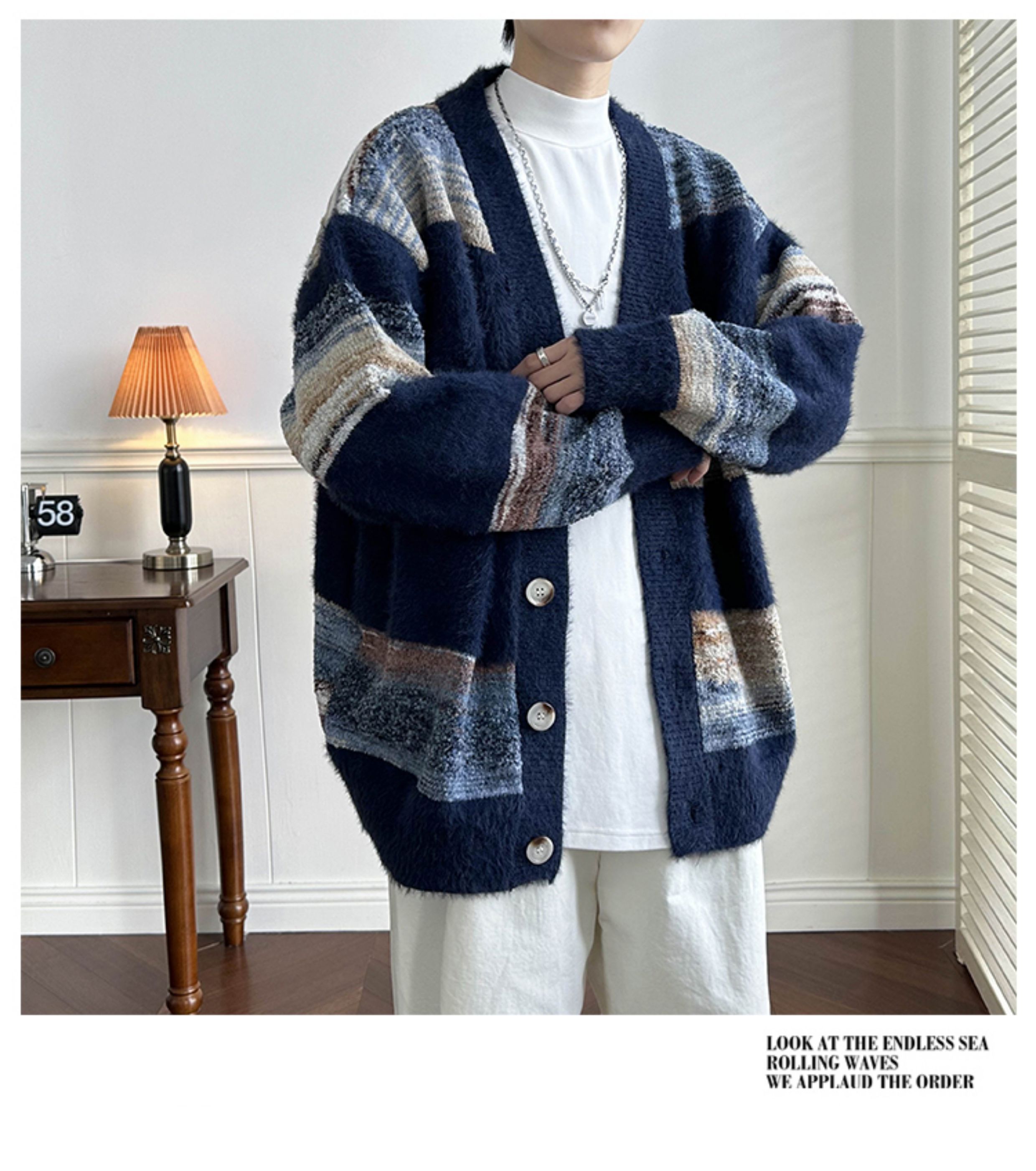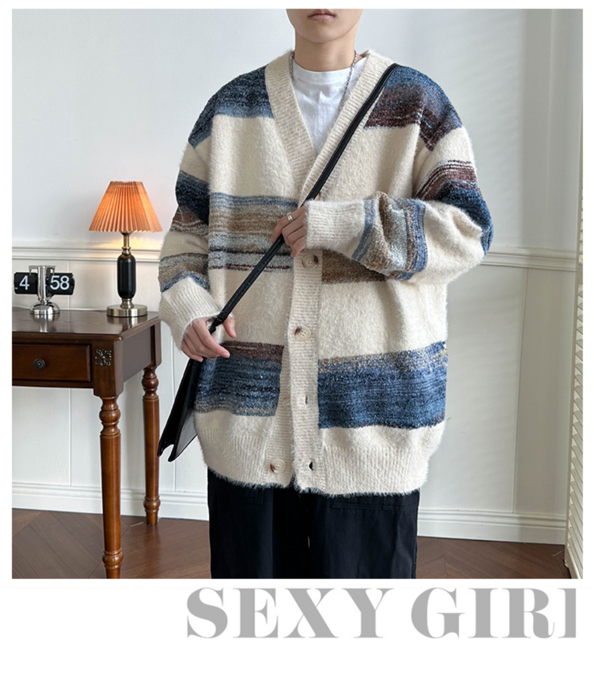 秋冬季拼色開衫毛衣美式復古情侶男針織衫潮牌ins寬松慵懶風外套