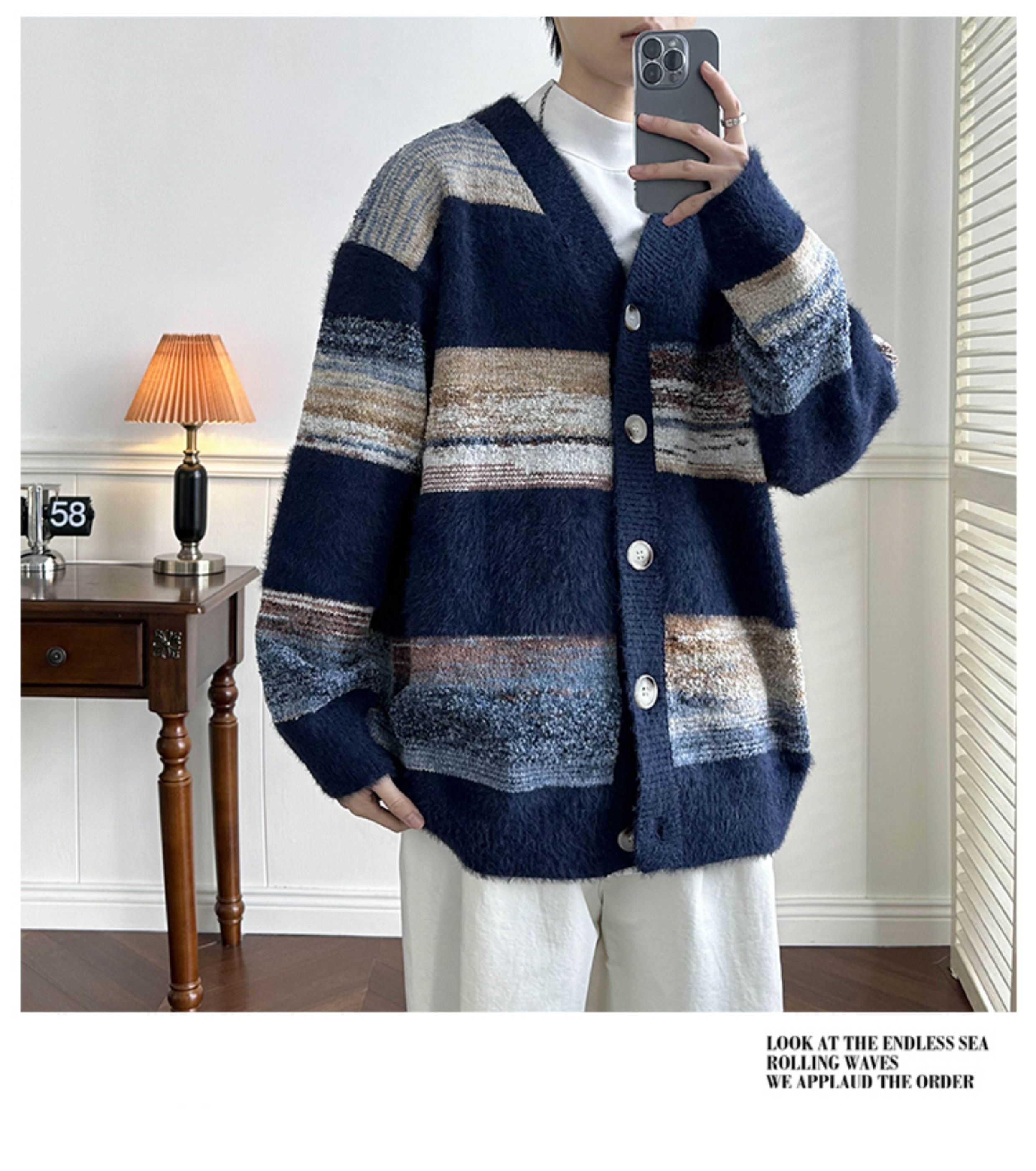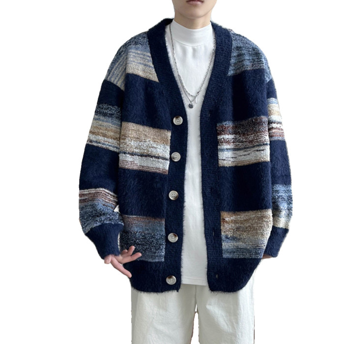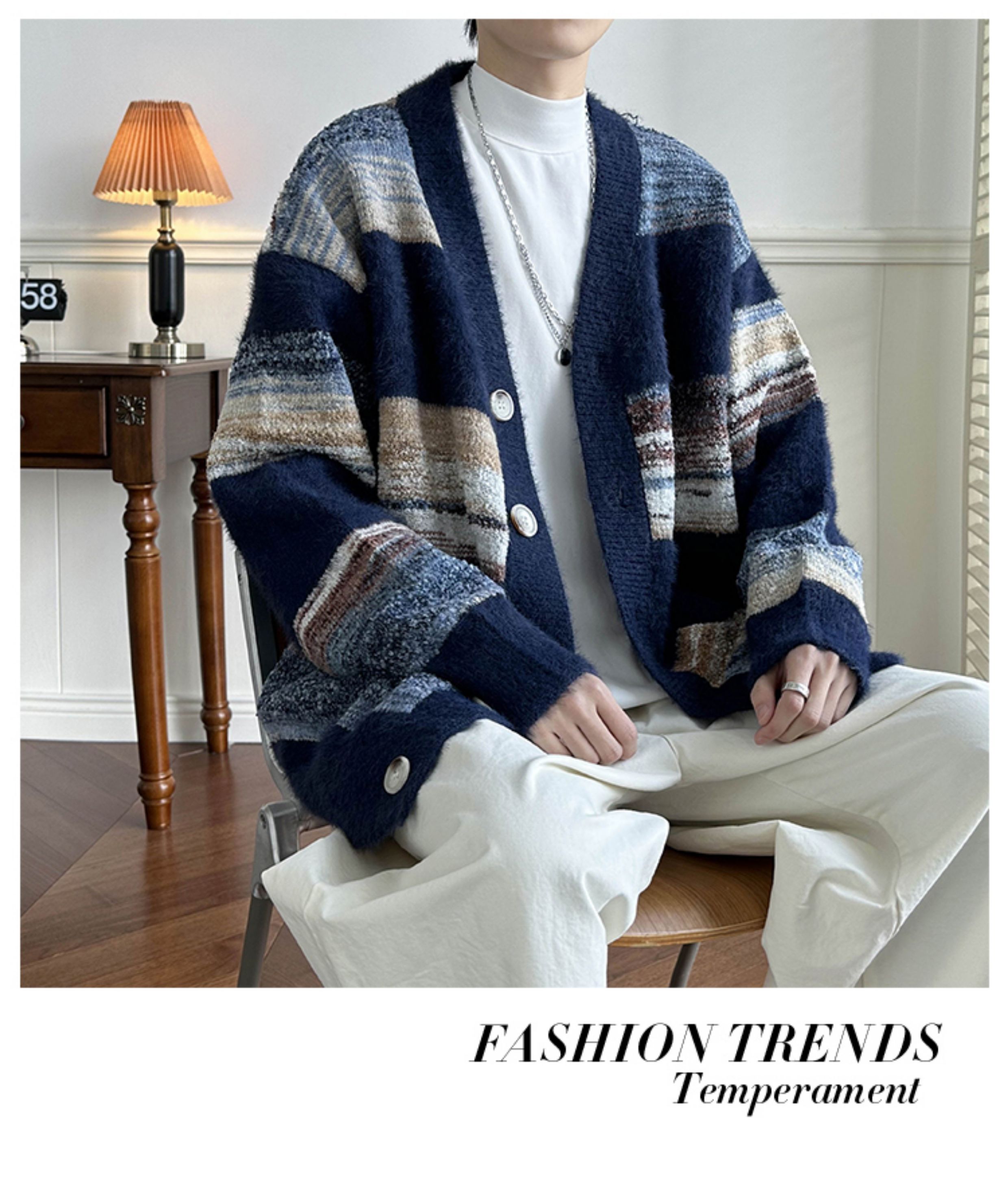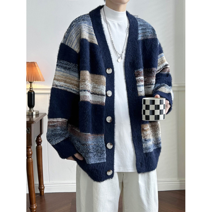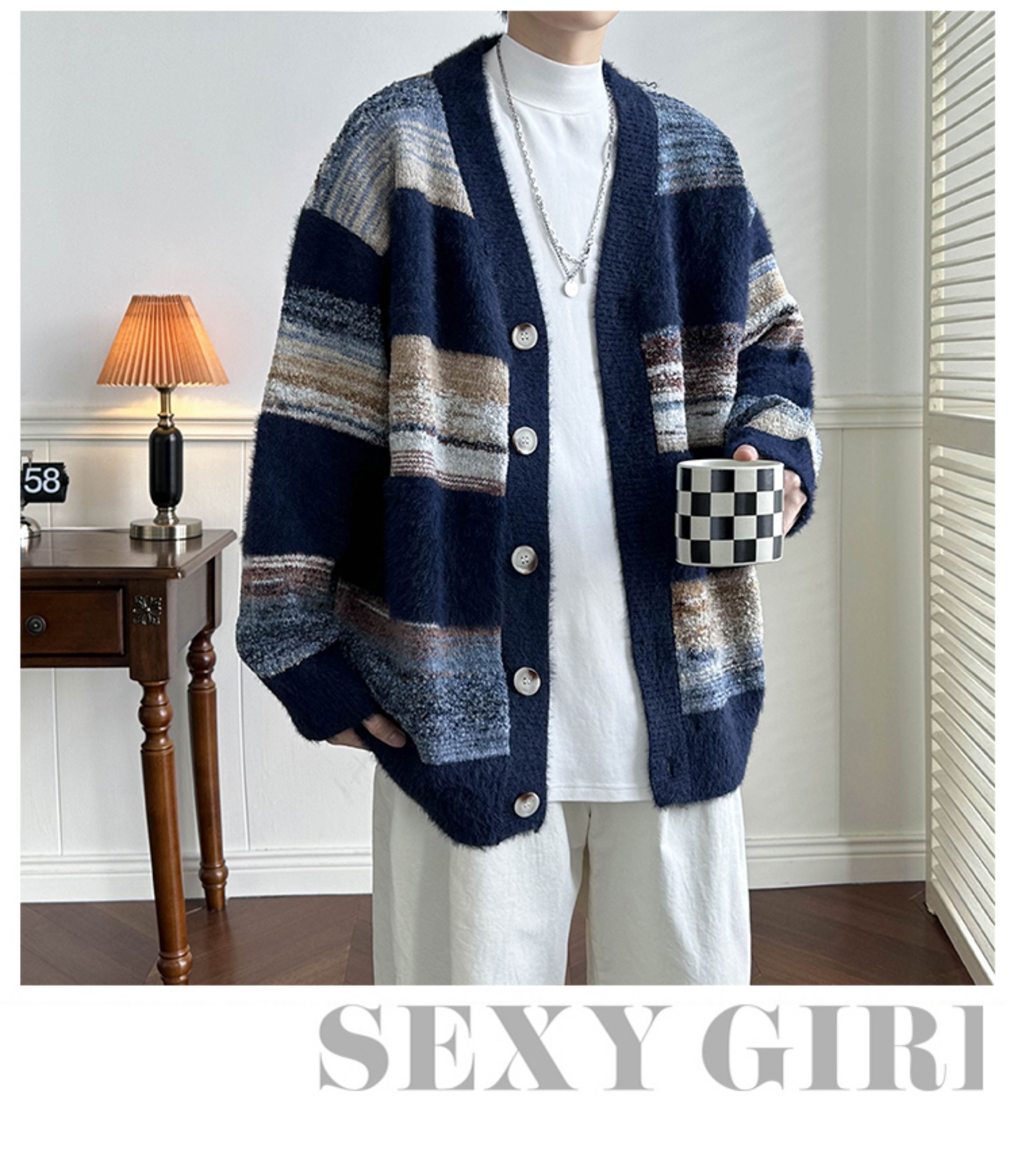 秋冬季拼色開衫毛衣美式復古情侶男針織衫潮牌ins寬松慵懶風外套