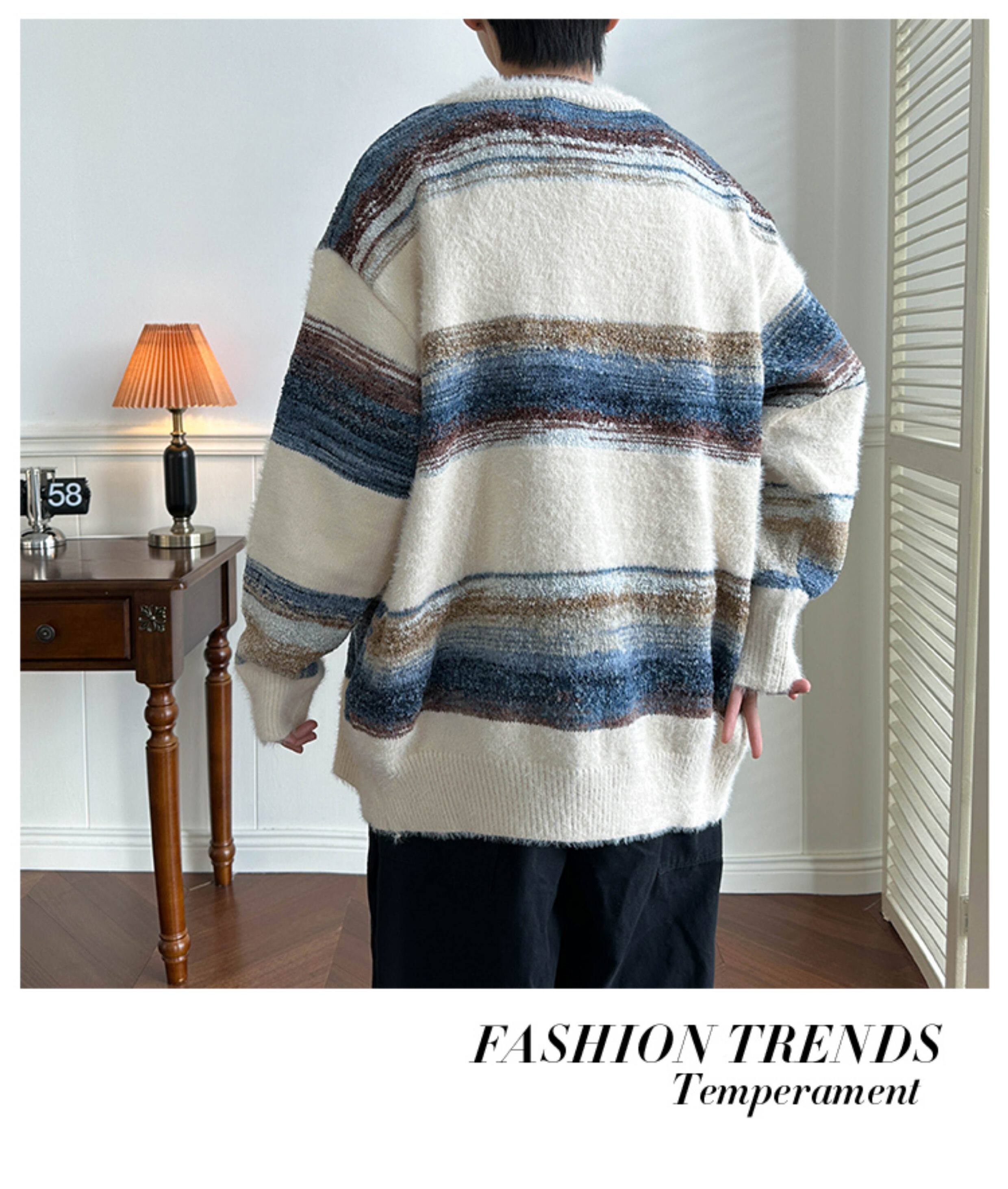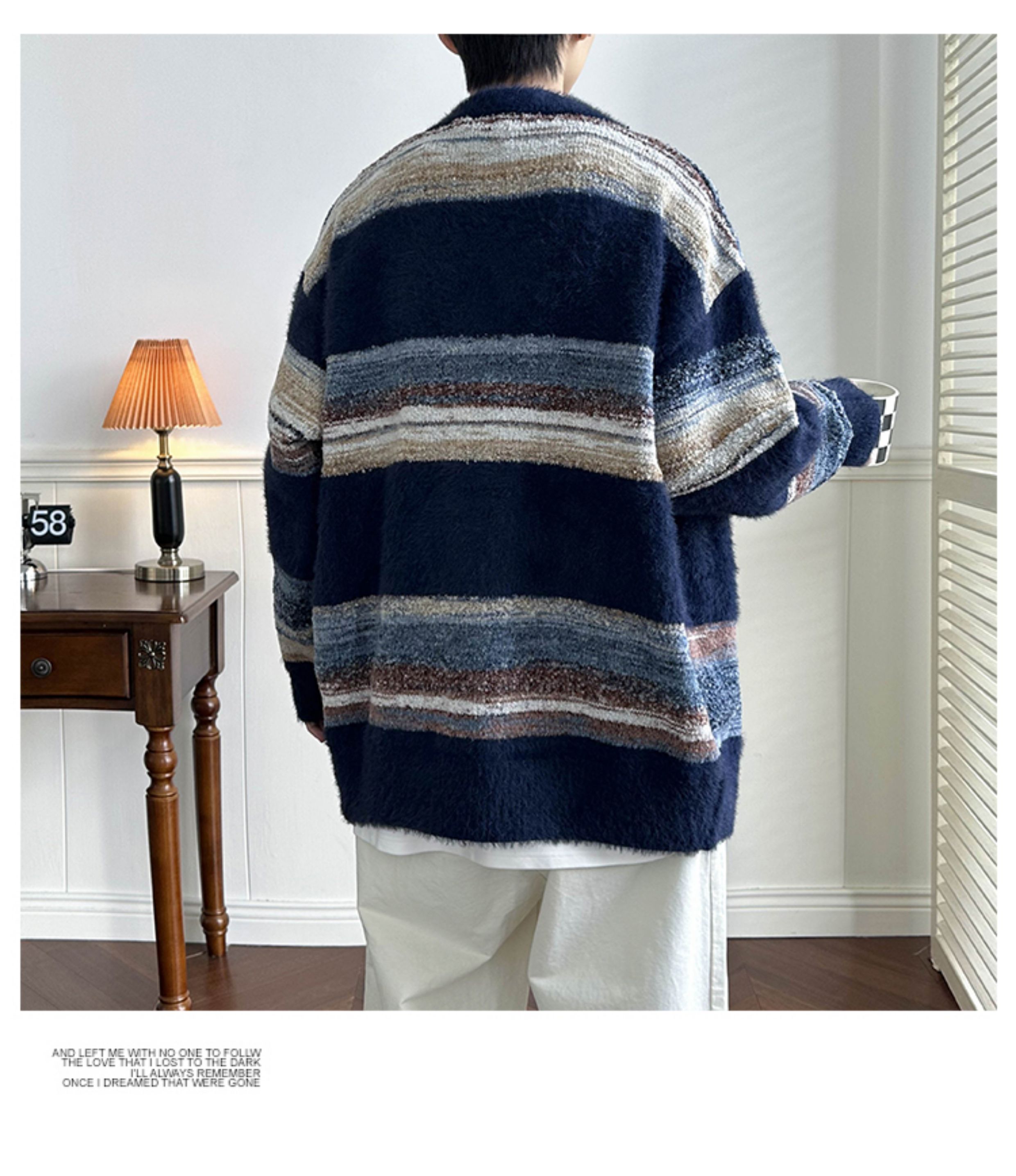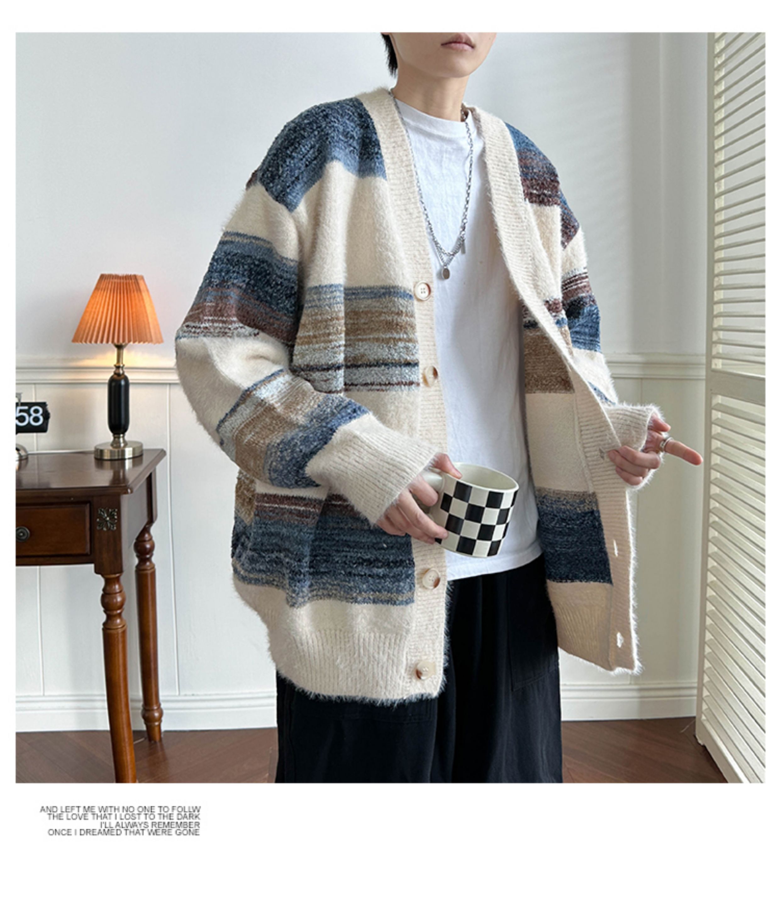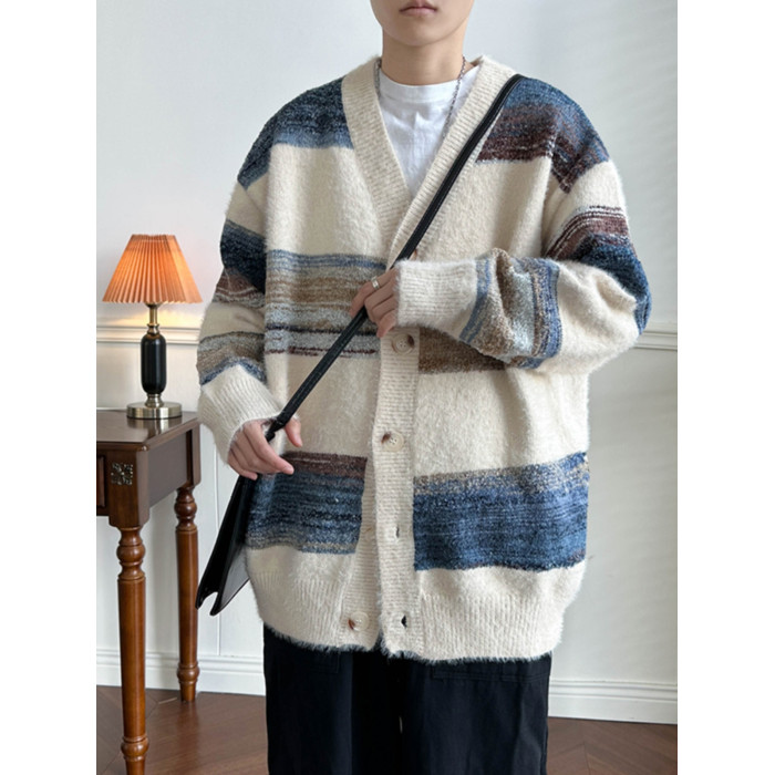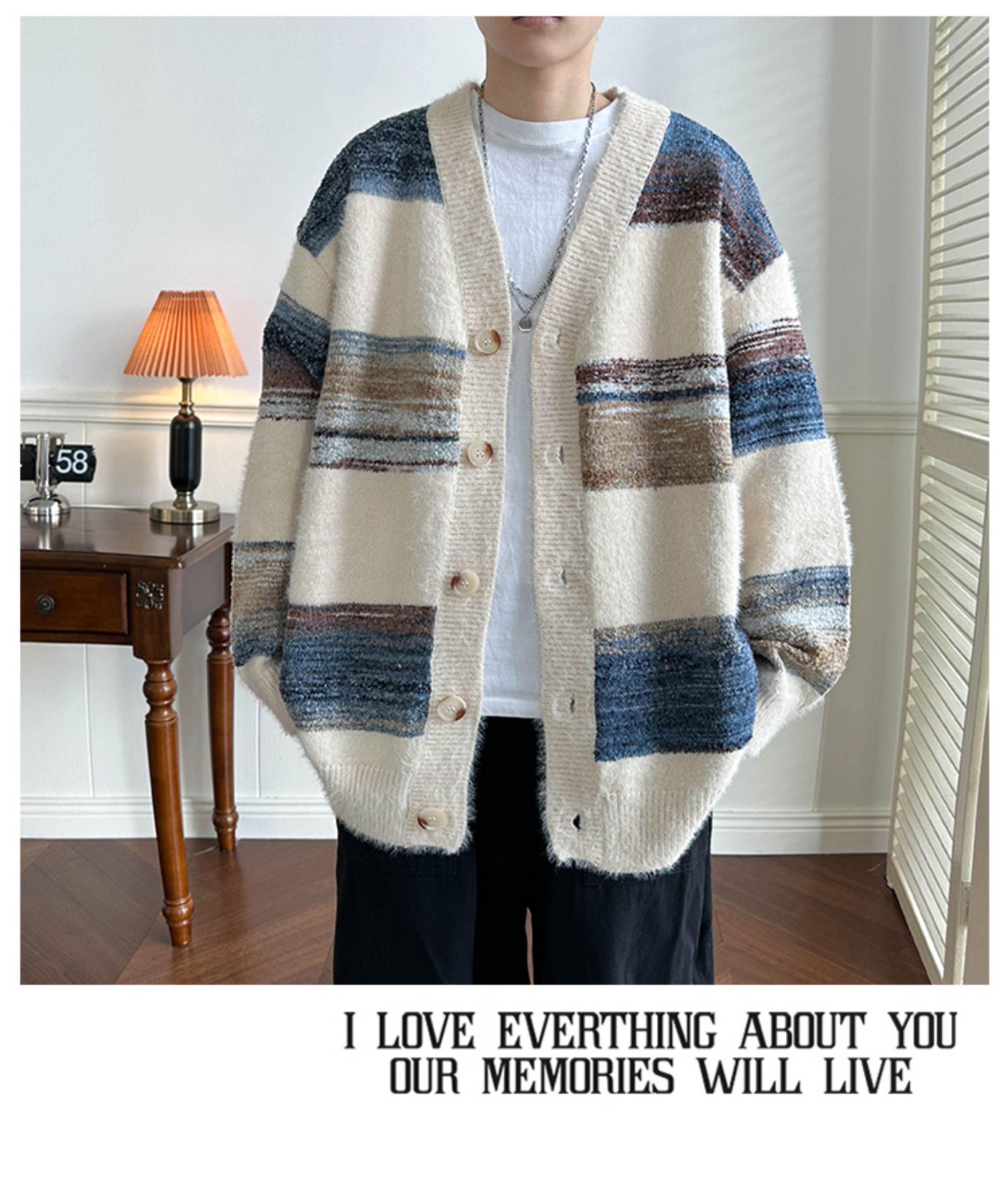秋冬季拼色開衫毛衣美式復古情侶男針織衫潮牌ins寬松慵懶風外套