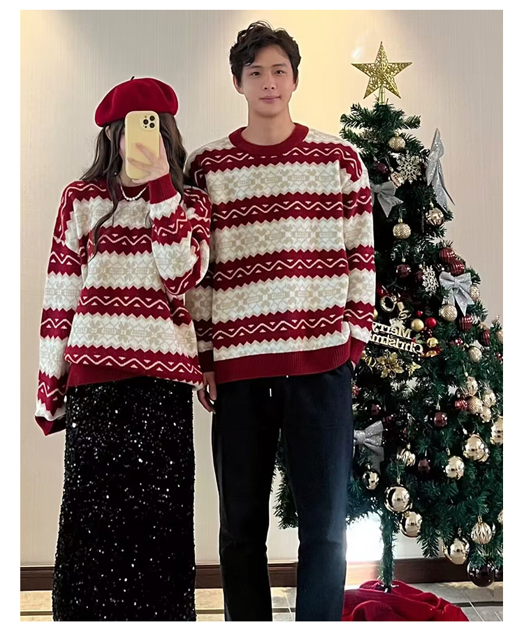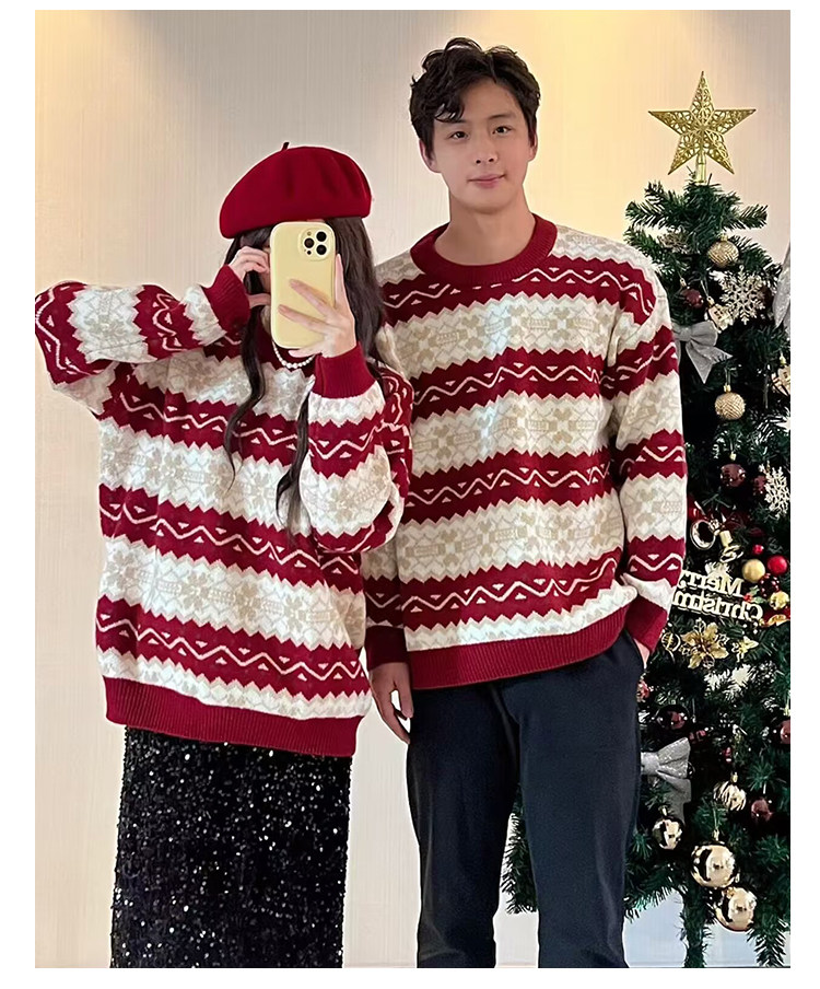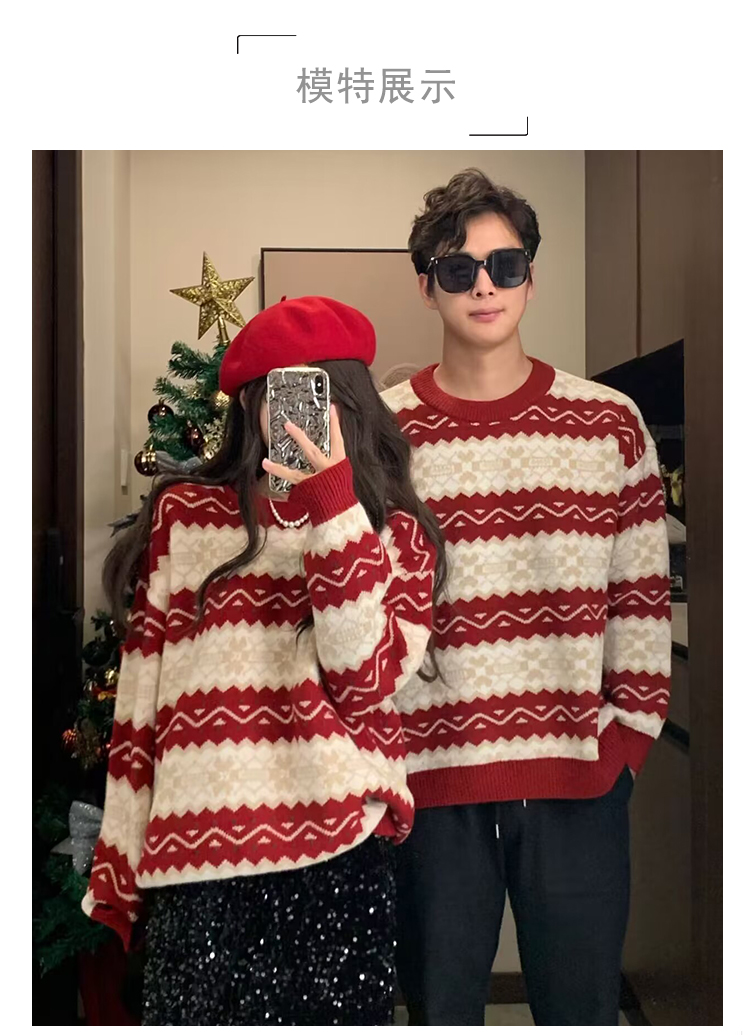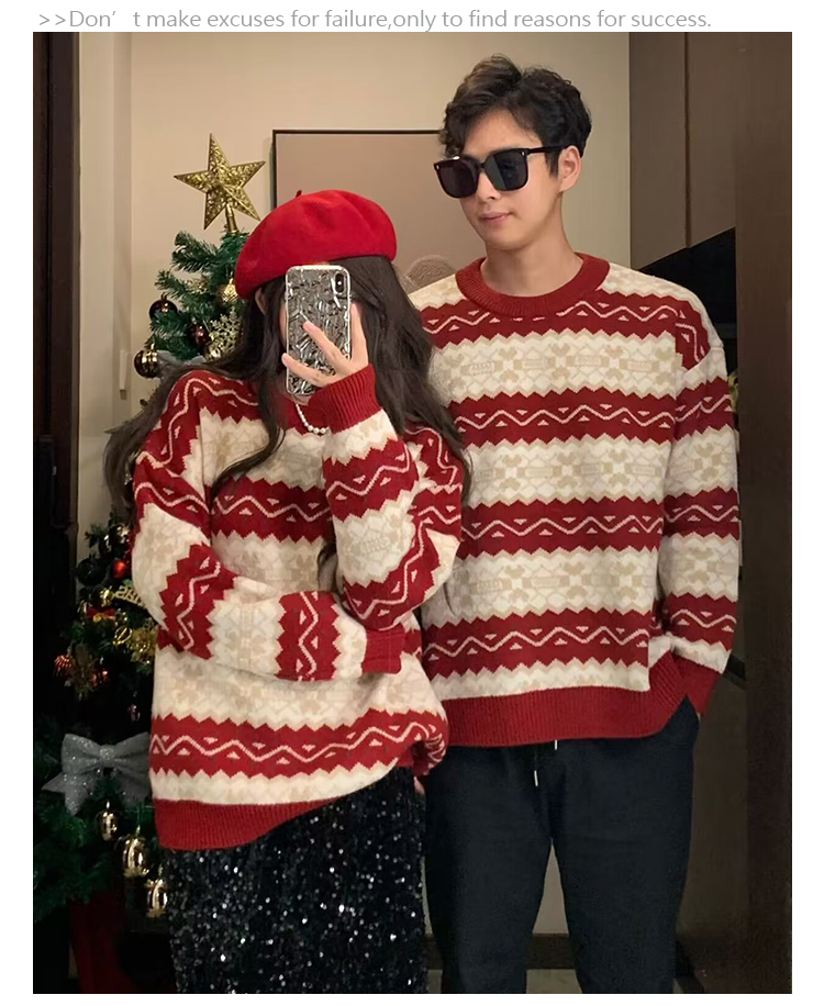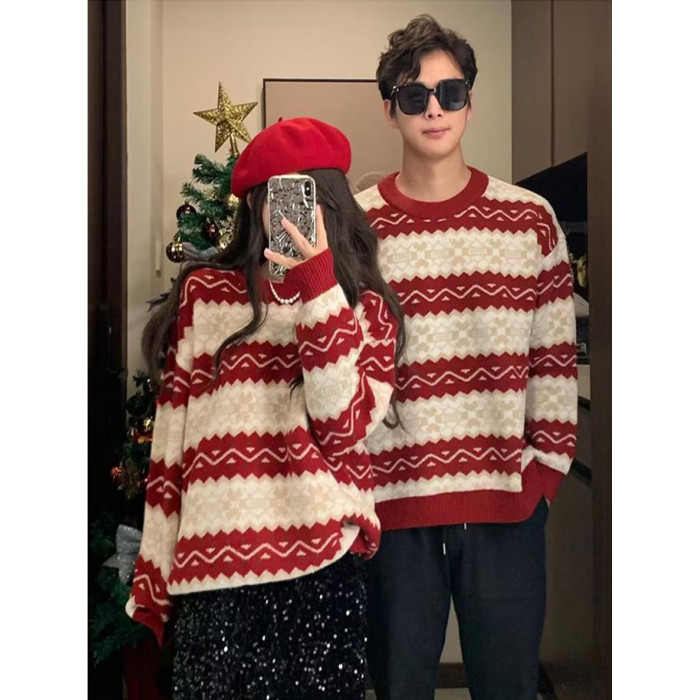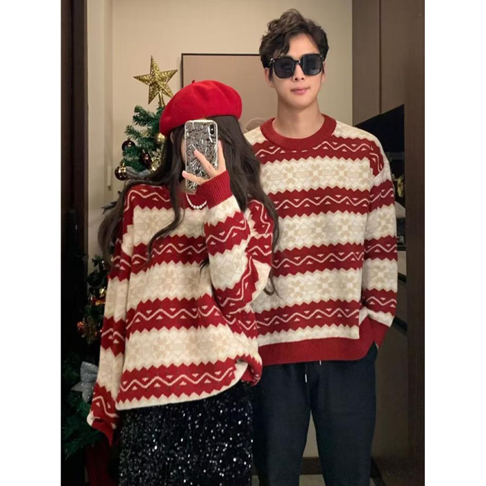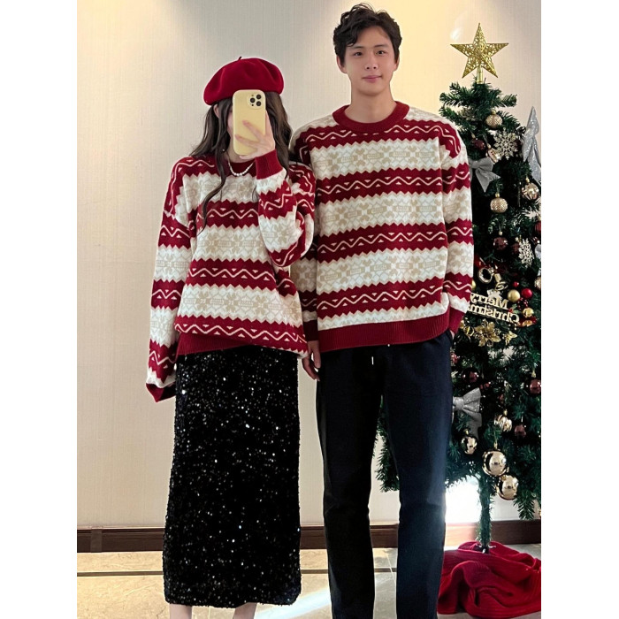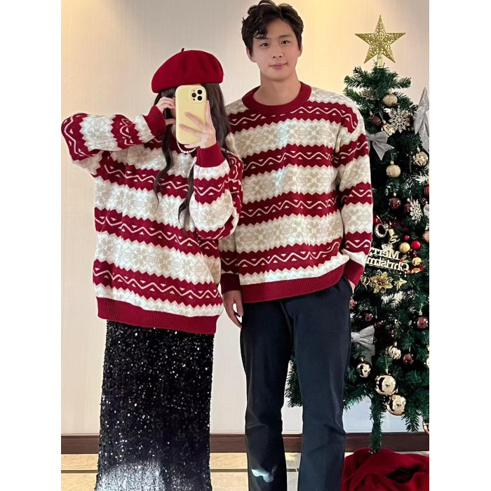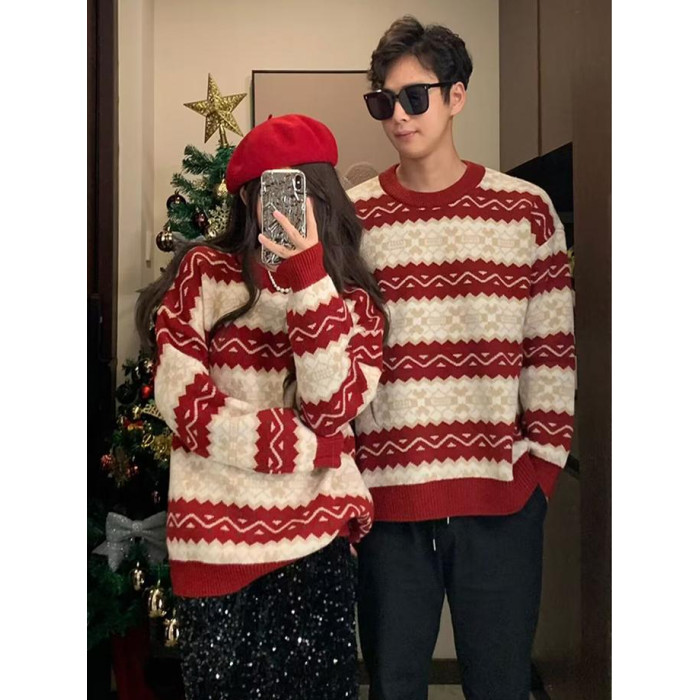 情侶裝秋冬新款費爾島復古提花紅色毛衣針織衫新年聖誕加厚毛線衣