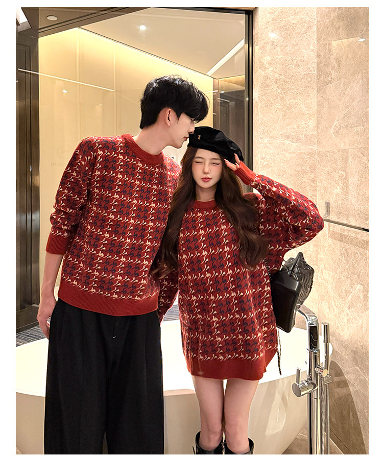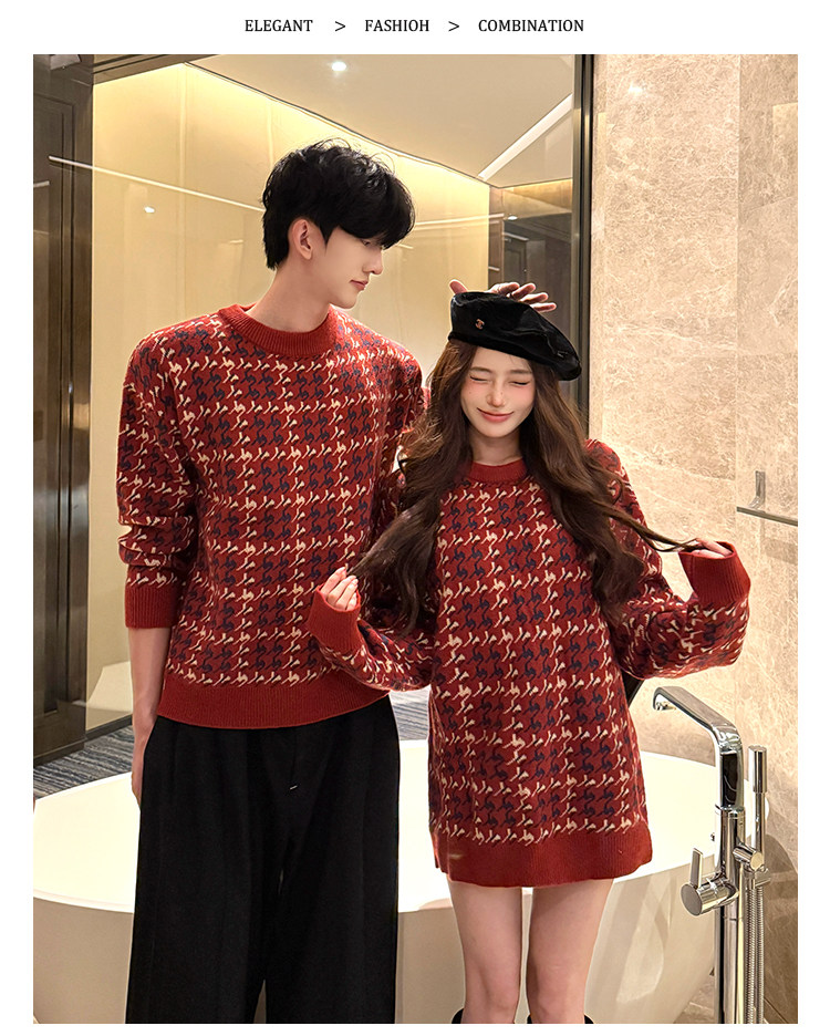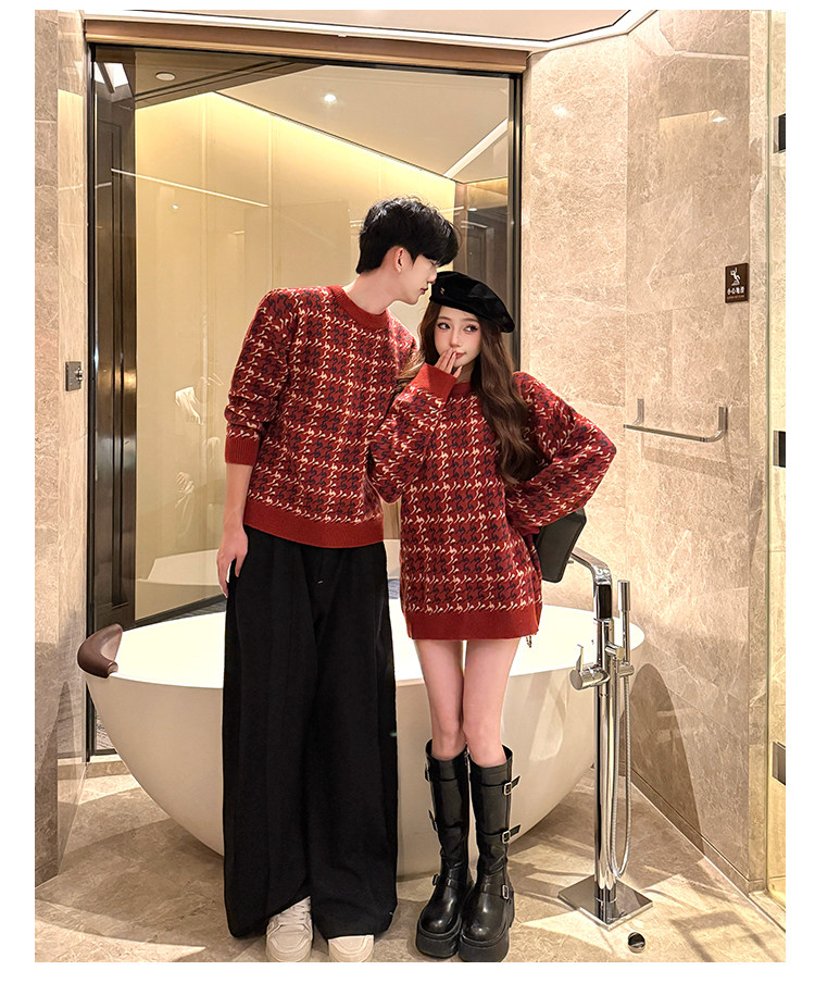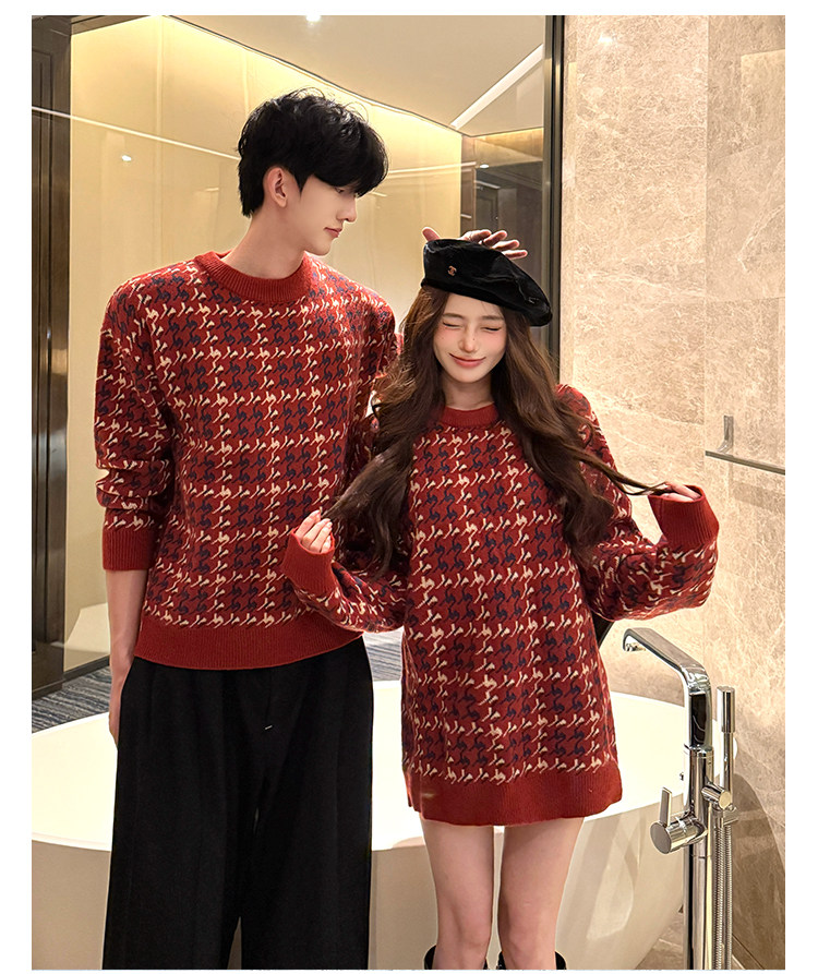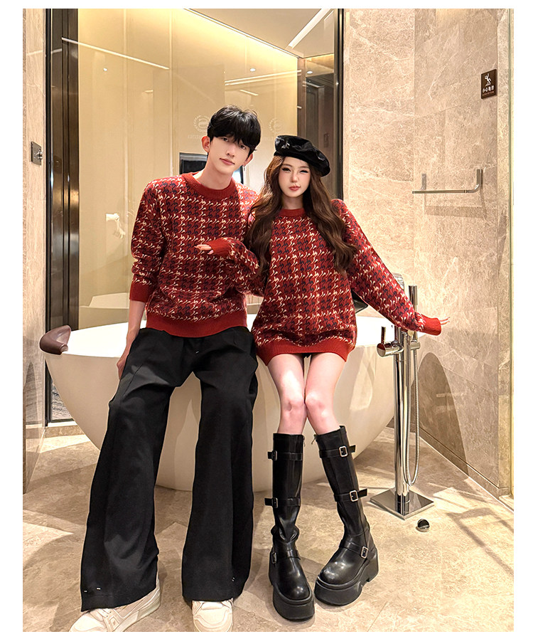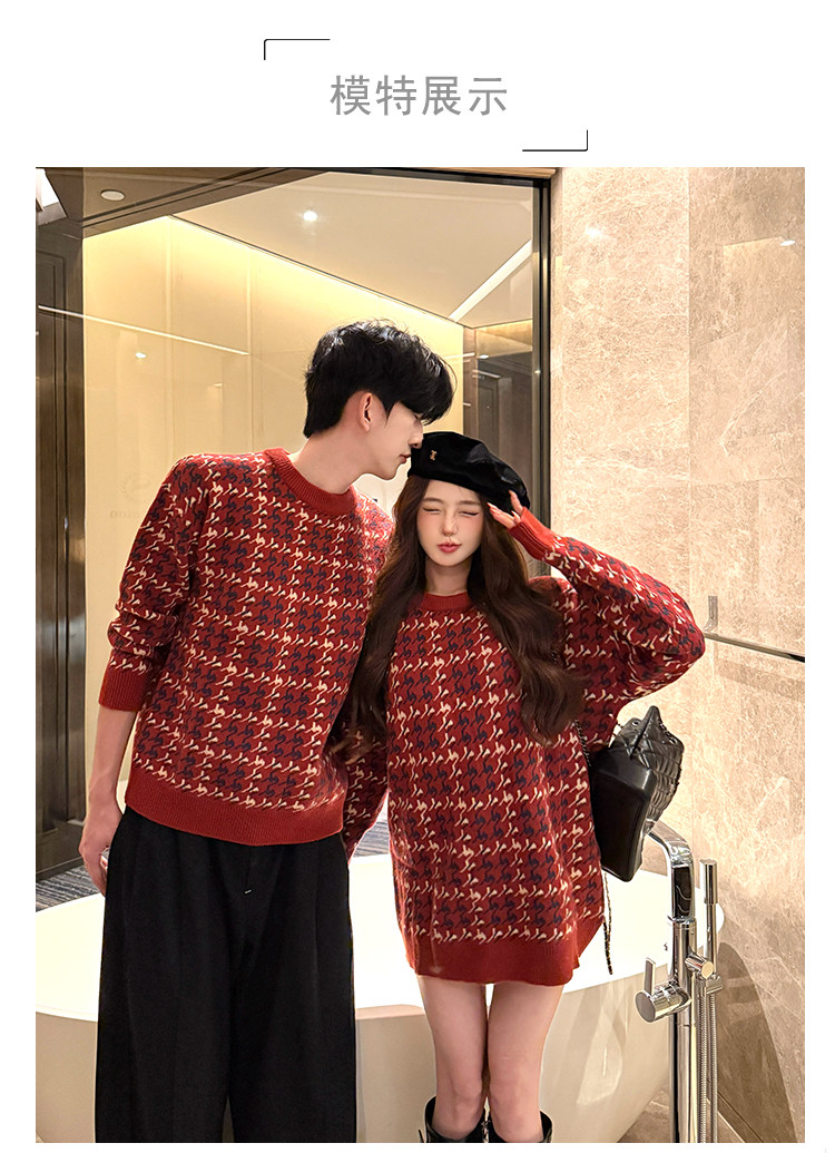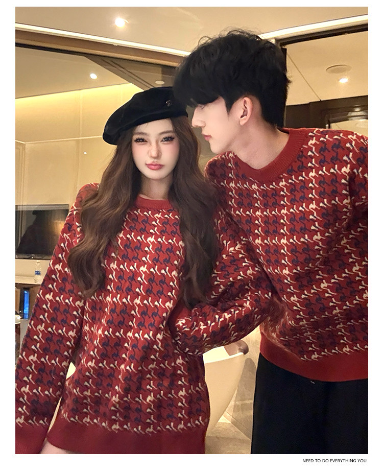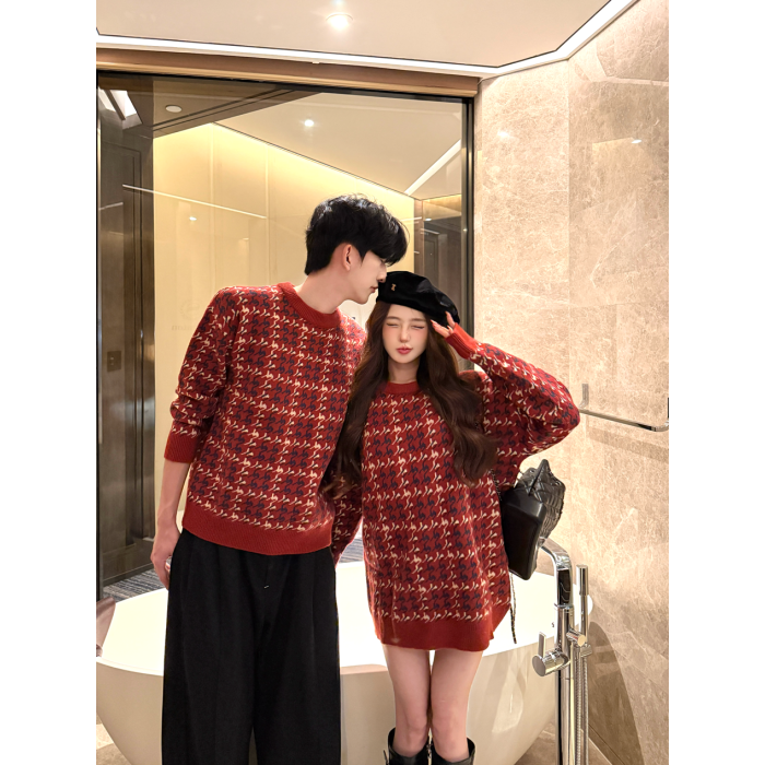 情侶裝秋冬新款千鳥格復古提花紅色毛衣針織衫新年聖誕加厚毛線衣