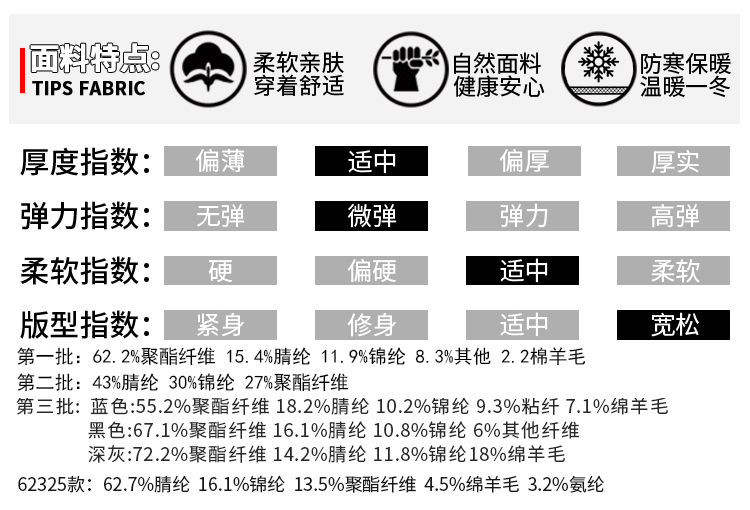 | 材質成分 | 聚酯纖維62.2% 聚丙烯腈纖維(腈綸)15.4% 聚醯胺纖維(錦綸)11.9% 其他材質8.3% 綿羊毛2.2% |