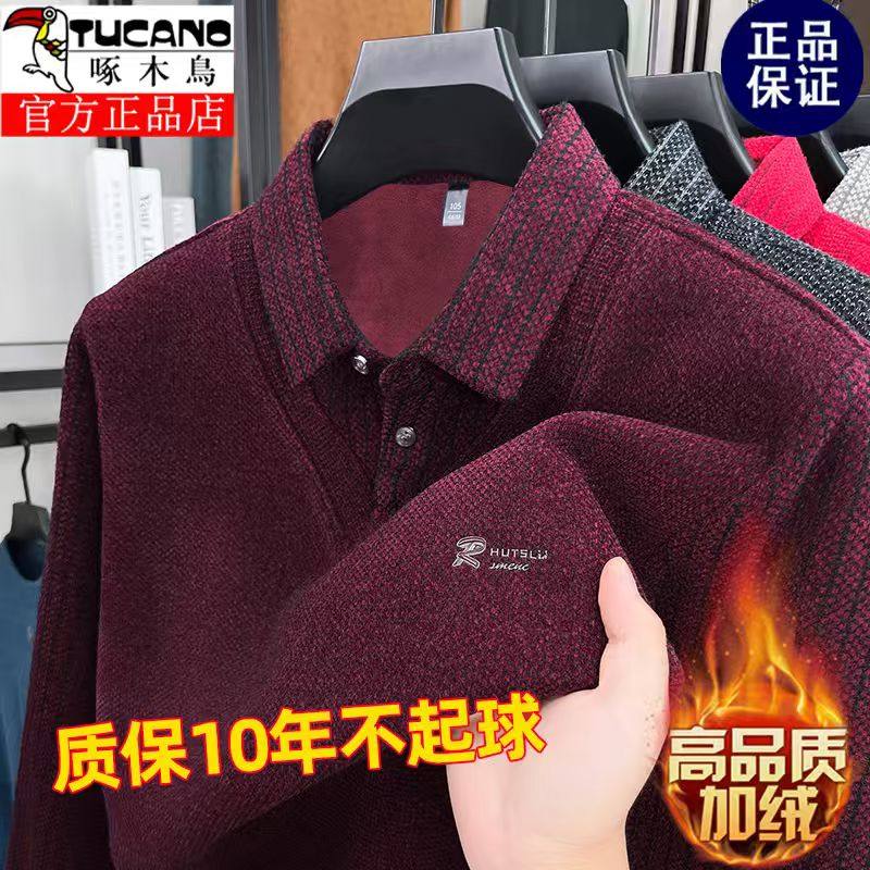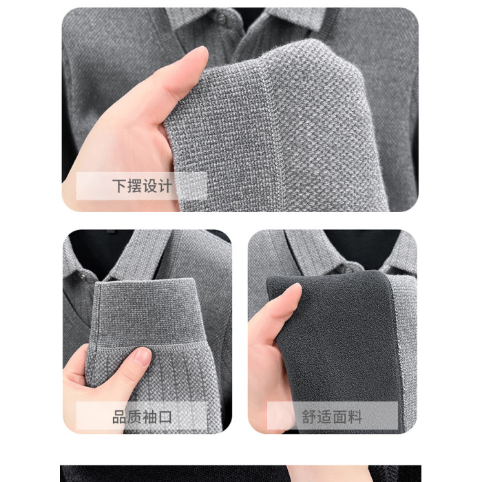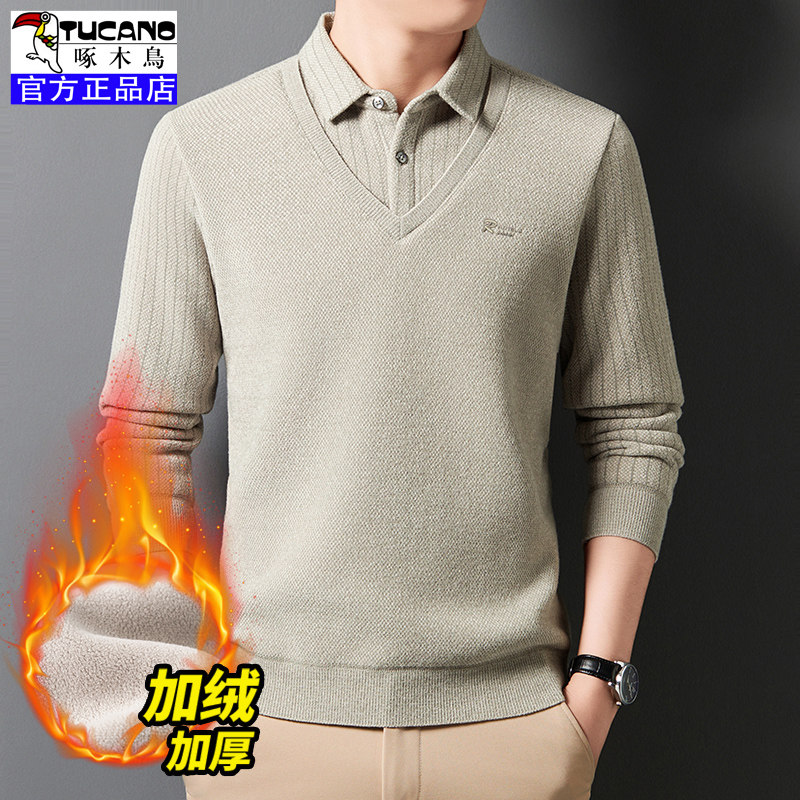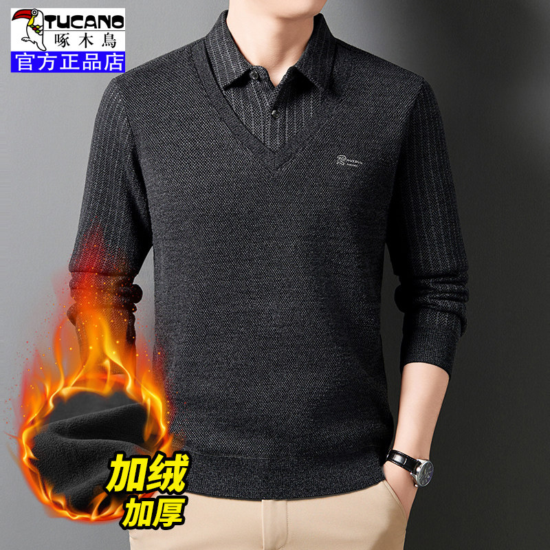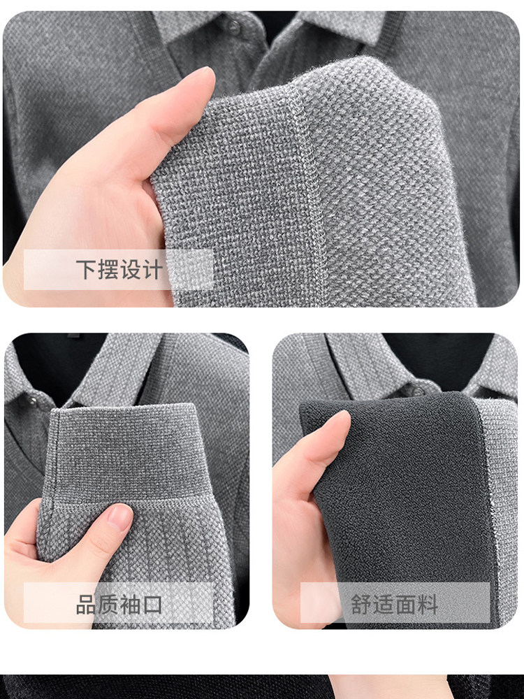 啄木鳥爸爸冬裝毛衣加絨加厚中老年男士假兩件保暖型襯衫領打底衫