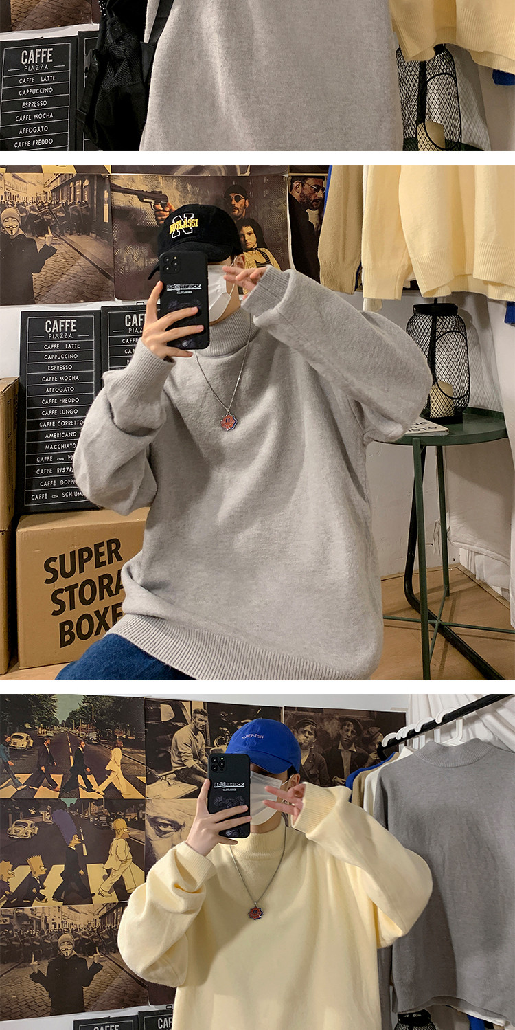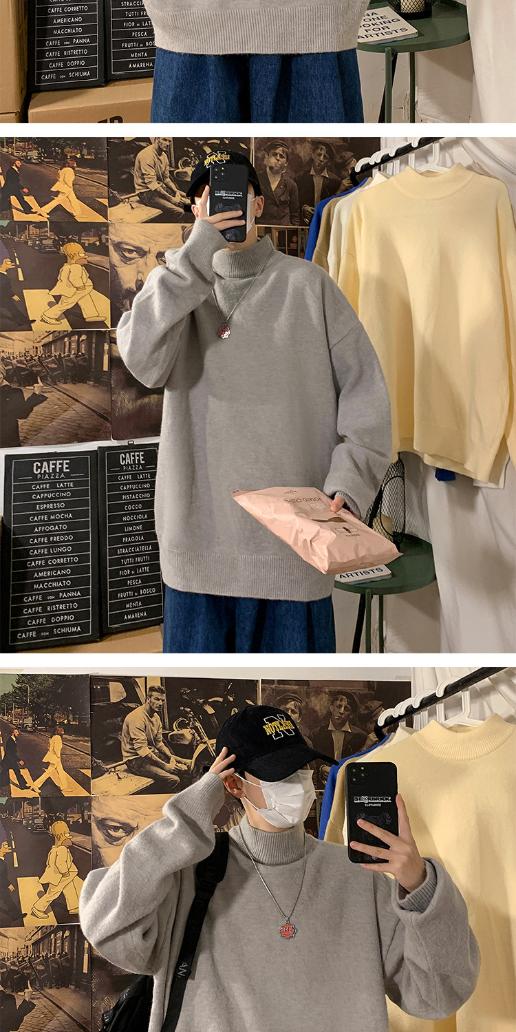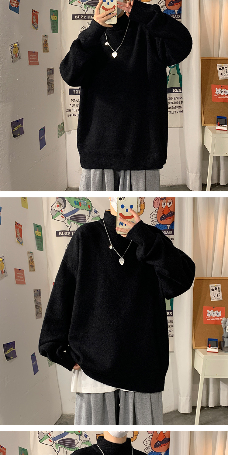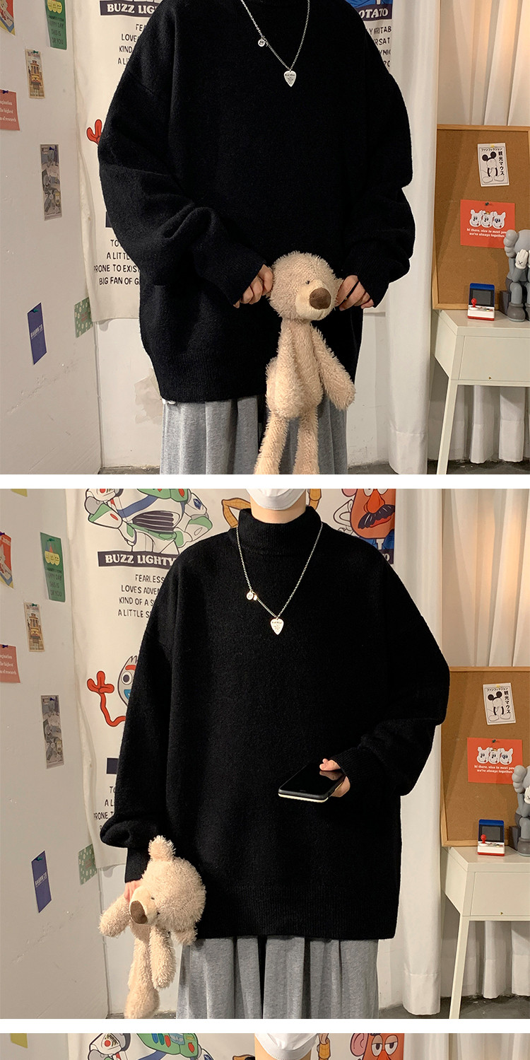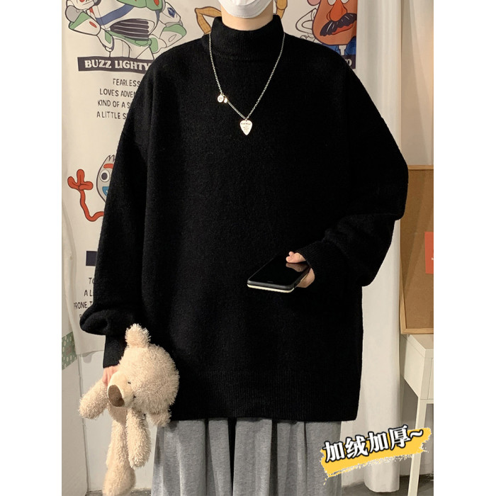 黑色半高領毛衣男生冬季加絨加厚極簡風軟糯慵嬾內搭打底針織毛衫
