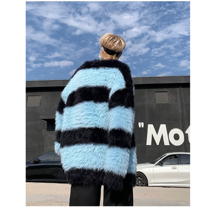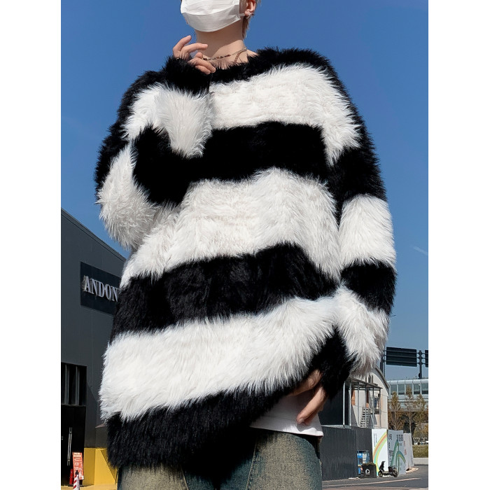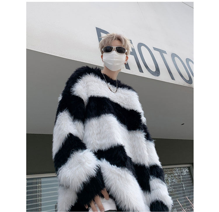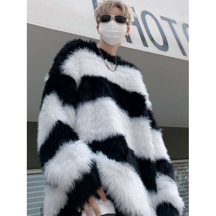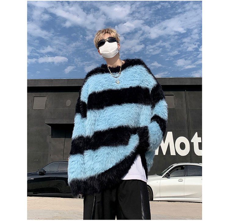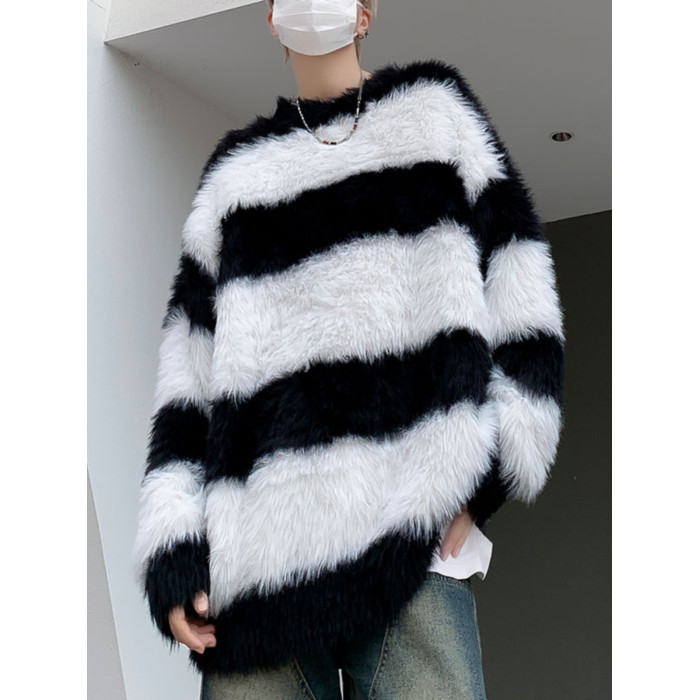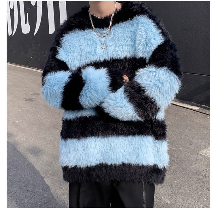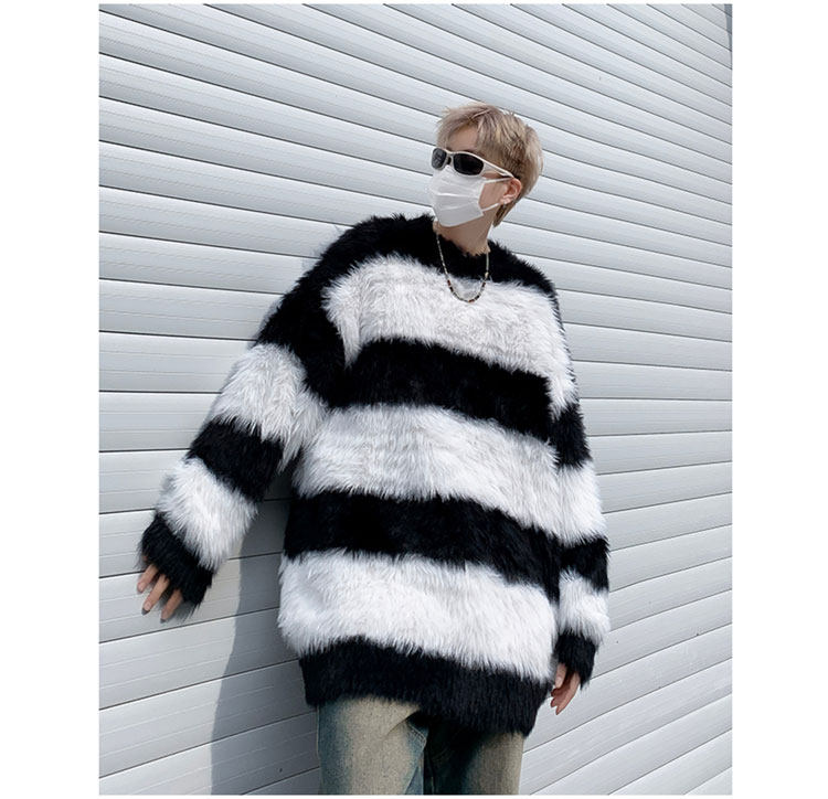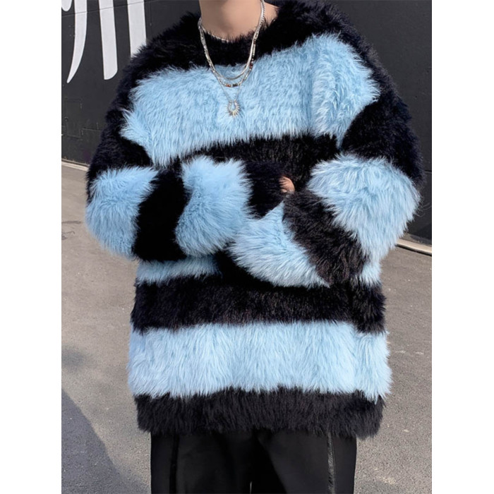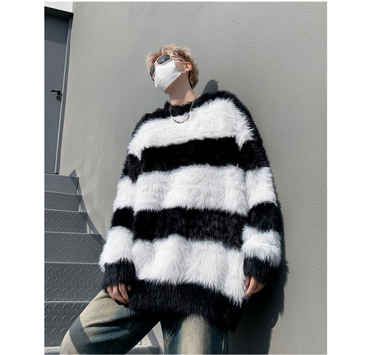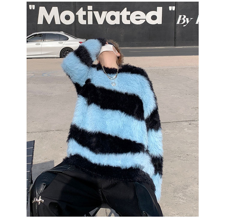 秋冬水貂絨條紋毛衣男圓領套頭休閒潮牌韓系學生百搭青少年針織衫