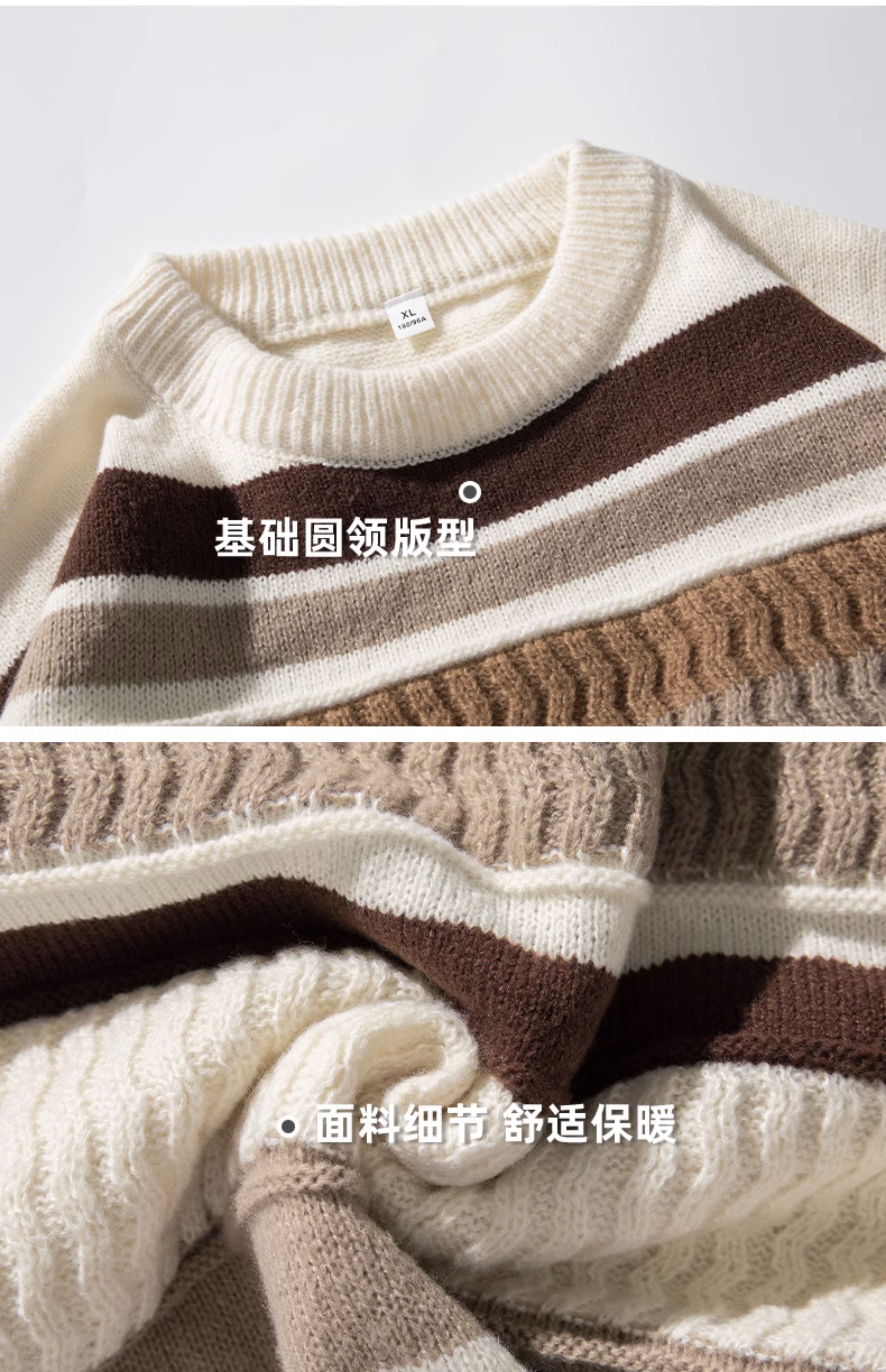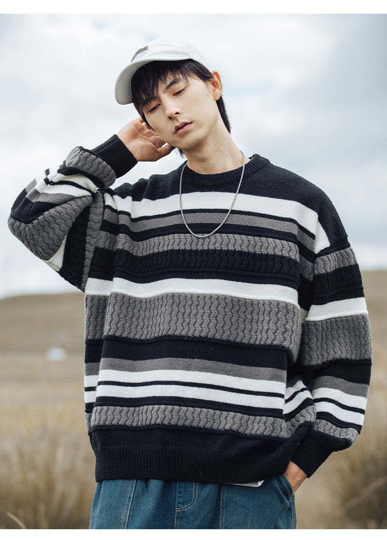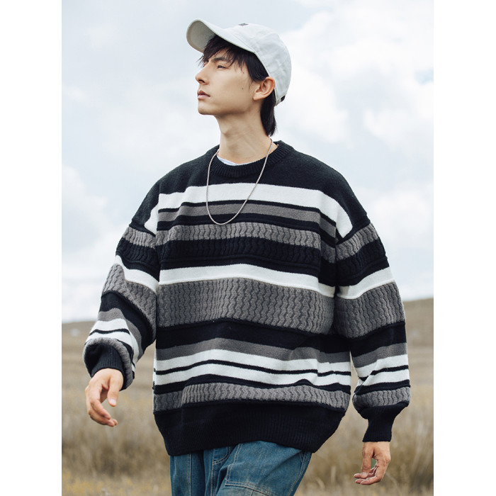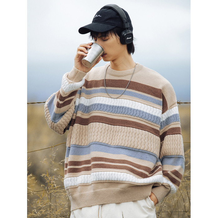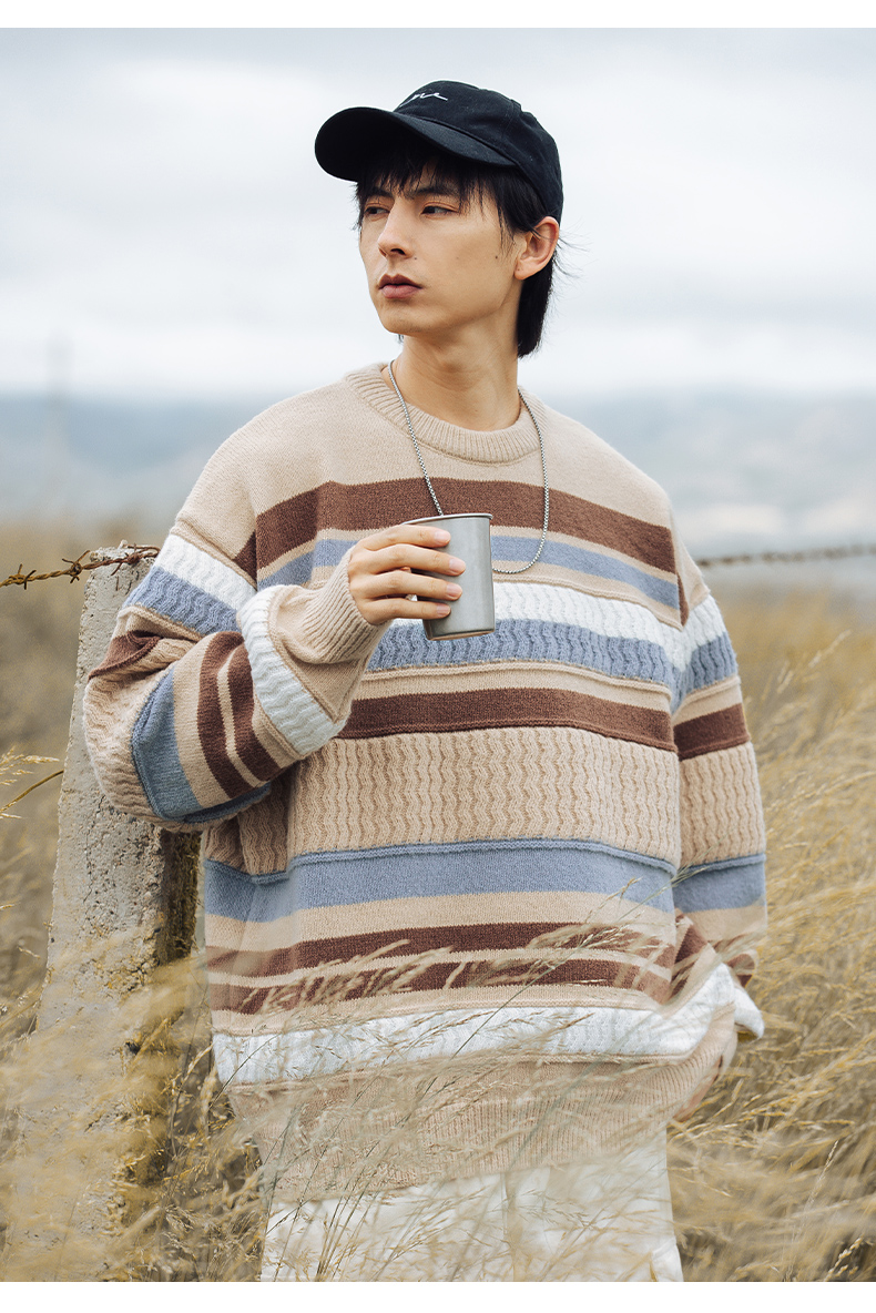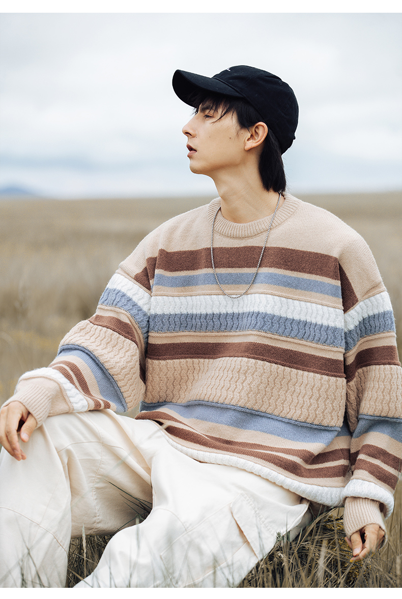 秋冬慵懶條紋撞色毛衣冬季山系休閒寬松暖男秋裝復古保暖針織衫男