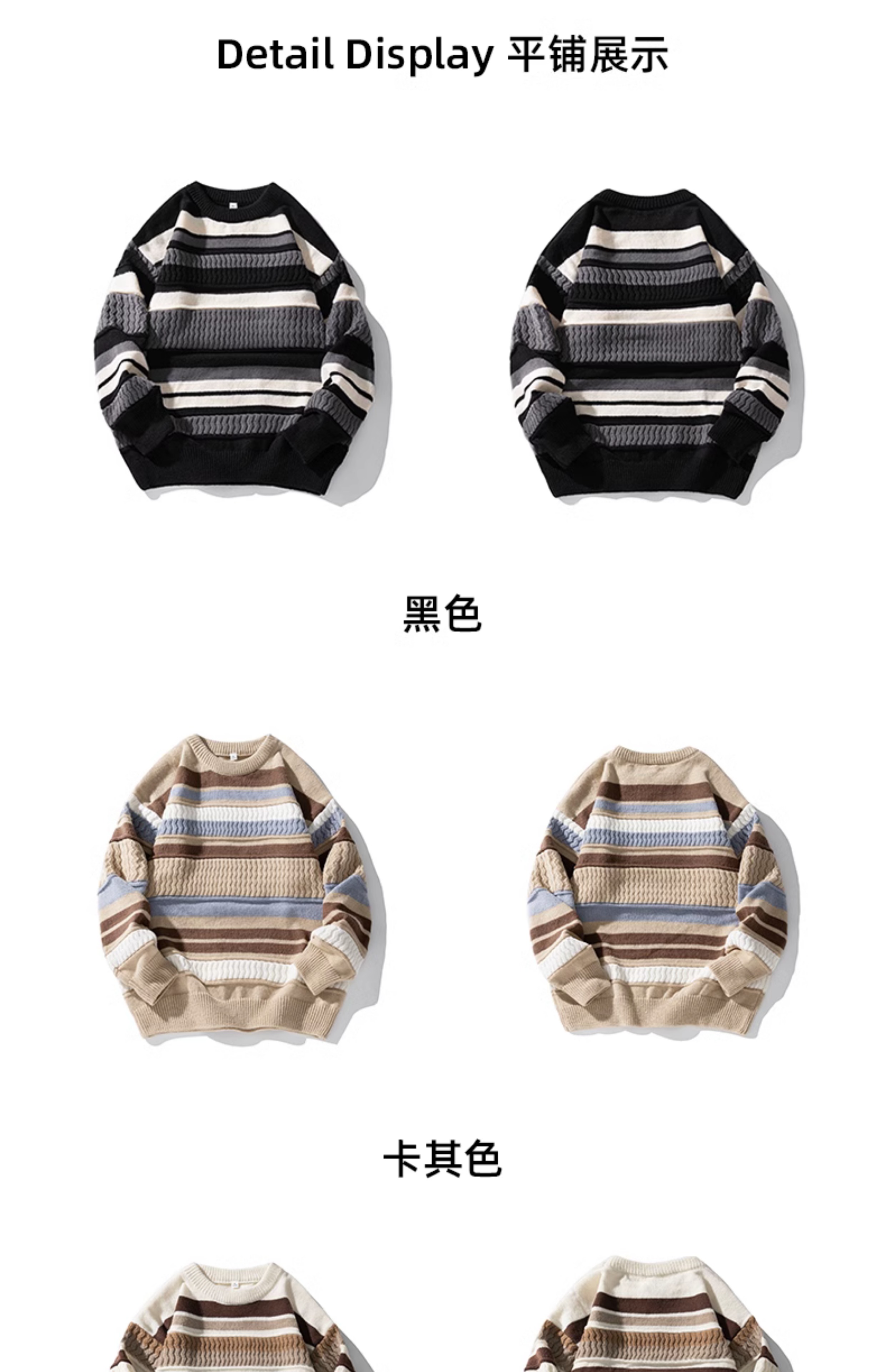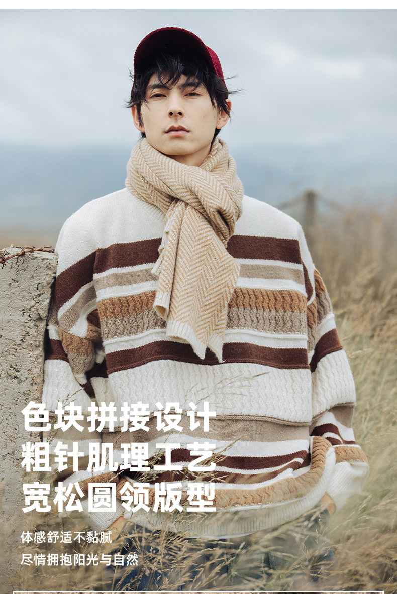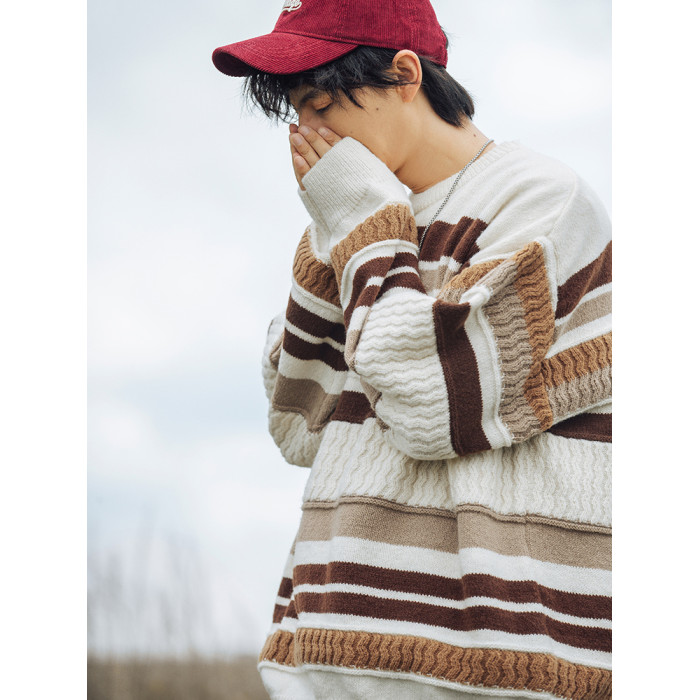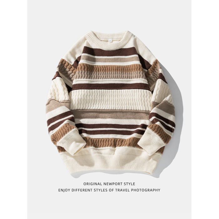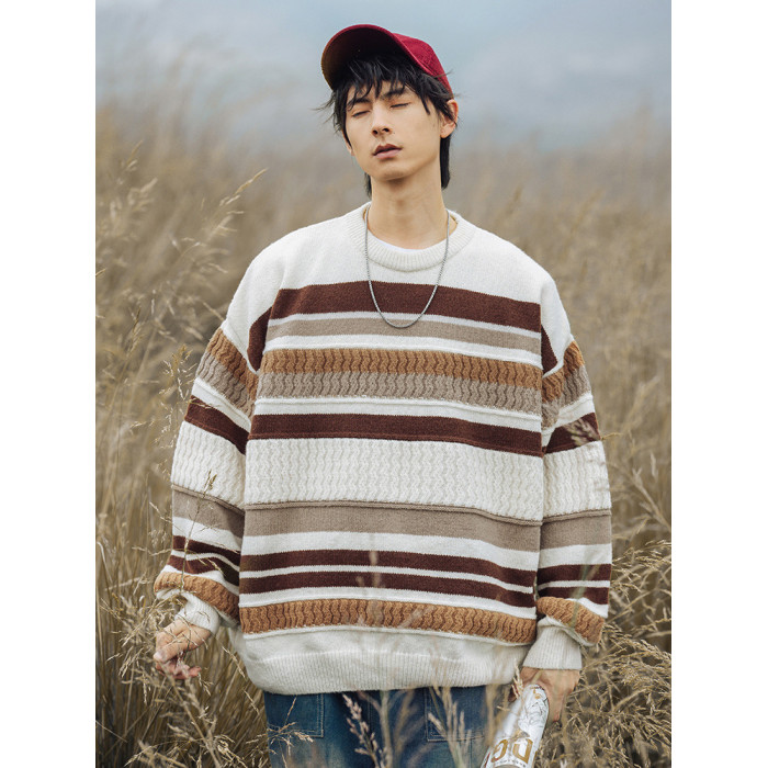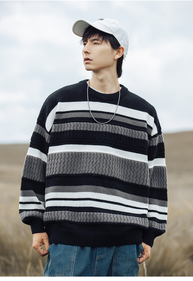 秋冬慵懶條紋撞色毛衣冬季山系休閒寬松暖男秋裝復古保暖針織衫男