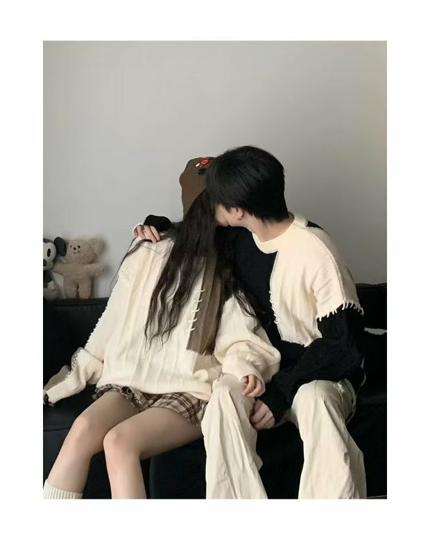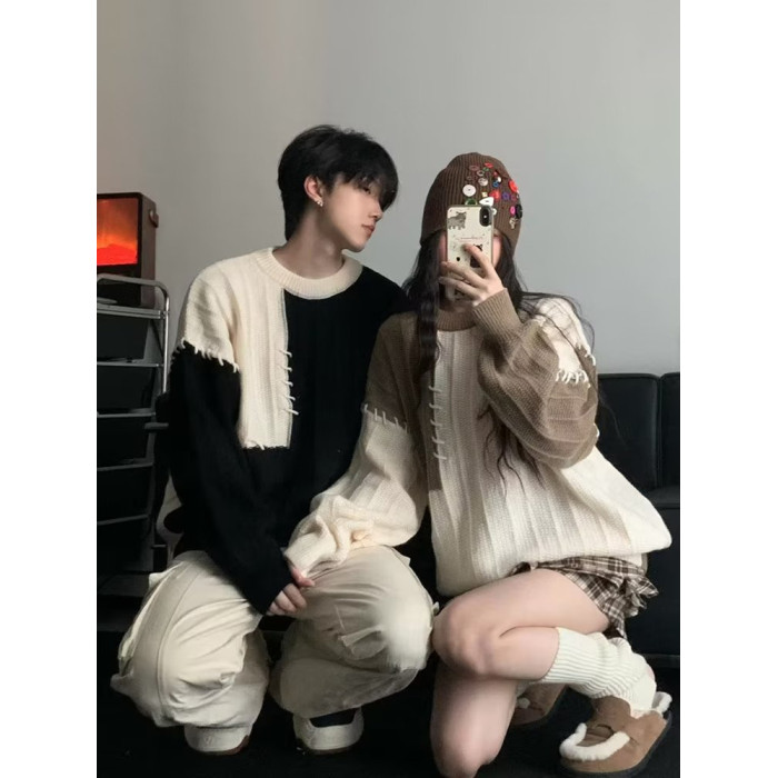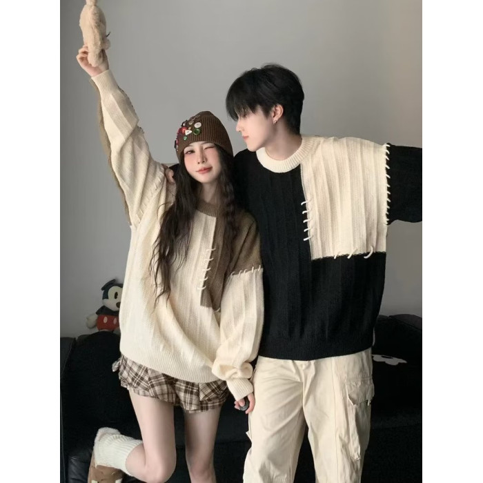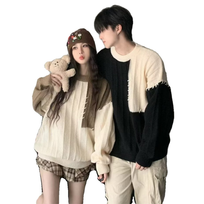 情侶裝拼接撞色毛衣男女日系復古秋冬季潮牌寬松休閒原宿風針織衫
