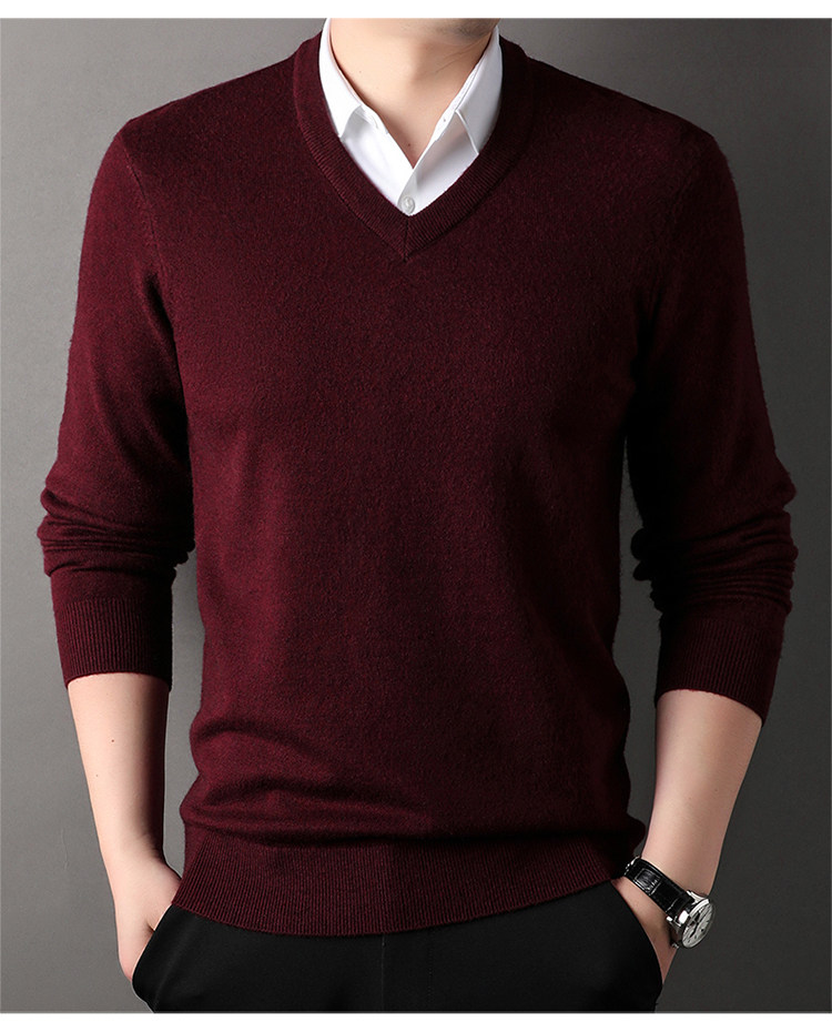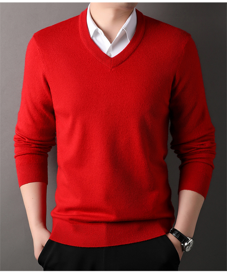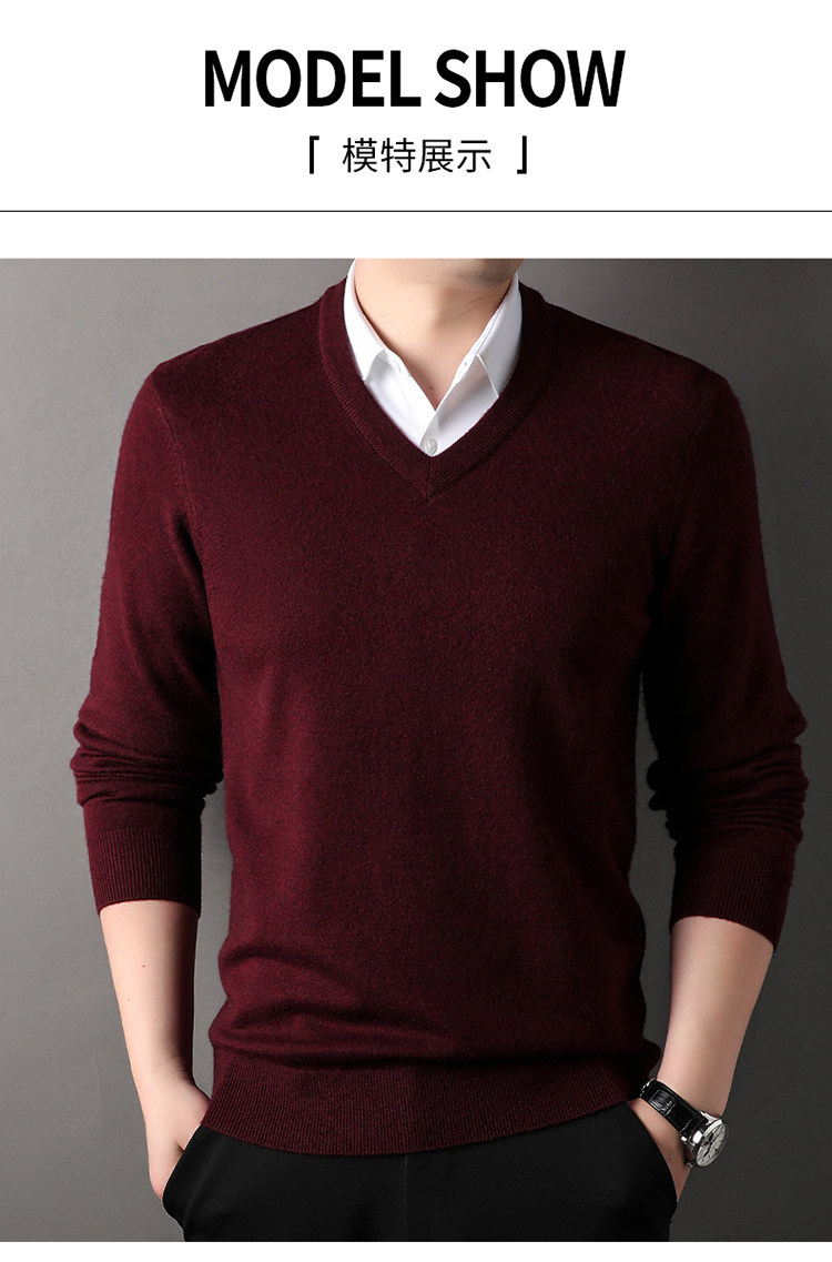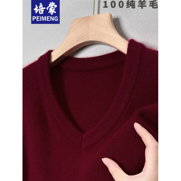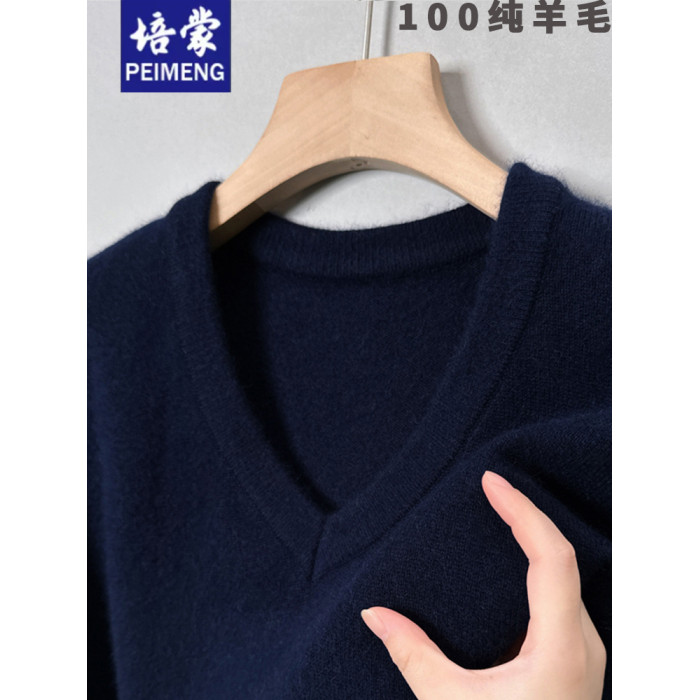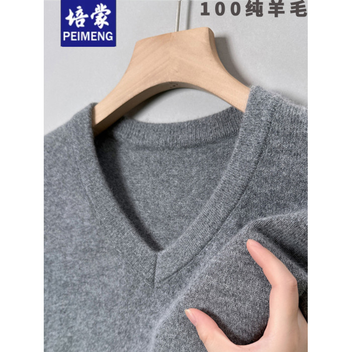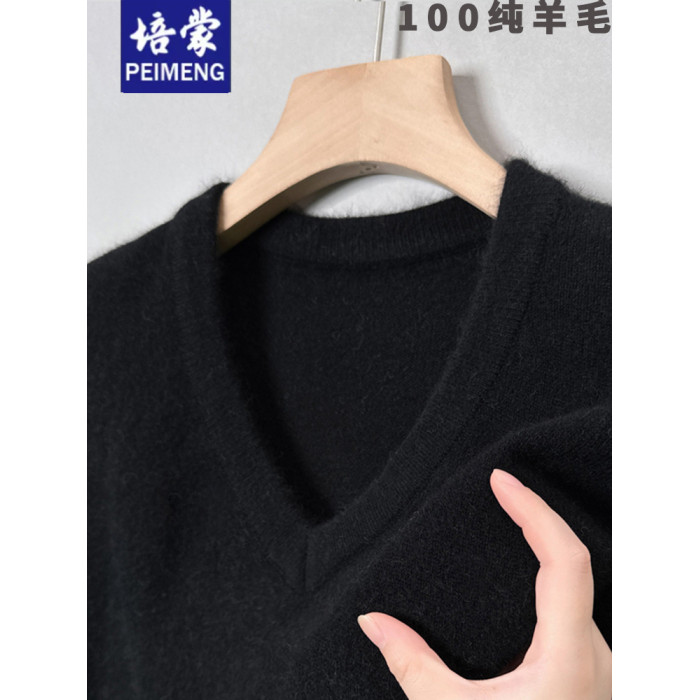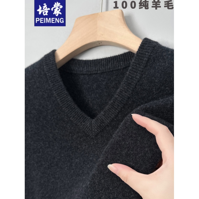 培矇冬季加厚V領羊毛衫男士100純羊毛針織保暖套頭雞心領羊絨毛衣