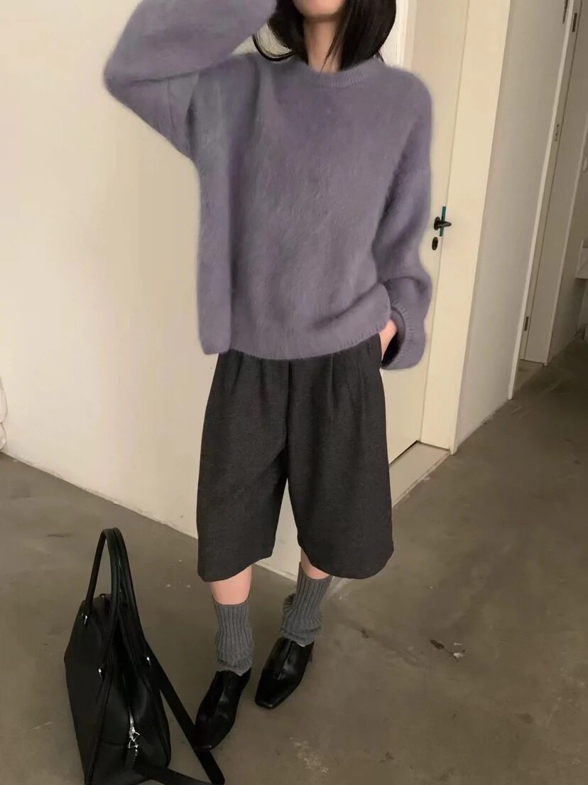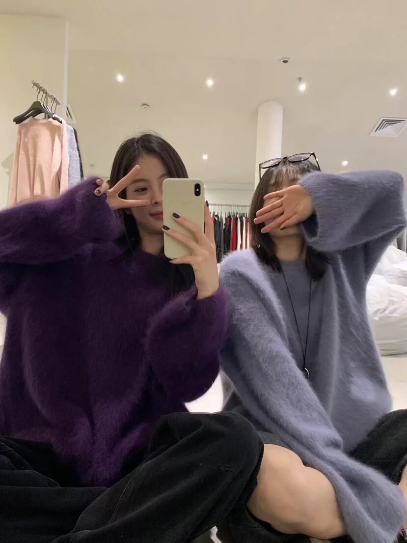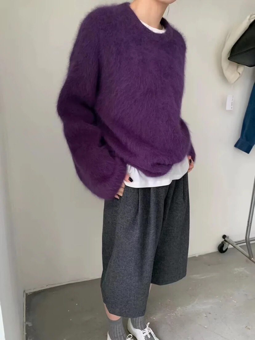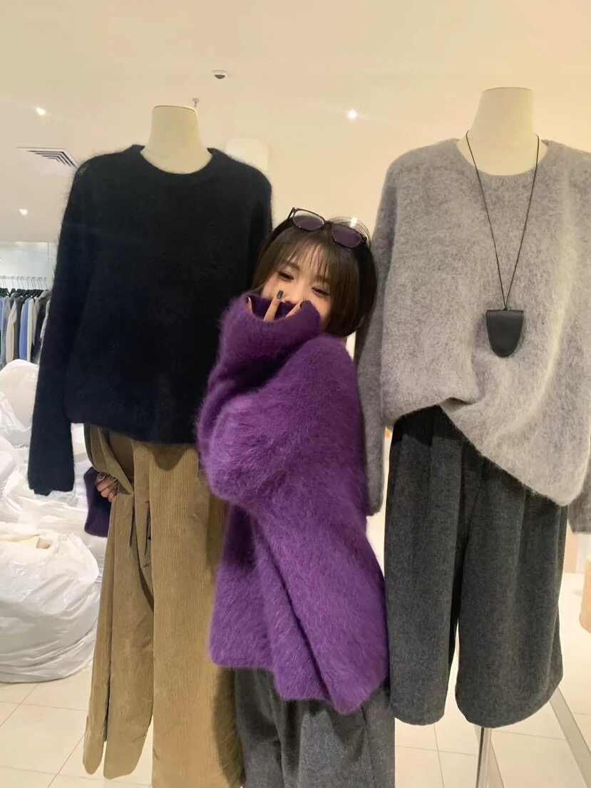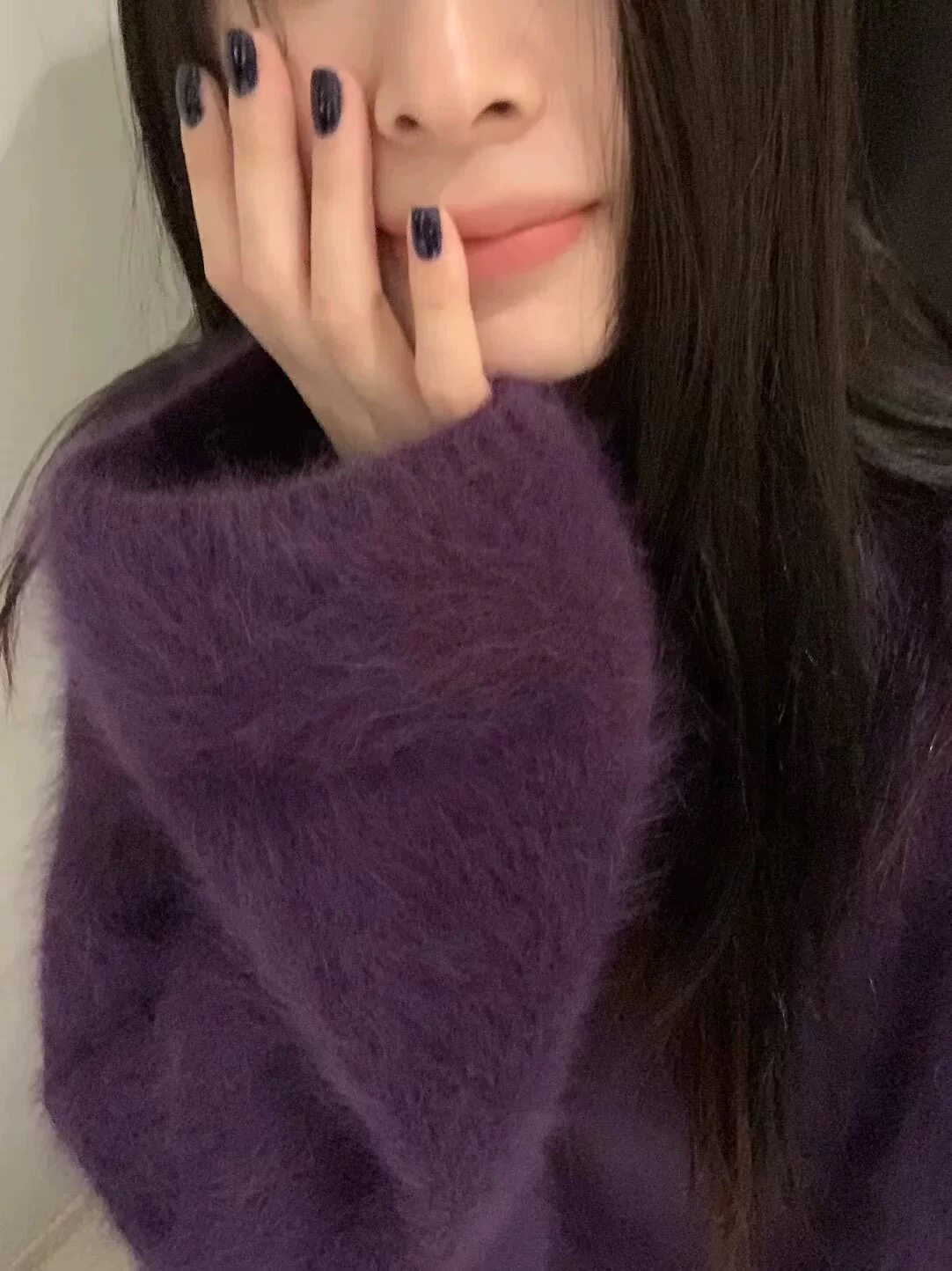 軟糯嬭fufu紫色水貂絨套頭毛衣女秋冬外穿寬鬆慵嬾毛茸茸針織上衣