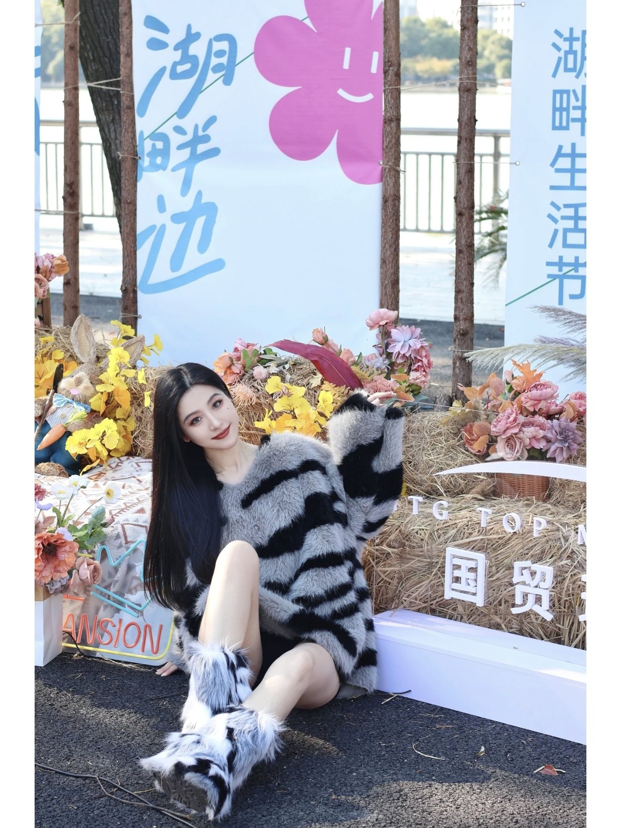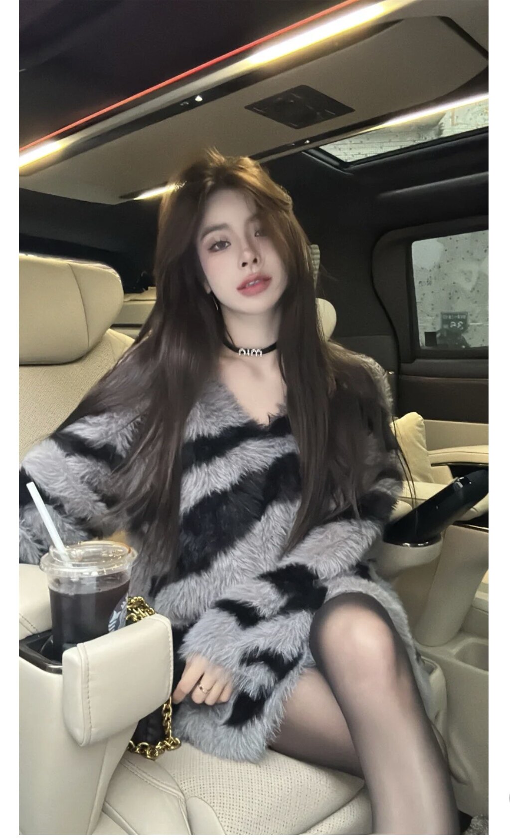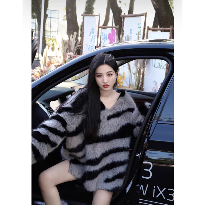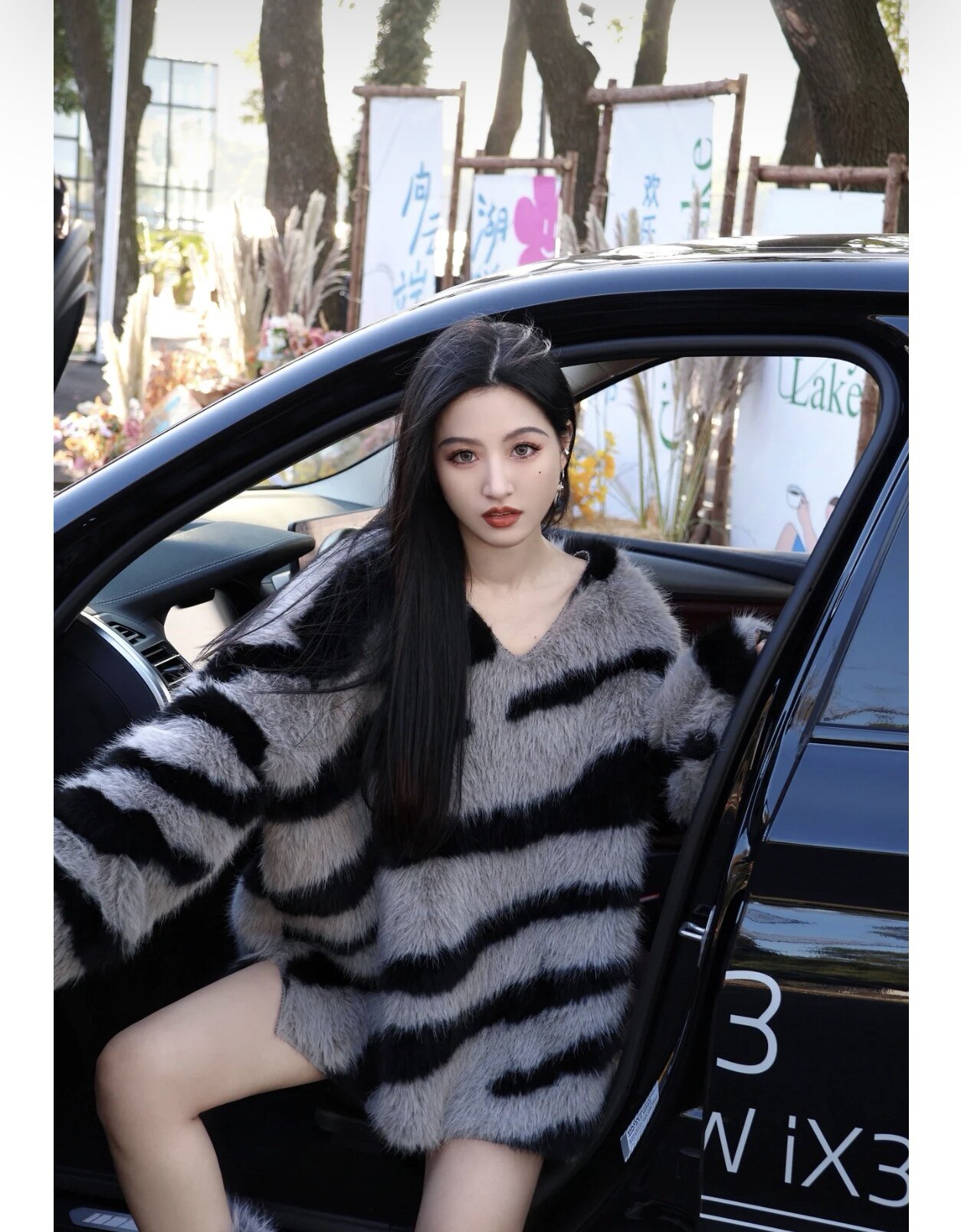 斑馬紋V領毛衣女秋冬季加厚高級設計感小衆軟糯別致絕美毛絨上衣