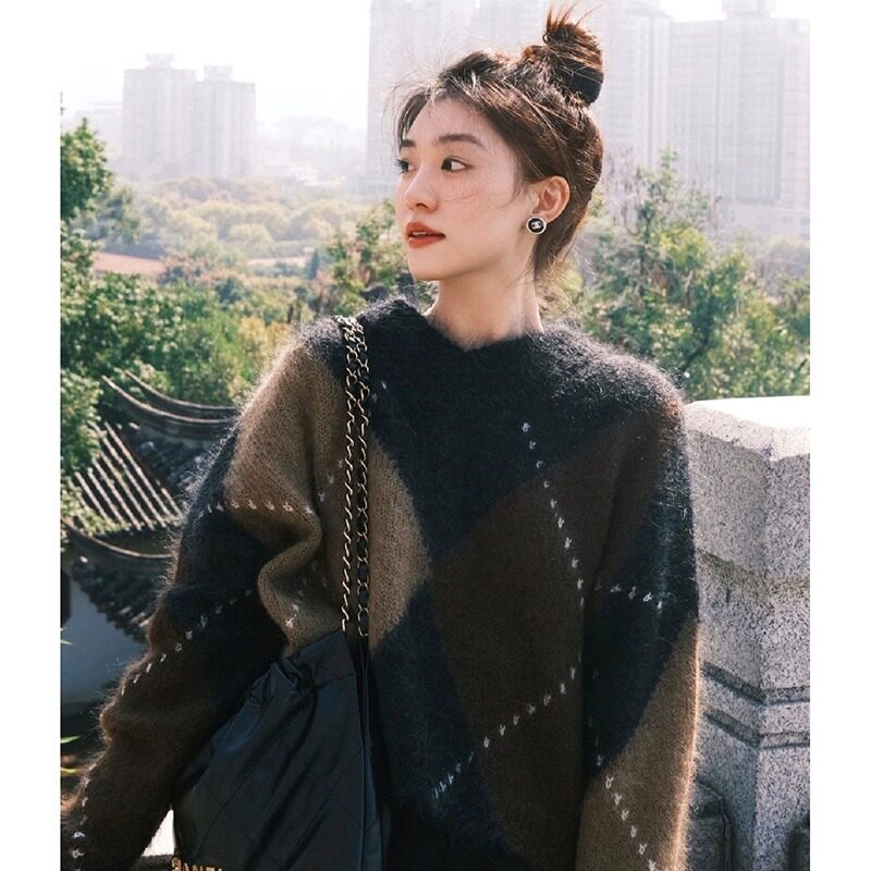 復古黑色浣熊絨軟糯圓領套頭毛衣女秋冬寬鬆慵嬾風羊毛外穿針織衫