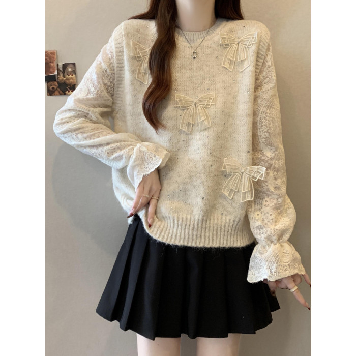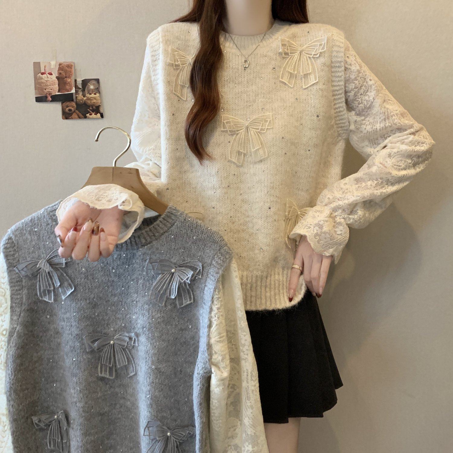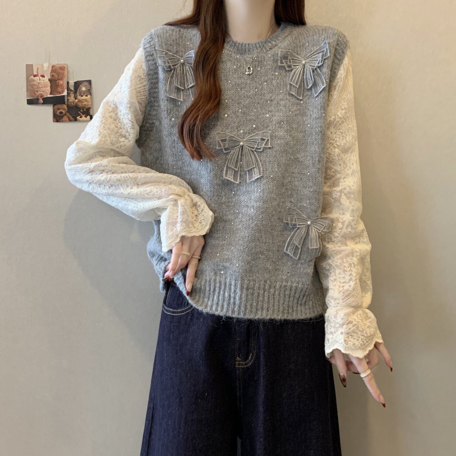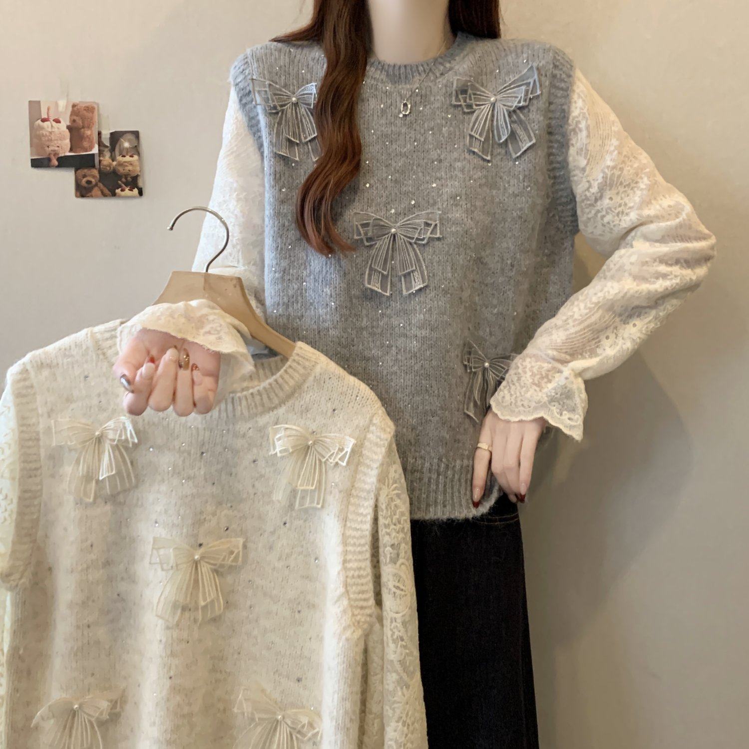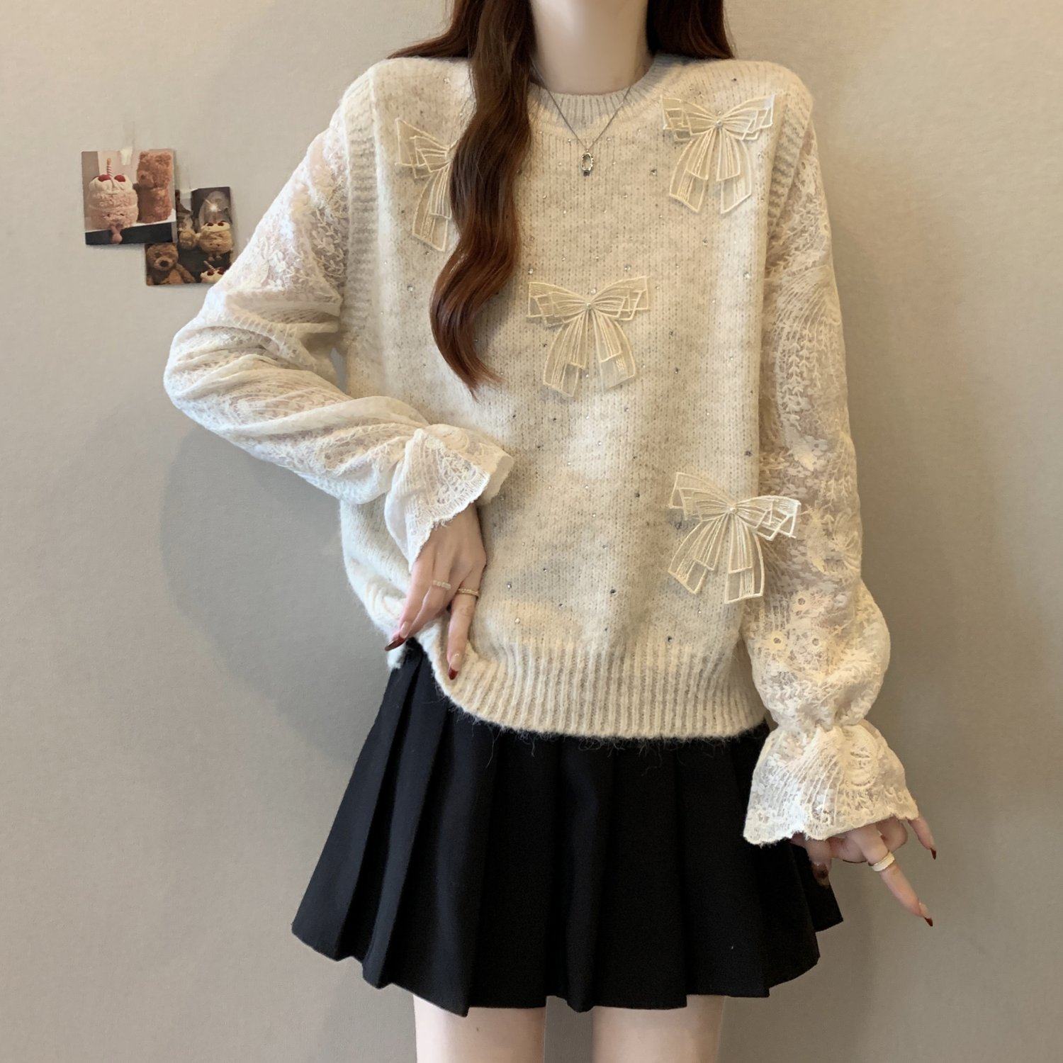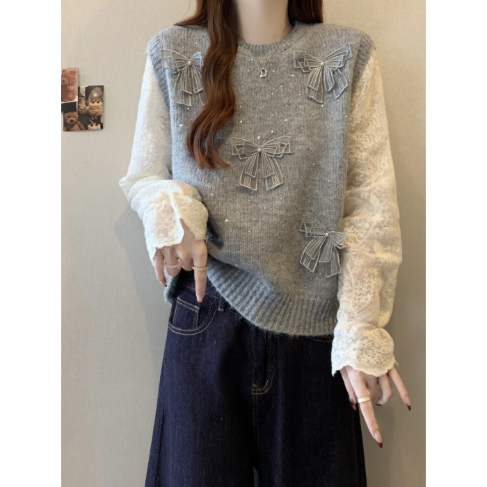 假兩件獨特漂亮正肩毛衣女2025秋季新款大碼微胖mm蕾絲喇叭袖上衣
