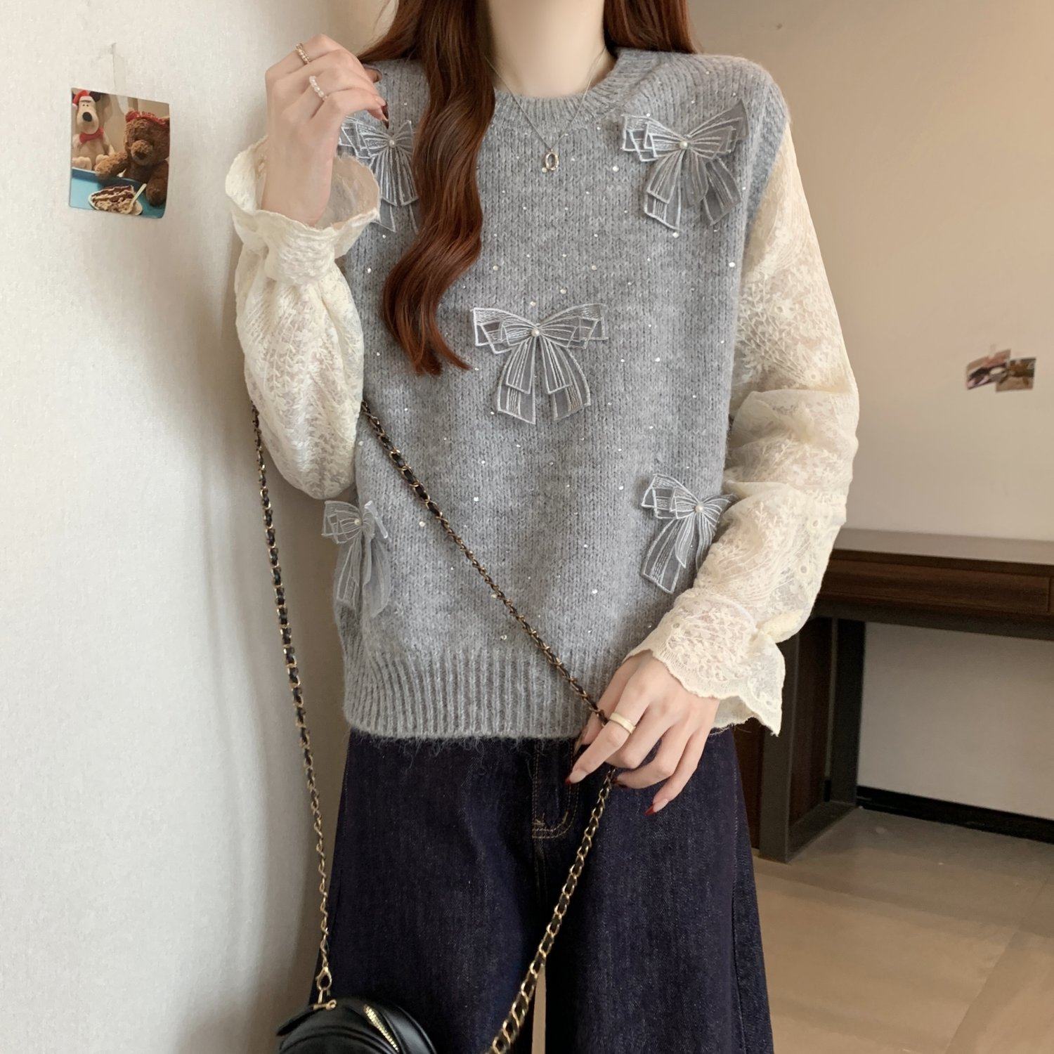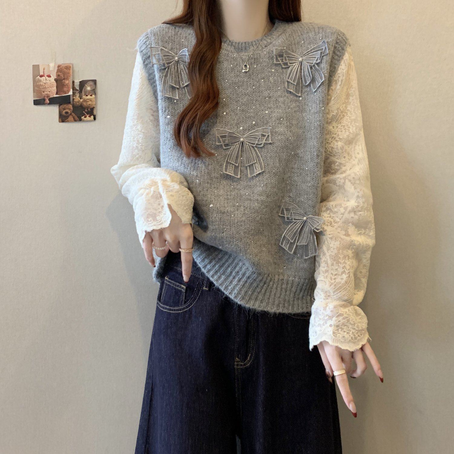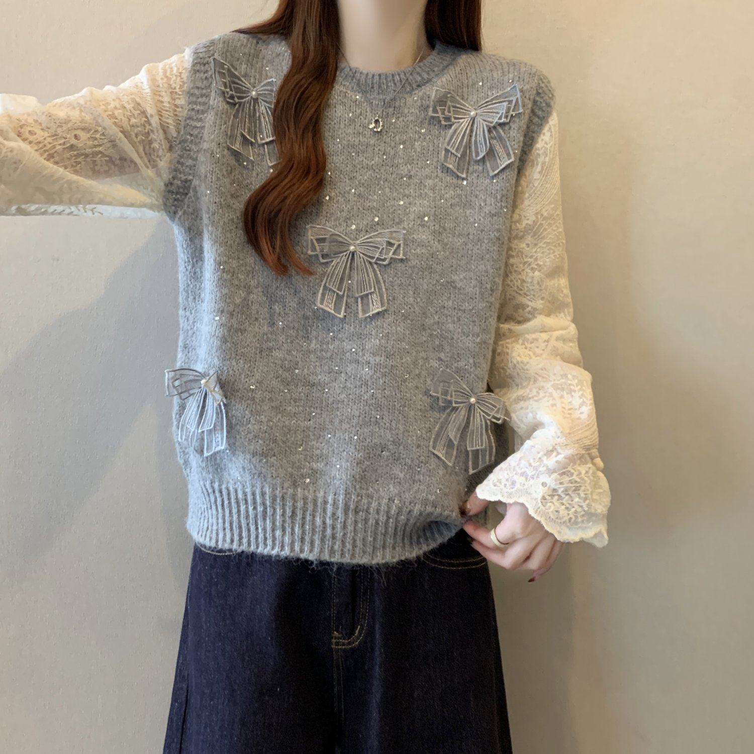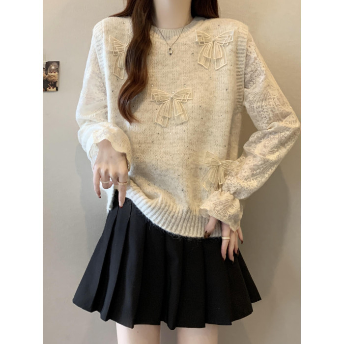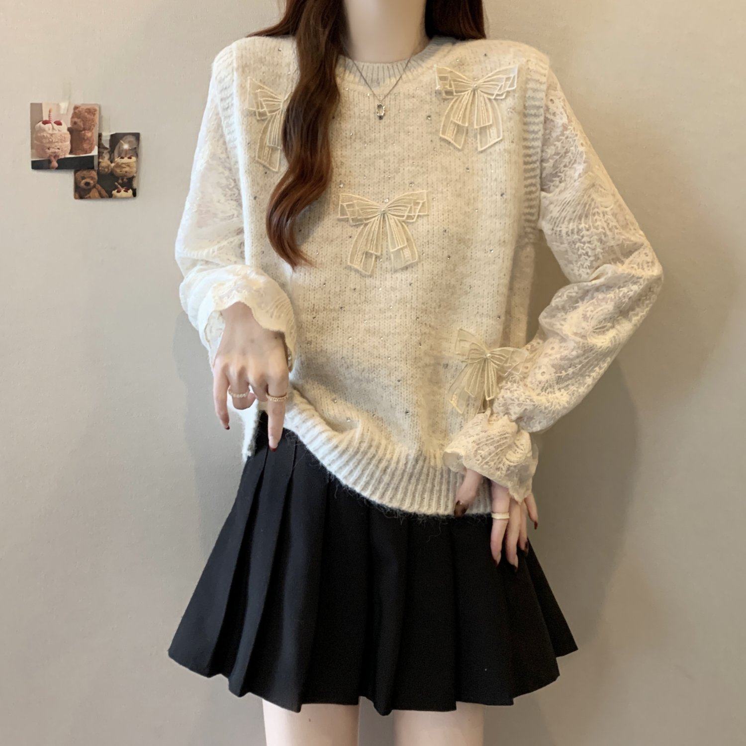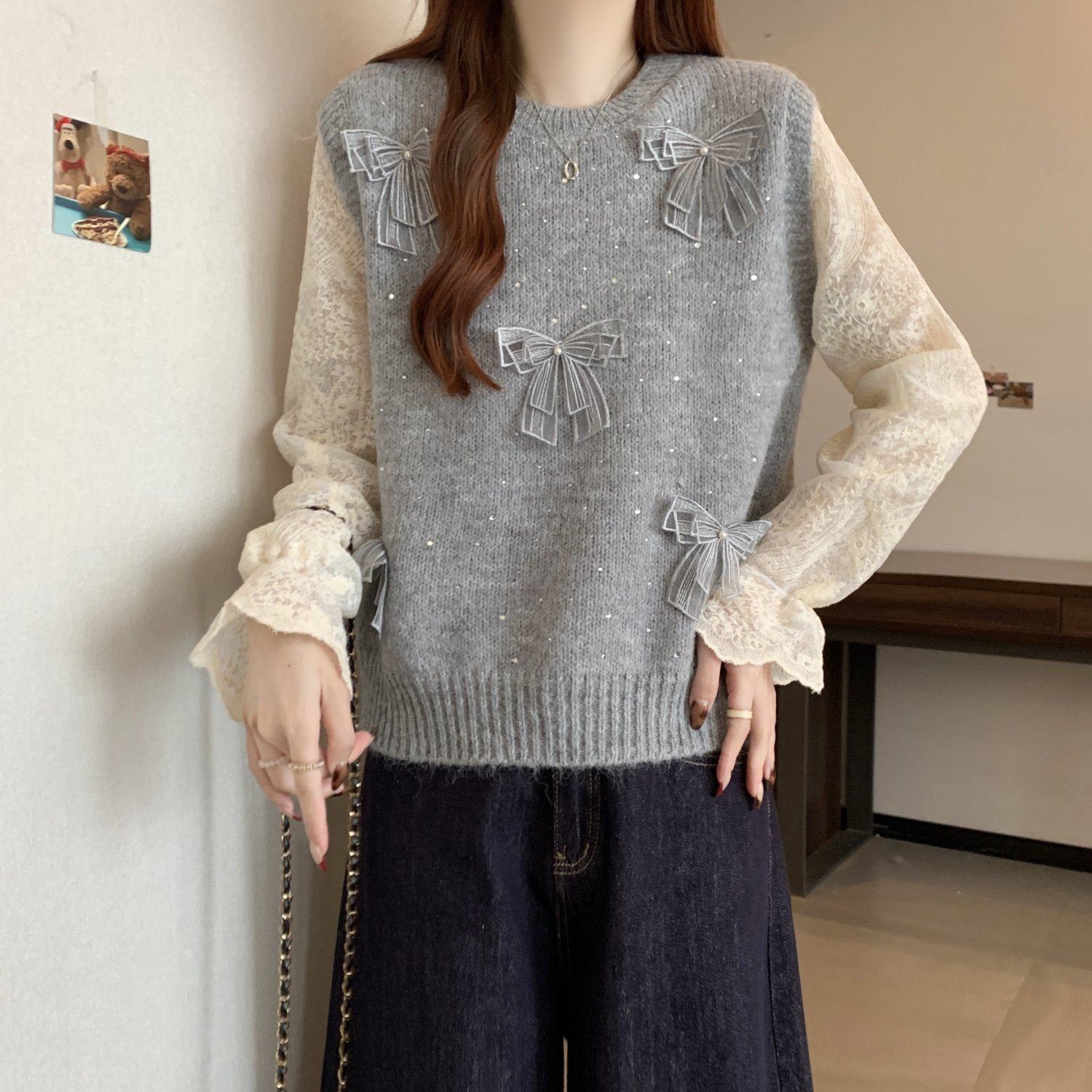 假兩件獨特漂亮正肩毛衣女2025秋季新款大碼微胖mm蕾絲喇叭袖上衣