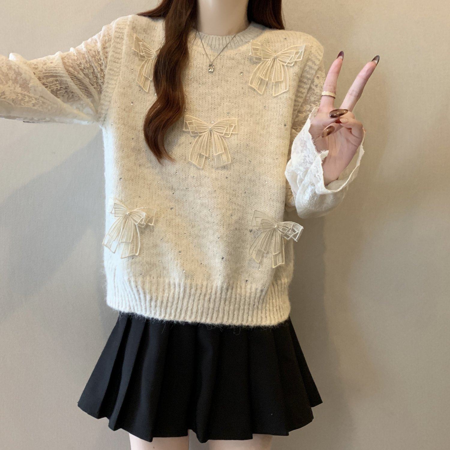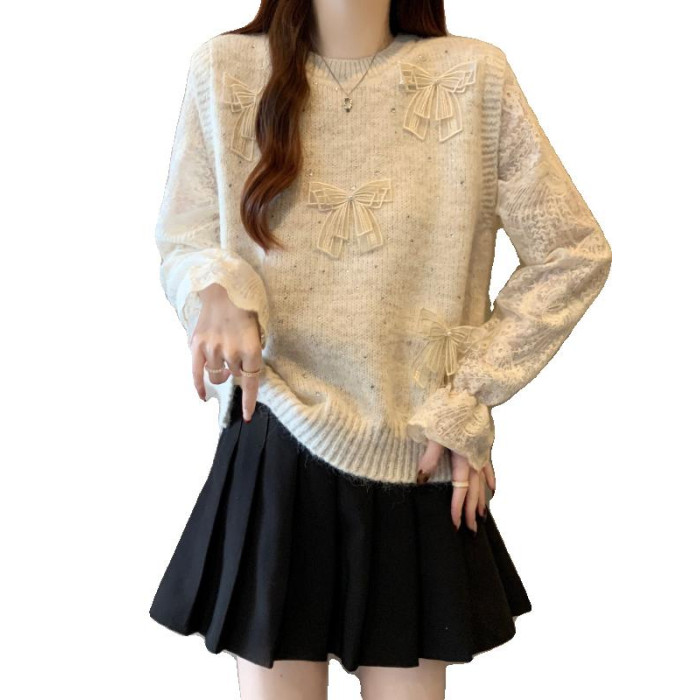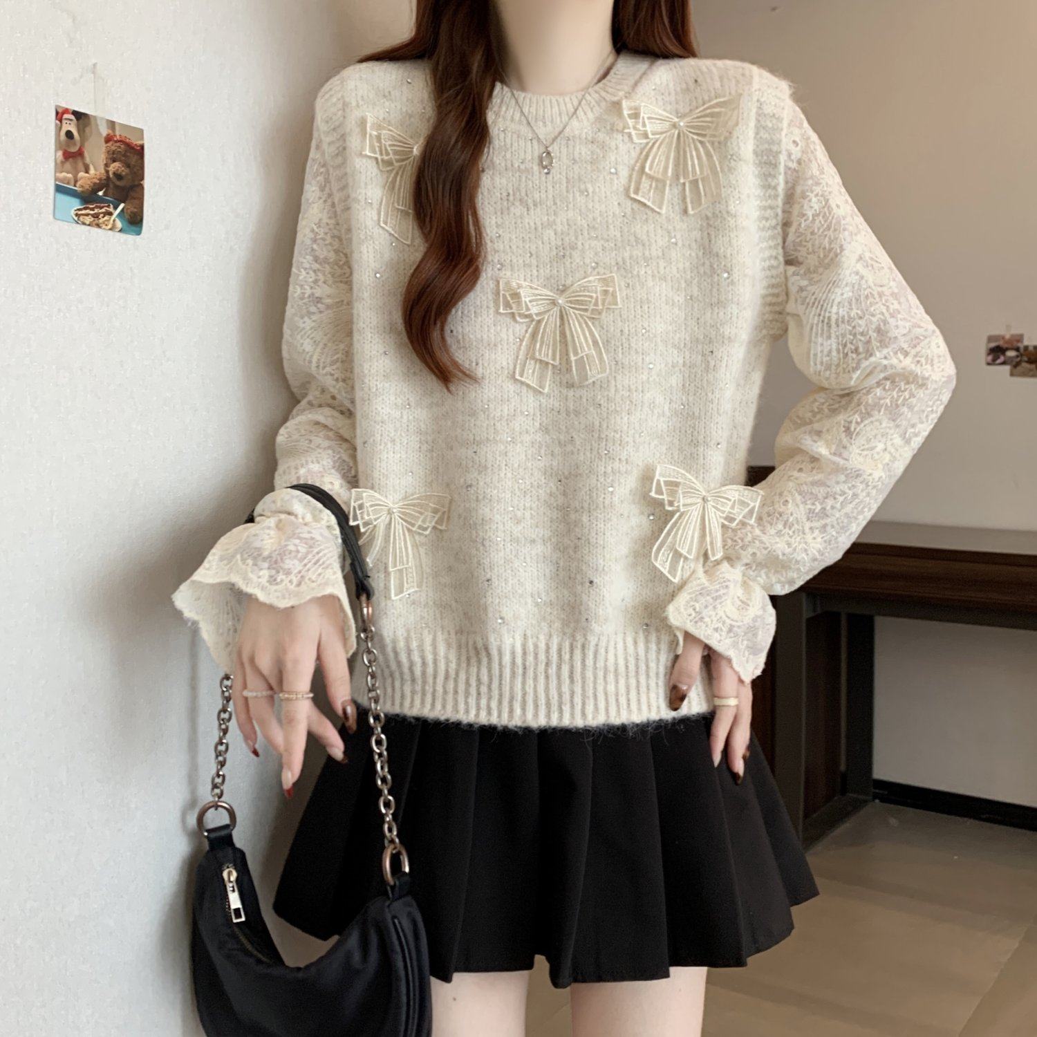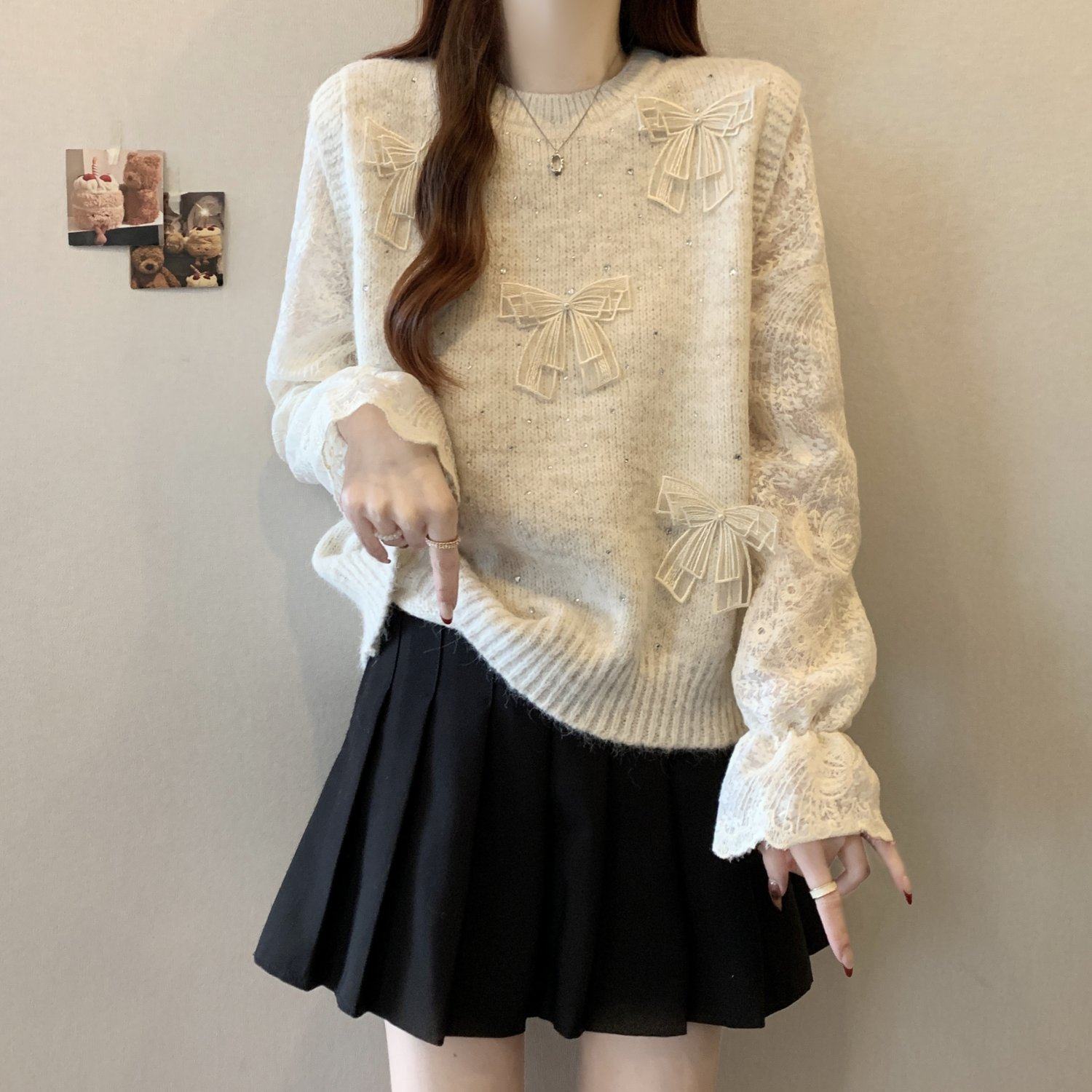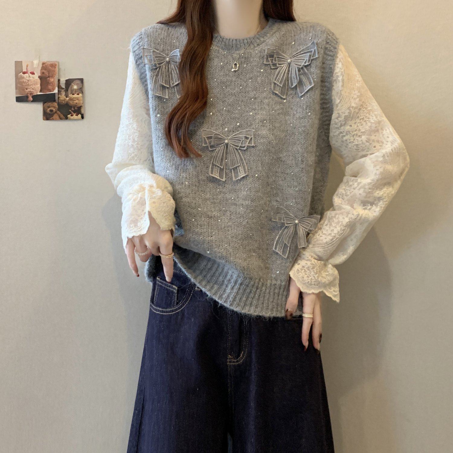 假兩件獨特漂亮正肩毛衣女2025秋季新款大碼微胖mm蕾絲喇叭袖上衣