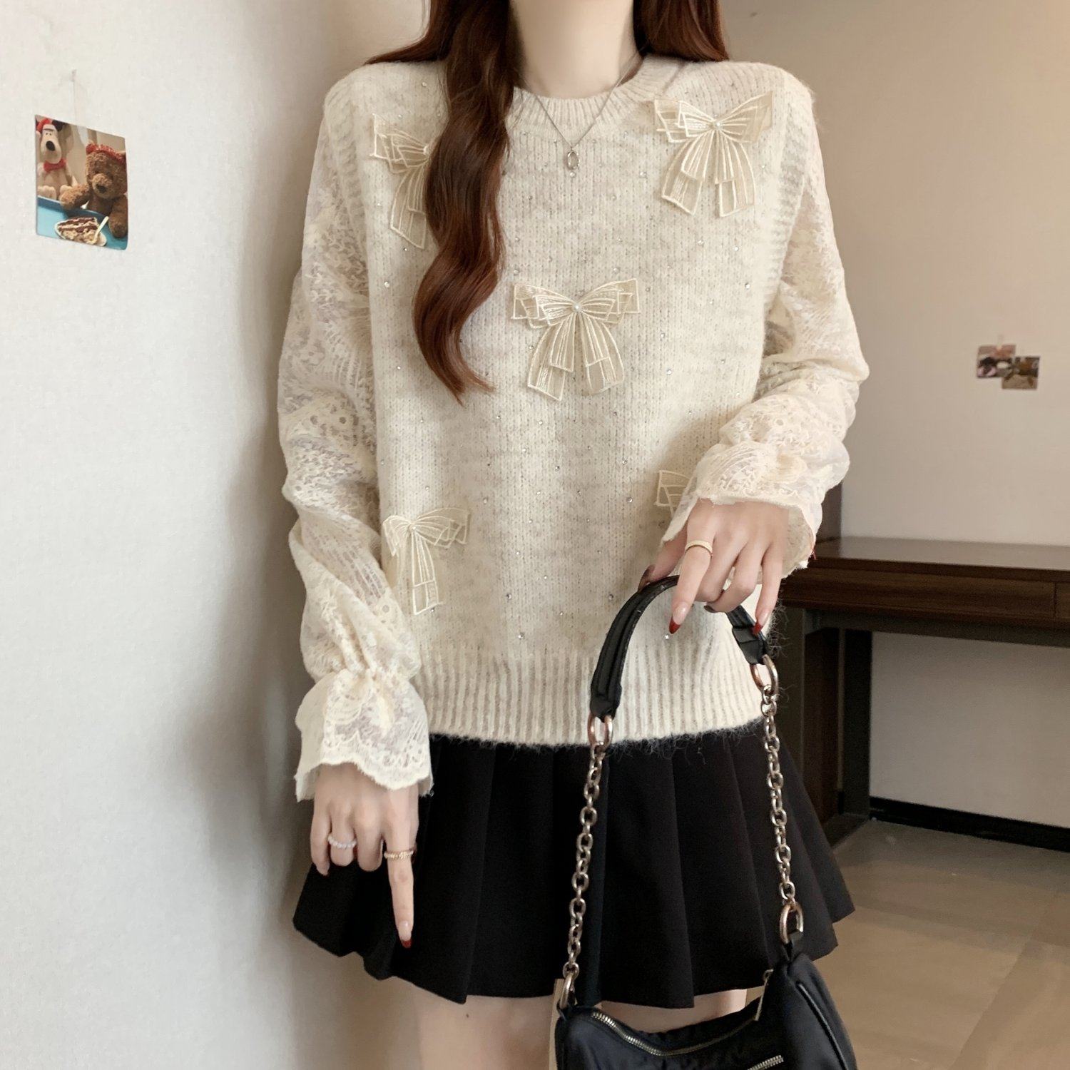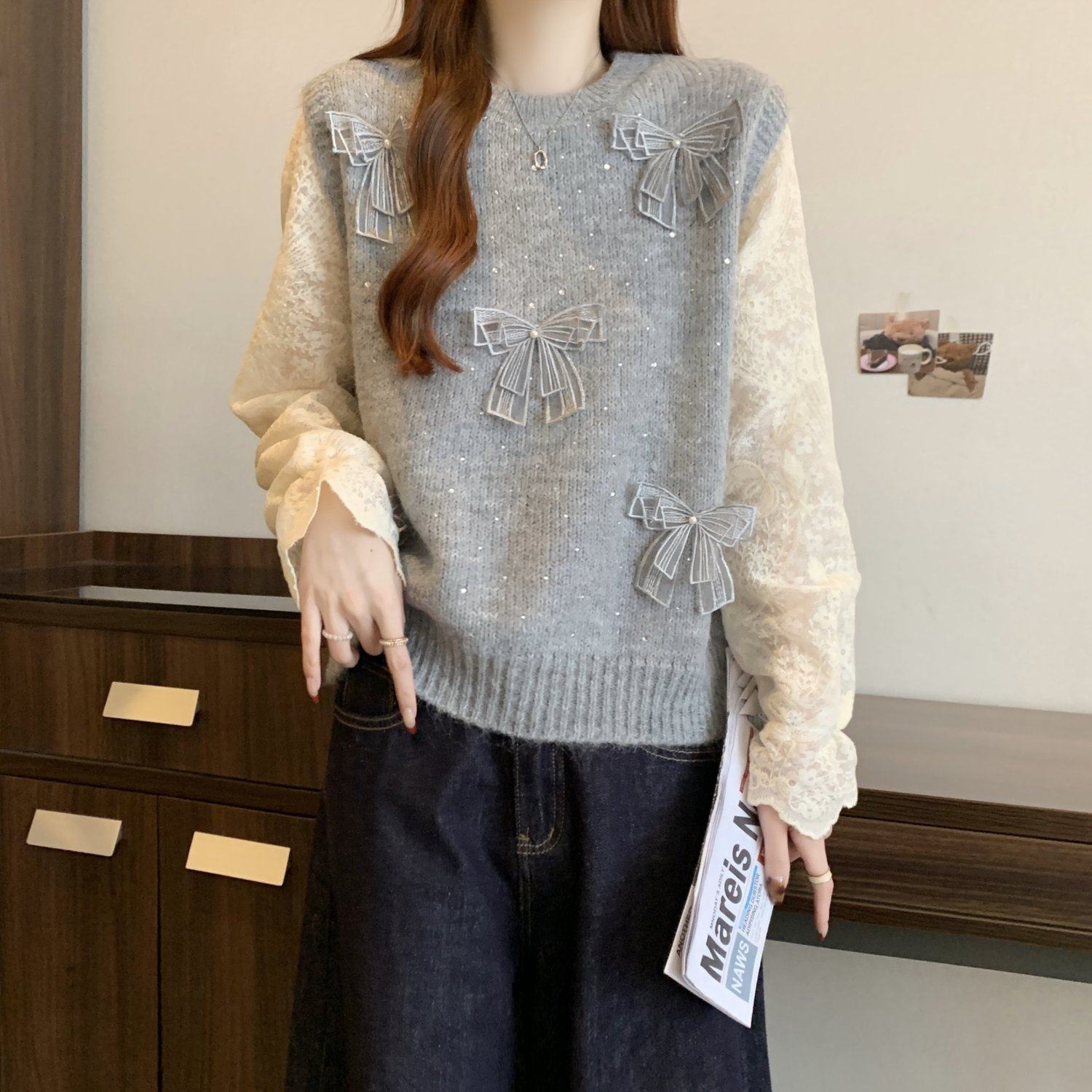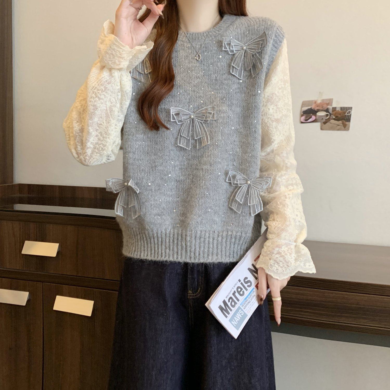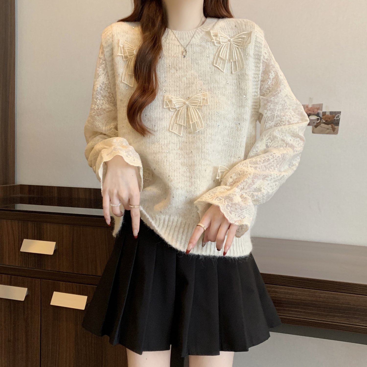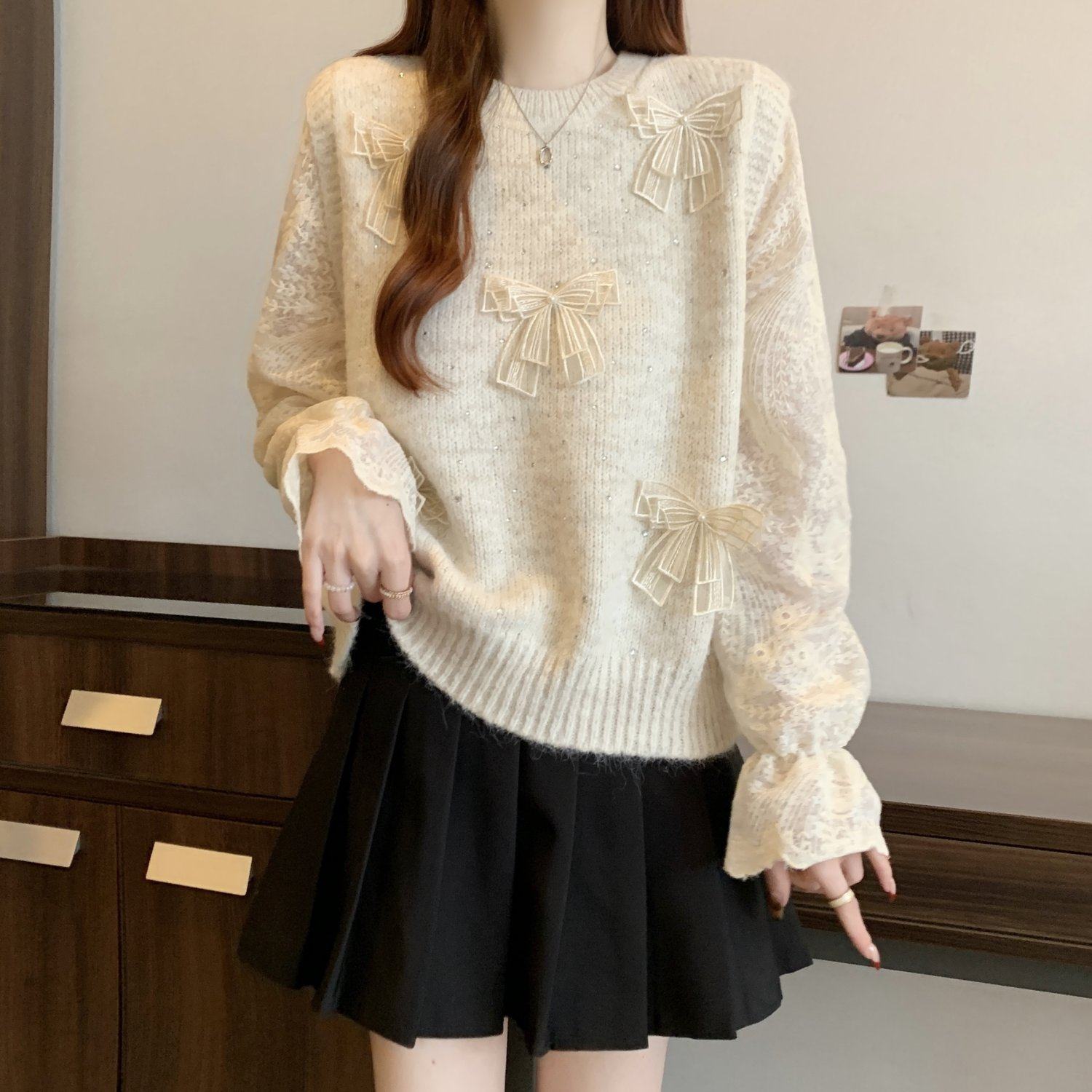假兩件獨特漂亮正肩毛衣女2025秋季新款大碼微胖mm蕾絲喇叭袖上衣