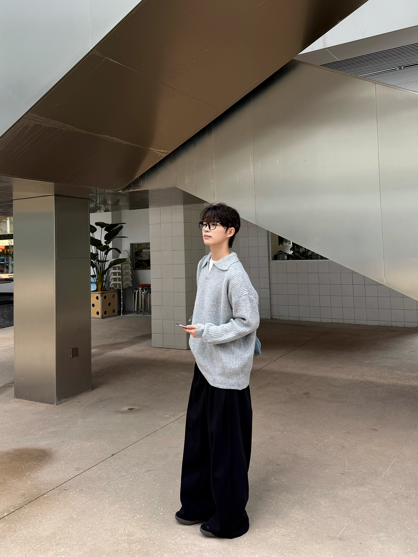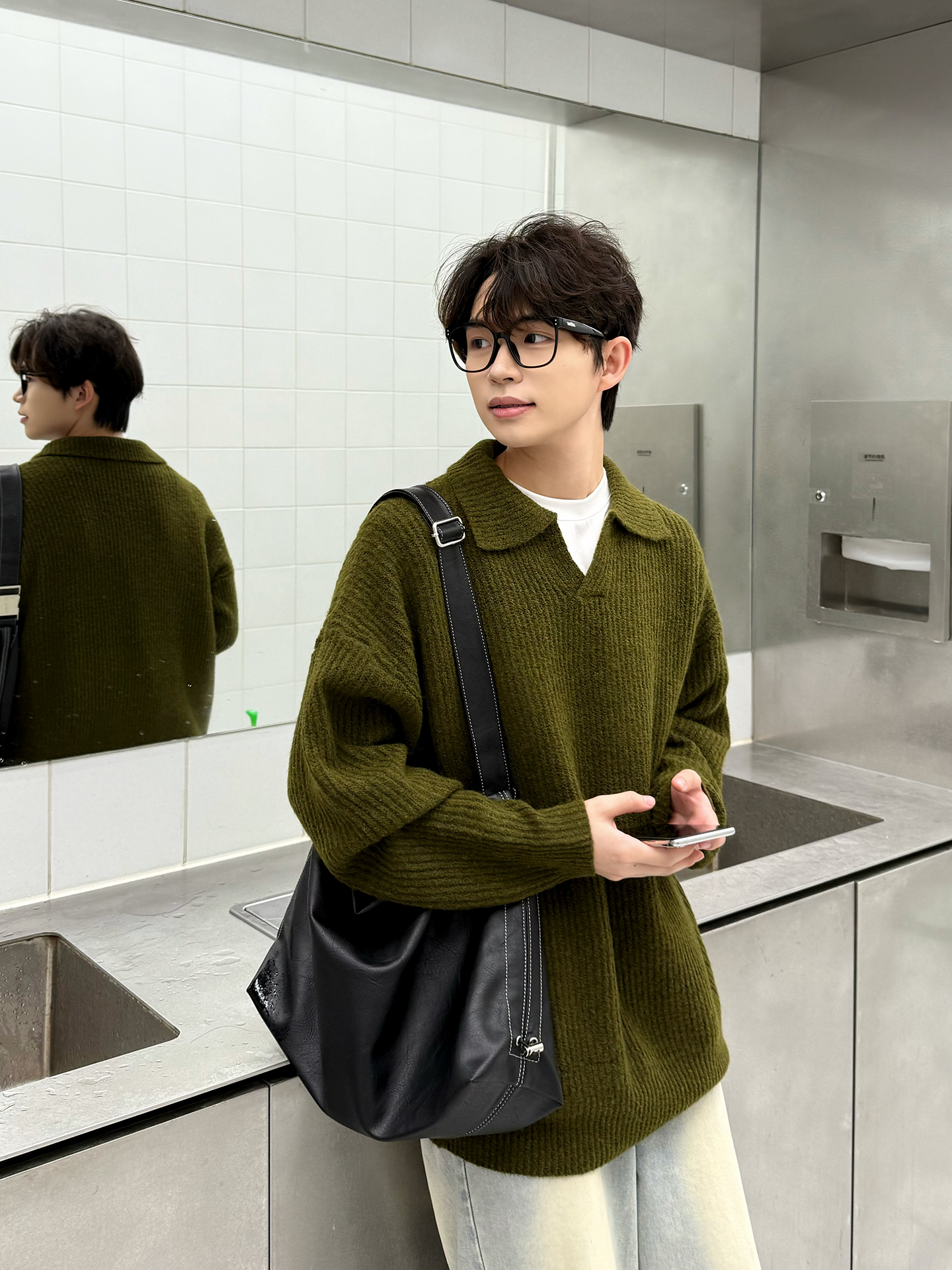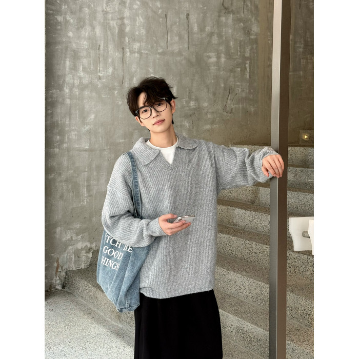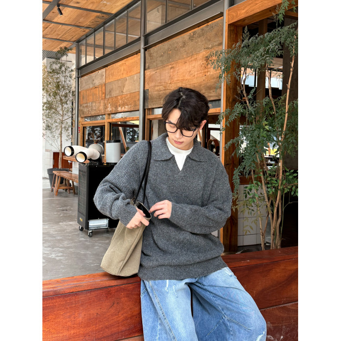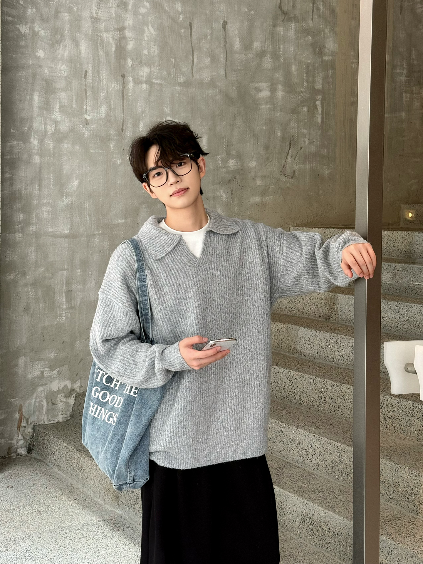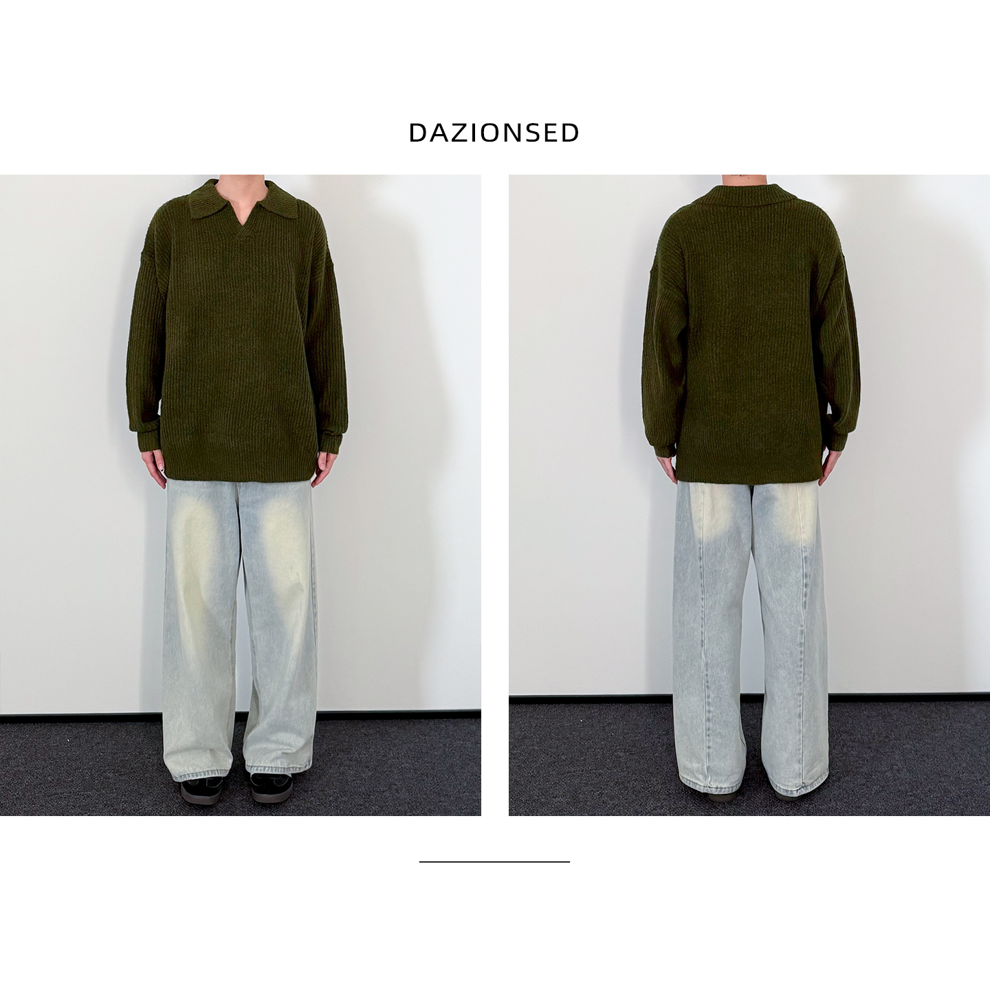 DAZO 輕羊毛混紡寬松翻領毛衣男士輕奢高級感純色缺口領針織衫