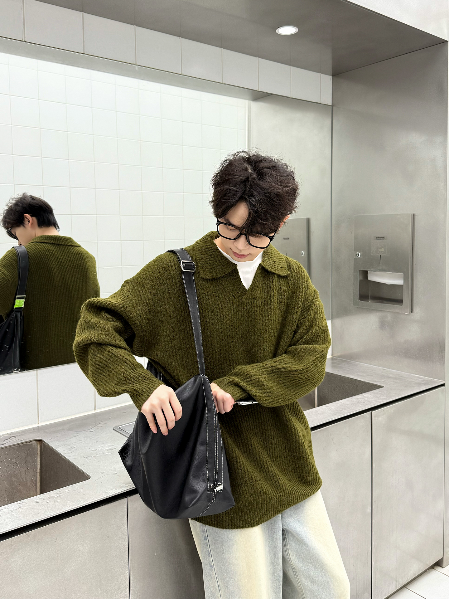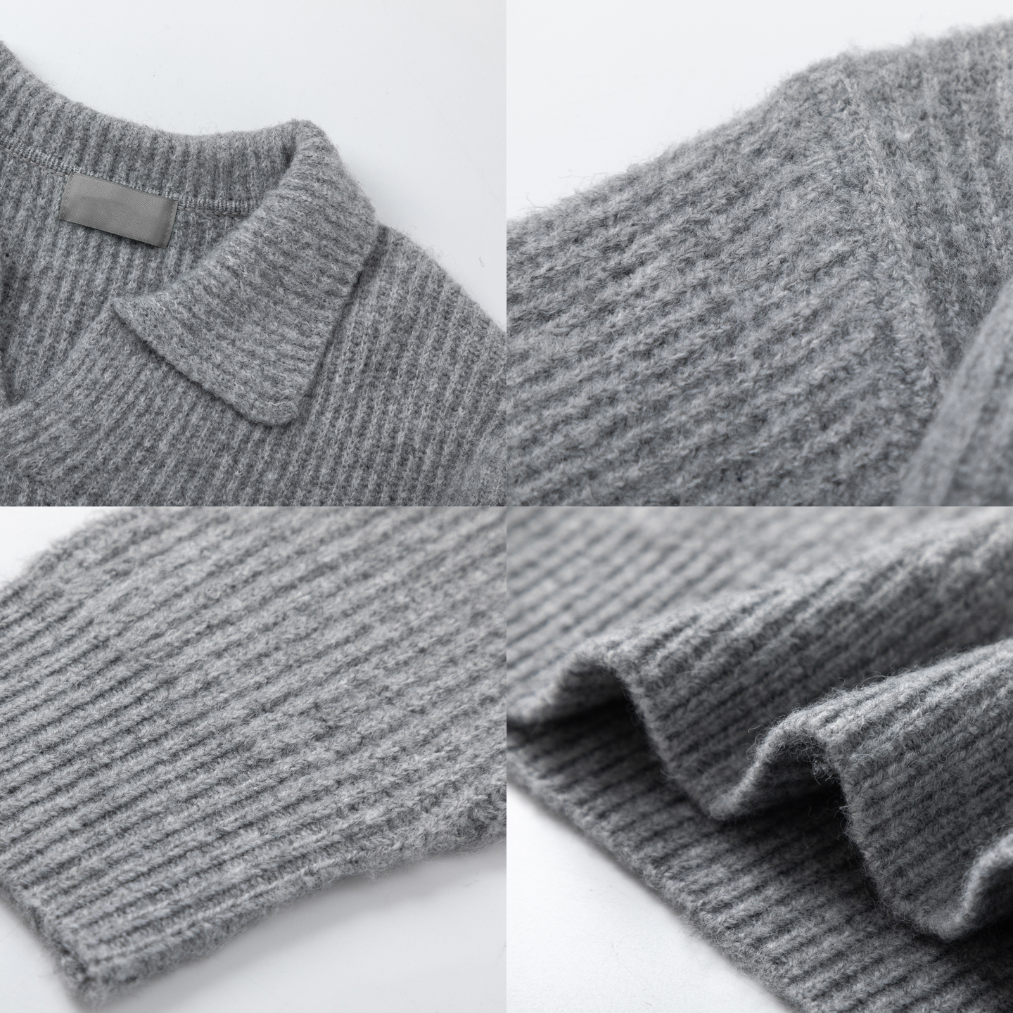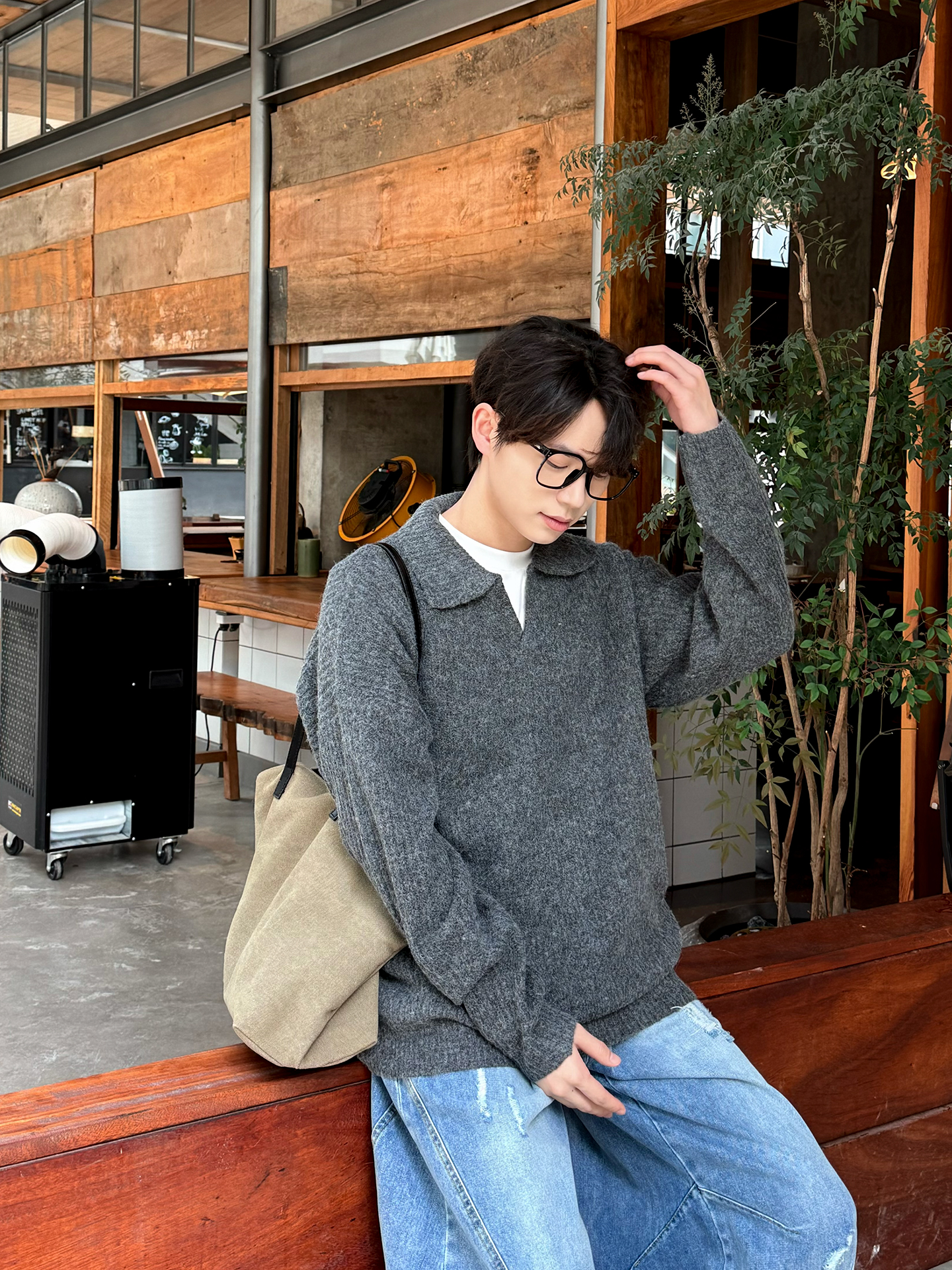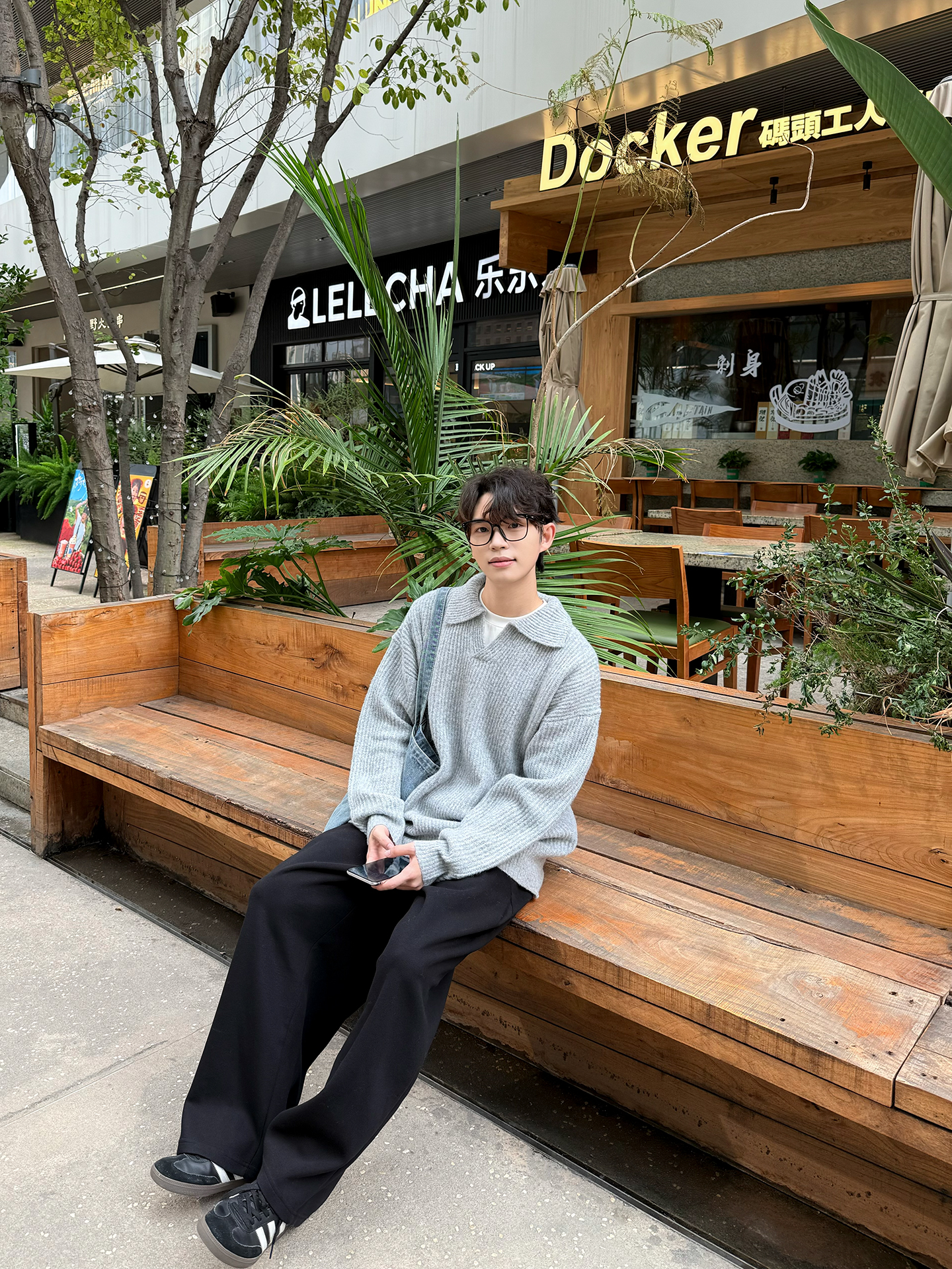 DAZO 輕羊毛混紡寬松翻領毛衣男士輕奢高級感純色缺口領針織衫