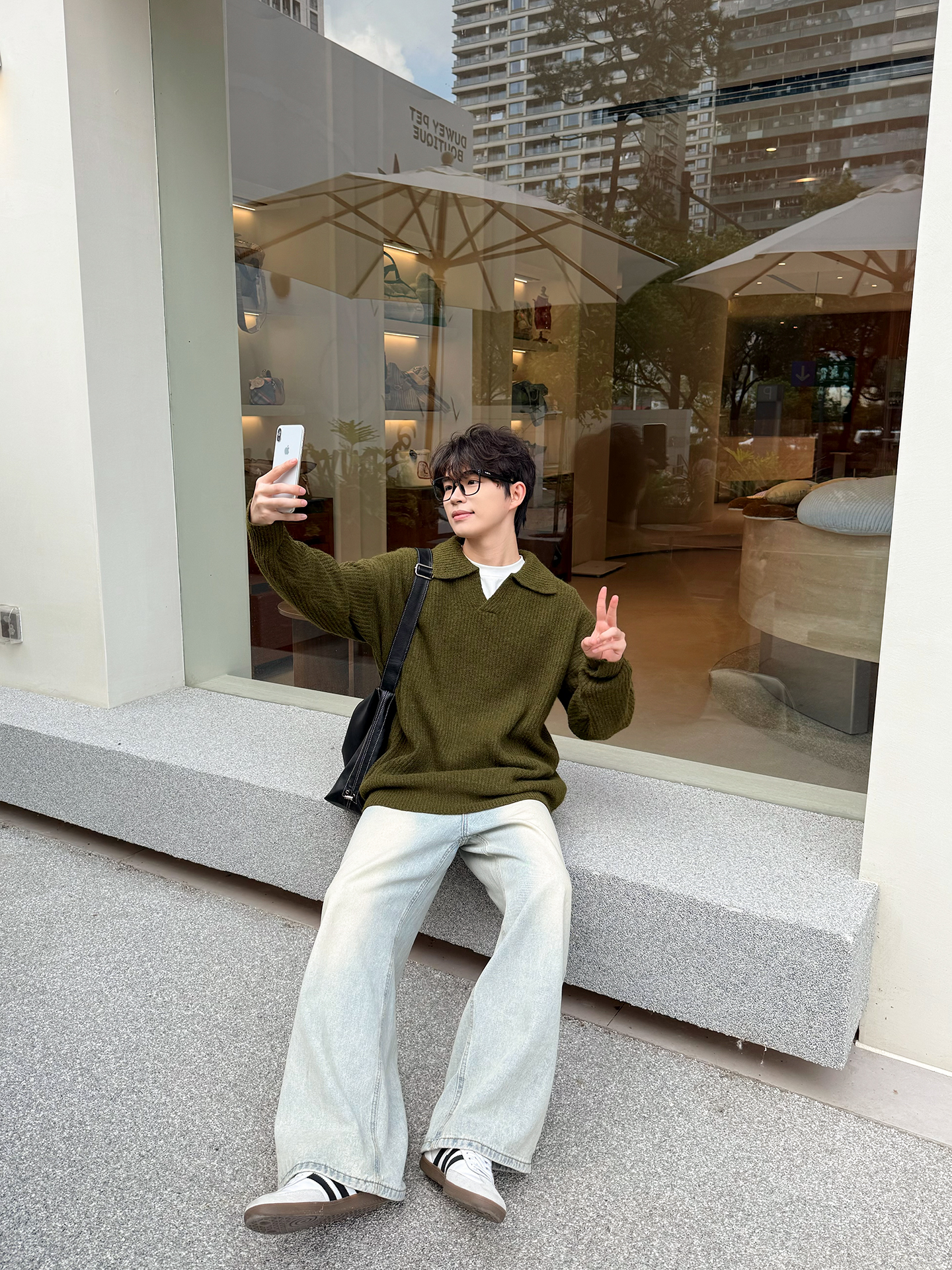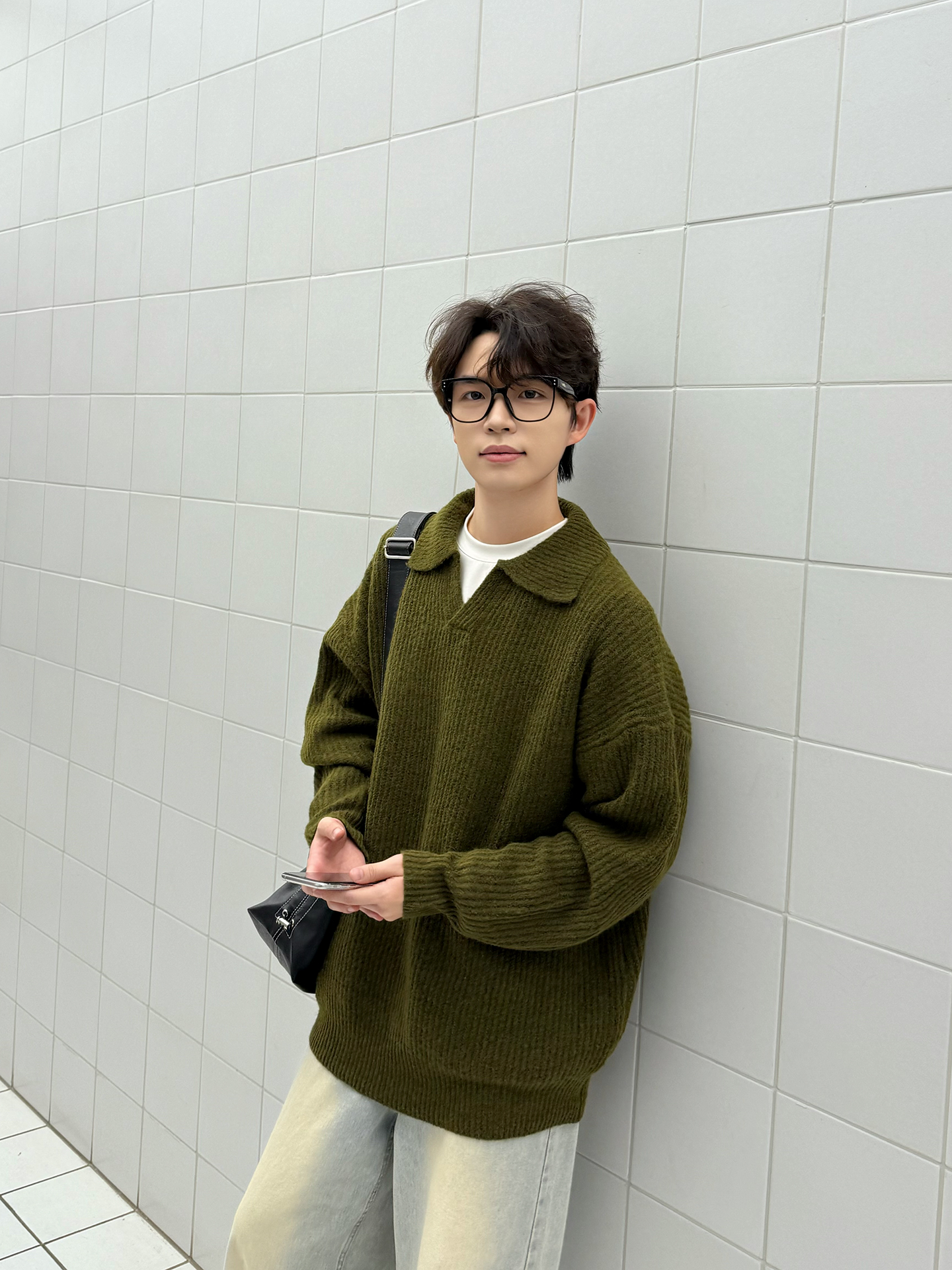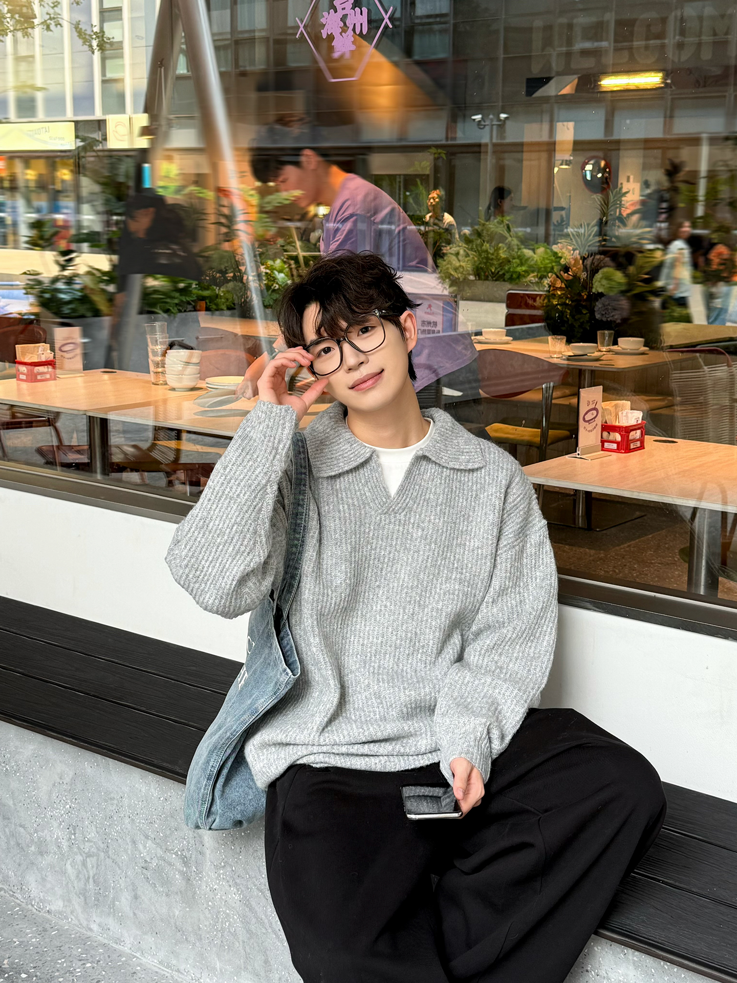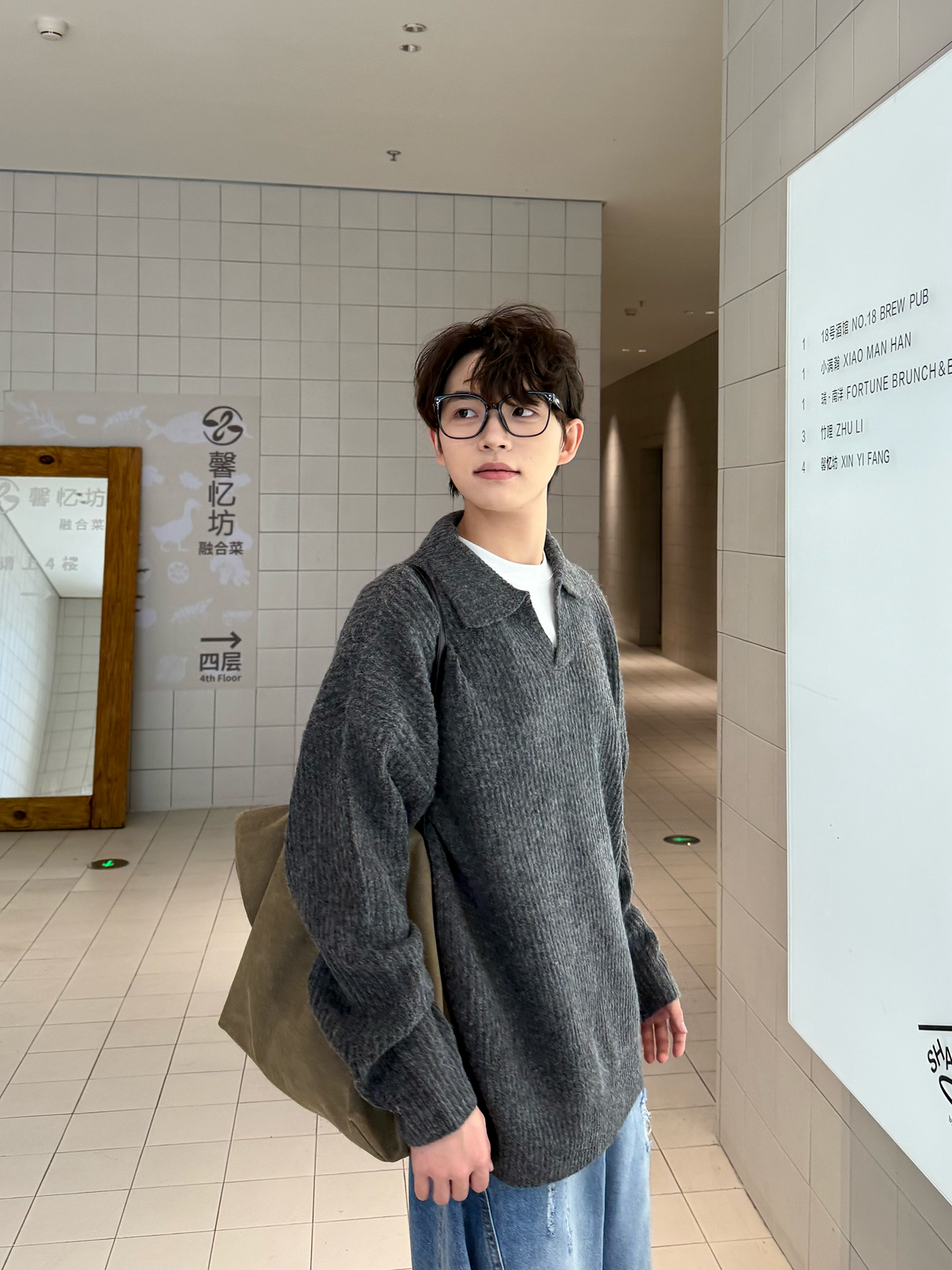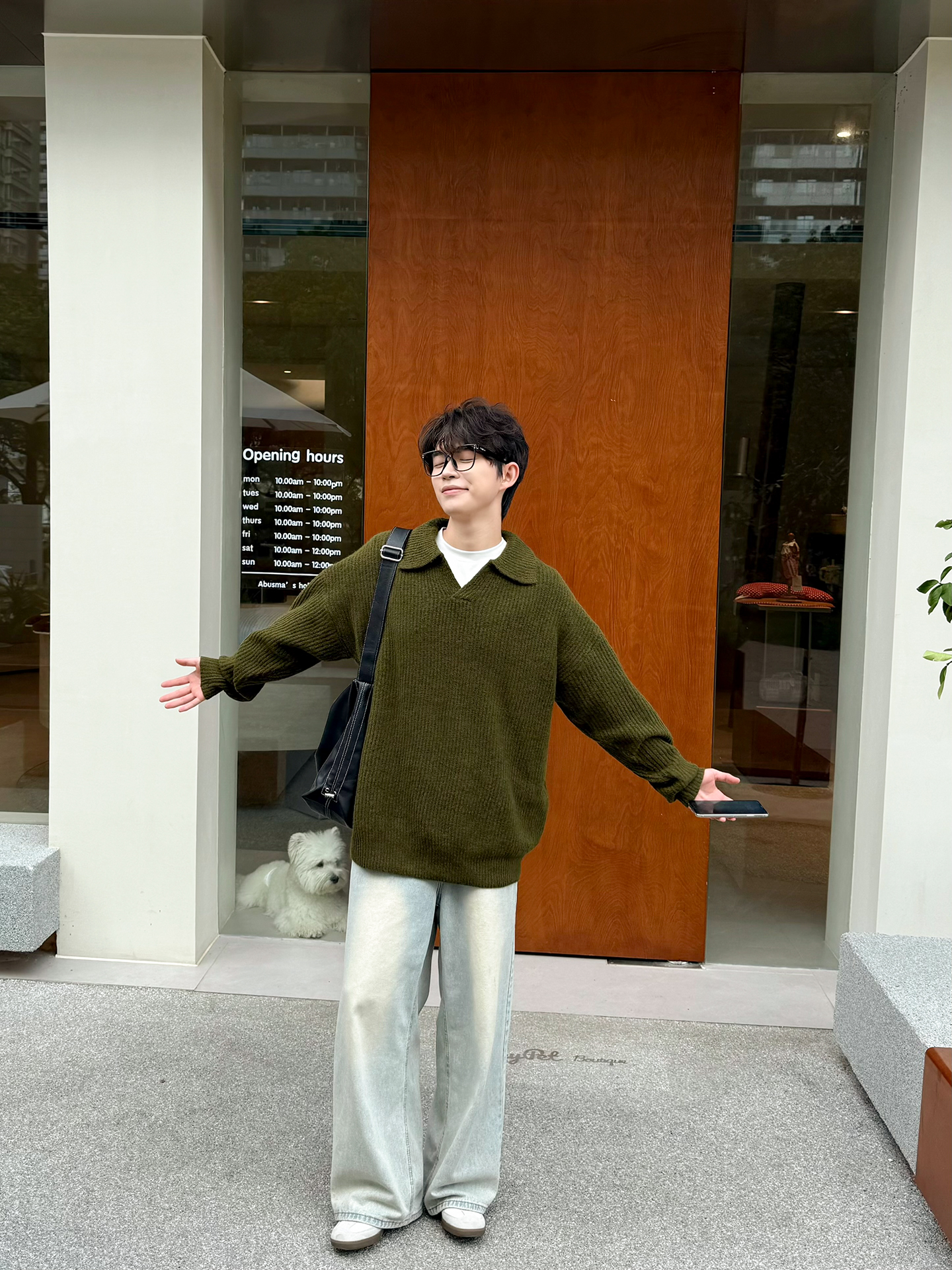 DAZO 輕羊毛混紡寬松翻領毛衣男士輕奢高級感純色缺口領針織衫