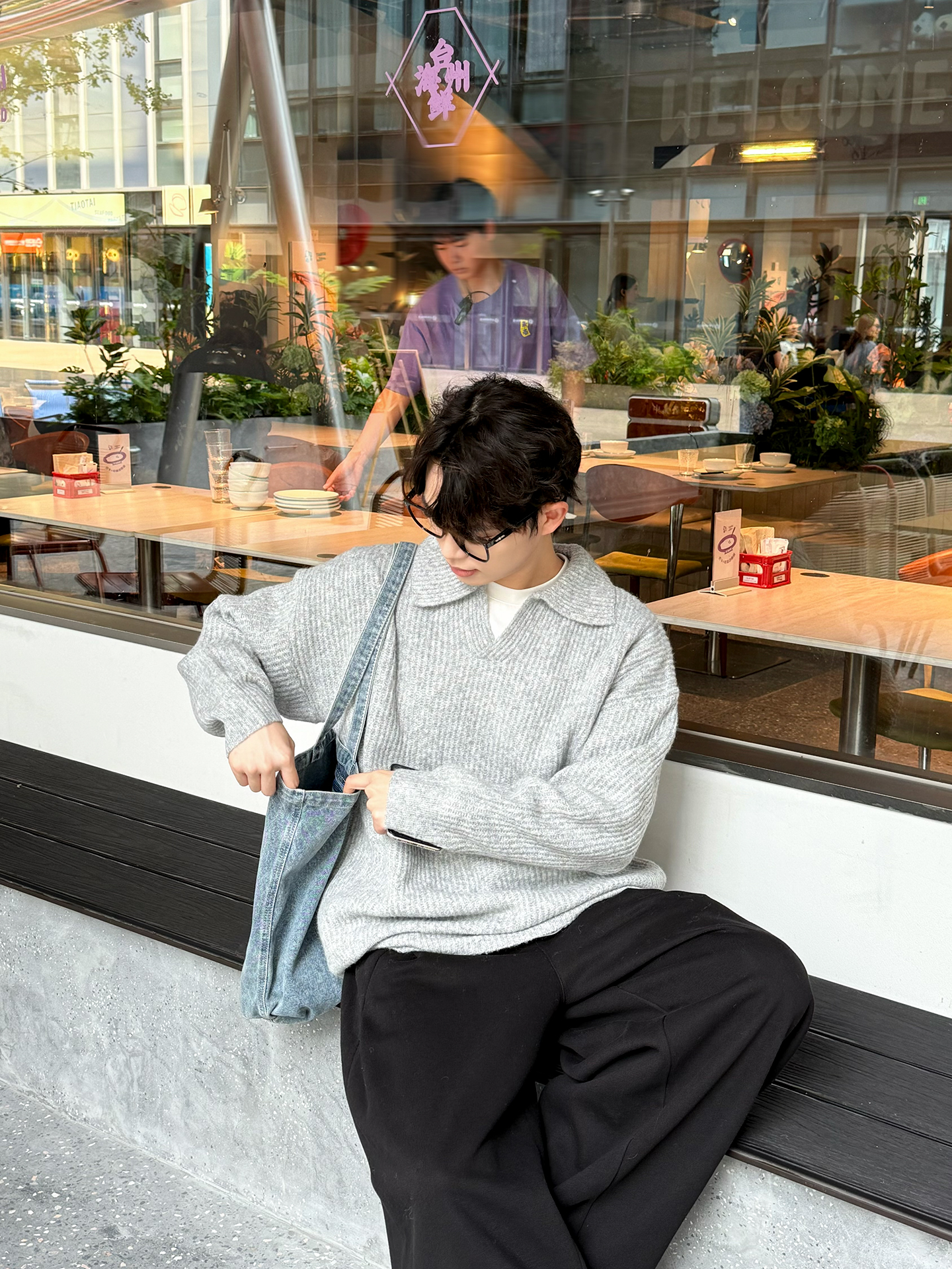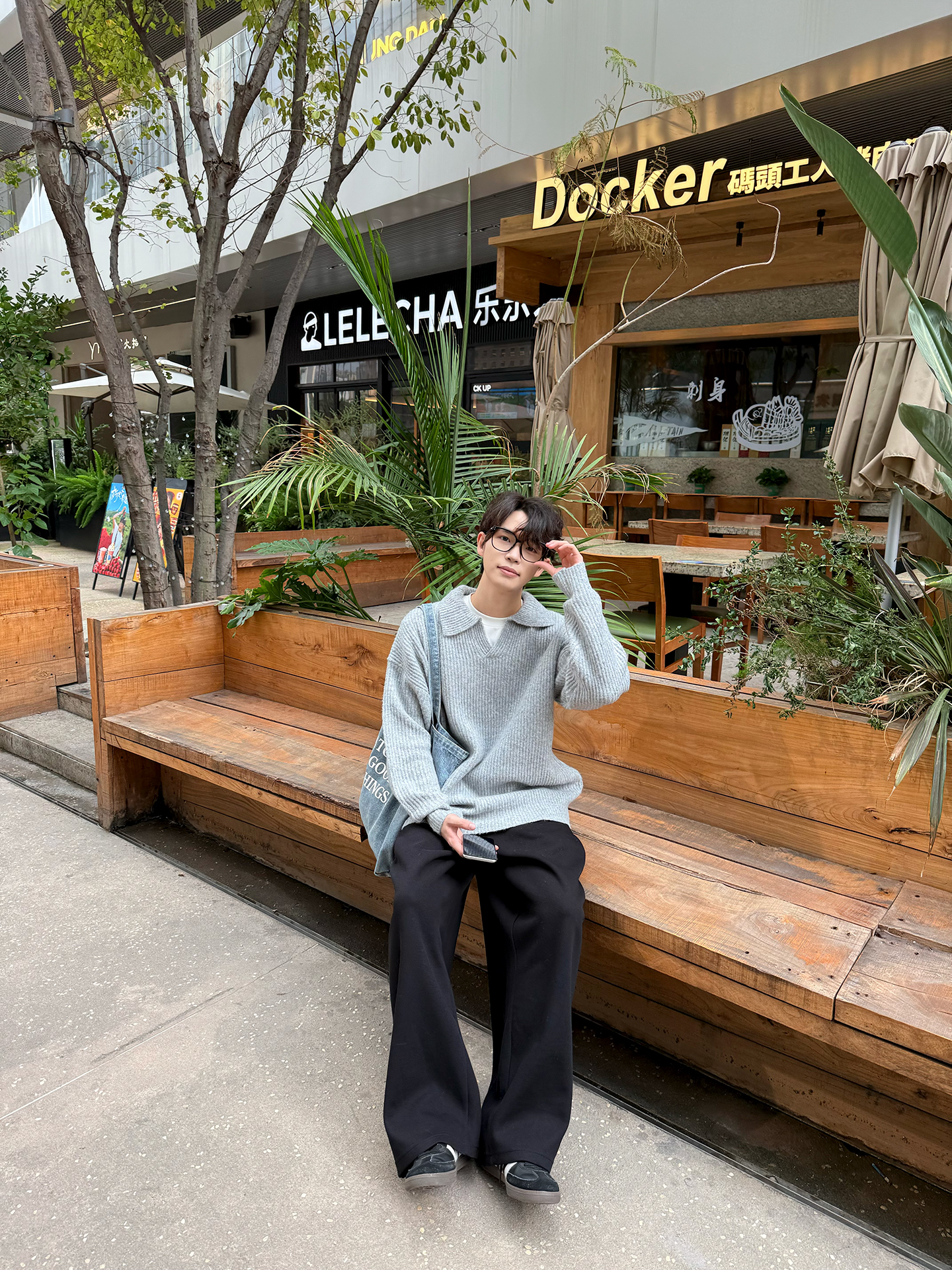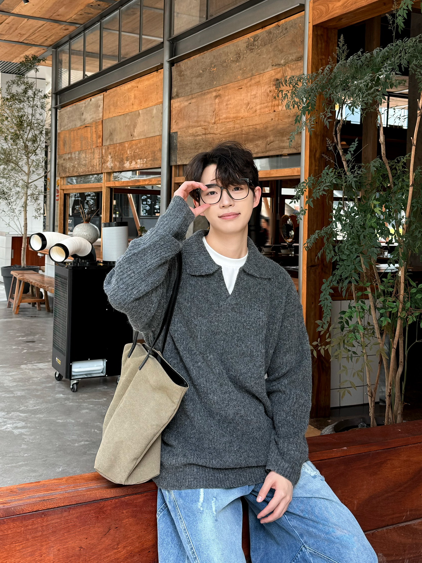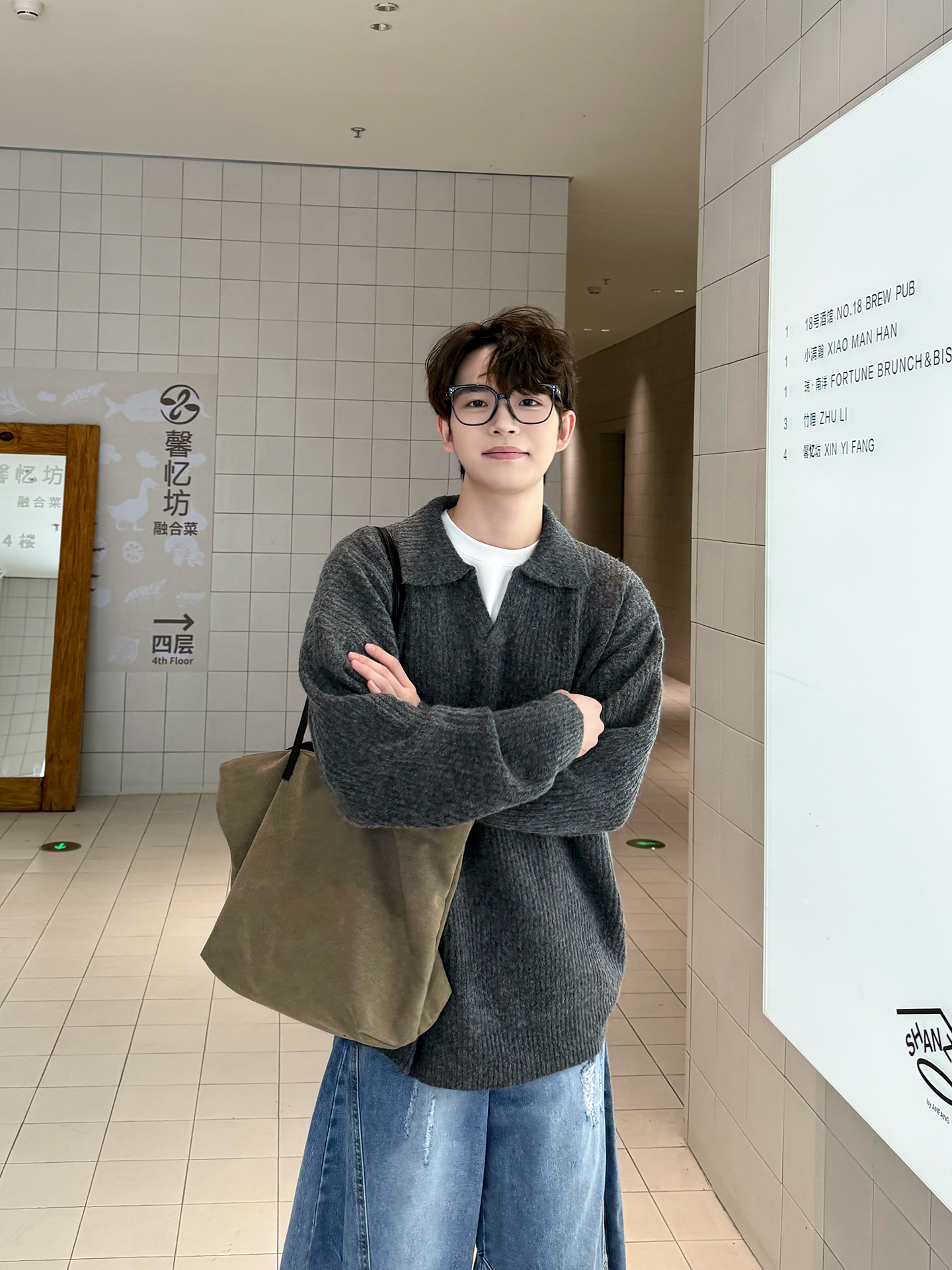 DAZO 輕羊毛混紡寬松翻領毛衣男士輕奢高級感純色缺口領針織衫