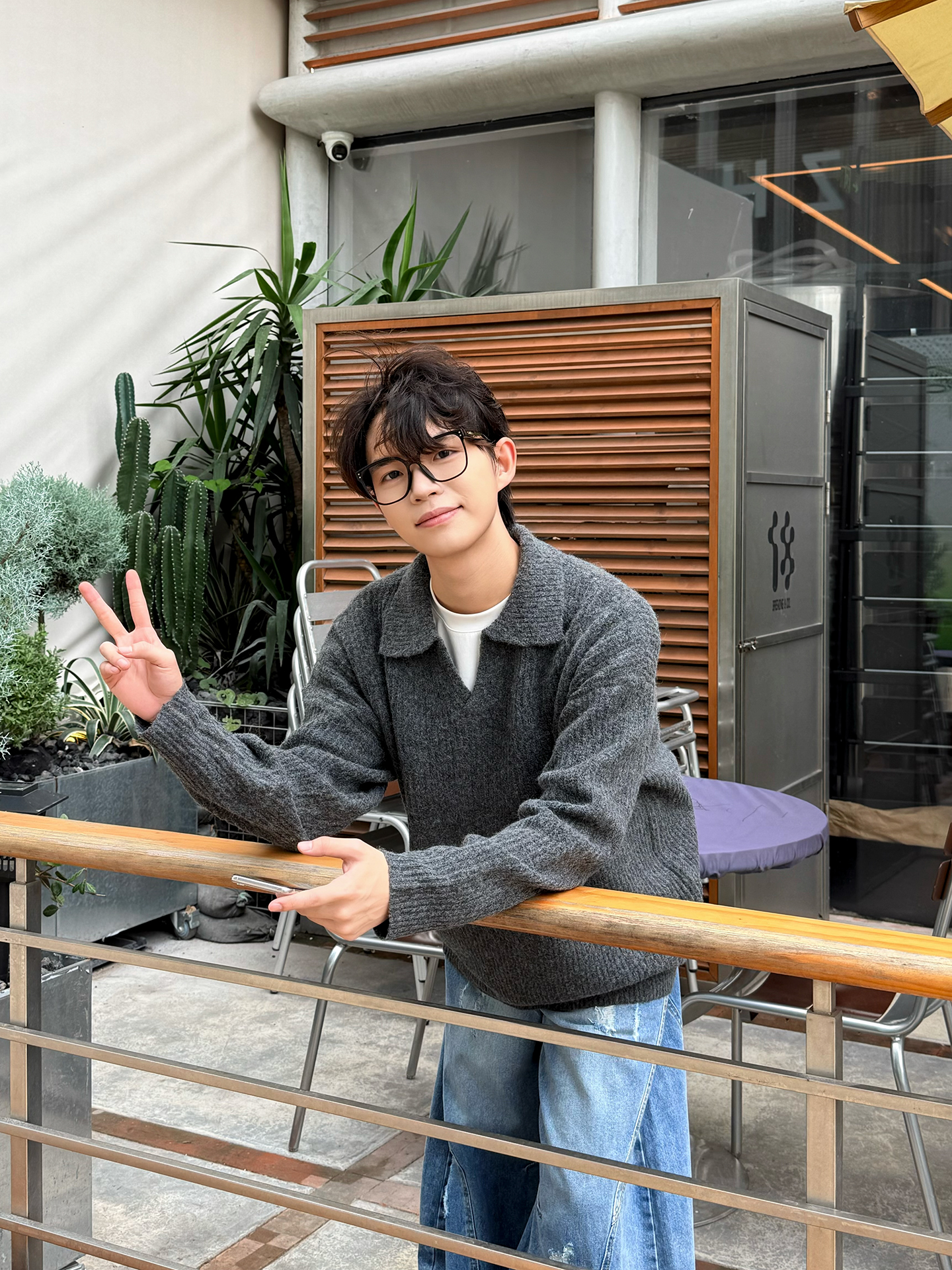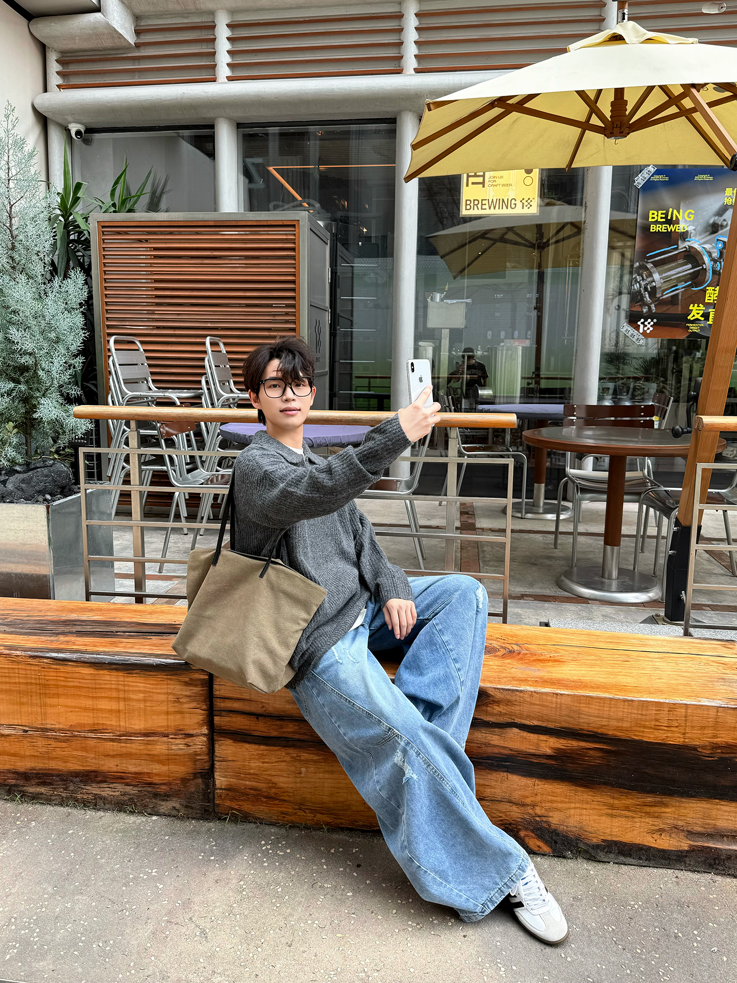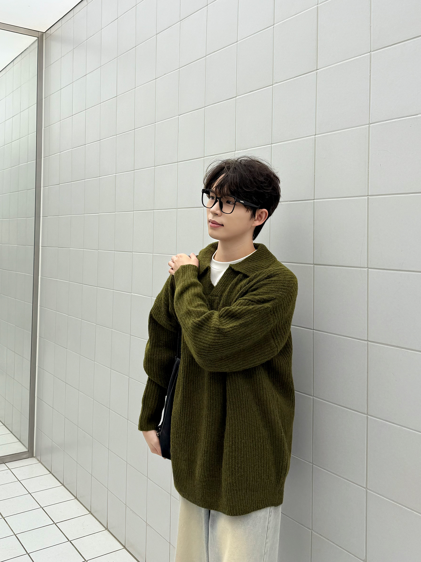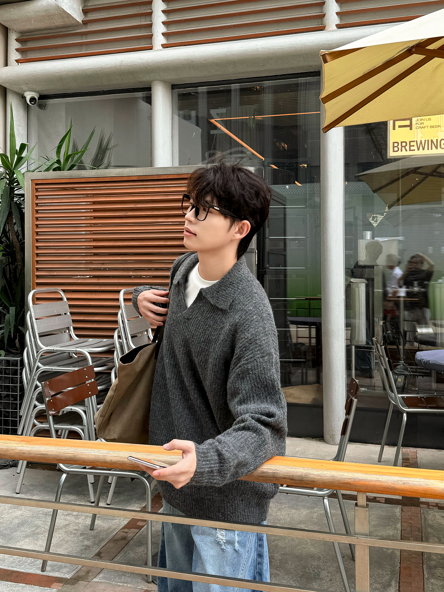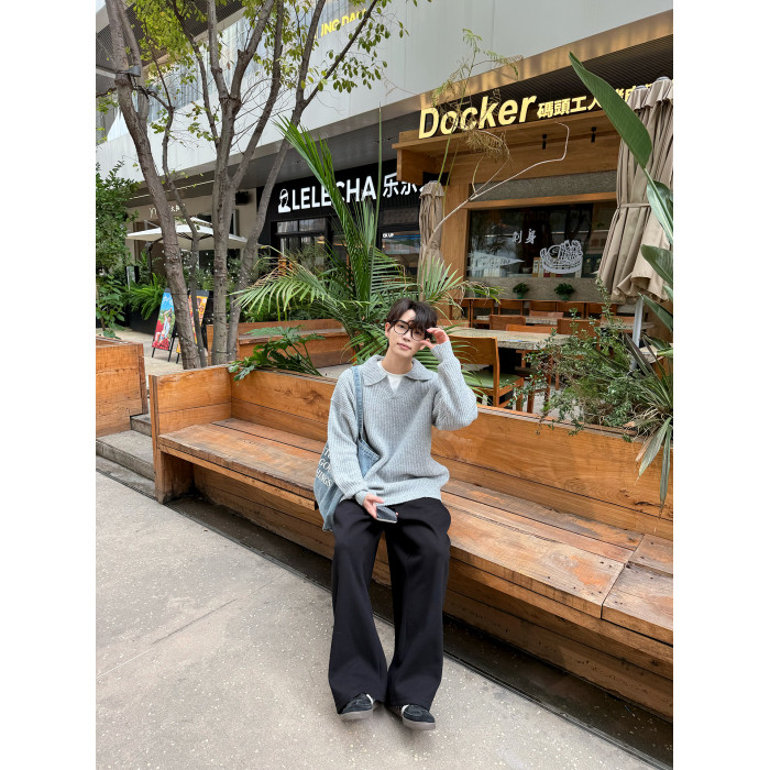 DAZO 輕羊毛混紡寬松翻領毛衣男士輕奢高級感純色缺口領針織衫
