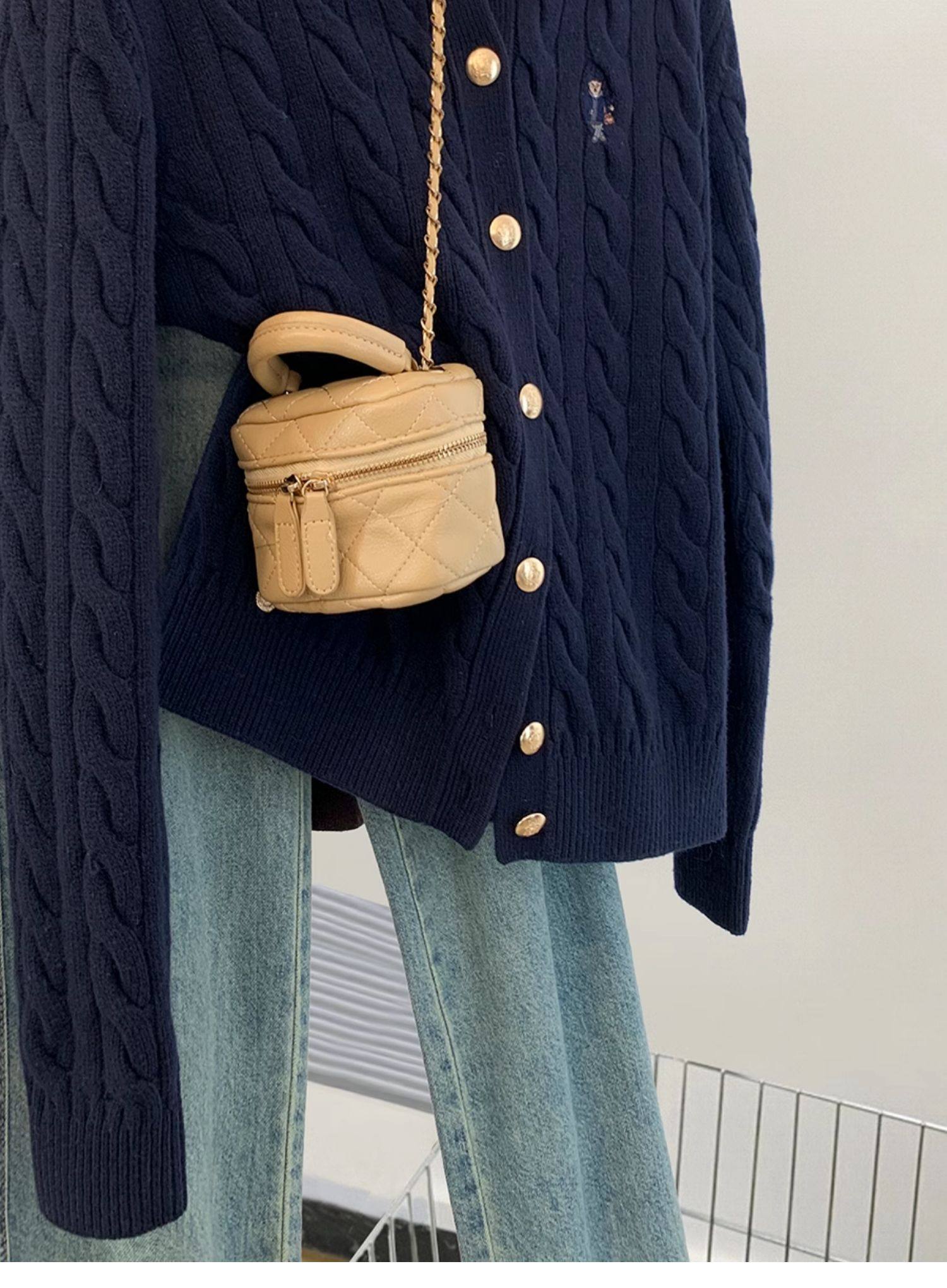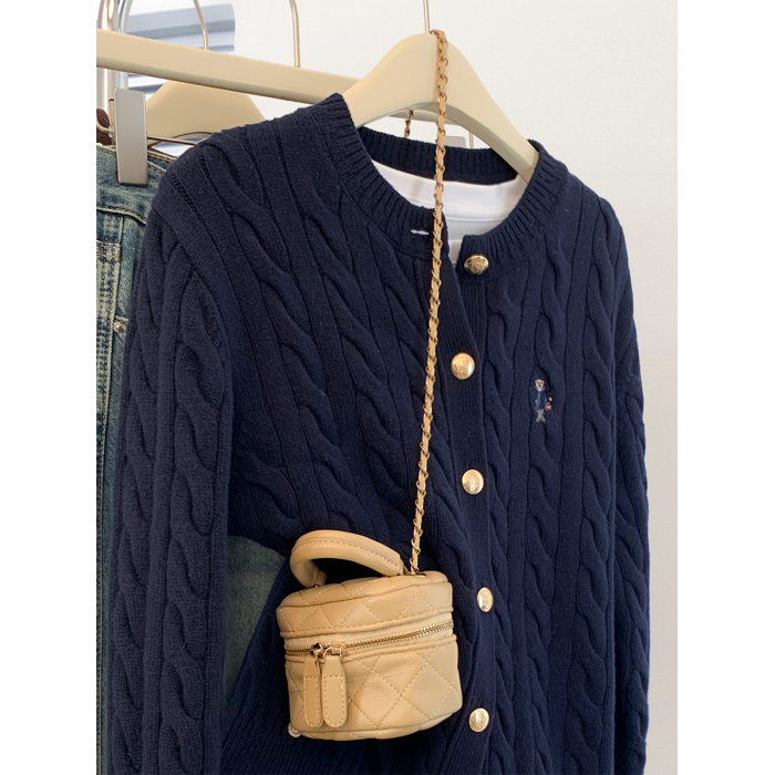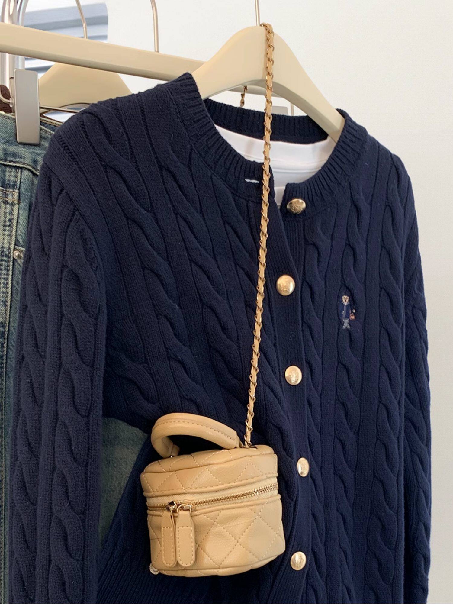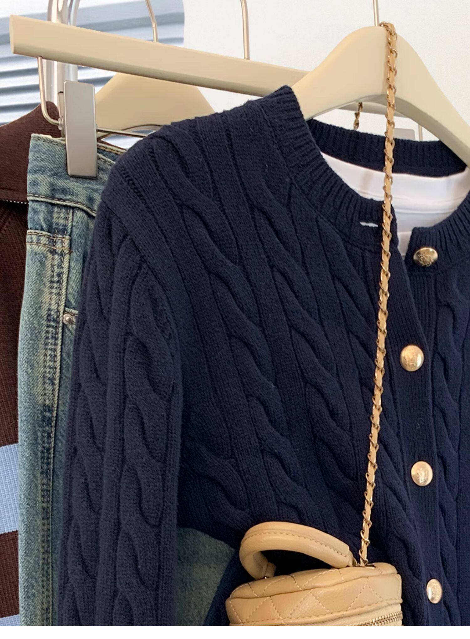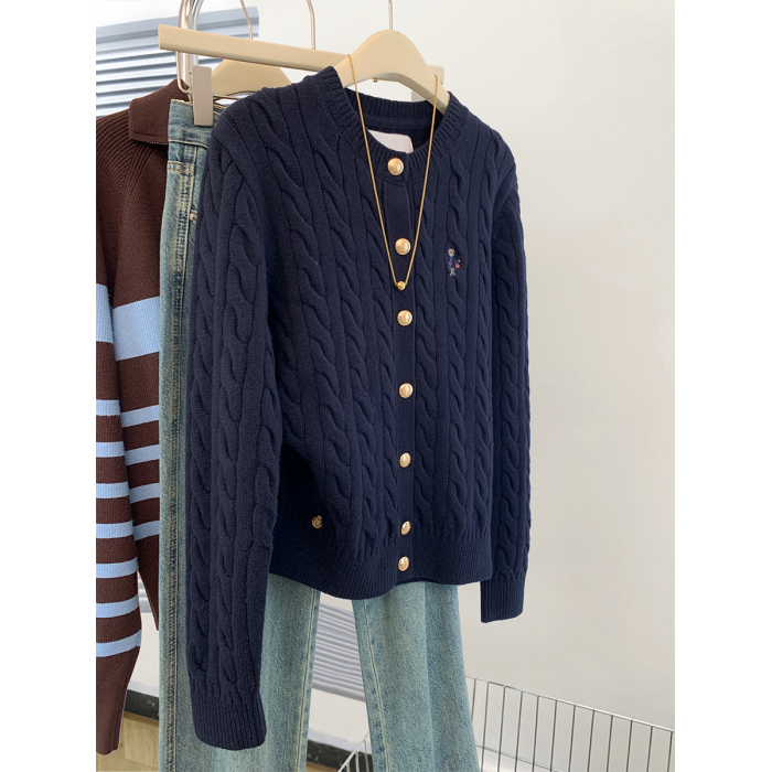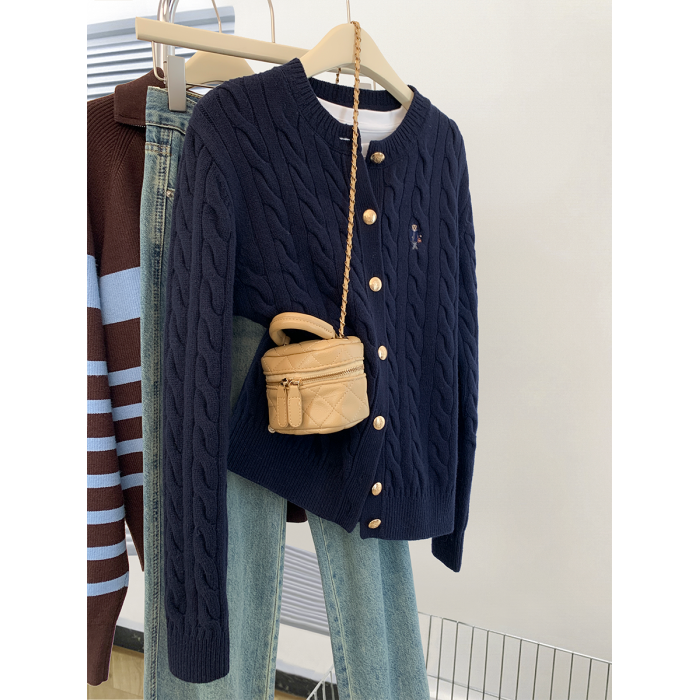 藏青色麻花羊毛針織衫毛衣外套女秋冬2025新款小個子正肩外搭開衫