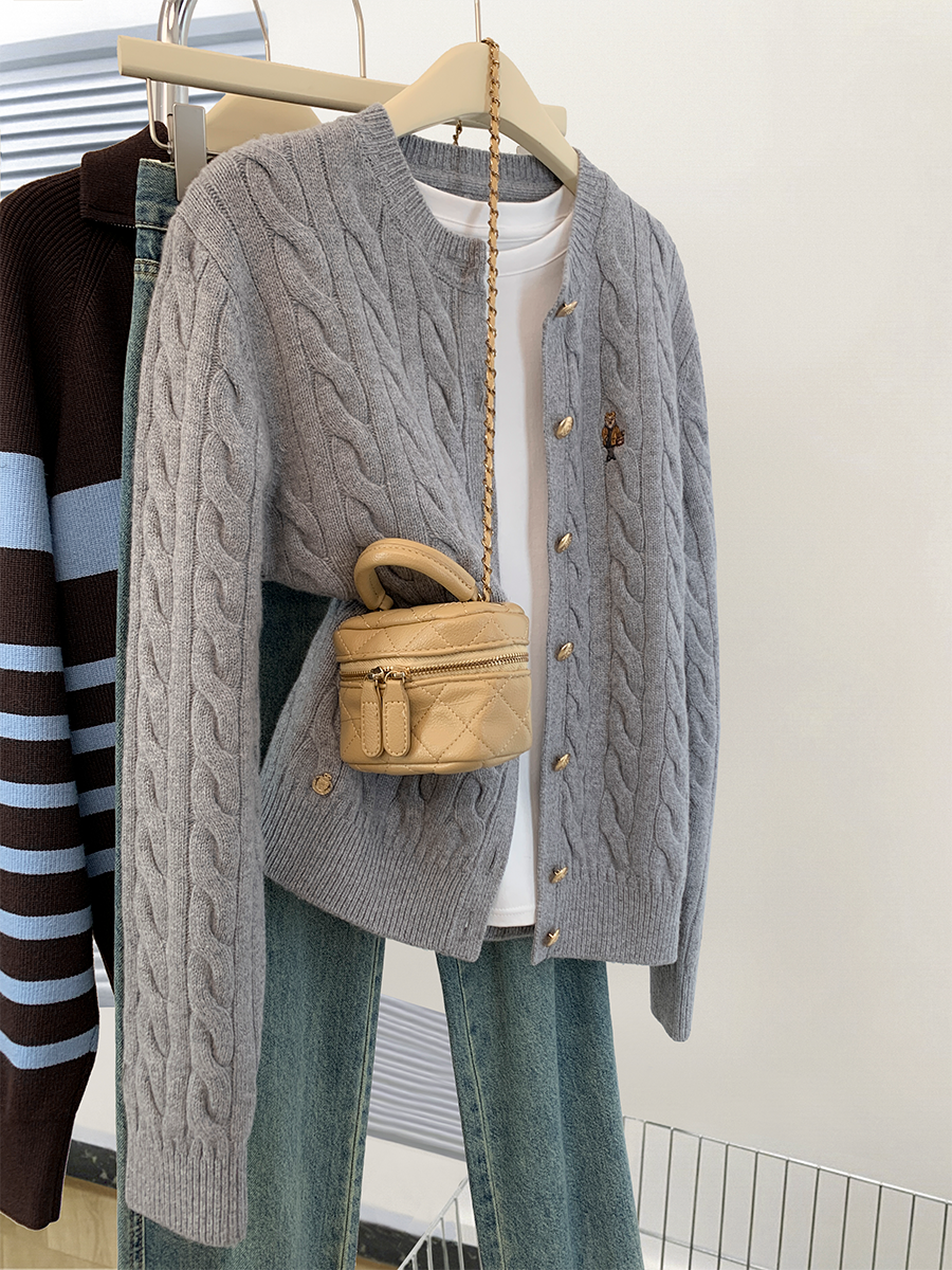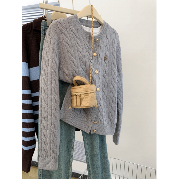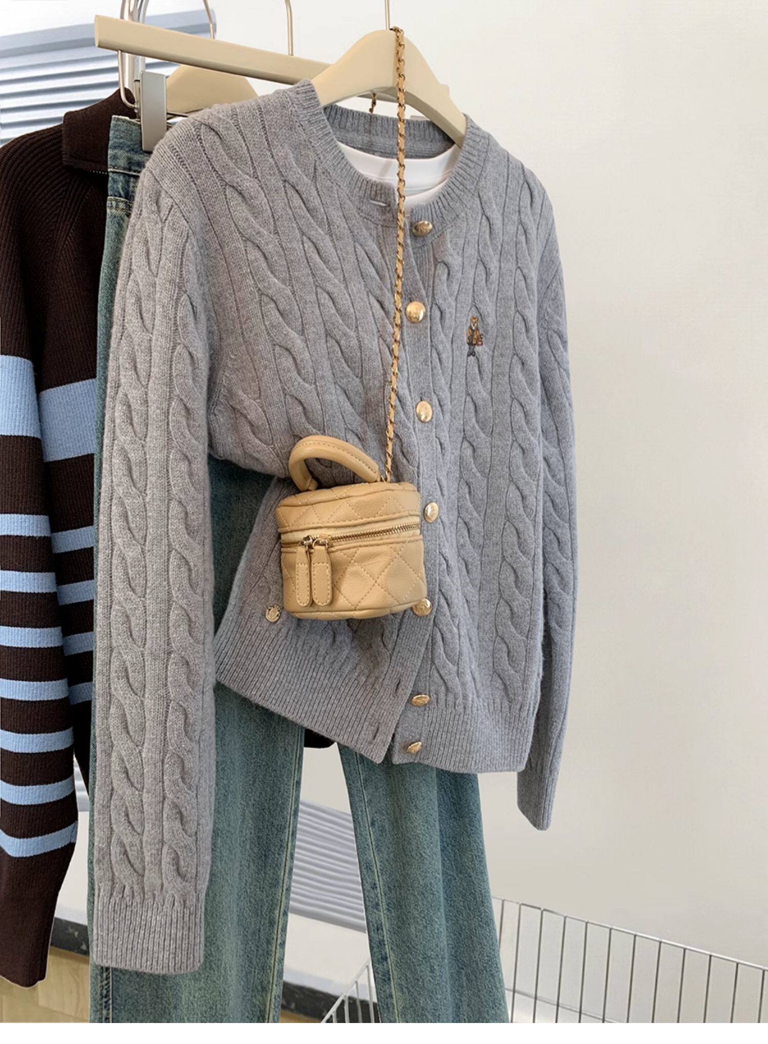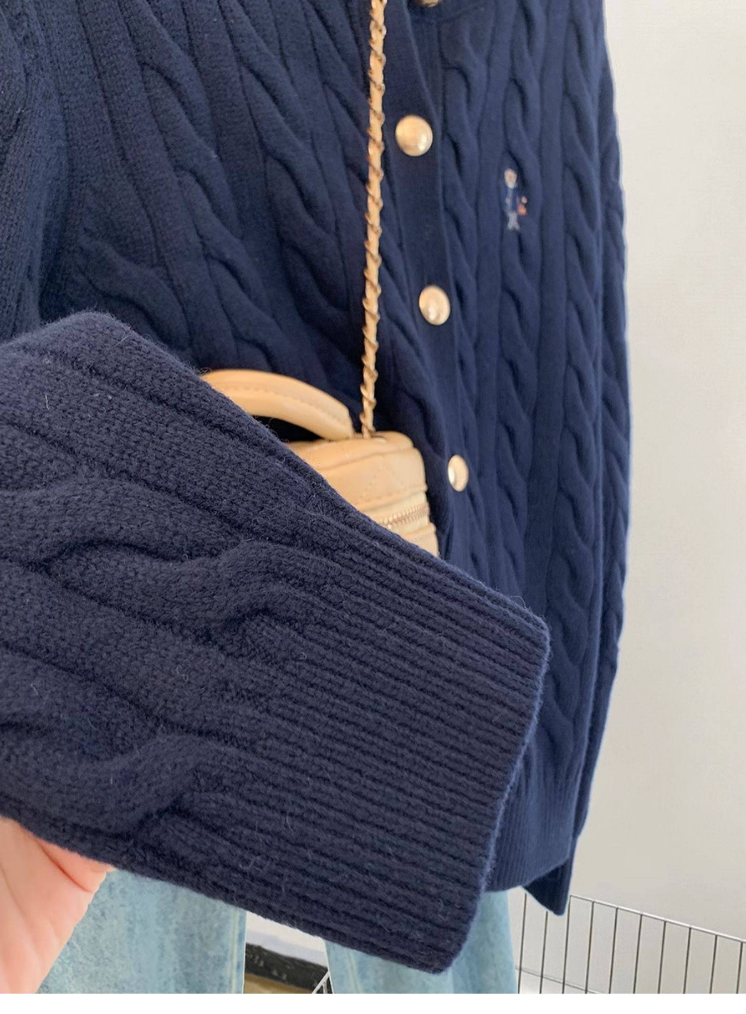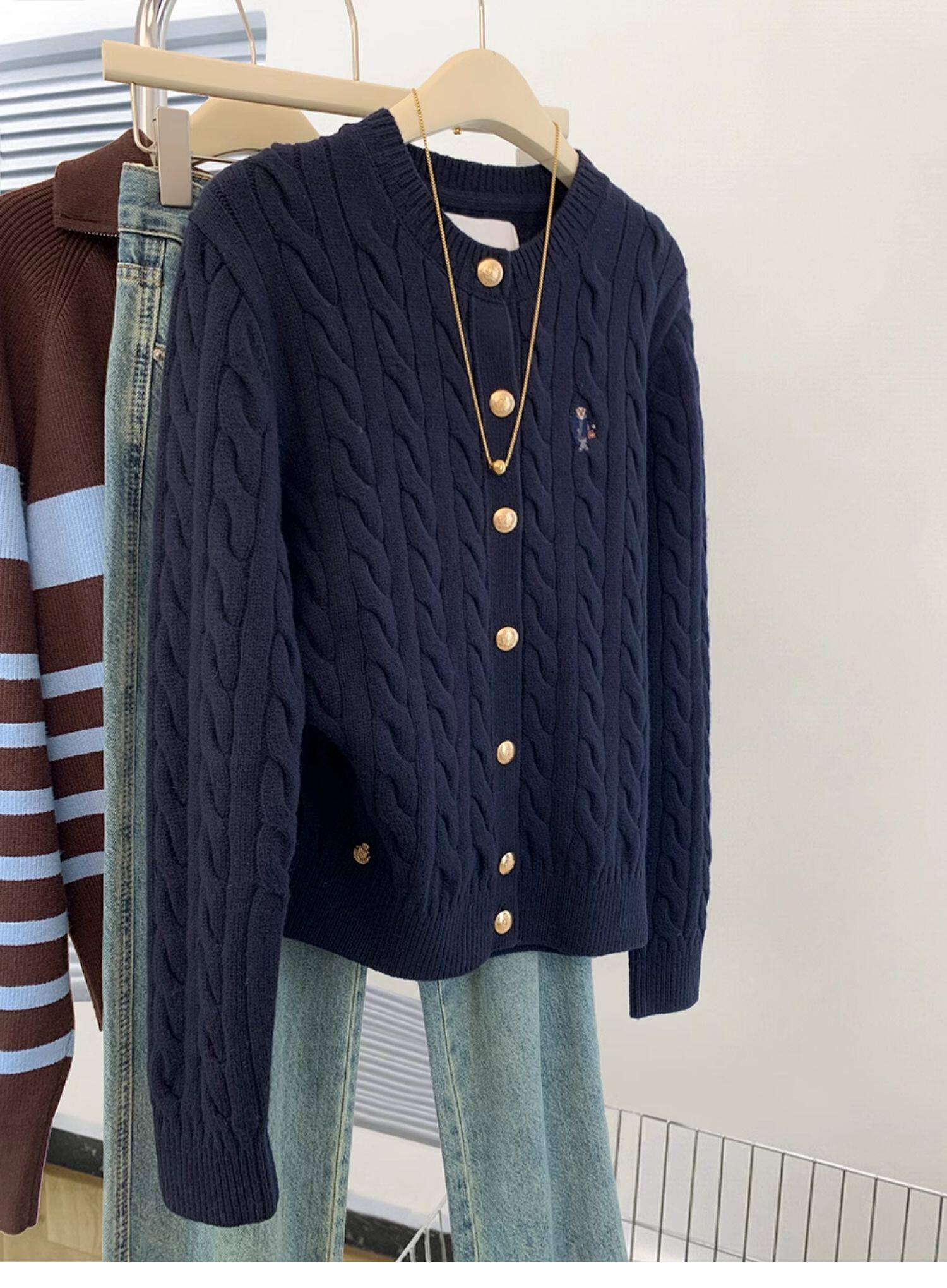 藏青色麻花羊毛針織衫毛衣外套女秋冬2025新款小個子正肩外搭開衫