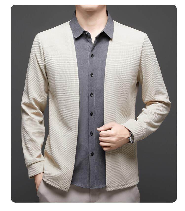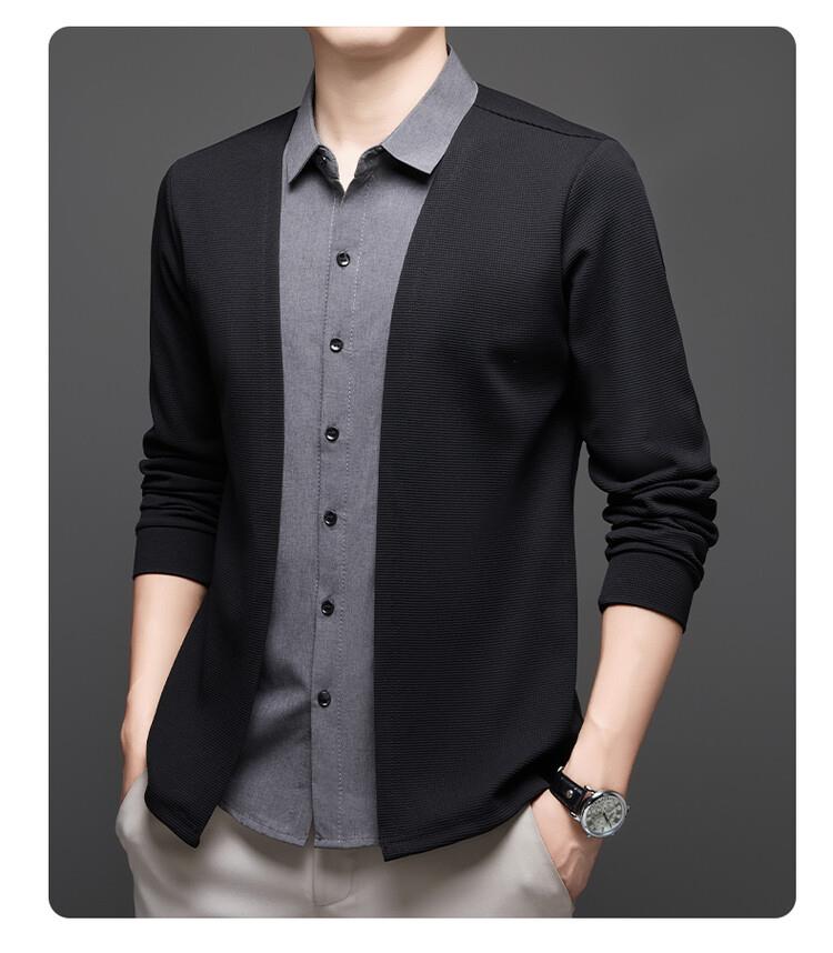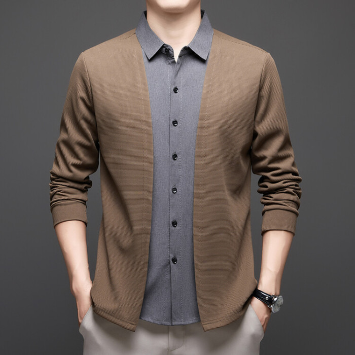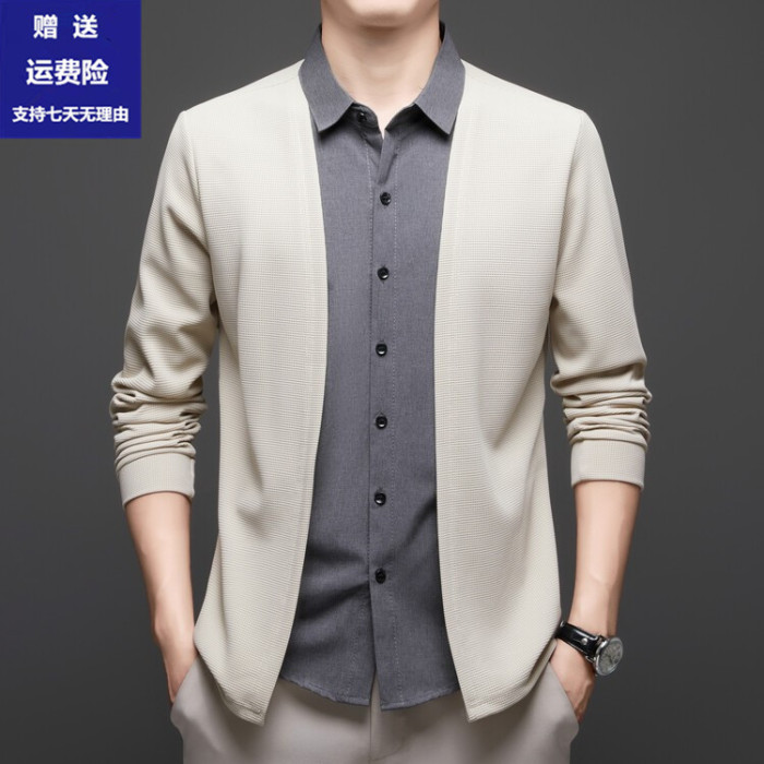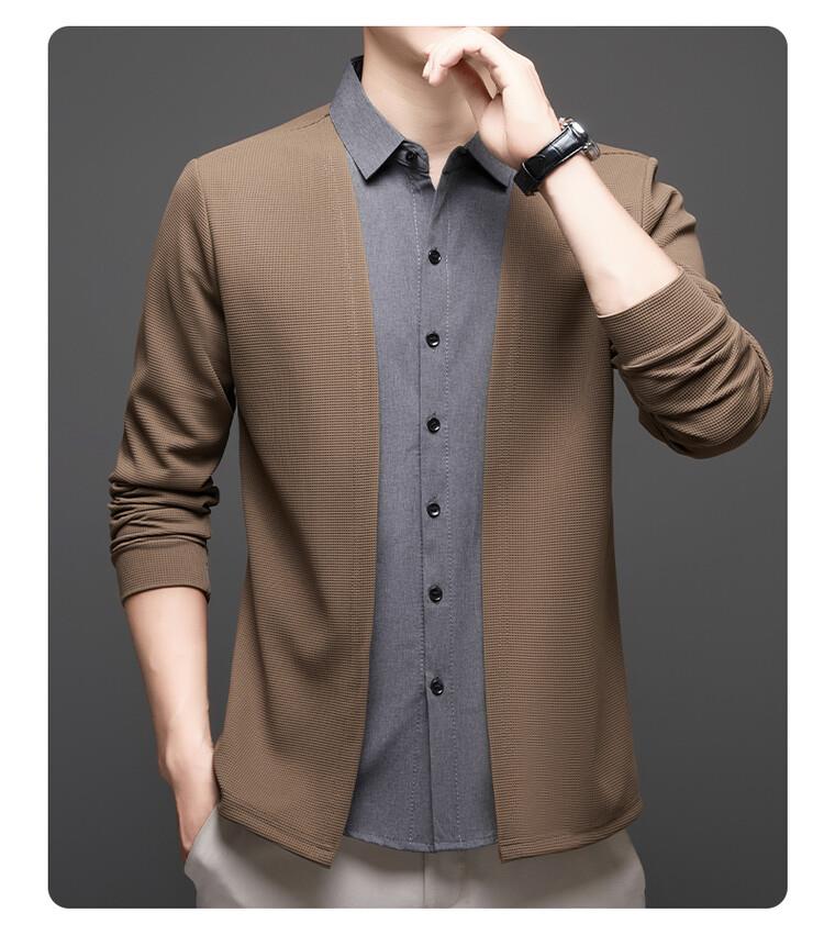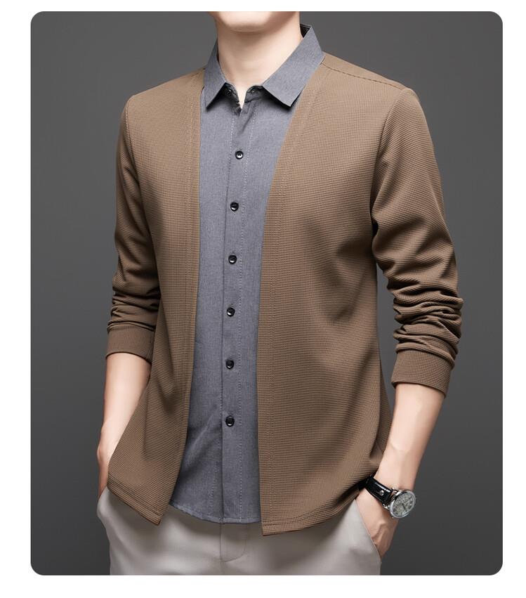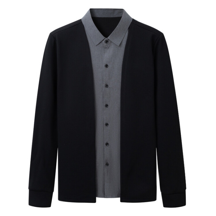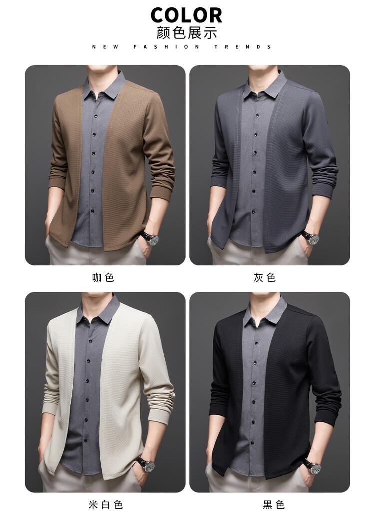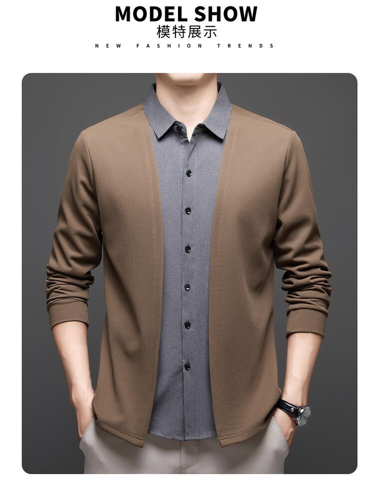啄木鳥男士新款長袖襯衫領假兩件寬松舒適中年爸爸裝上衣針織開衫