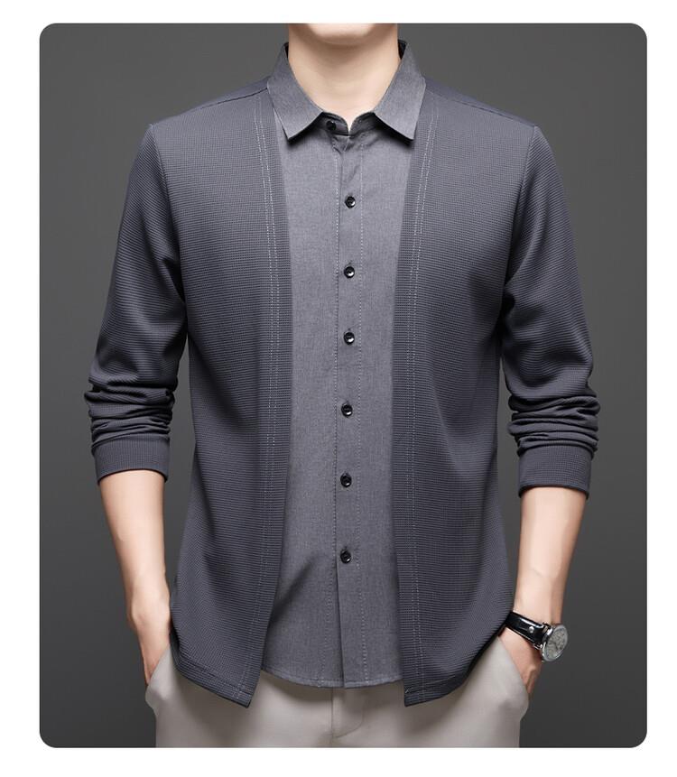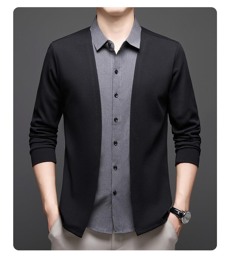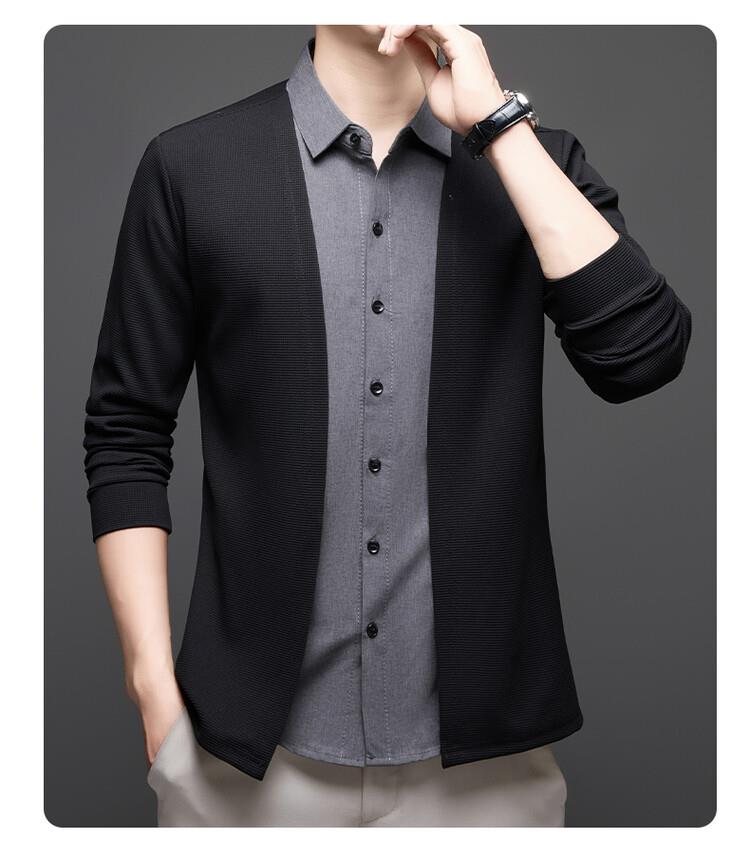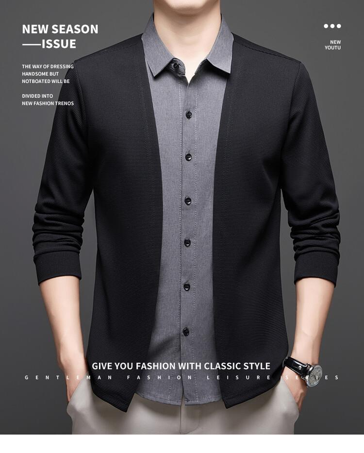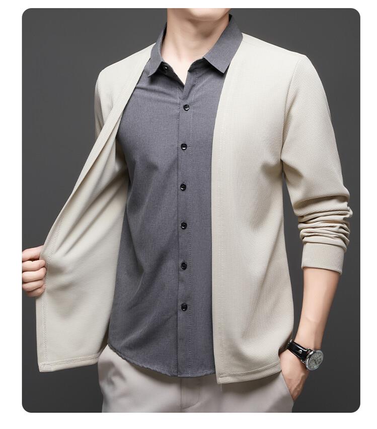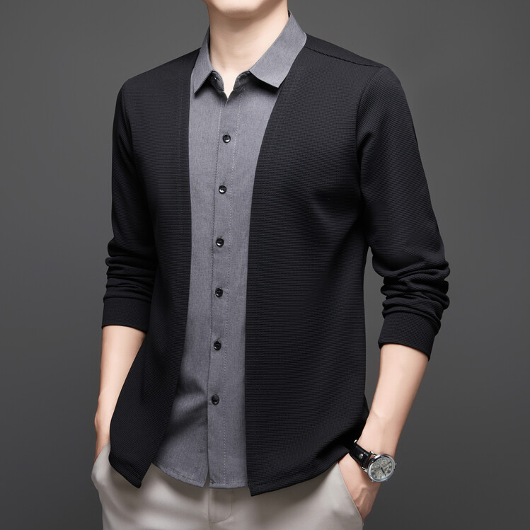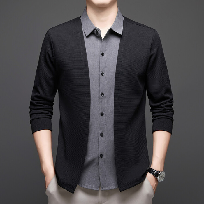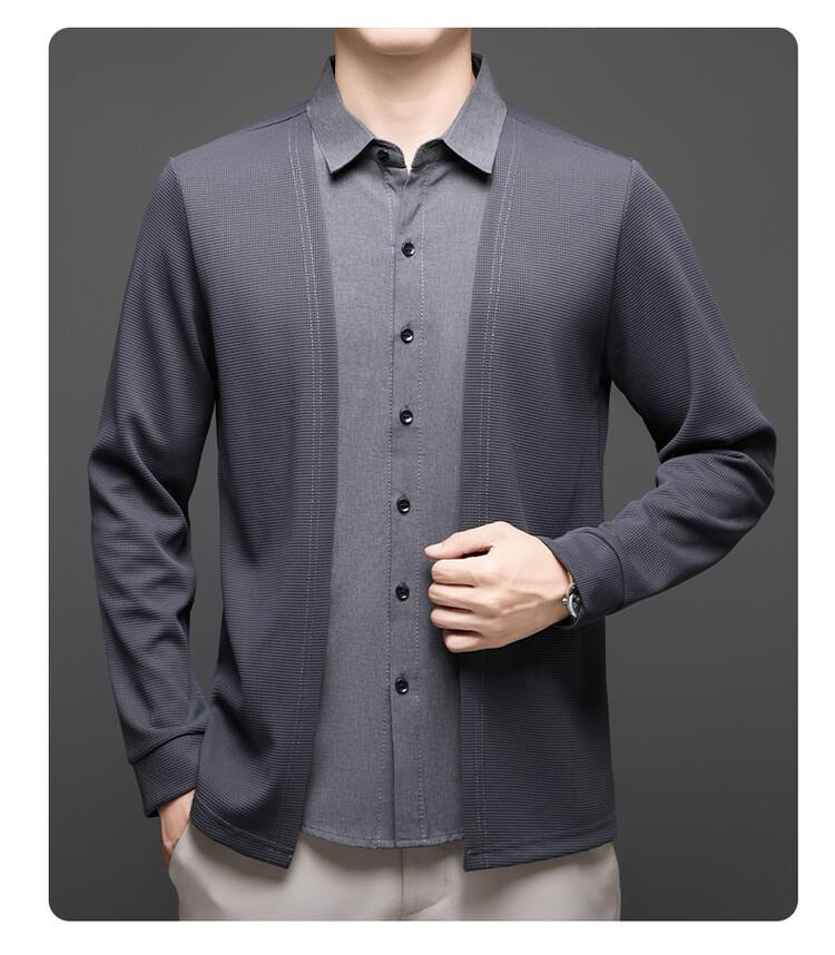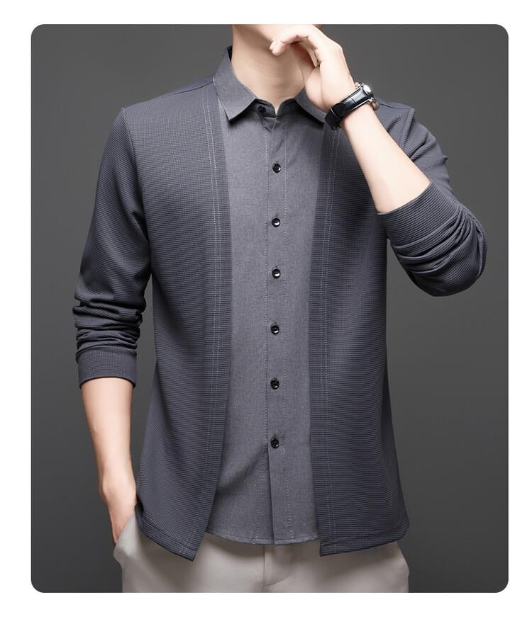 啄木鳥男士新款長袖襯衫領假兩件寬松舒適中年爸爸裝上衣針織開衫