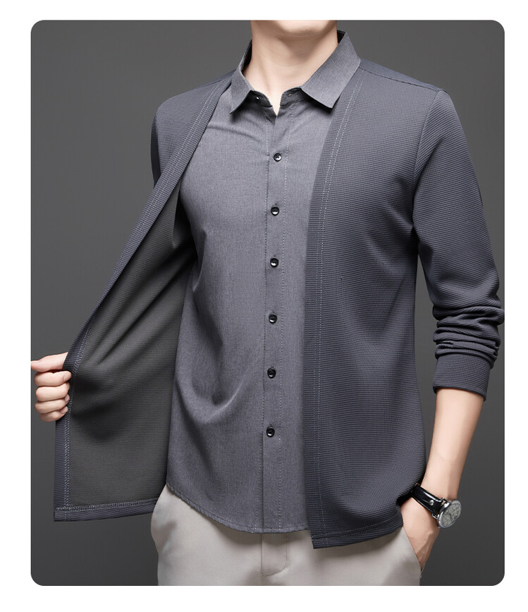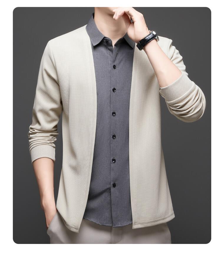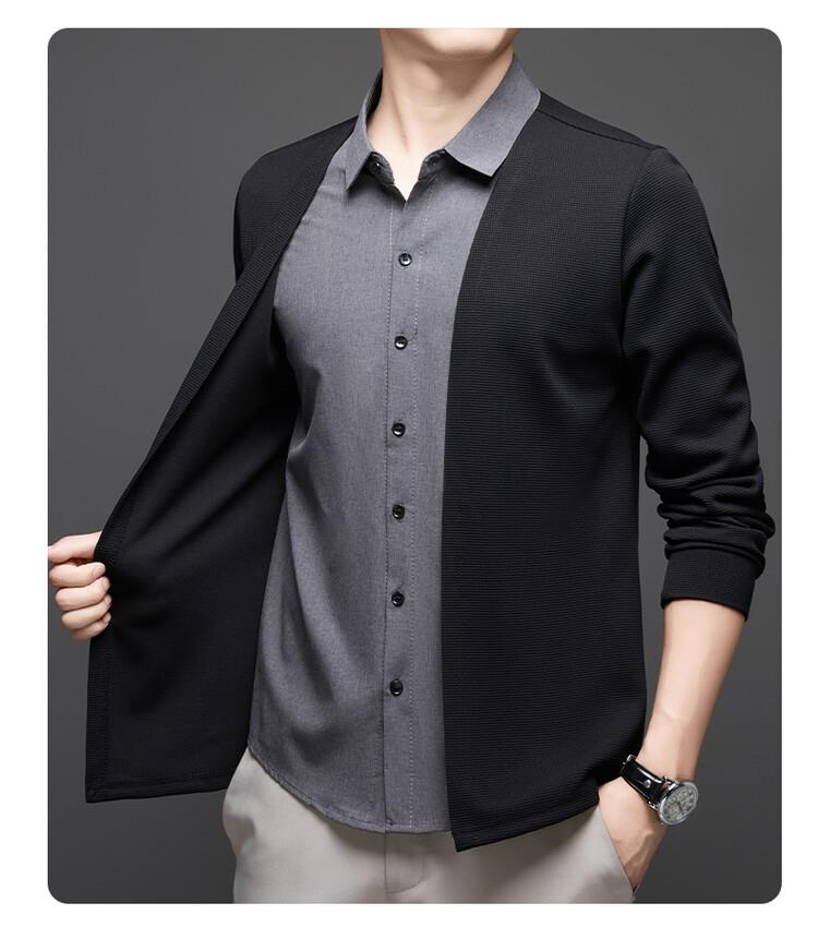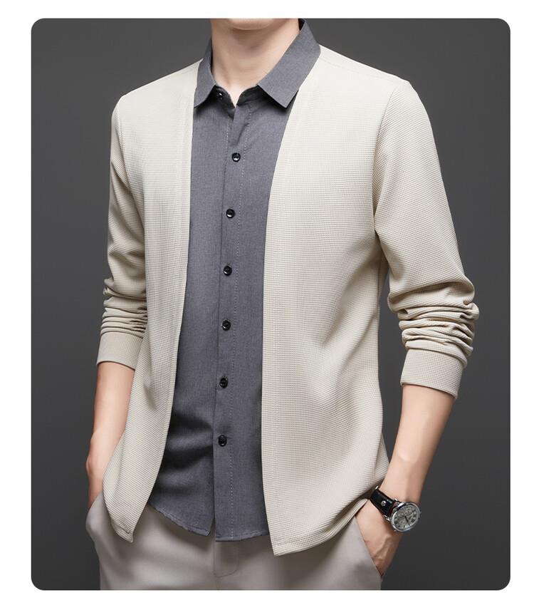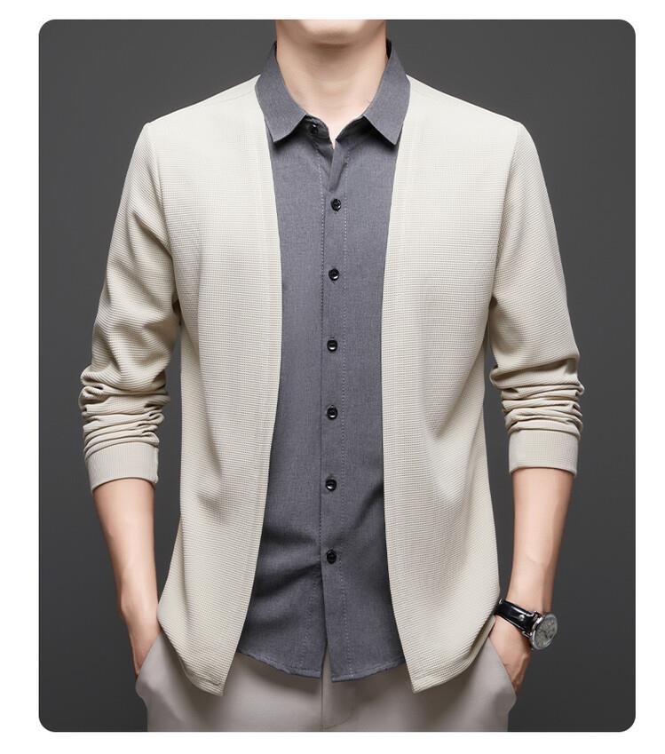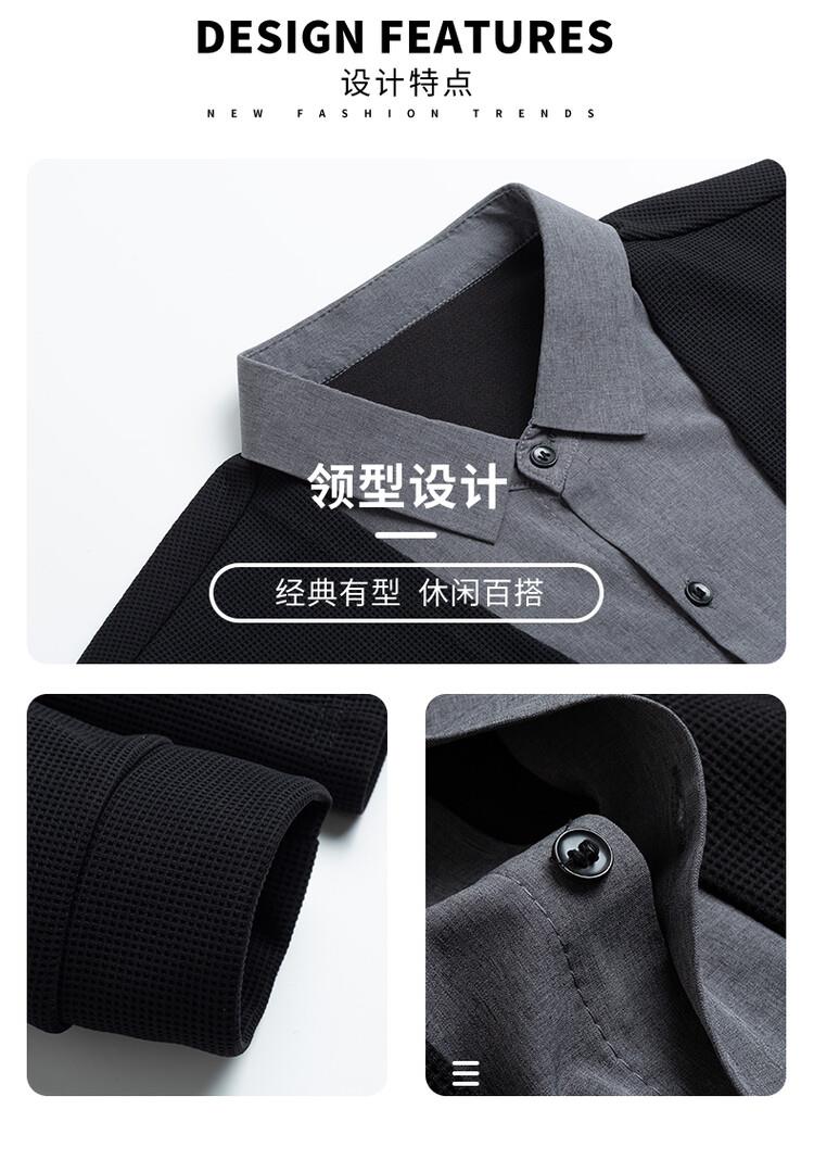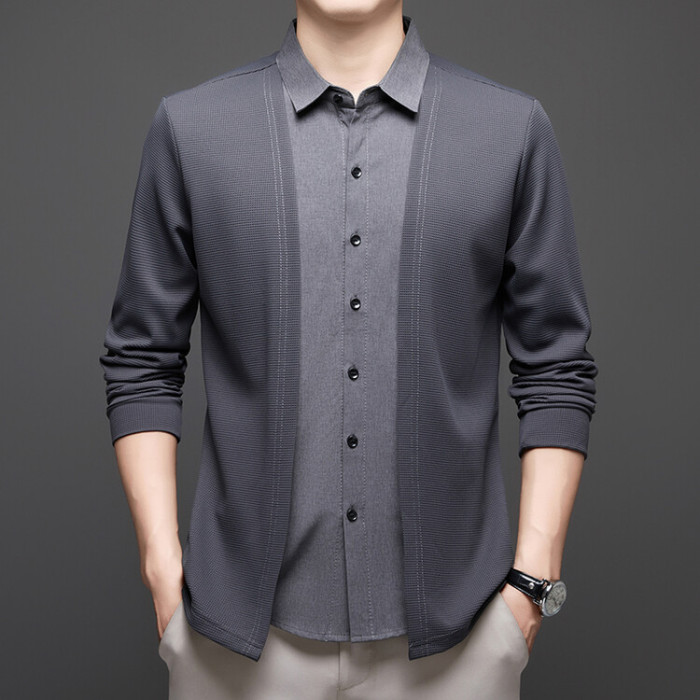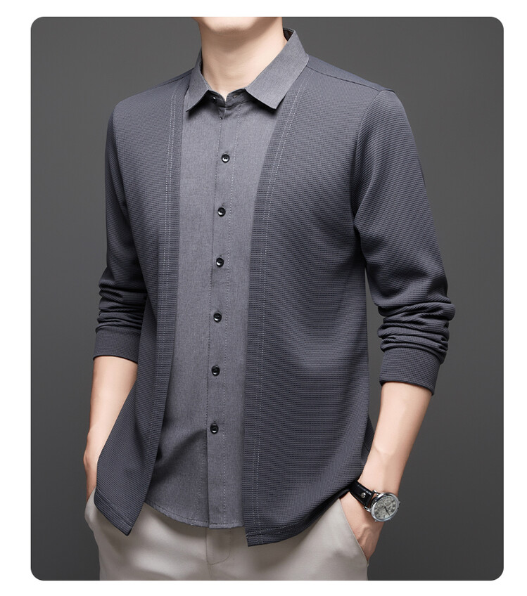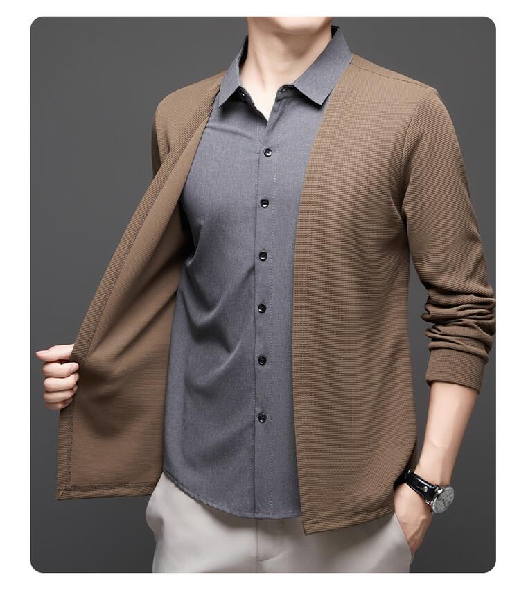 啄木鳥男士新款長袖襯衫領假兩件寬松舒適中年爸爸裝上衣針織開衫