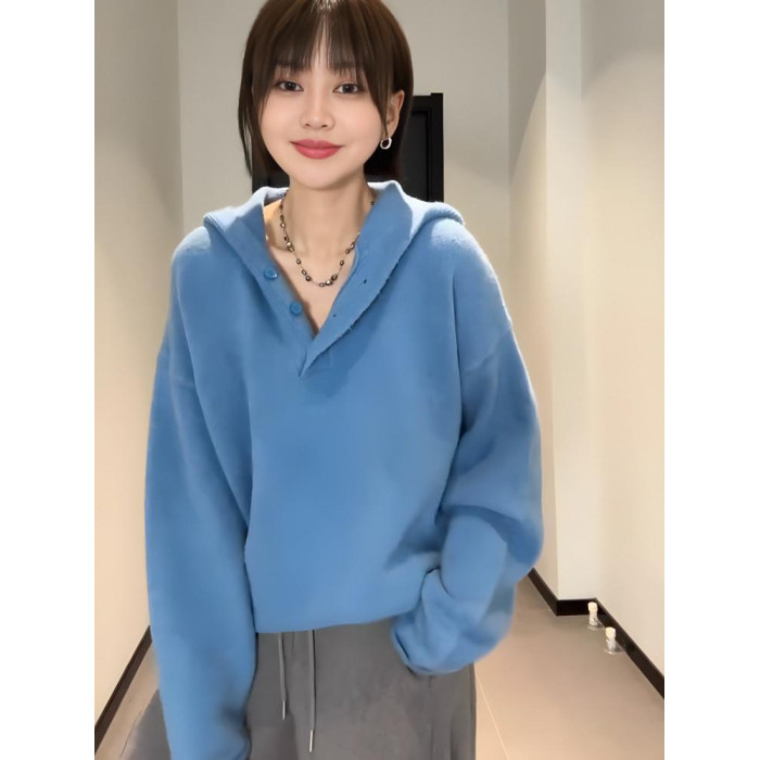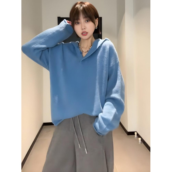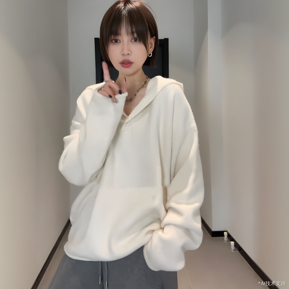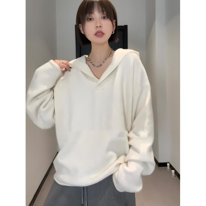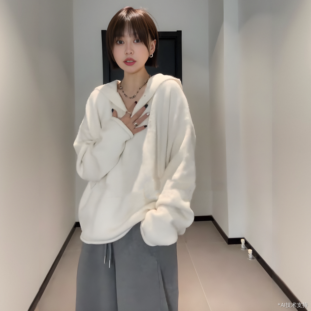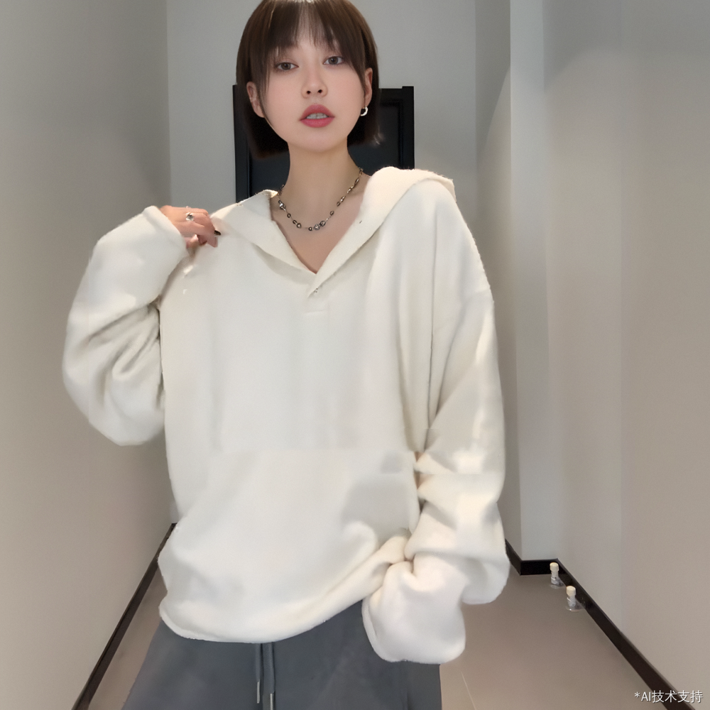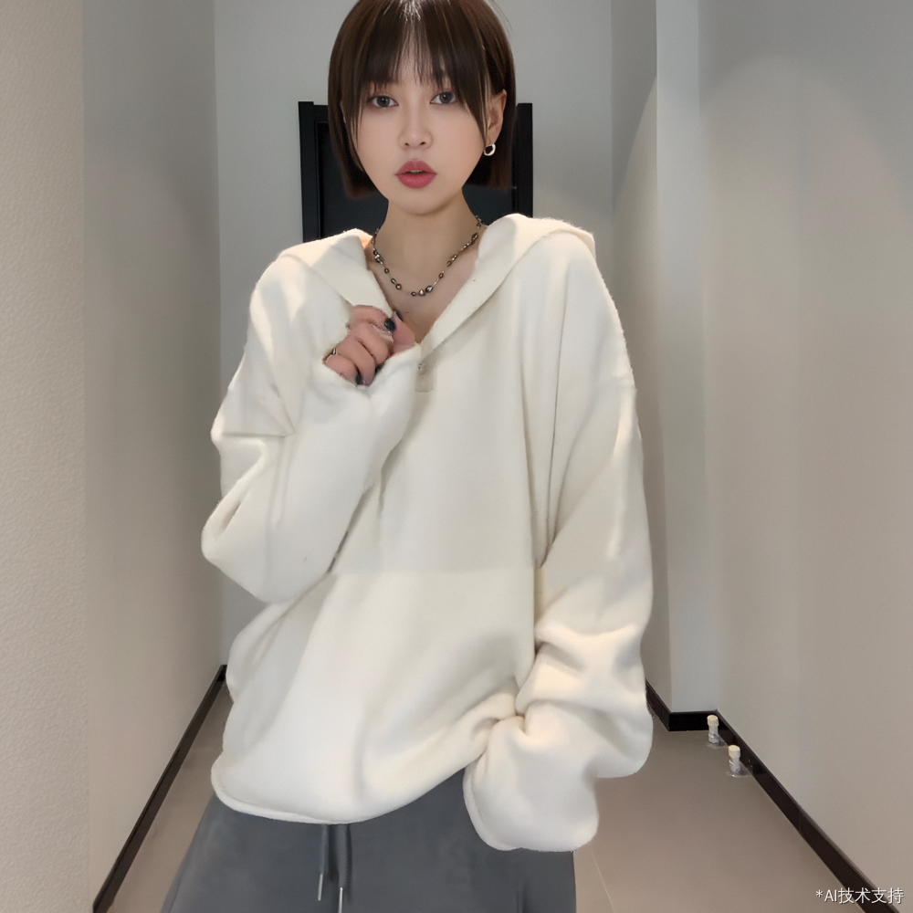 大碼女裝慵嬾風白色連帽毛衣針織衫上衣春秋款胖mm顯瘦內搭打底衫