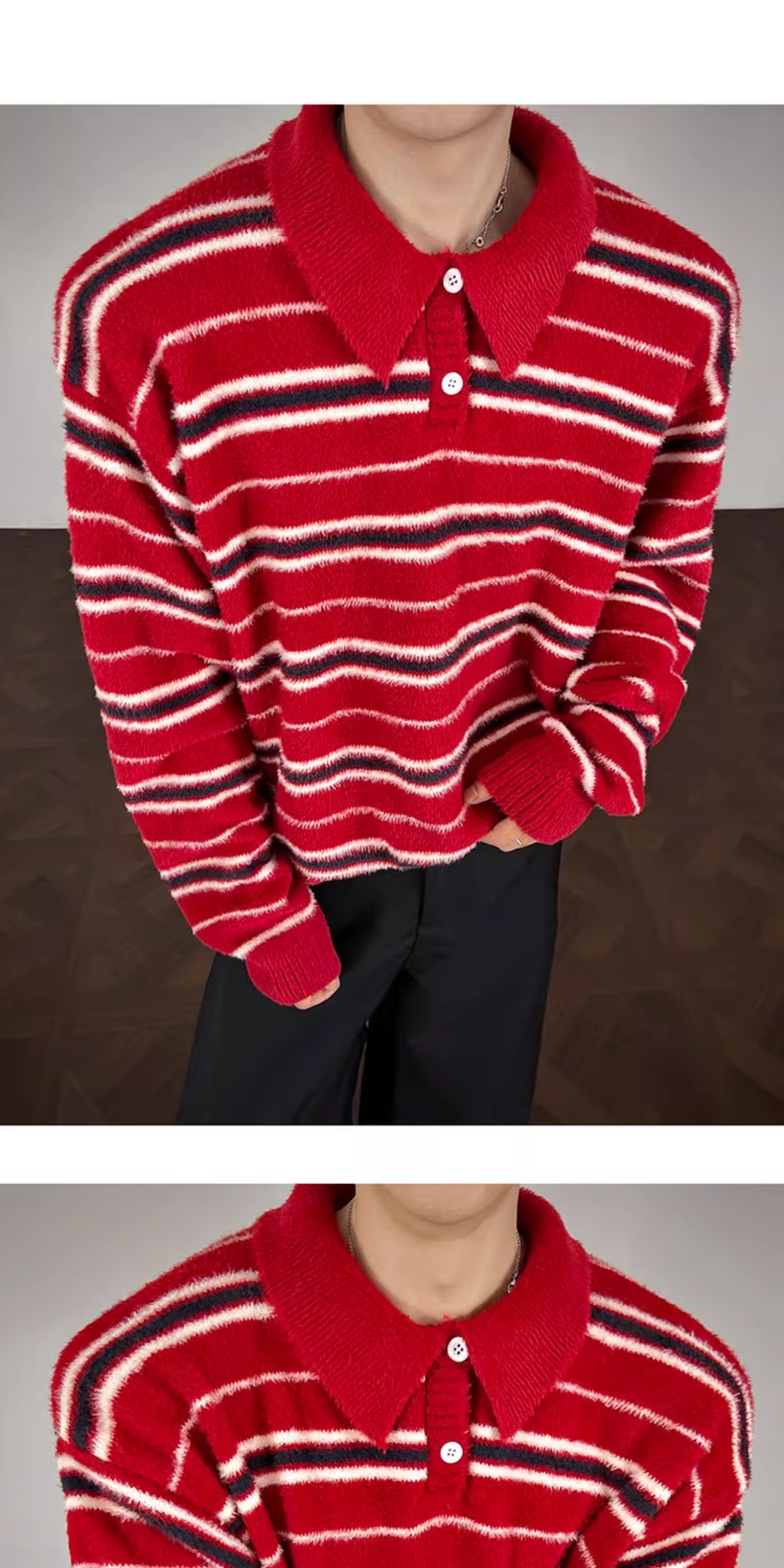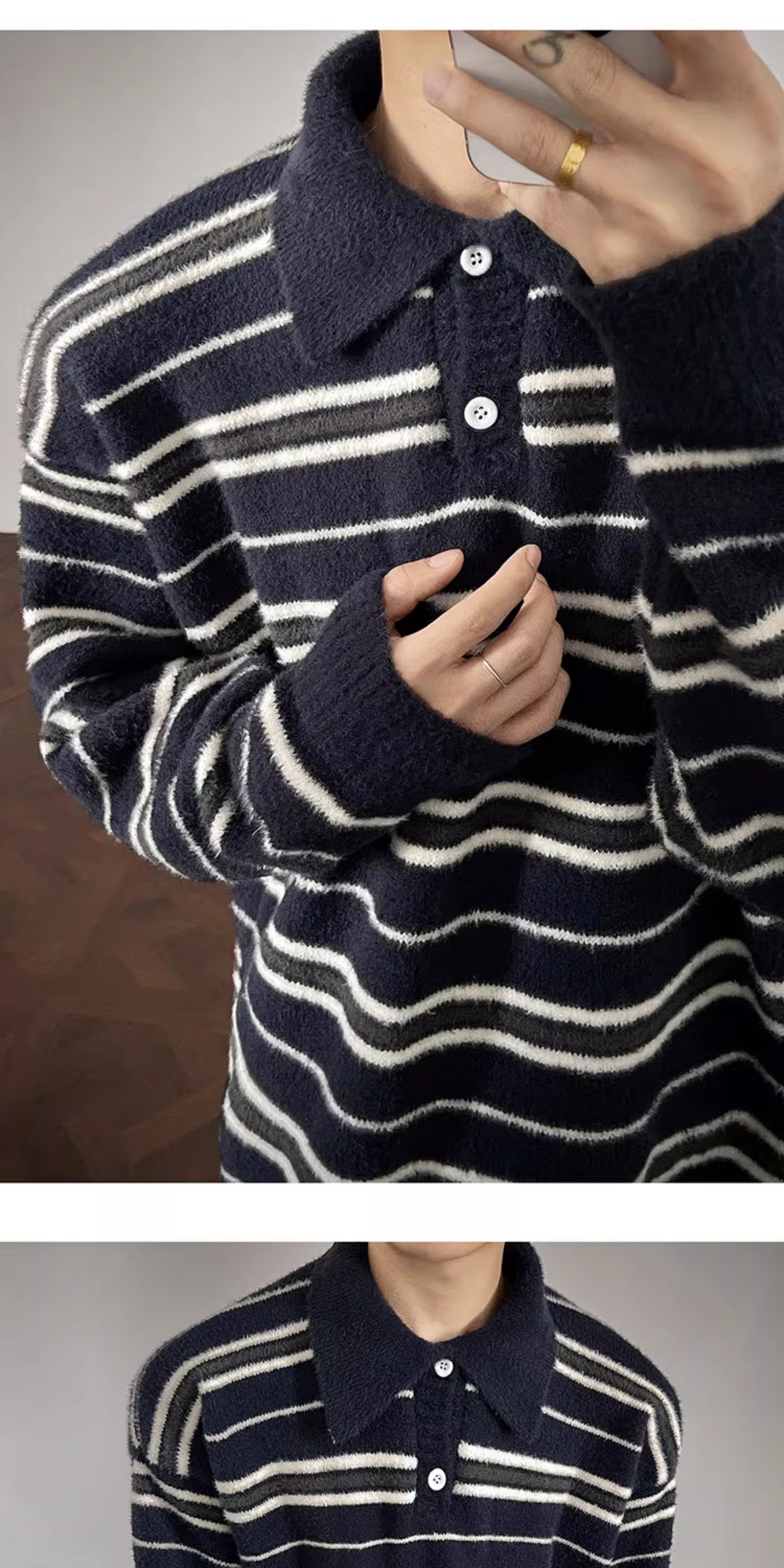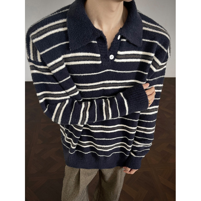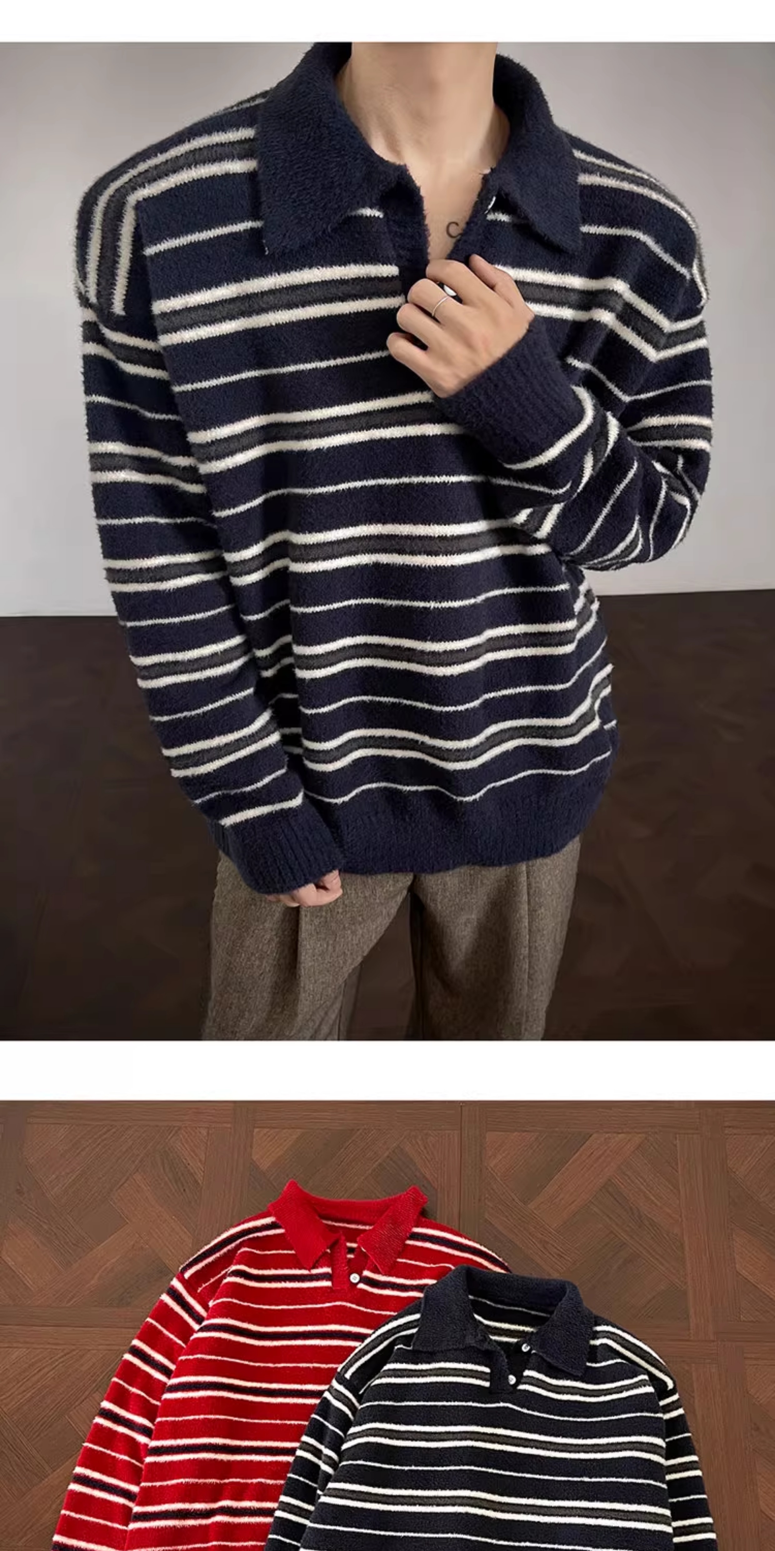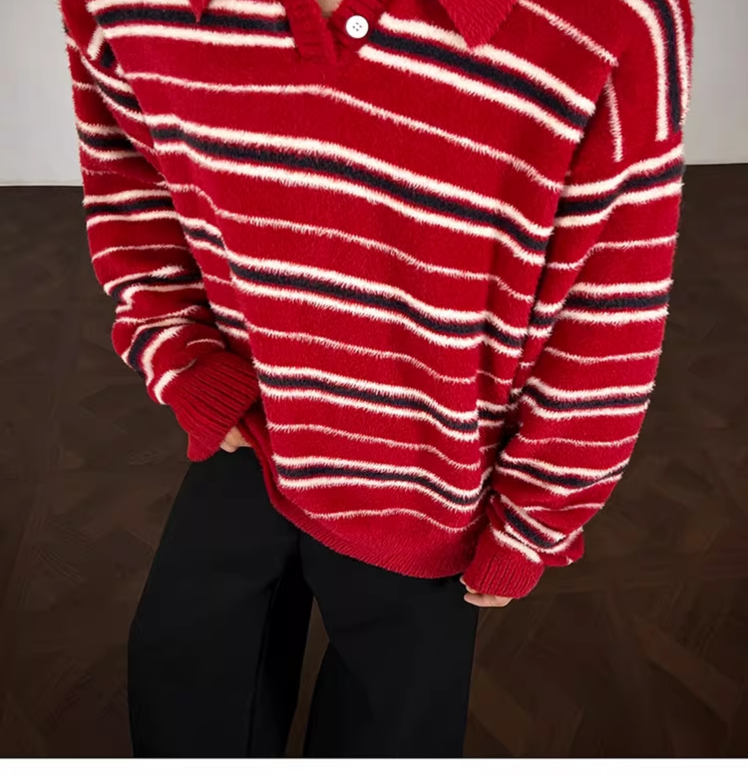 復古老錢風條紋撞色polo領毛衣男女秋冬慵懶感休閒寬松情侶針織衫