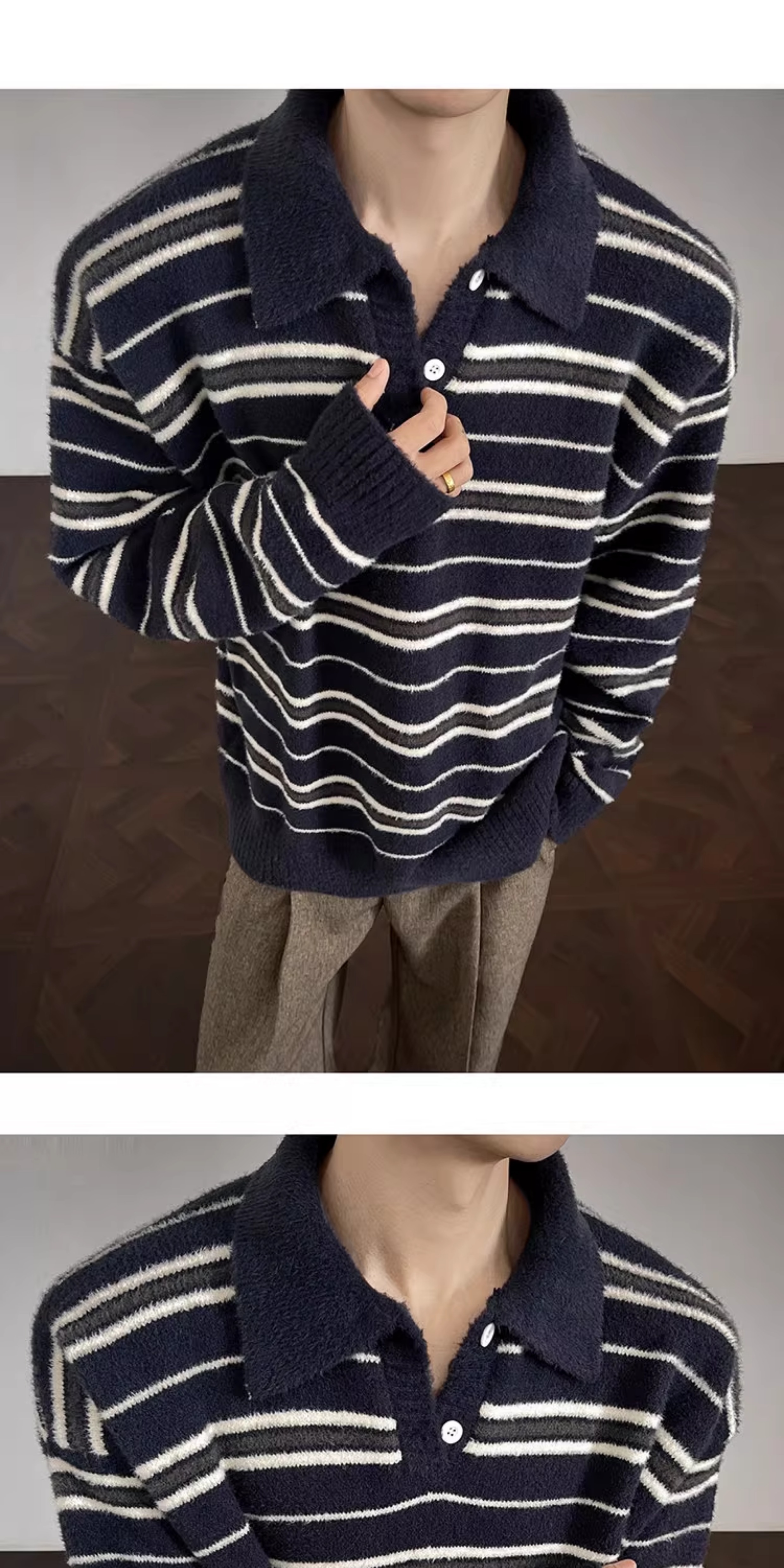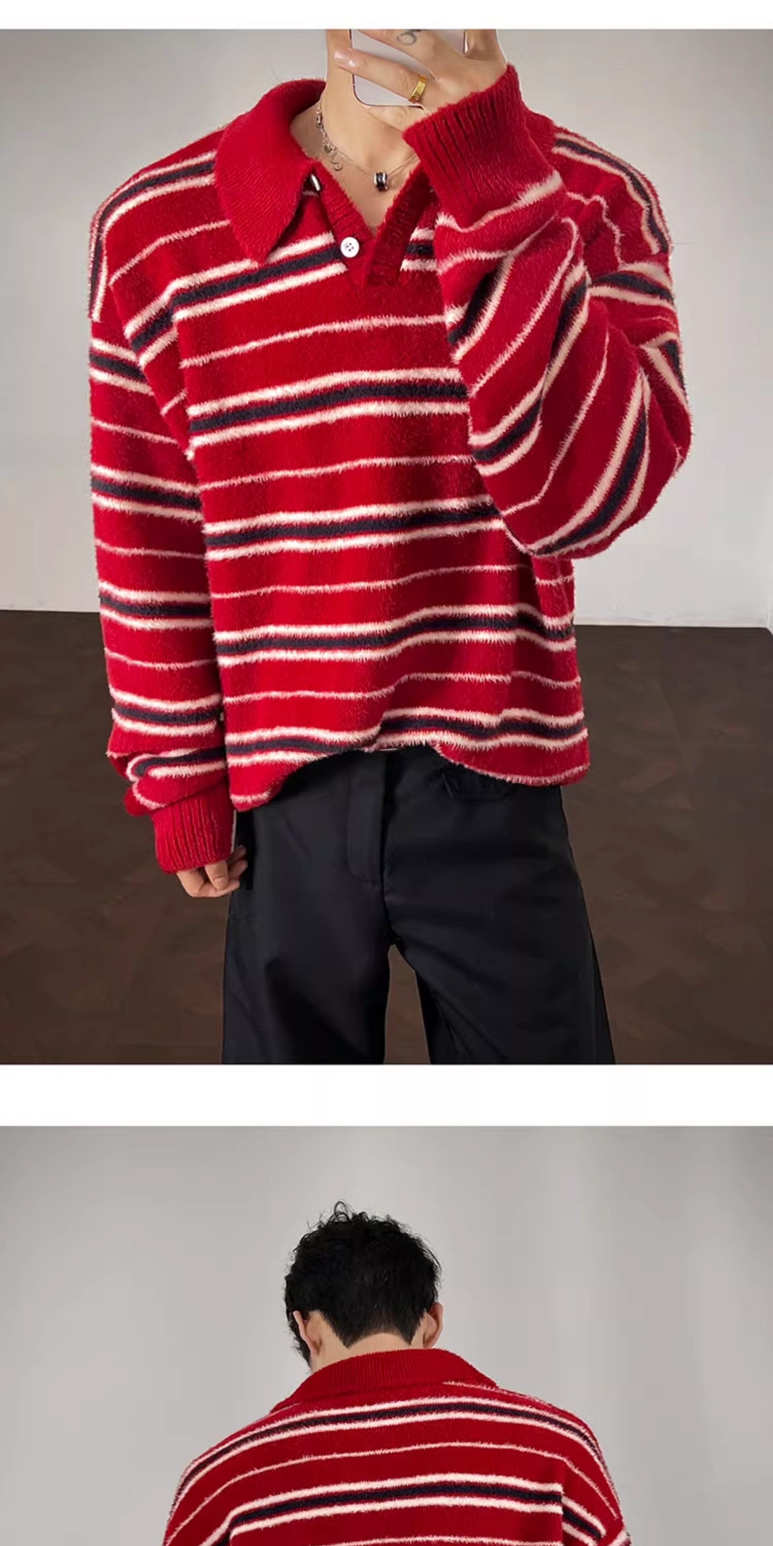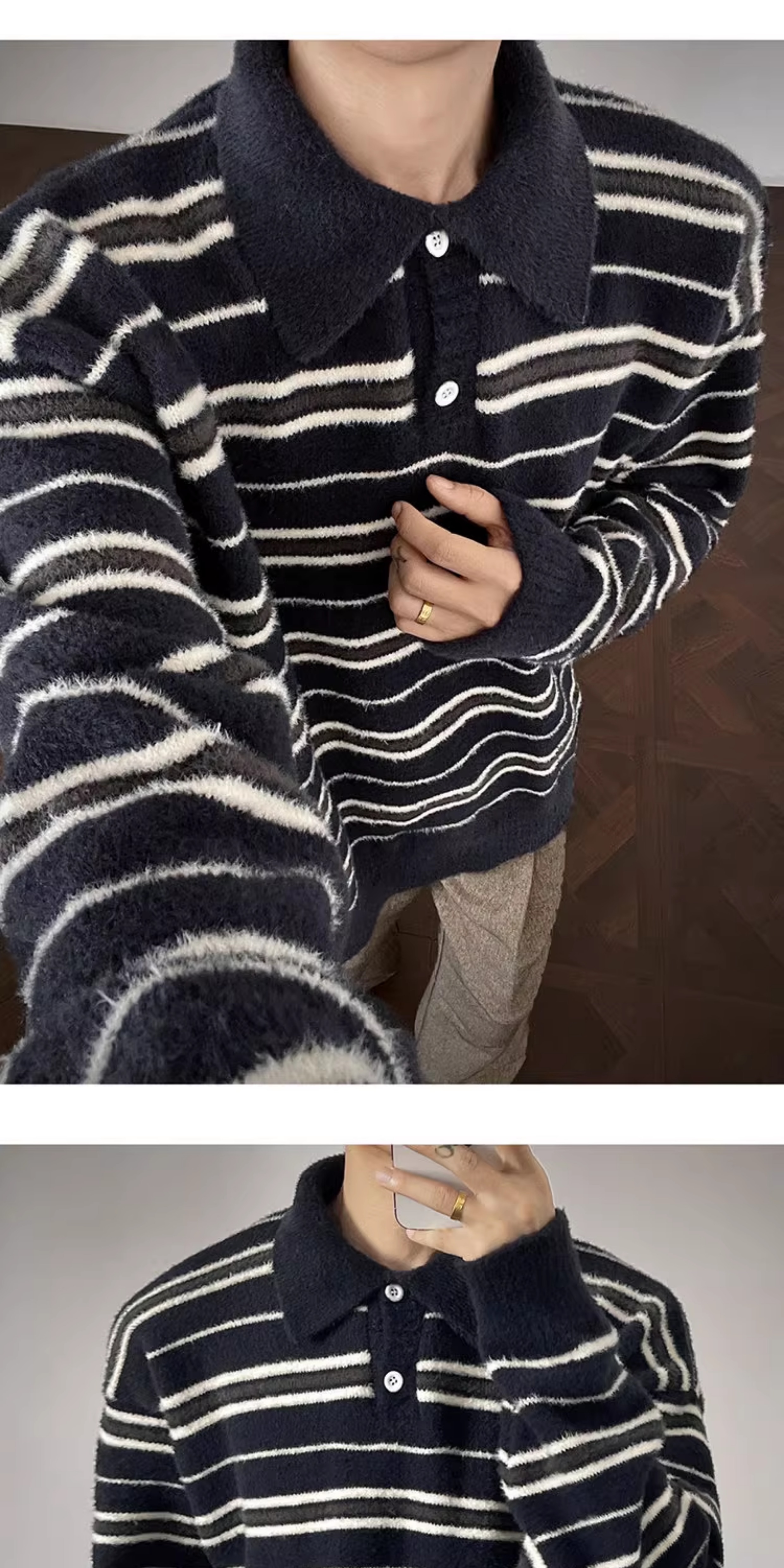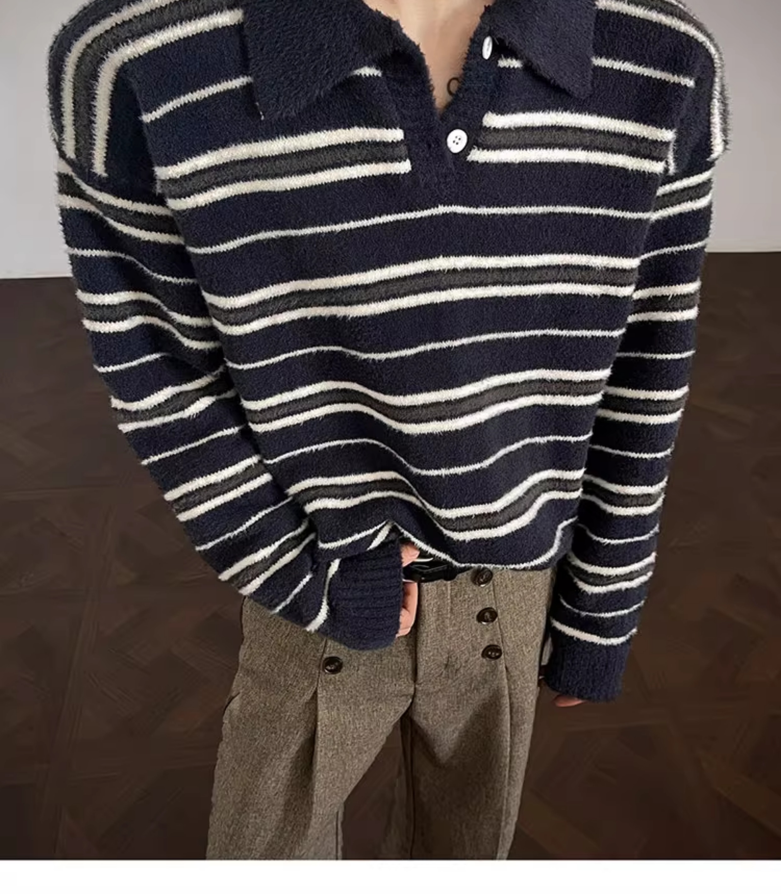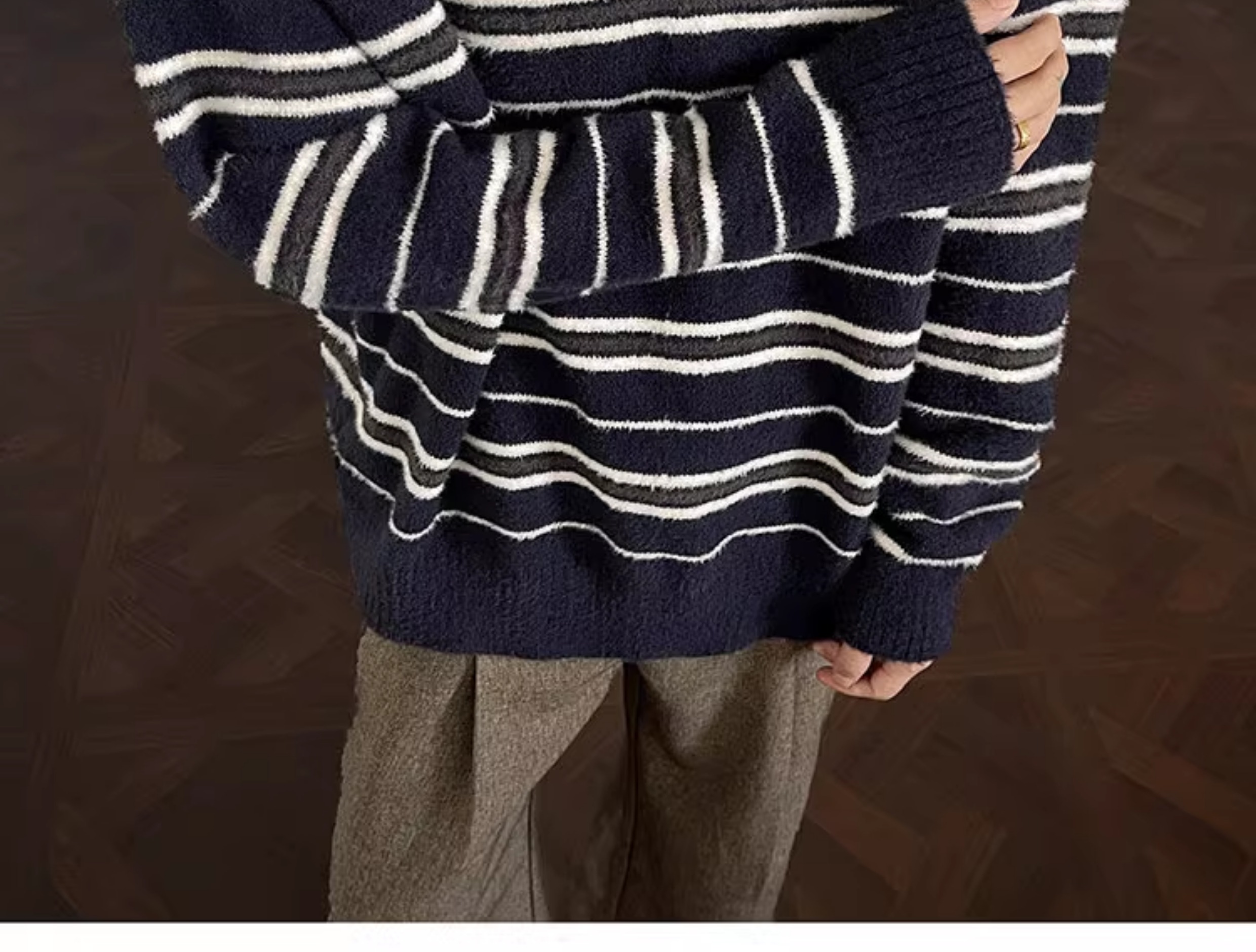 復古老錢風條紋撞色polo領毛衣男女秋冬慵懶感休閒寬松情侶針織衫