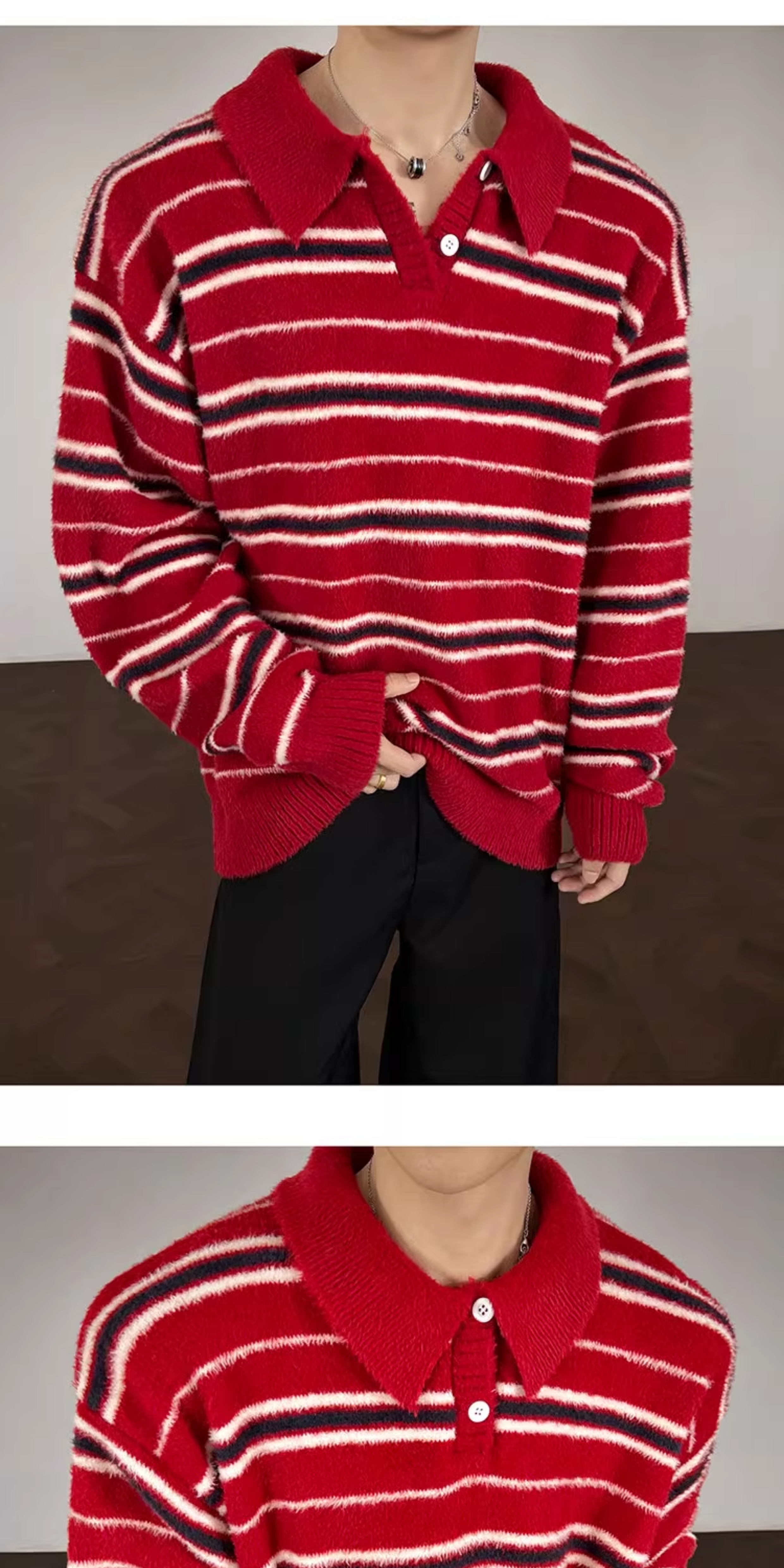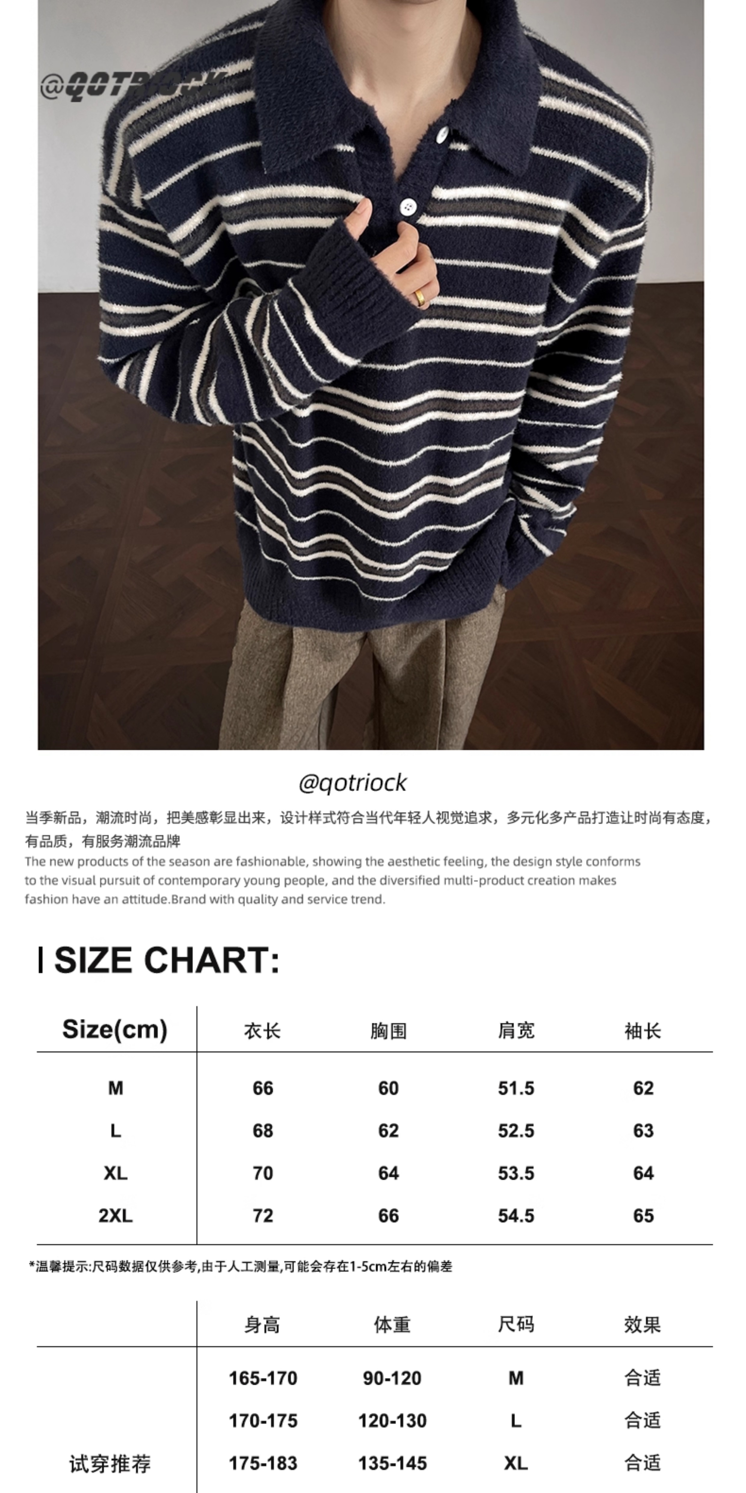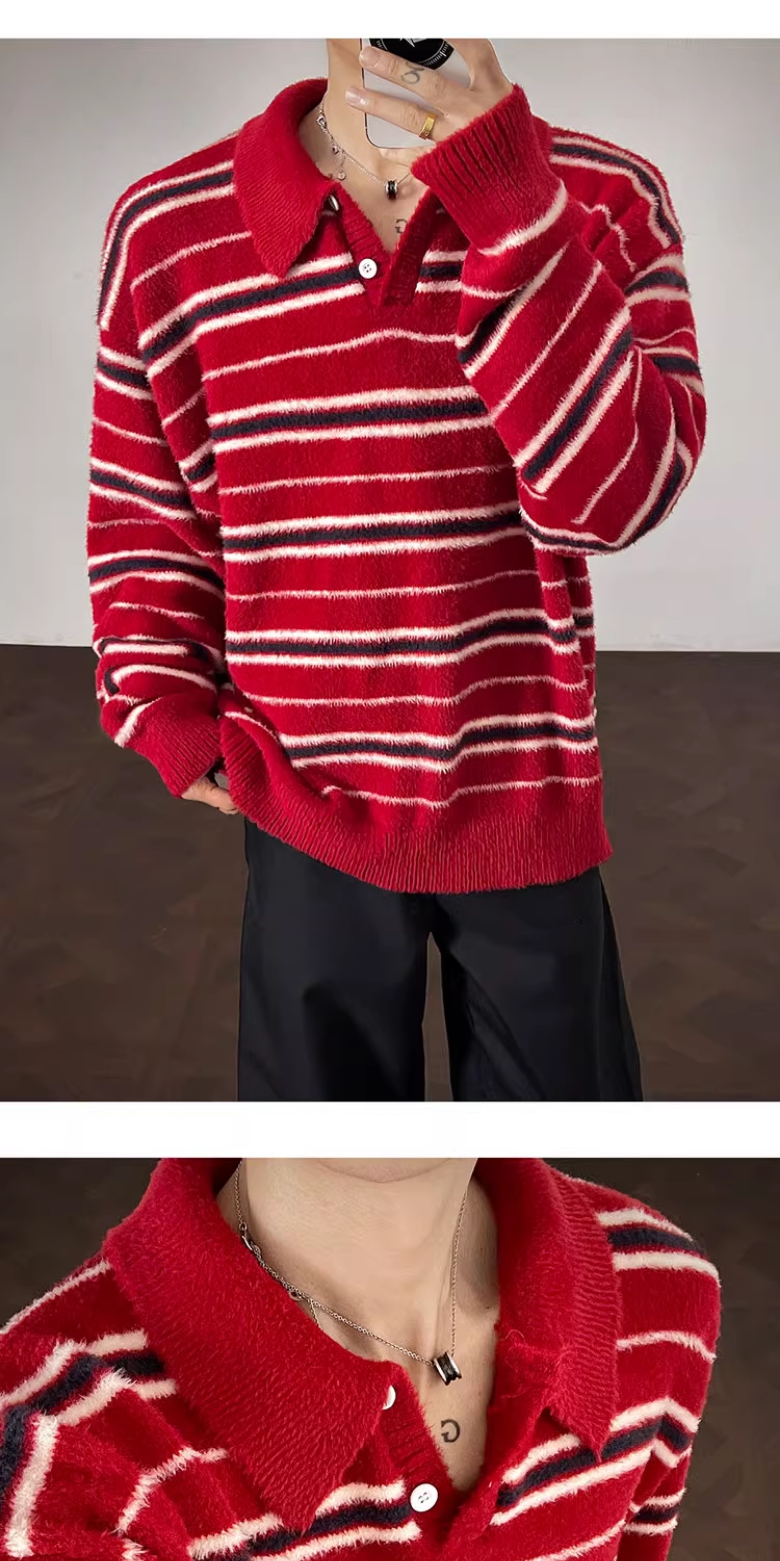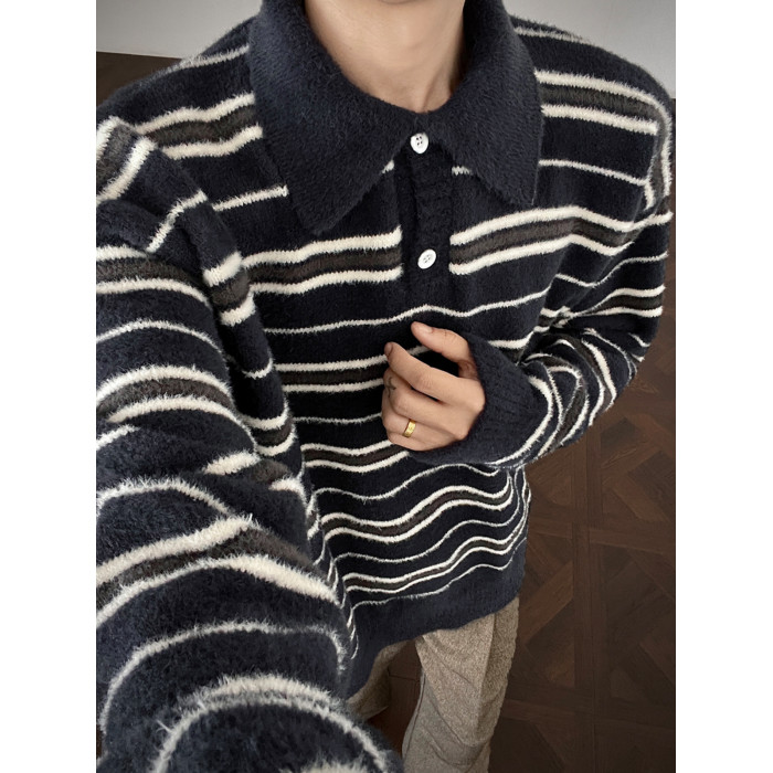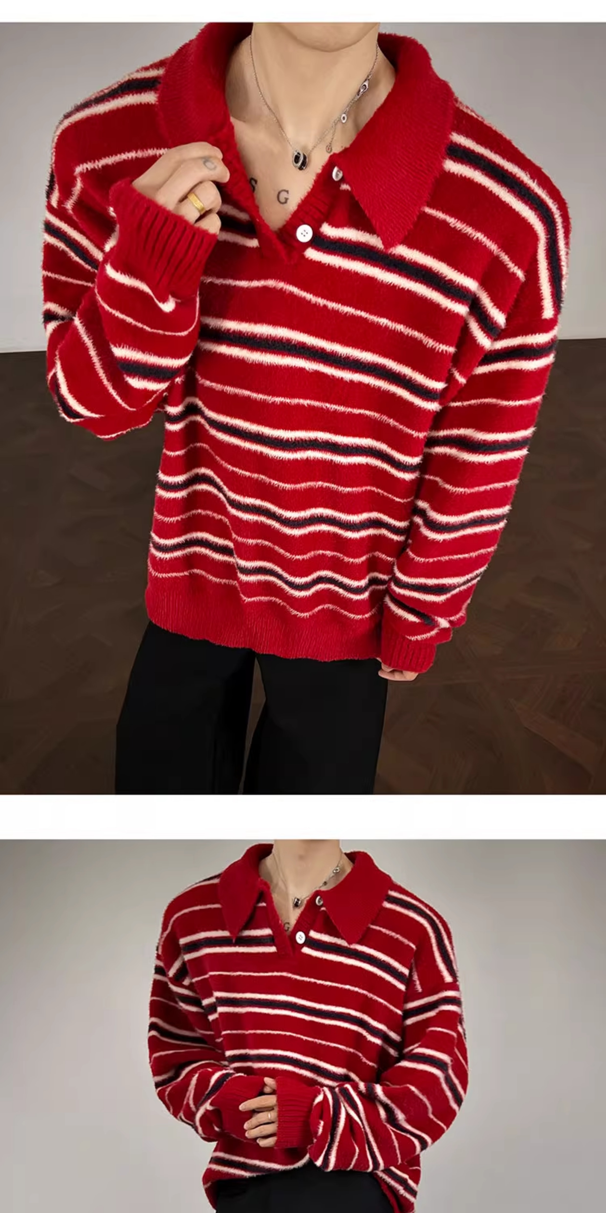 復古老錢風條紋撞色polo領毛衣男女秋冬慵懶感休閒寬松情侶針織衫