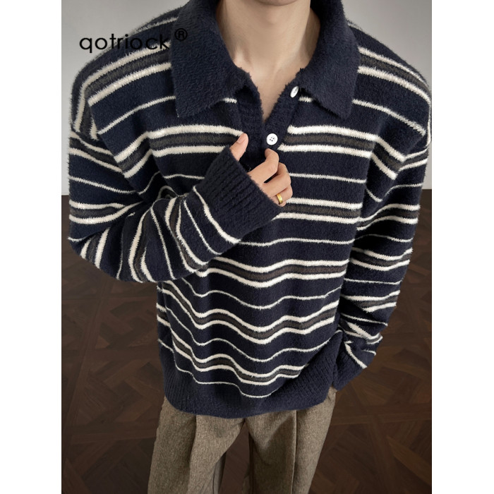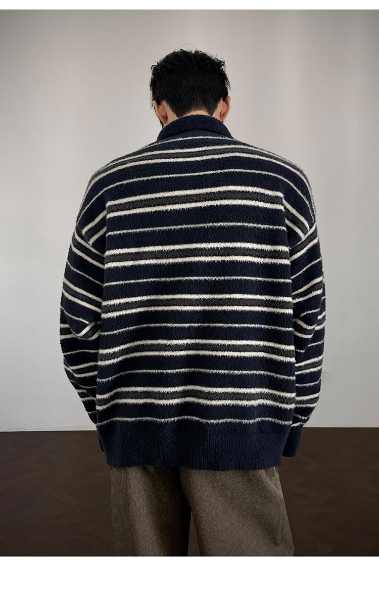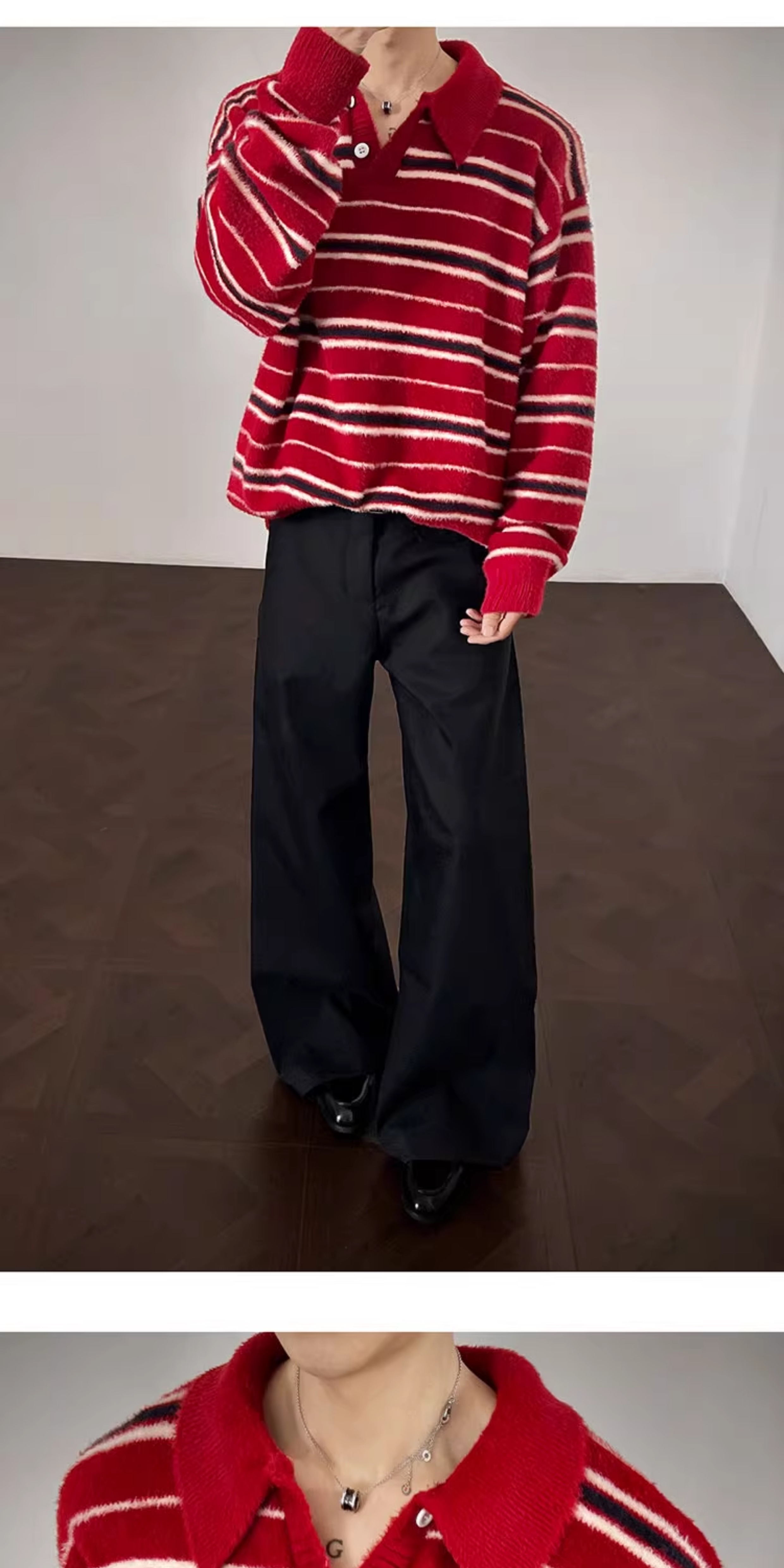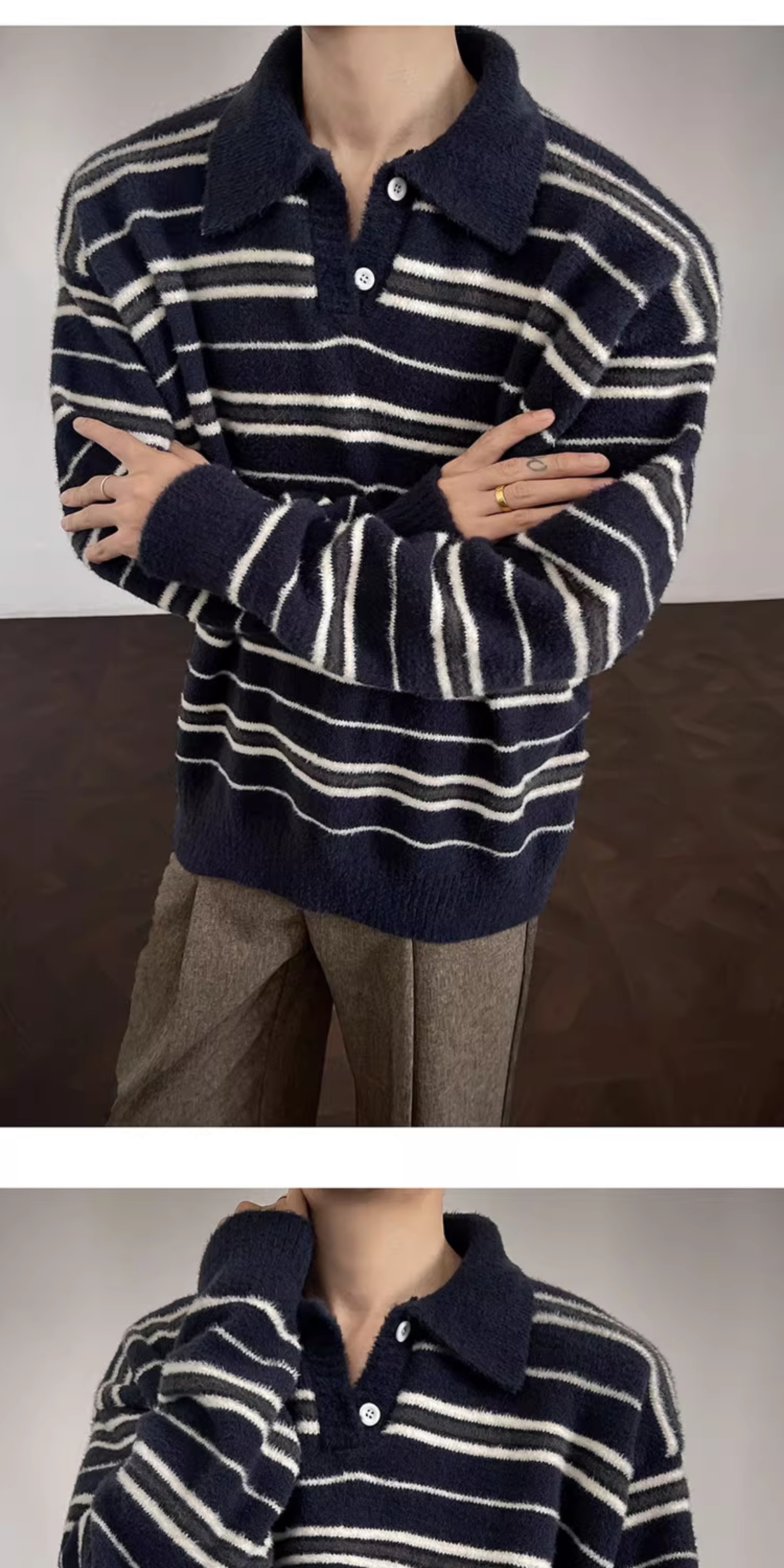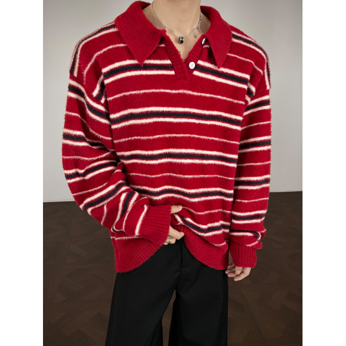 復古老錢風條紋撞色polo領毛衣男女秋冬慵懶感休閒寬松情侶針織衫