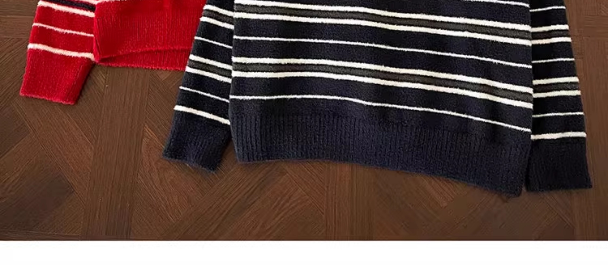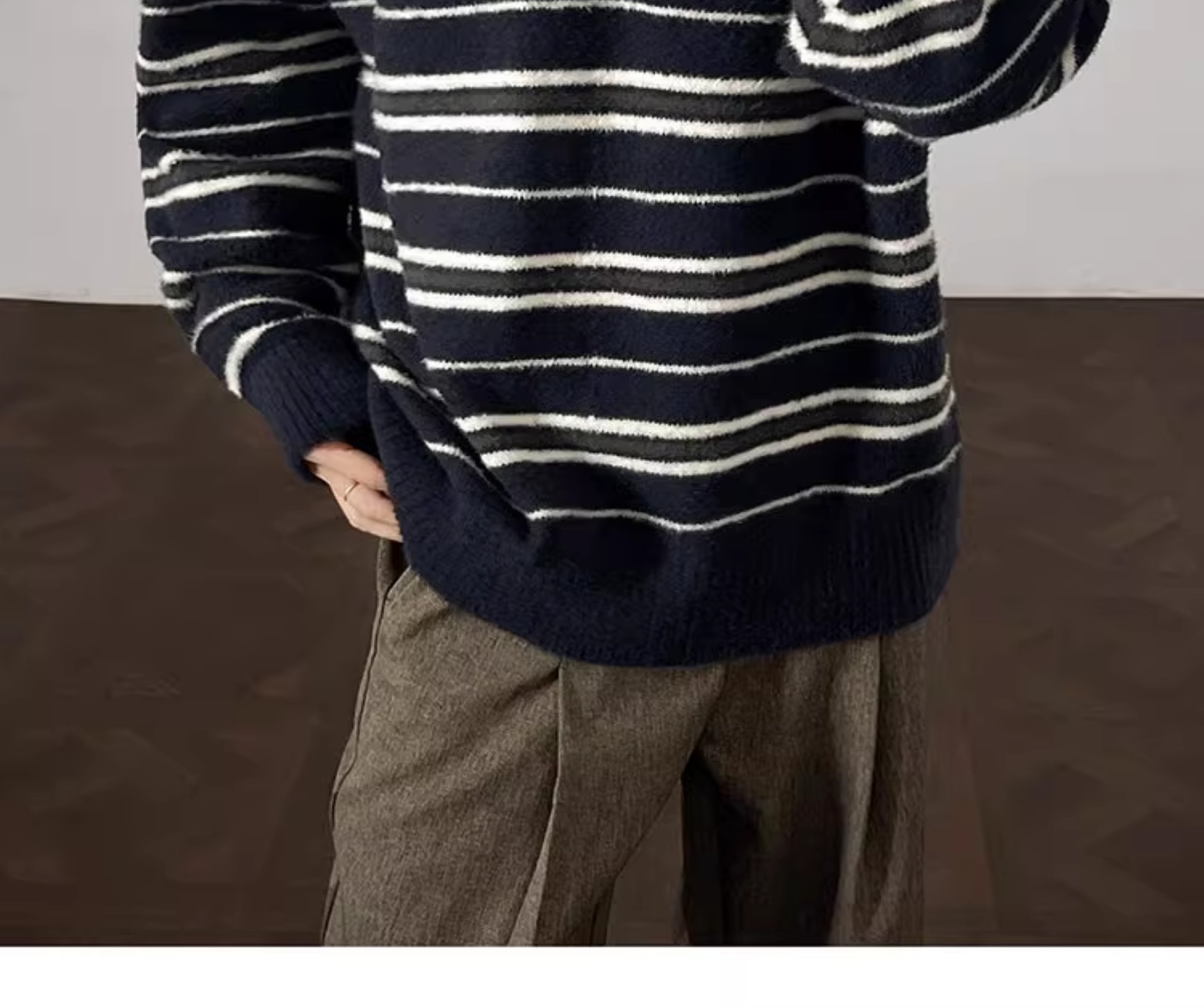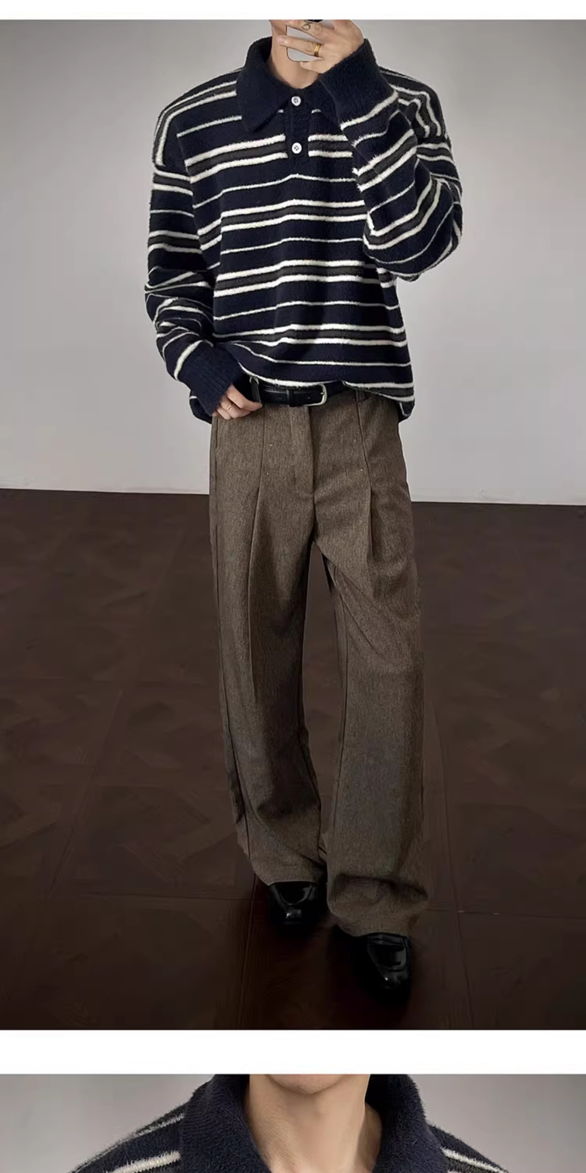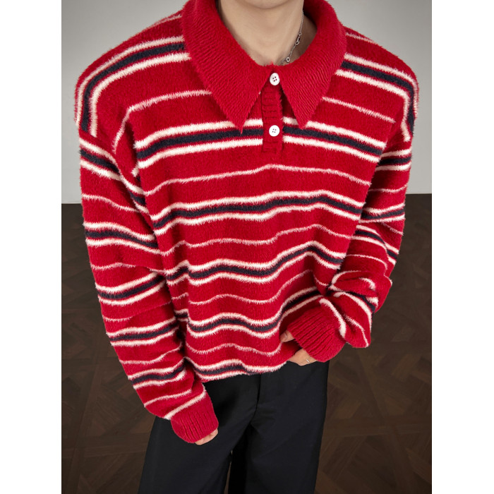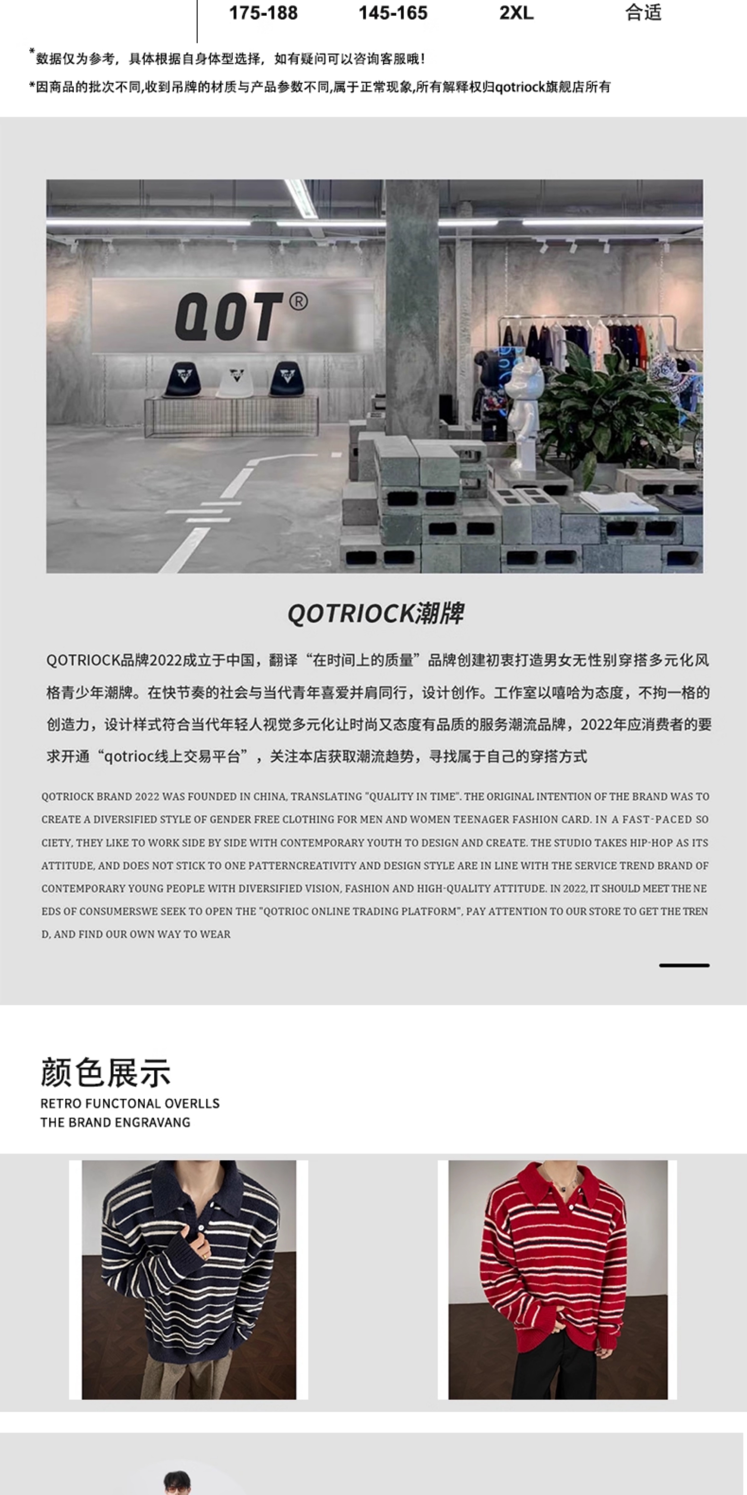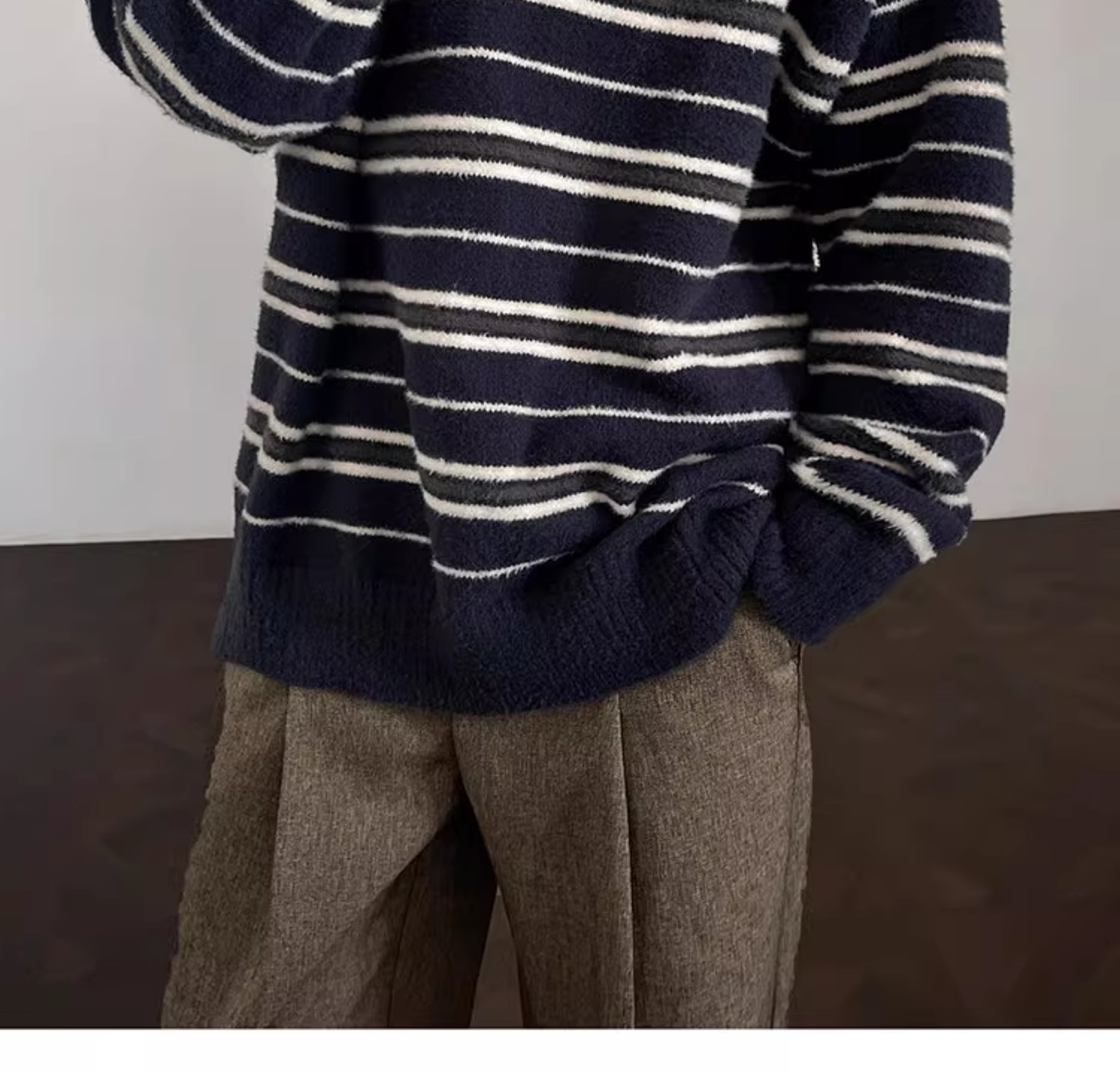 復古老錢風條紋撞色polo領毛衣男女秋冬慵懶感休閒寬松情侶針織衫