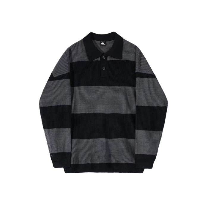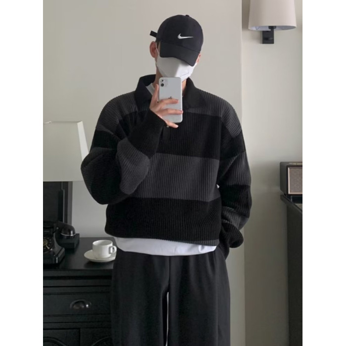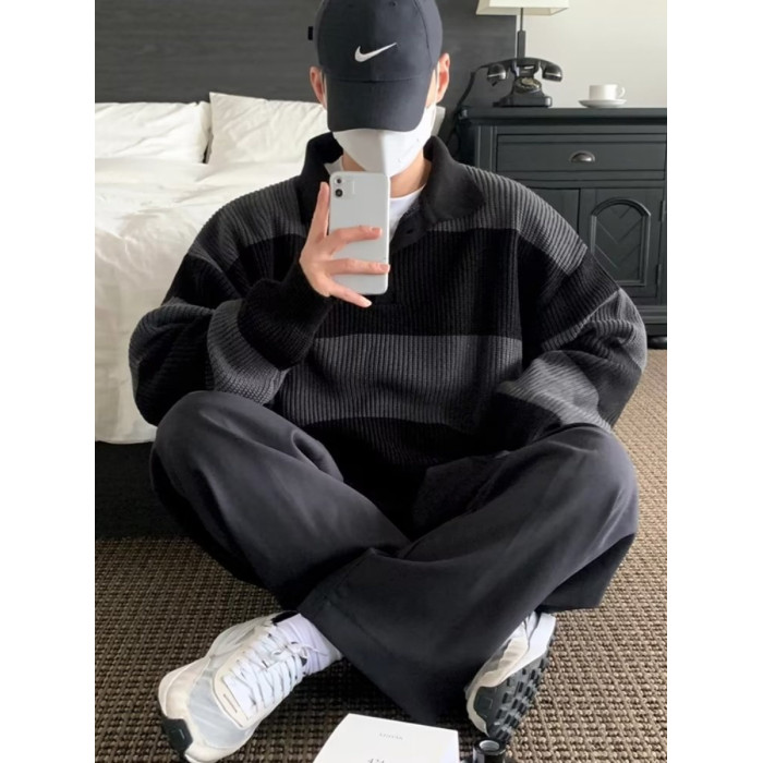 毛衣男潮牌寬松慵懶復古港風套頭條紋polo針織衫潮流休閒百搭外套