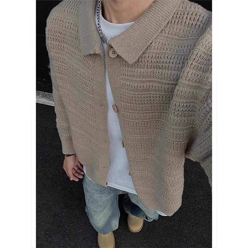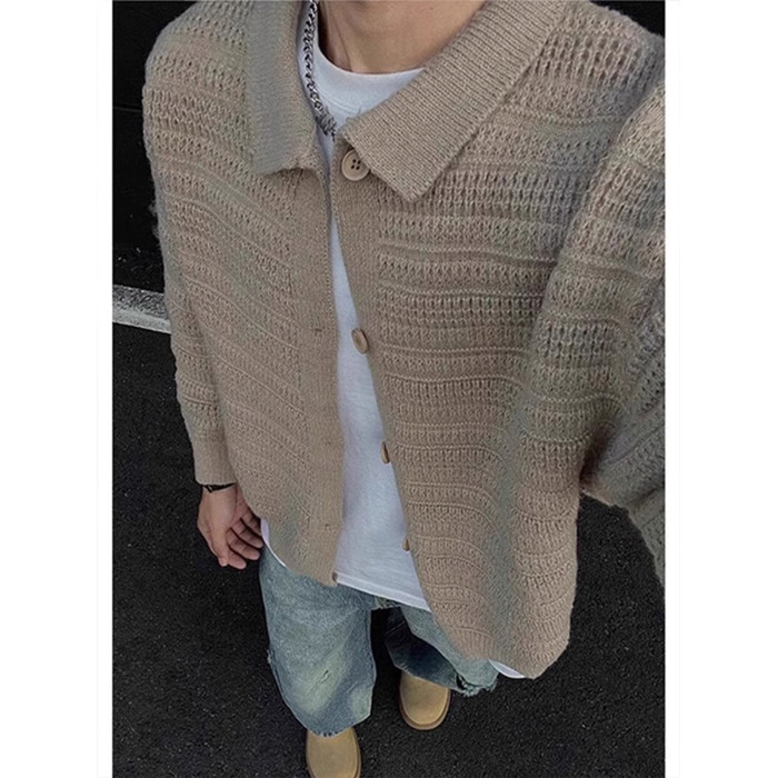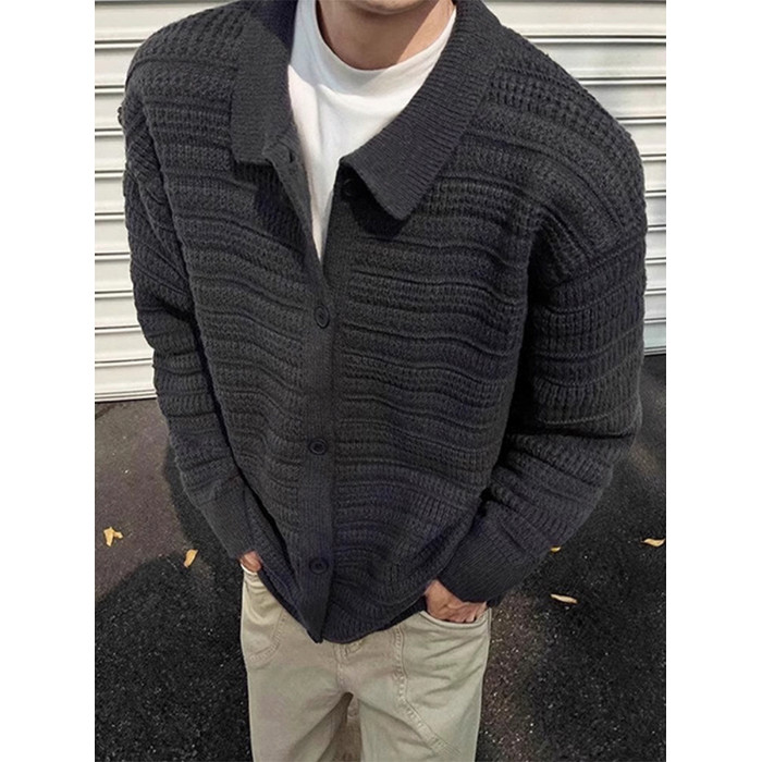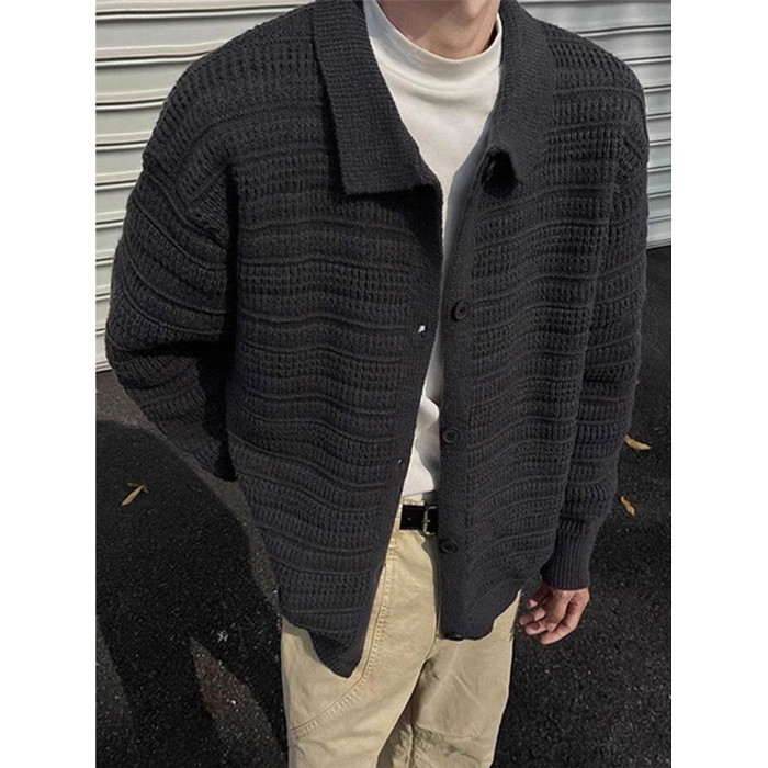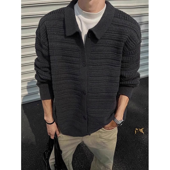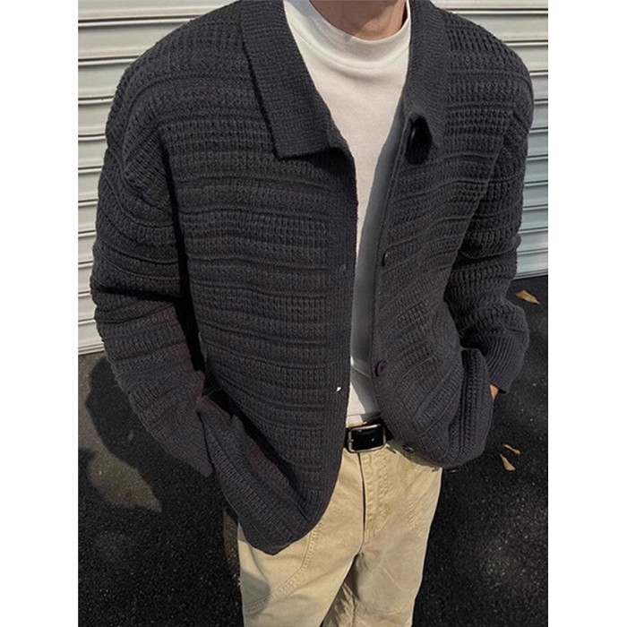 深灰色針織開衫外套男款秋冬慵懶風高級感男裝cleanfit翻領毛衣