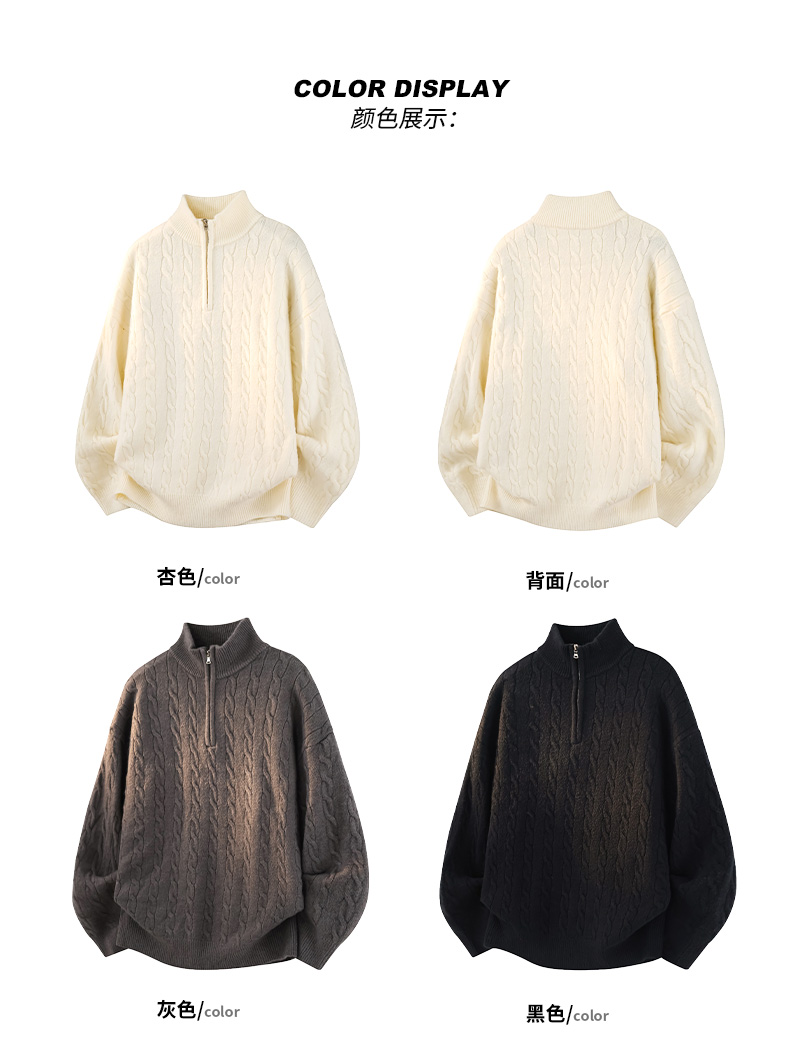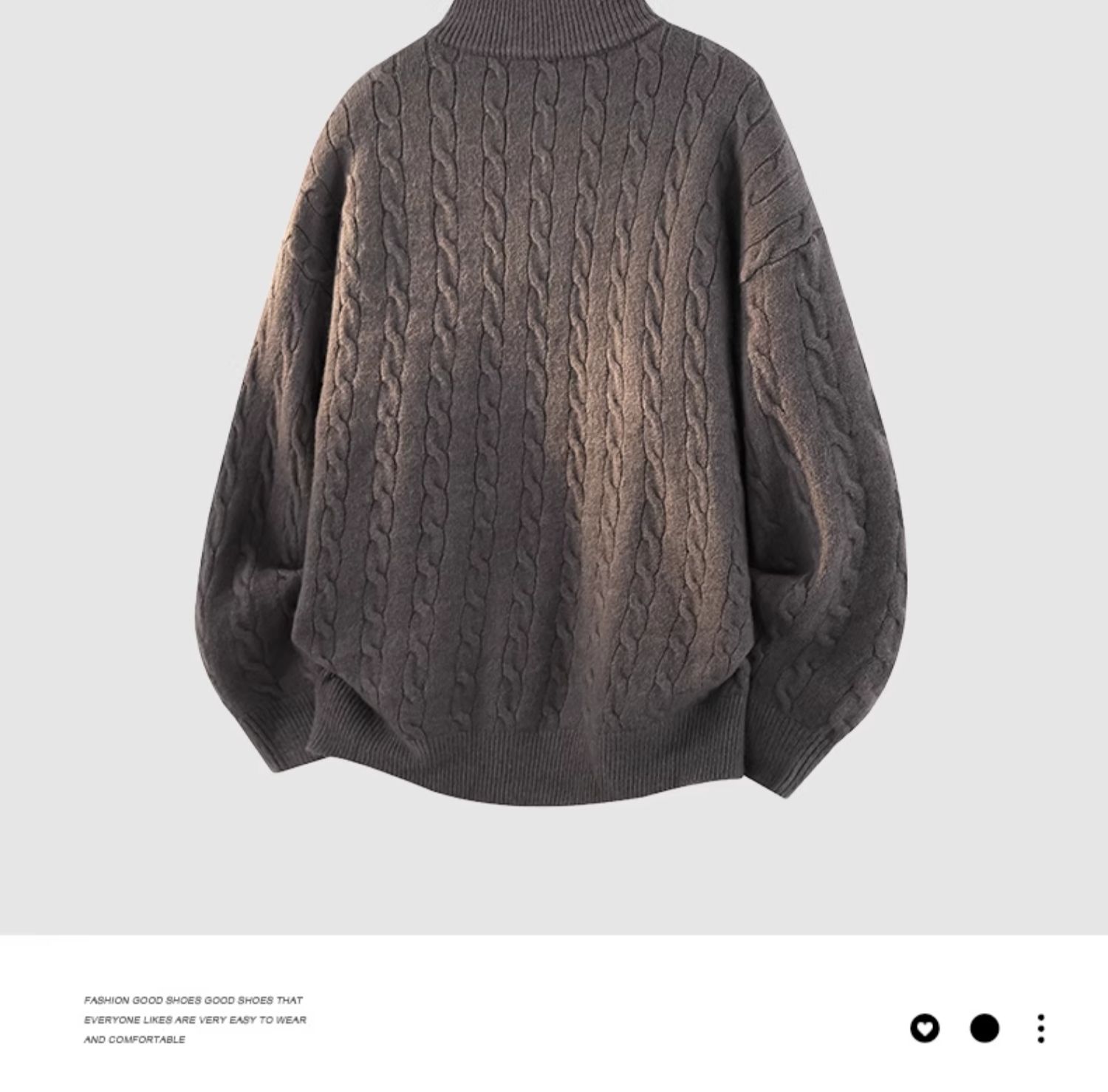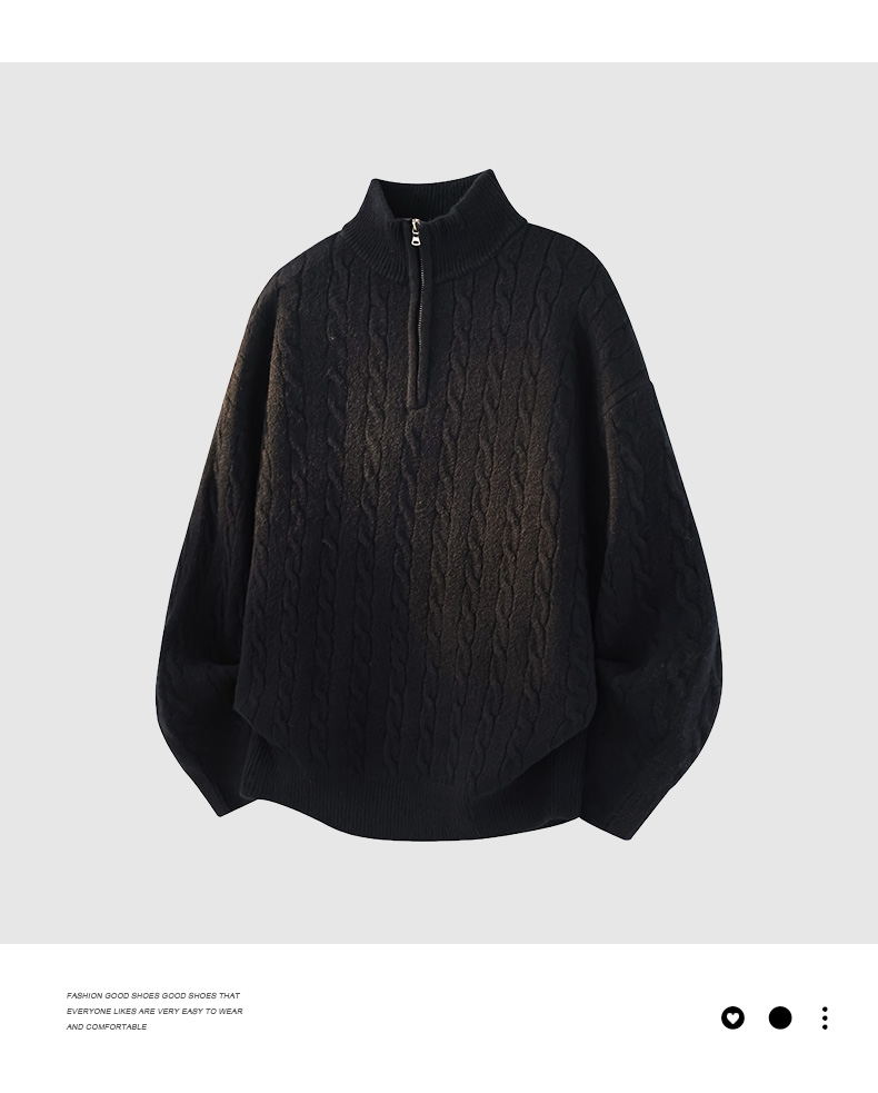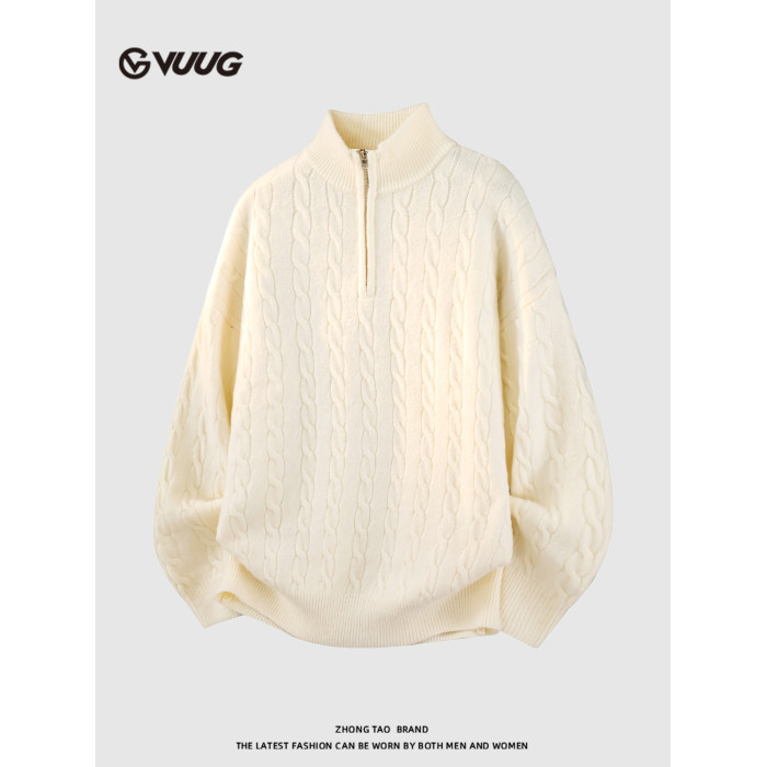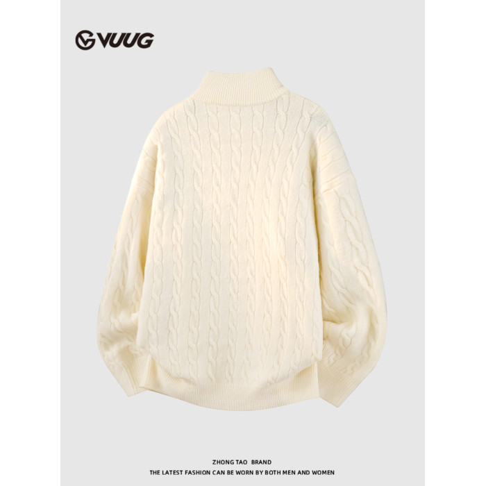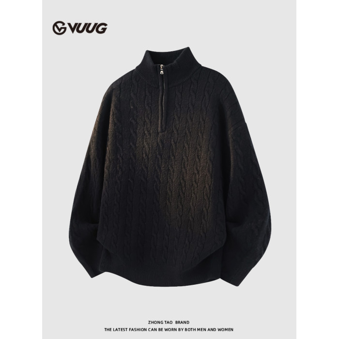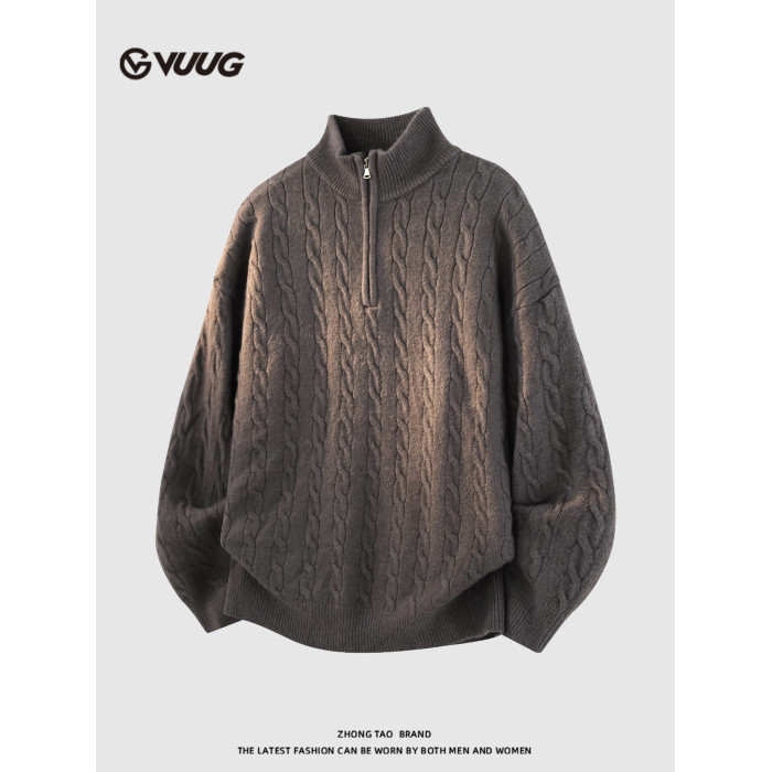 VUUG老錢風半高領麻花紋毛衣男秋冬季慵懶高級感休閒半拉鍊針織衫