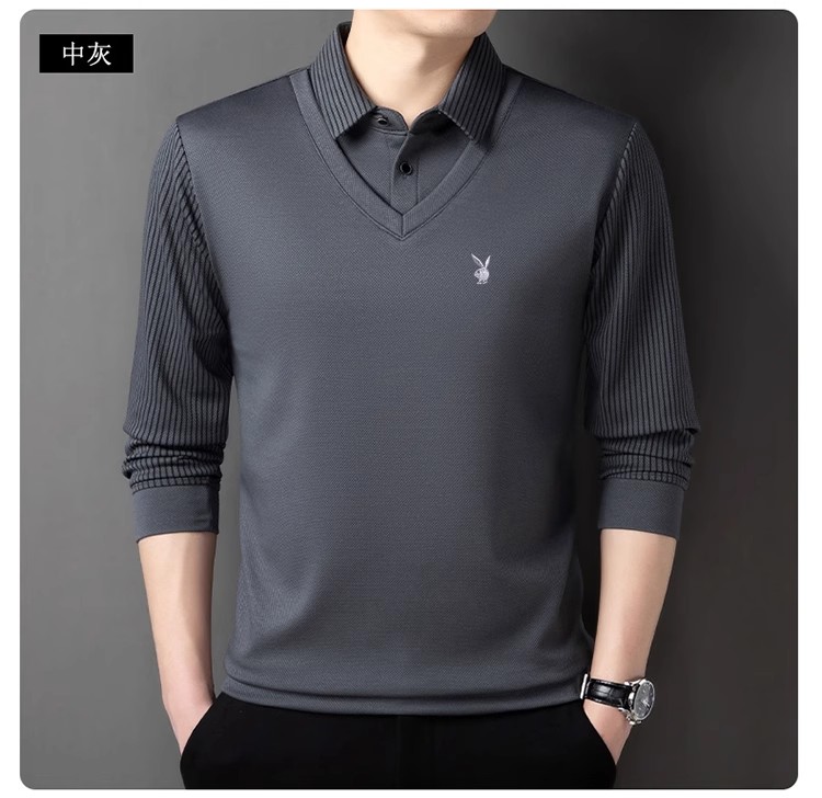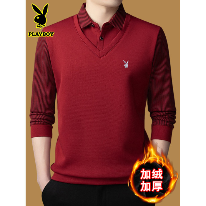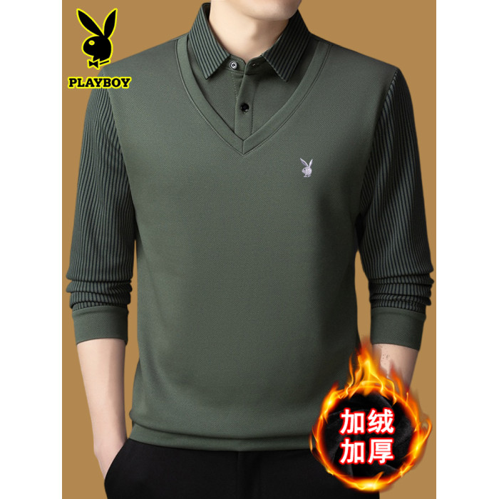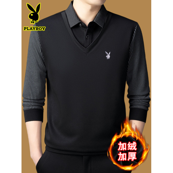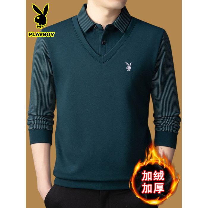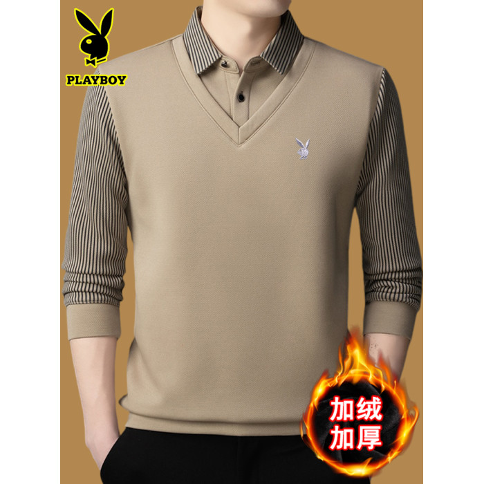 花花公子假兩件毛衣男加絨加厚打底衫2025冬季新款休閒保暖羊毛衫