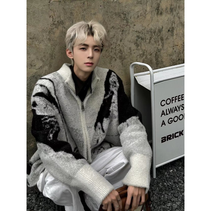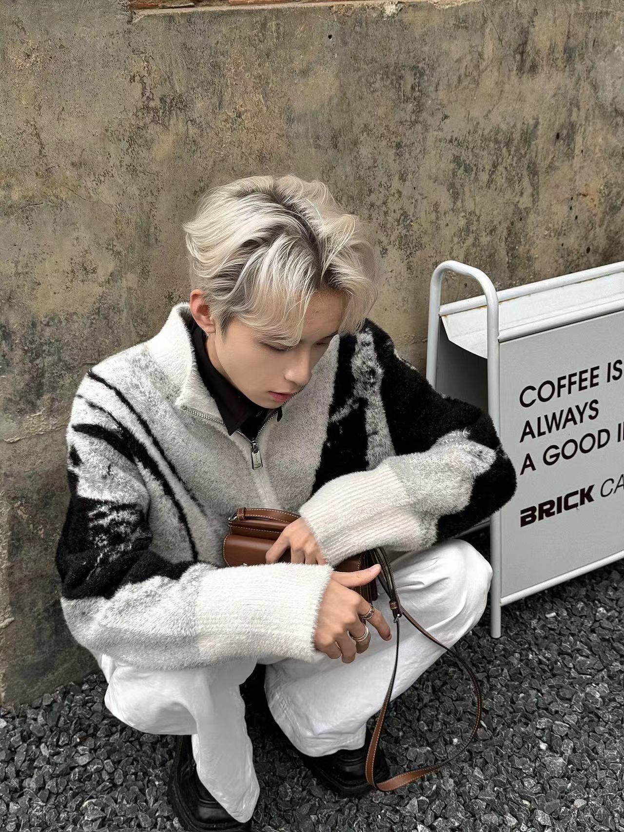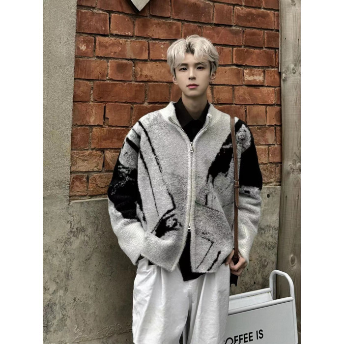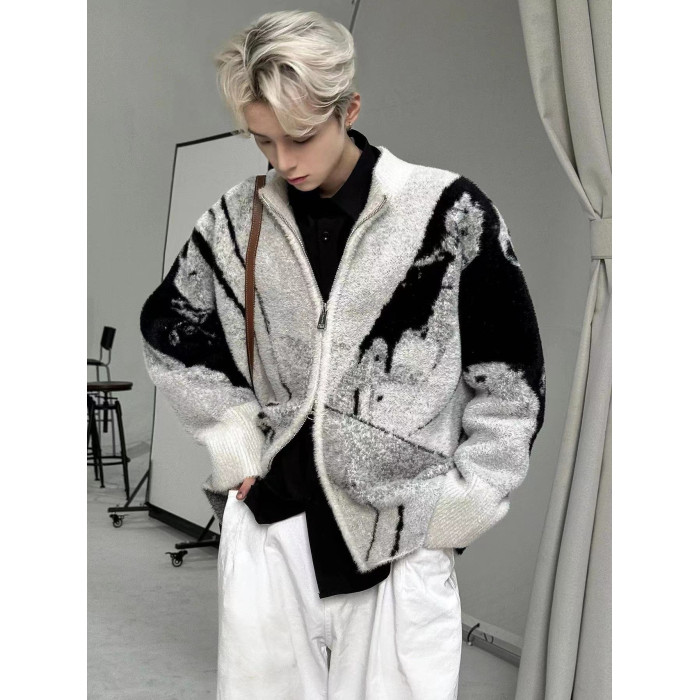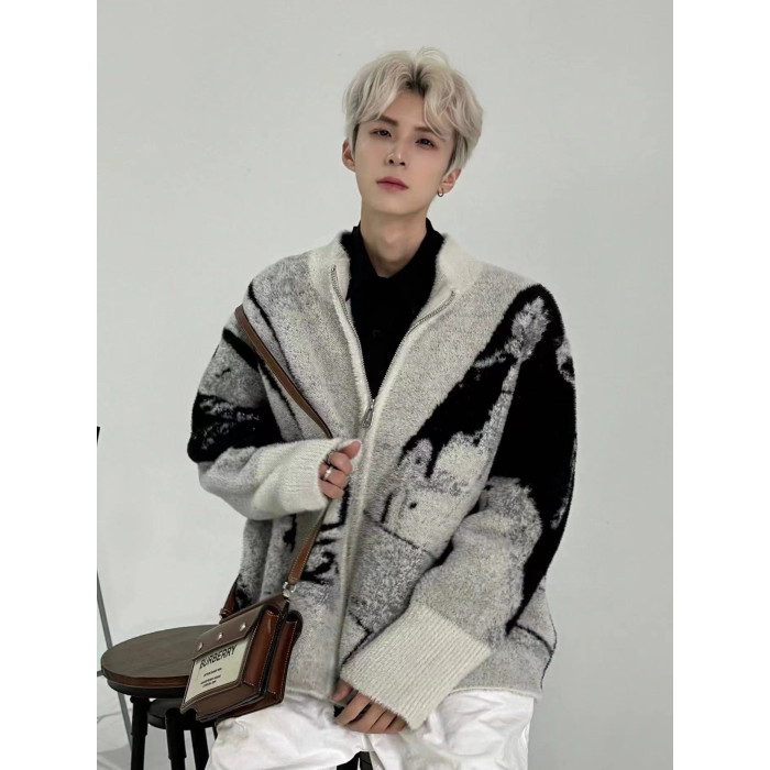 高級感荊棘刺綉漸變毛衣開衫外套秋冬男vintage慵懶風拉鍊針織衫