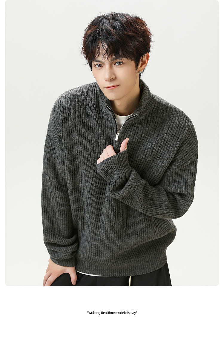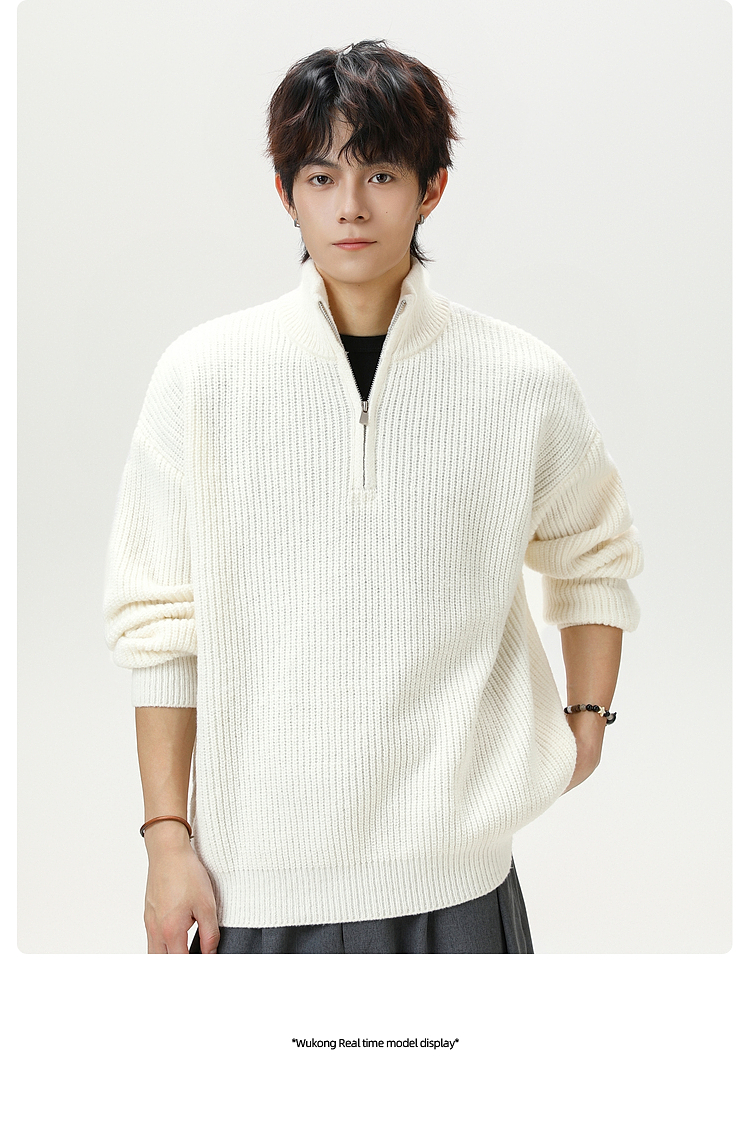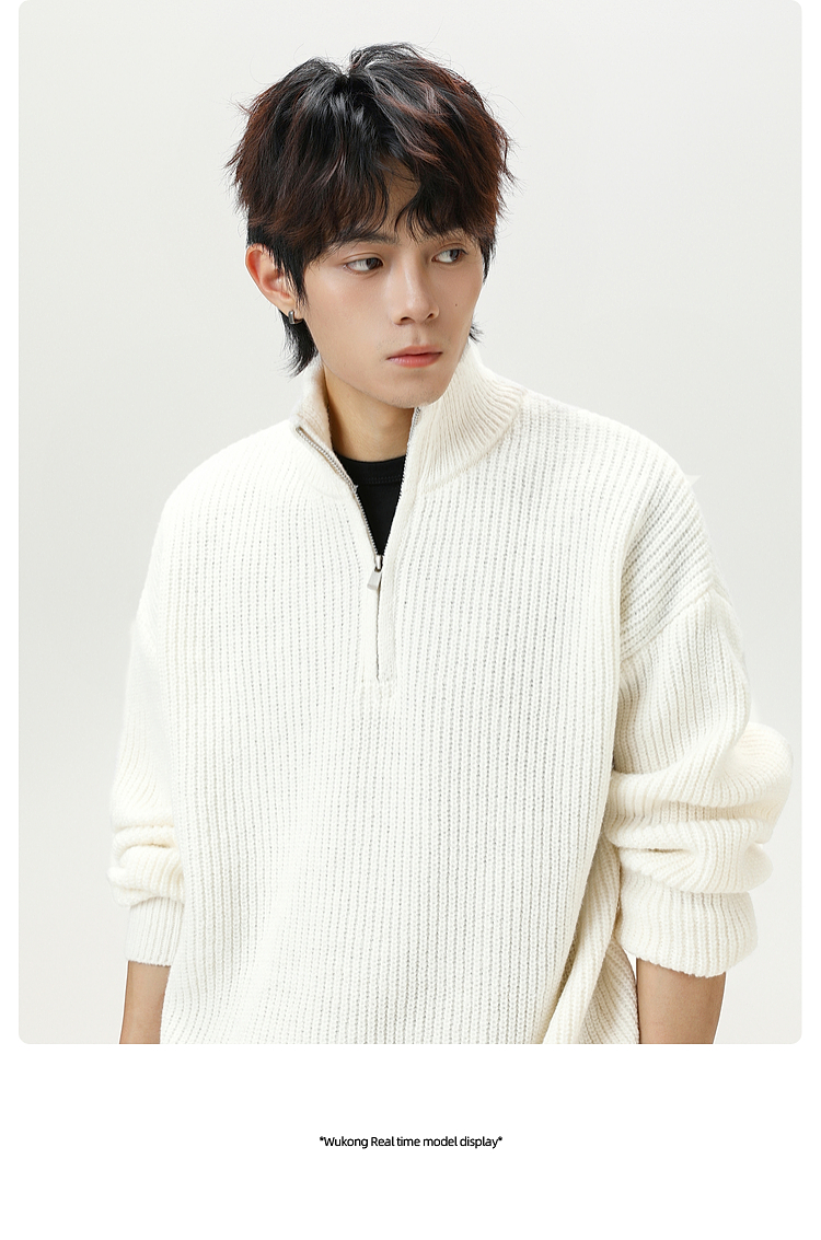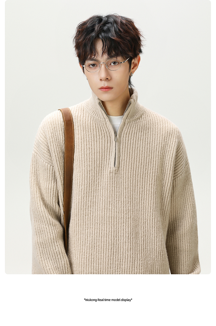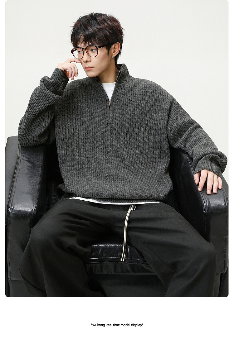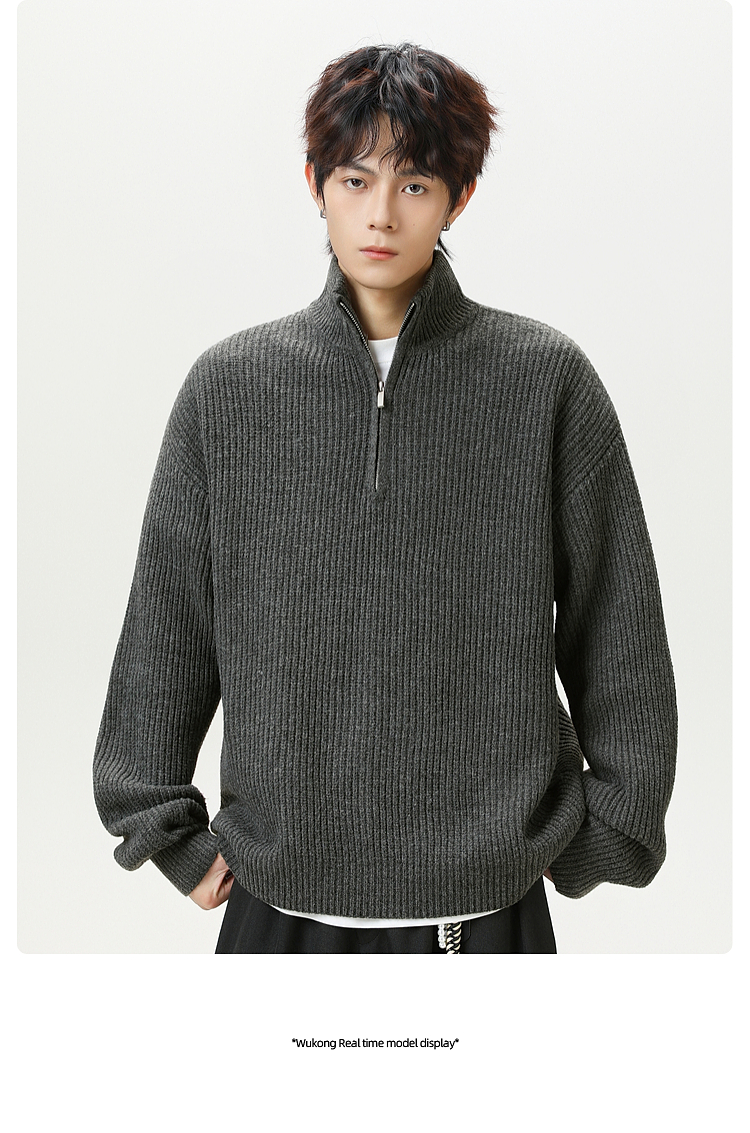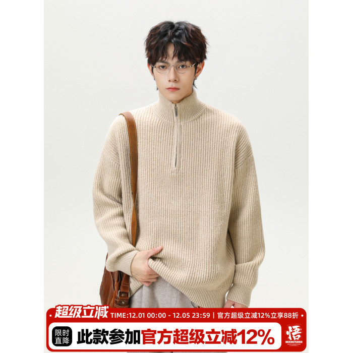 悟空有貨潮牌復古純色半拉鍊立領毛衣男女秋季潮牌情侶寬松針織衫