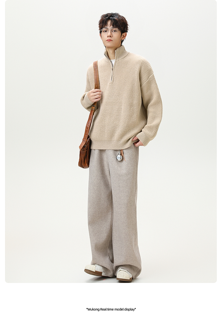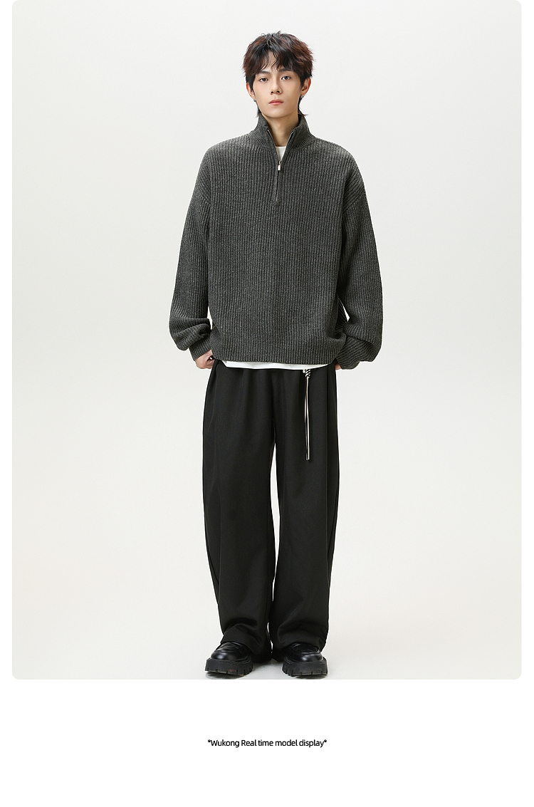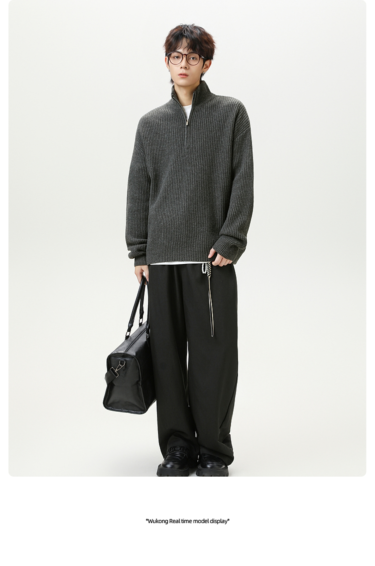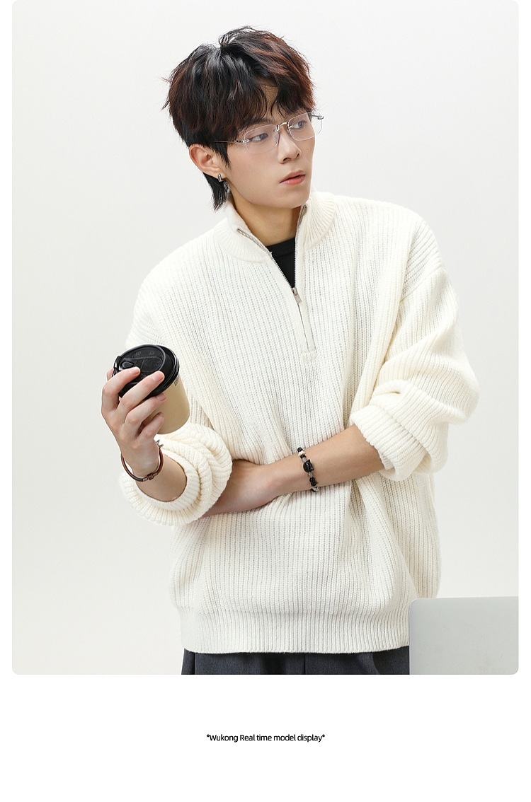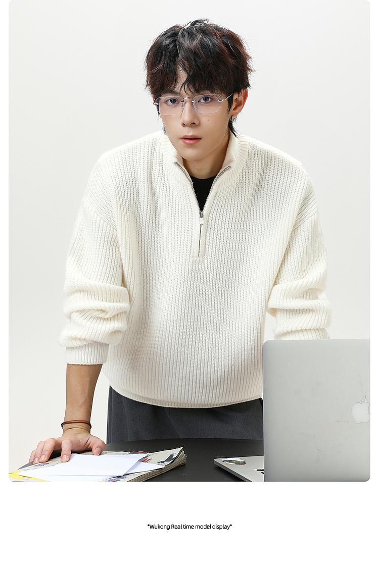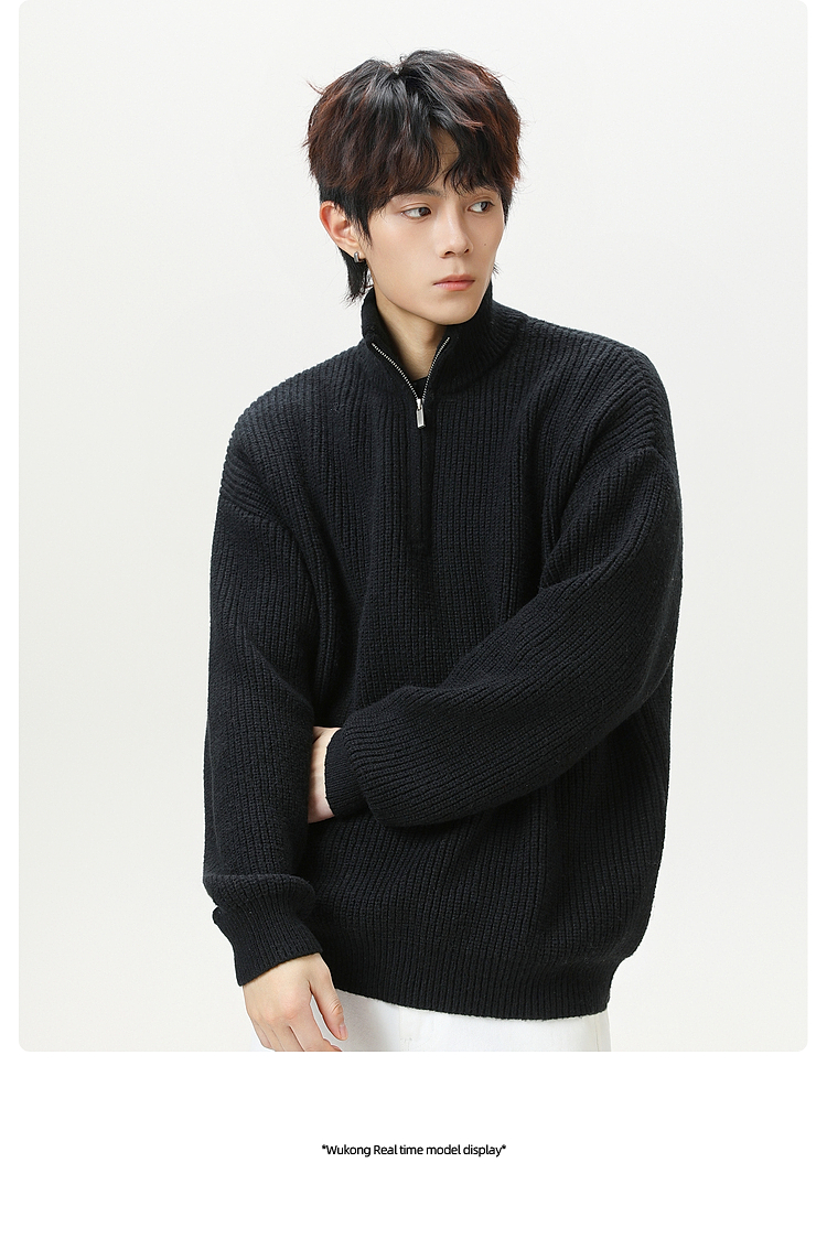 悟空有貨潮牌復古純色半拉鍊立領毛衣男女秋季潮牌情侶寬松針織衫