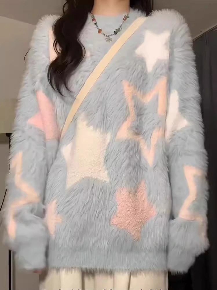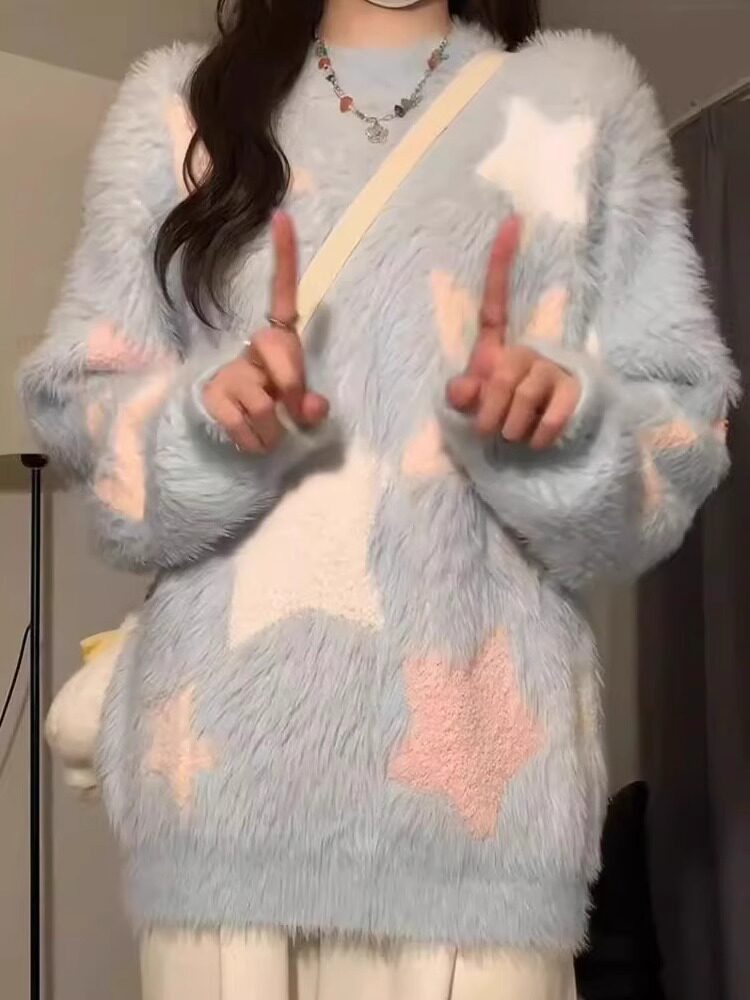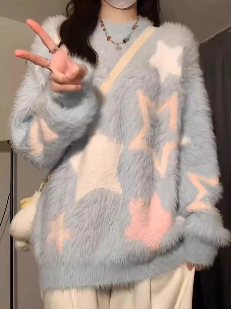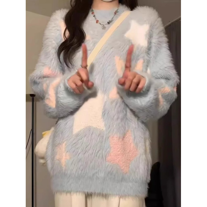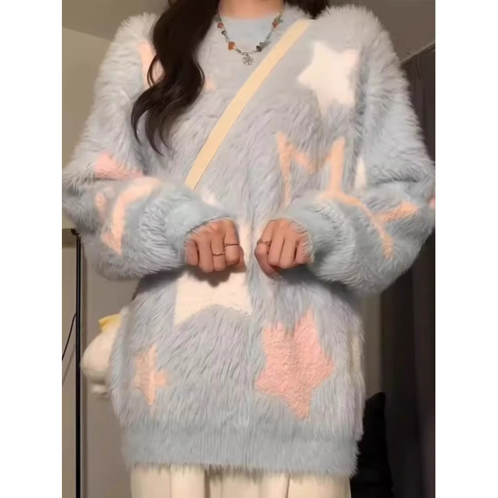 軟糯慵嬾風藍色針織毛衣女秋冬水貂絨套頭日系圓領上衣厚寬鬆顯瘦