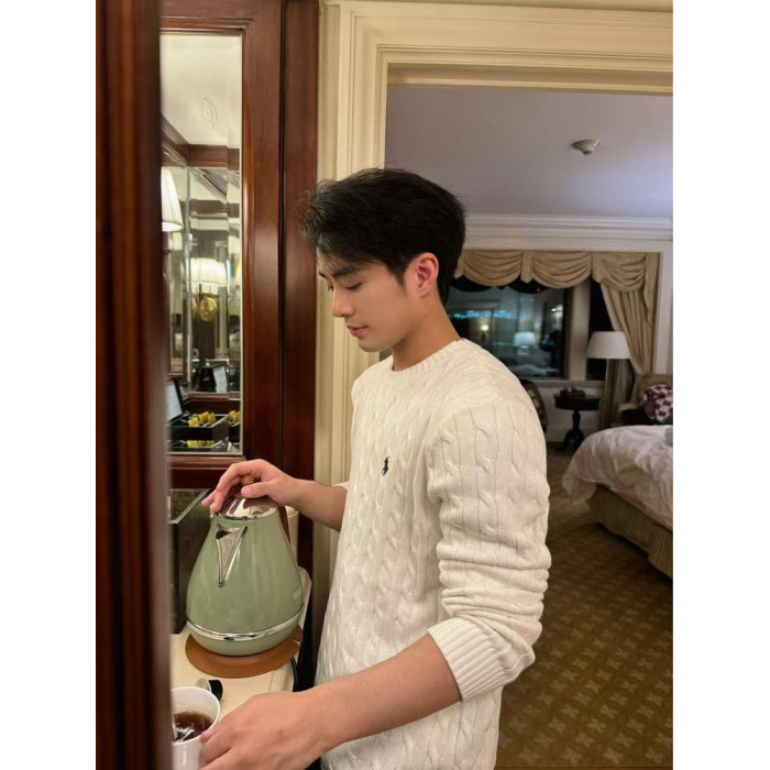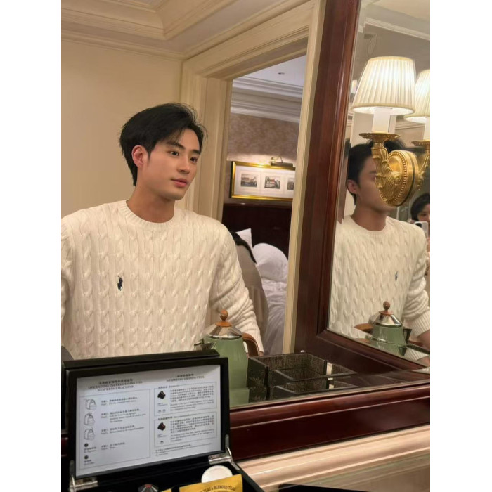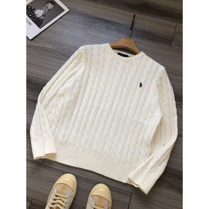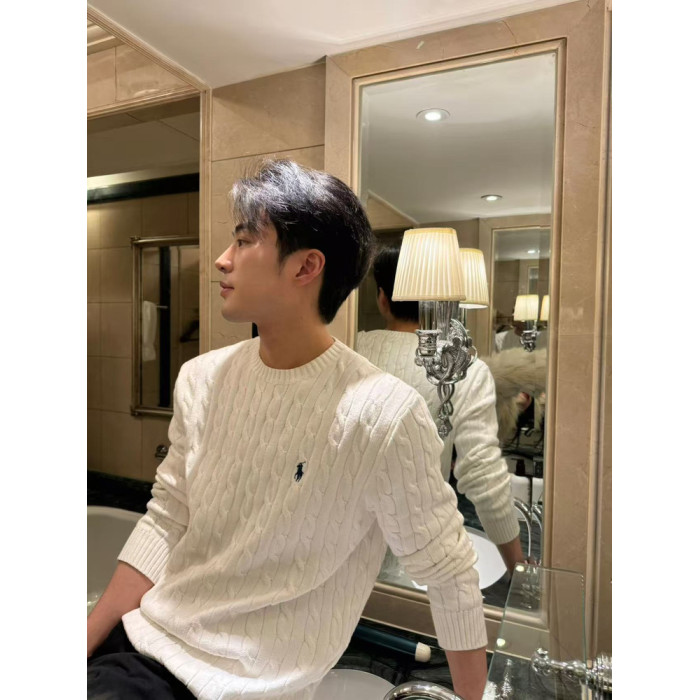 高級小馬標套頭打底衫慵懶米白色麻花紋圓領毛衣男早秋針織衫上衣