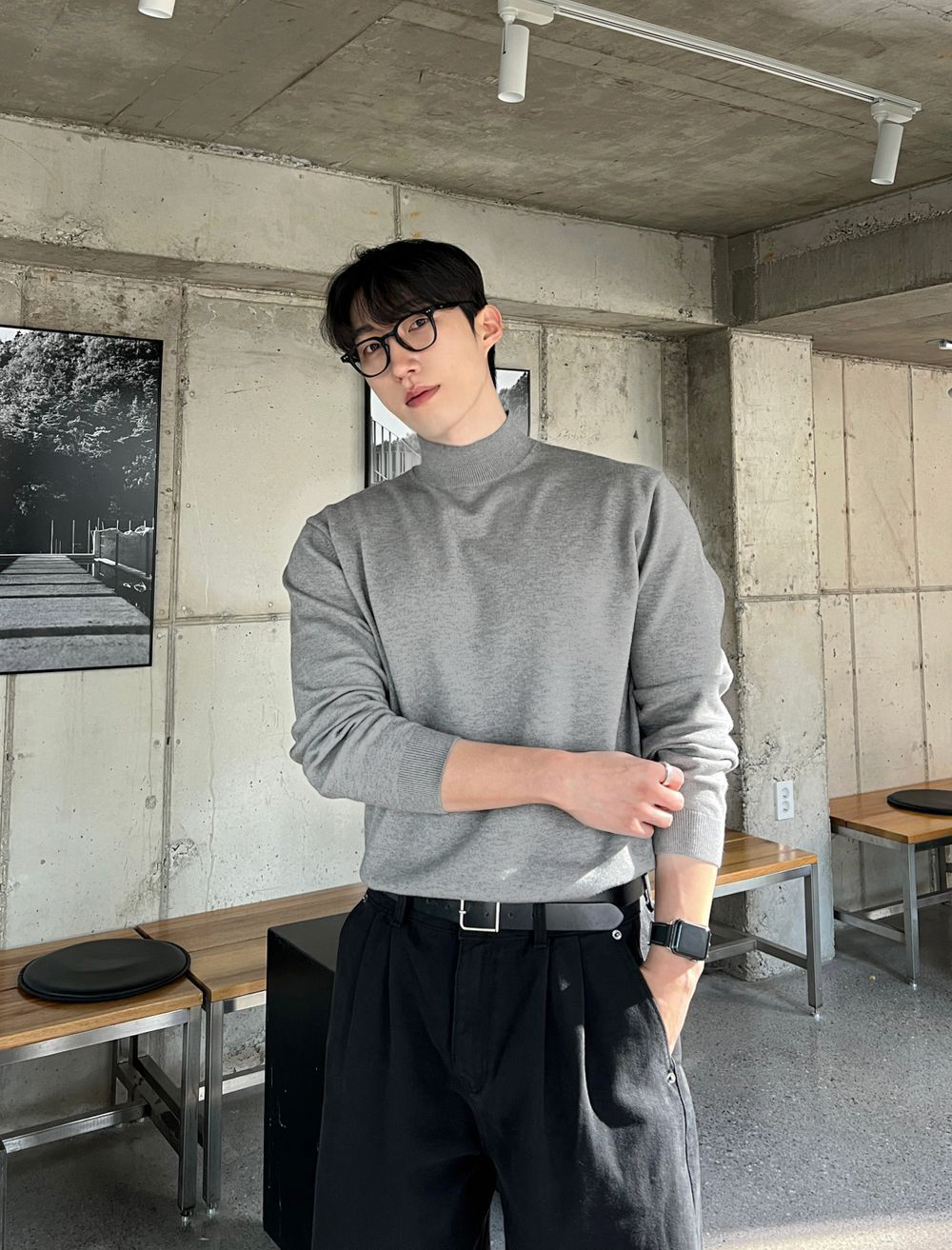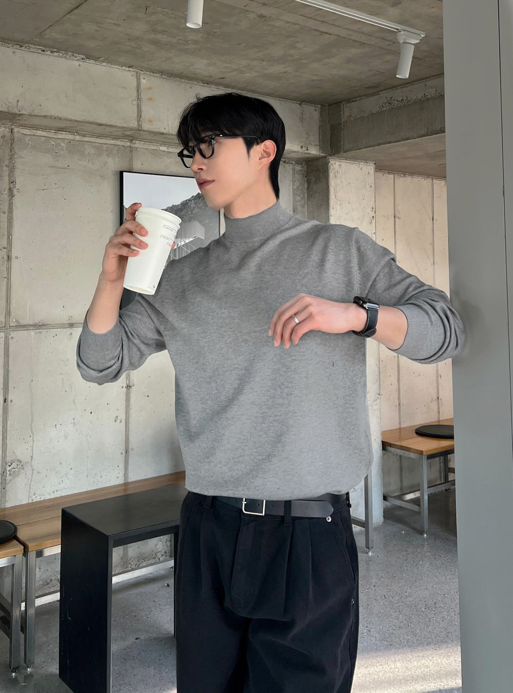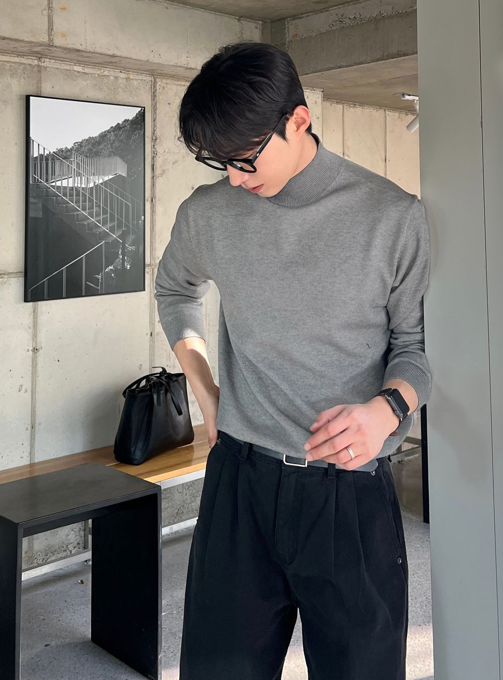 冬季半高領毛衣男內搭灰色寬松青少年保暖加絨加厚中領針織打底衫