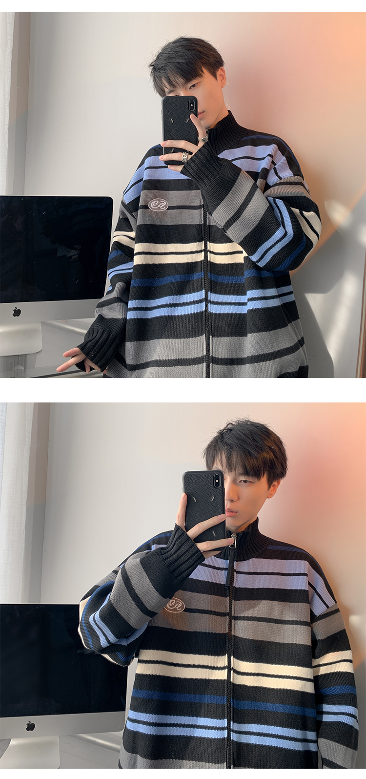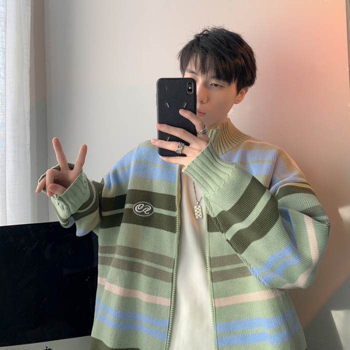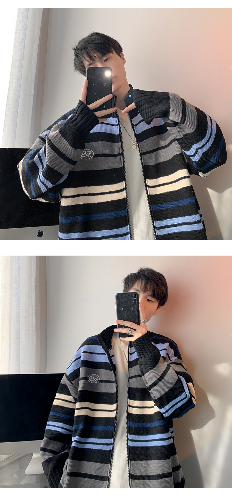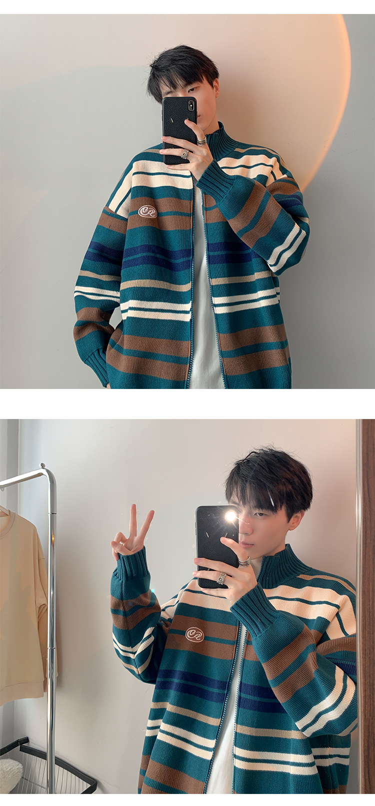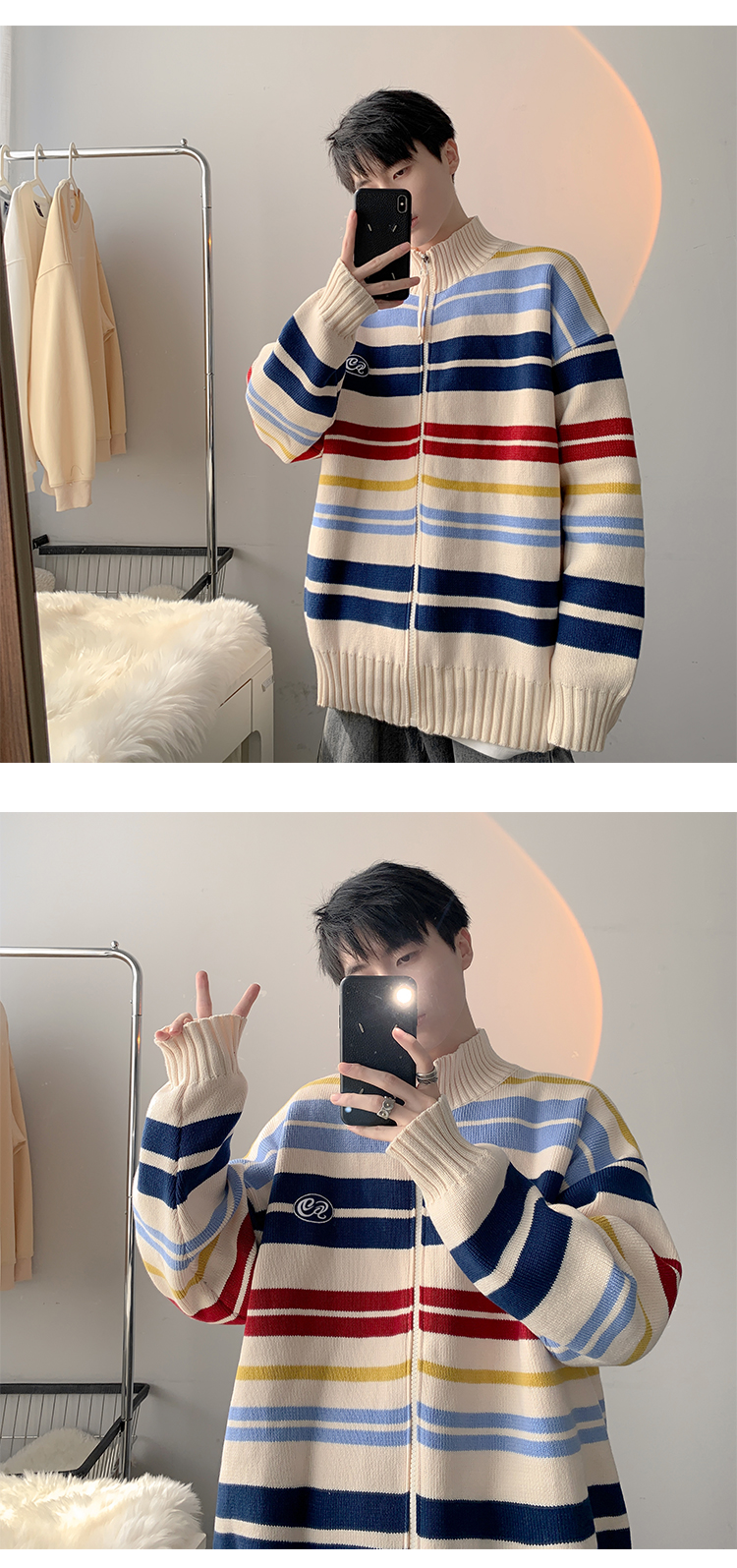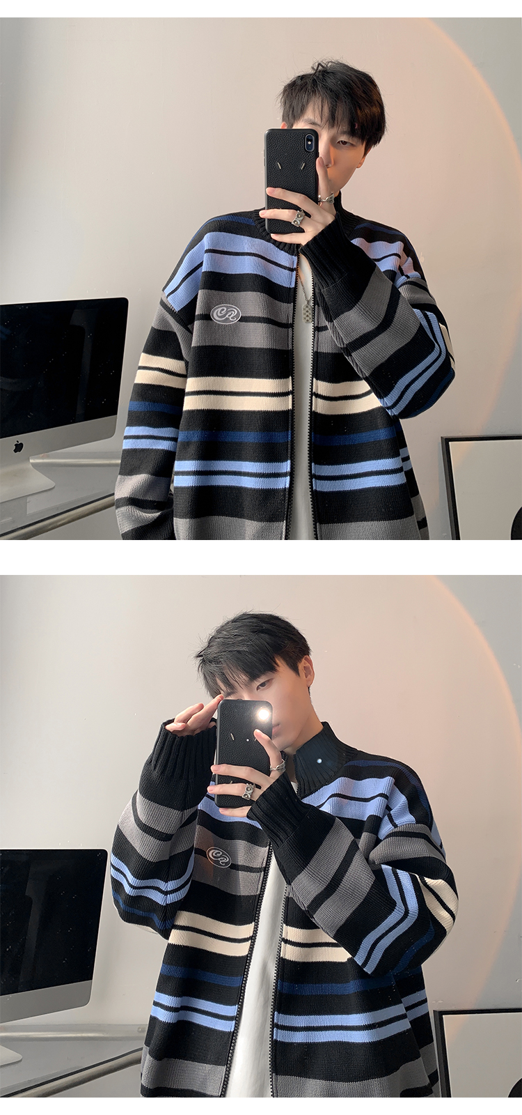 日系拼色條紋立領開衫毛衣男女潮牌ins情侶裝針織衫寬松秋冬外套