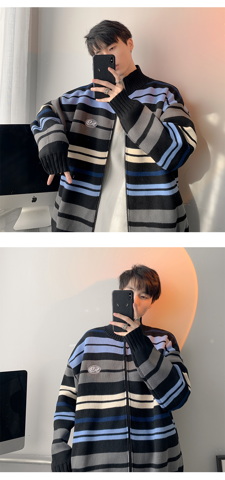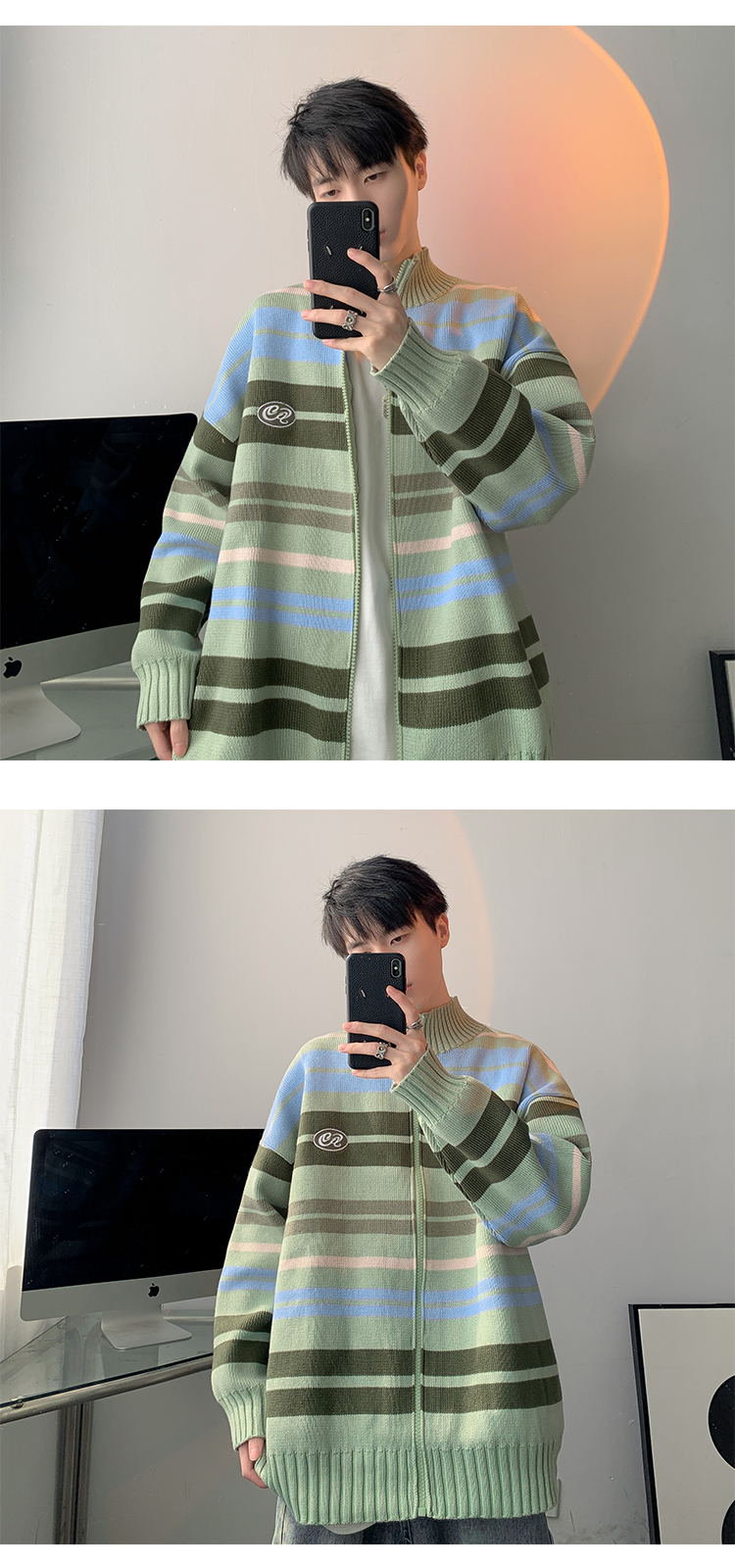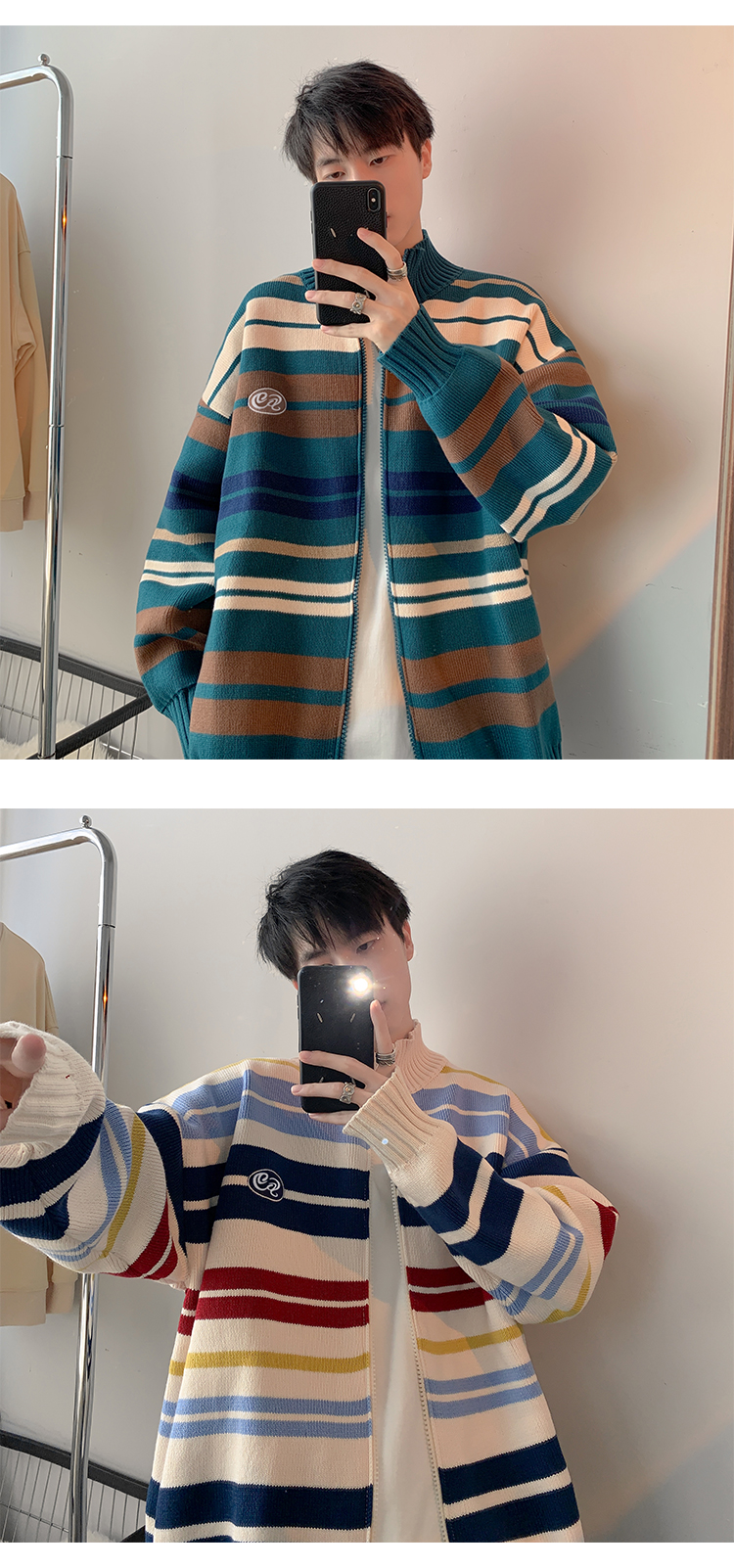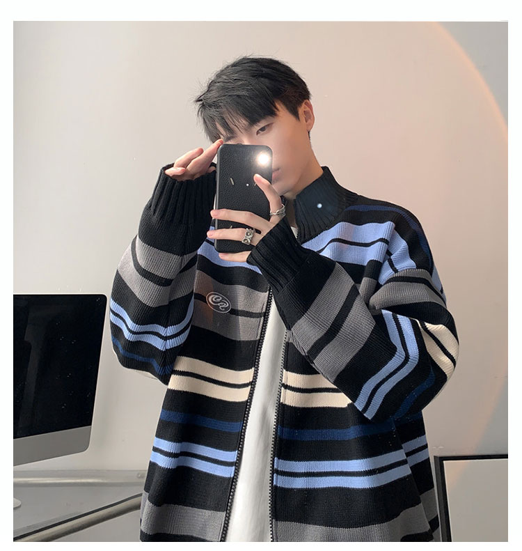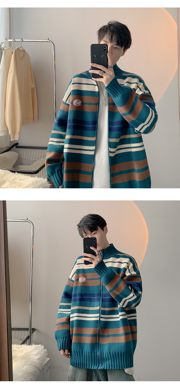 日系拼色條紋立領開衫毛衣男女潮牌ins情侶裝針織衫寬松秋冬外套