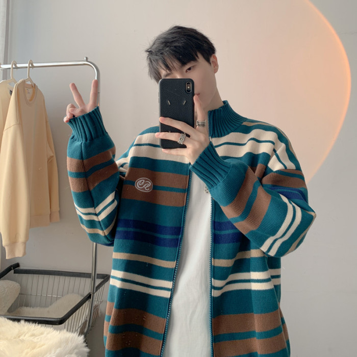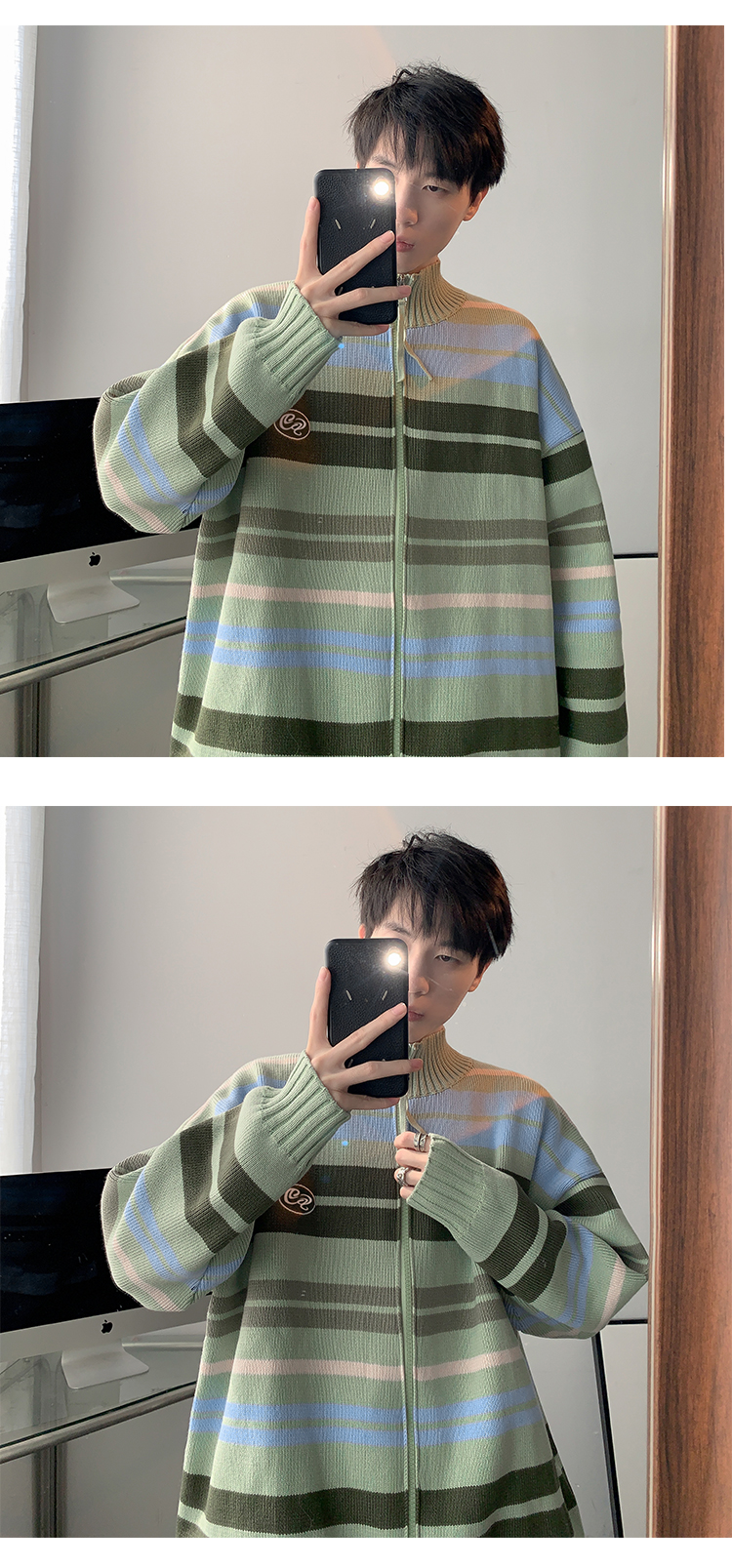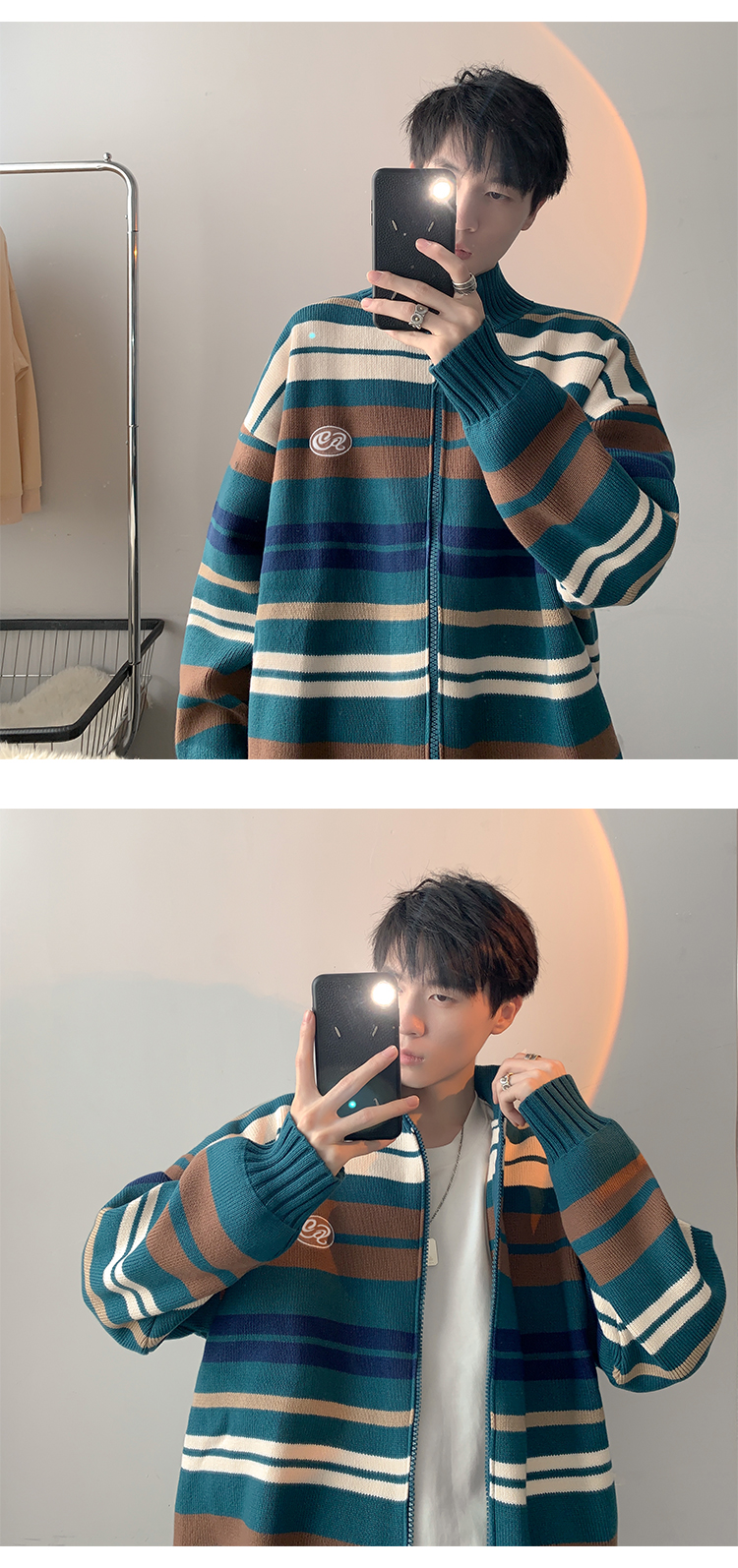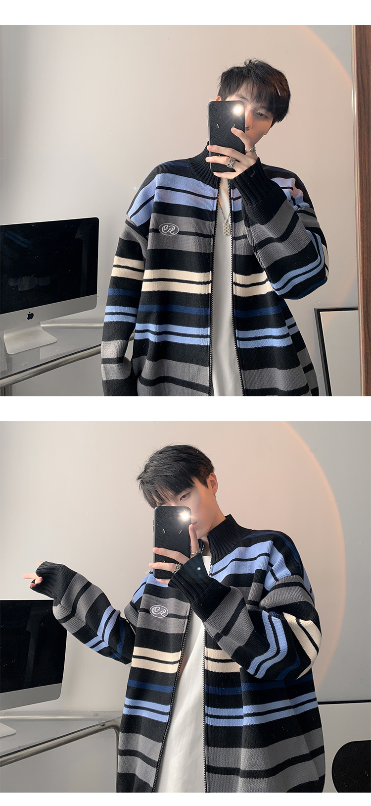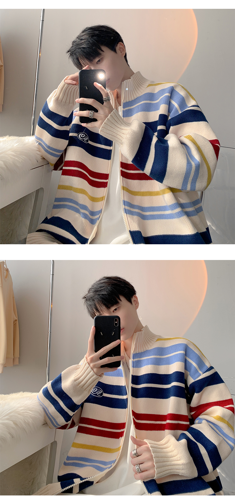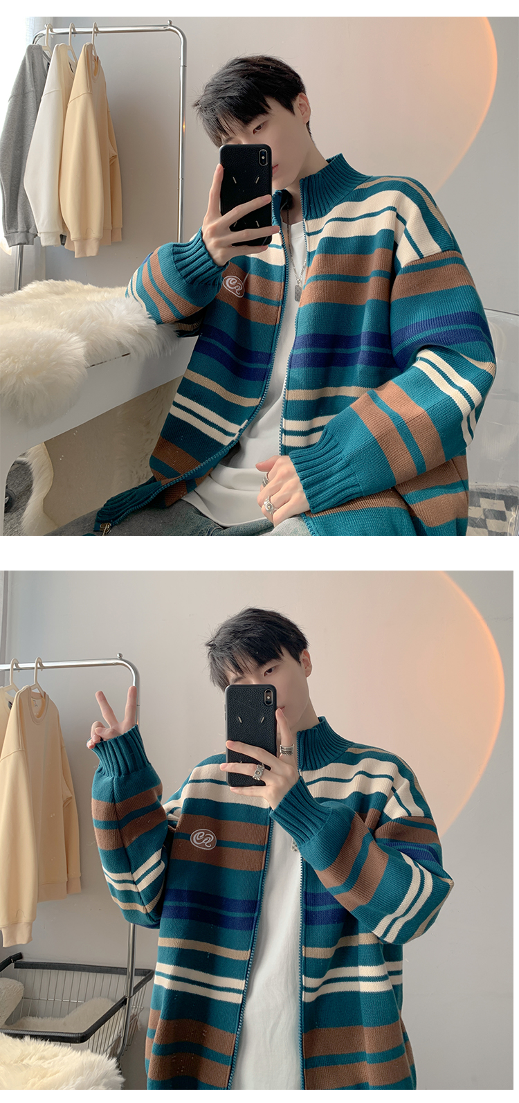 日系拼色條紋立領開衫毛衣男女潮牌ins情侶裝針織衫寬松秋冬外套