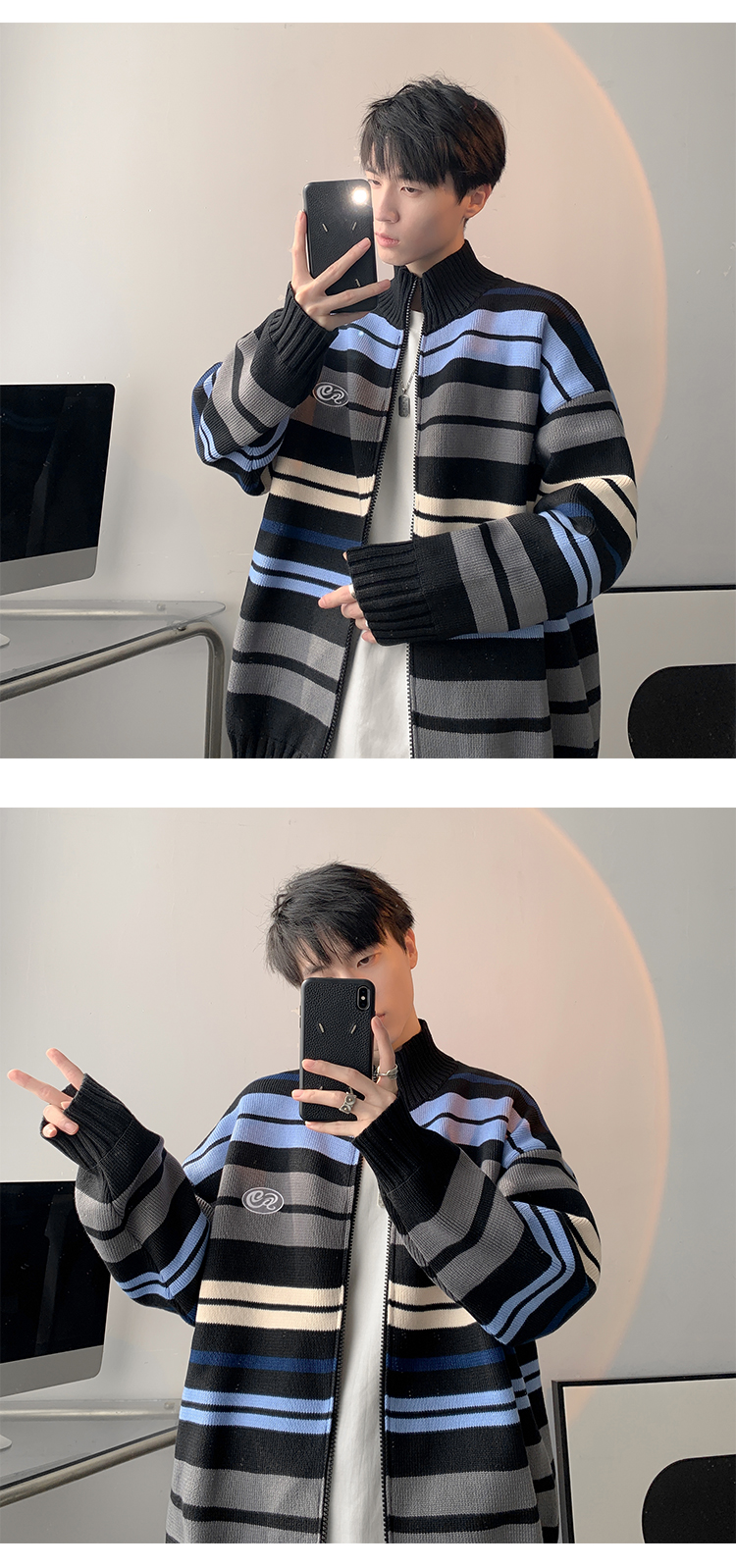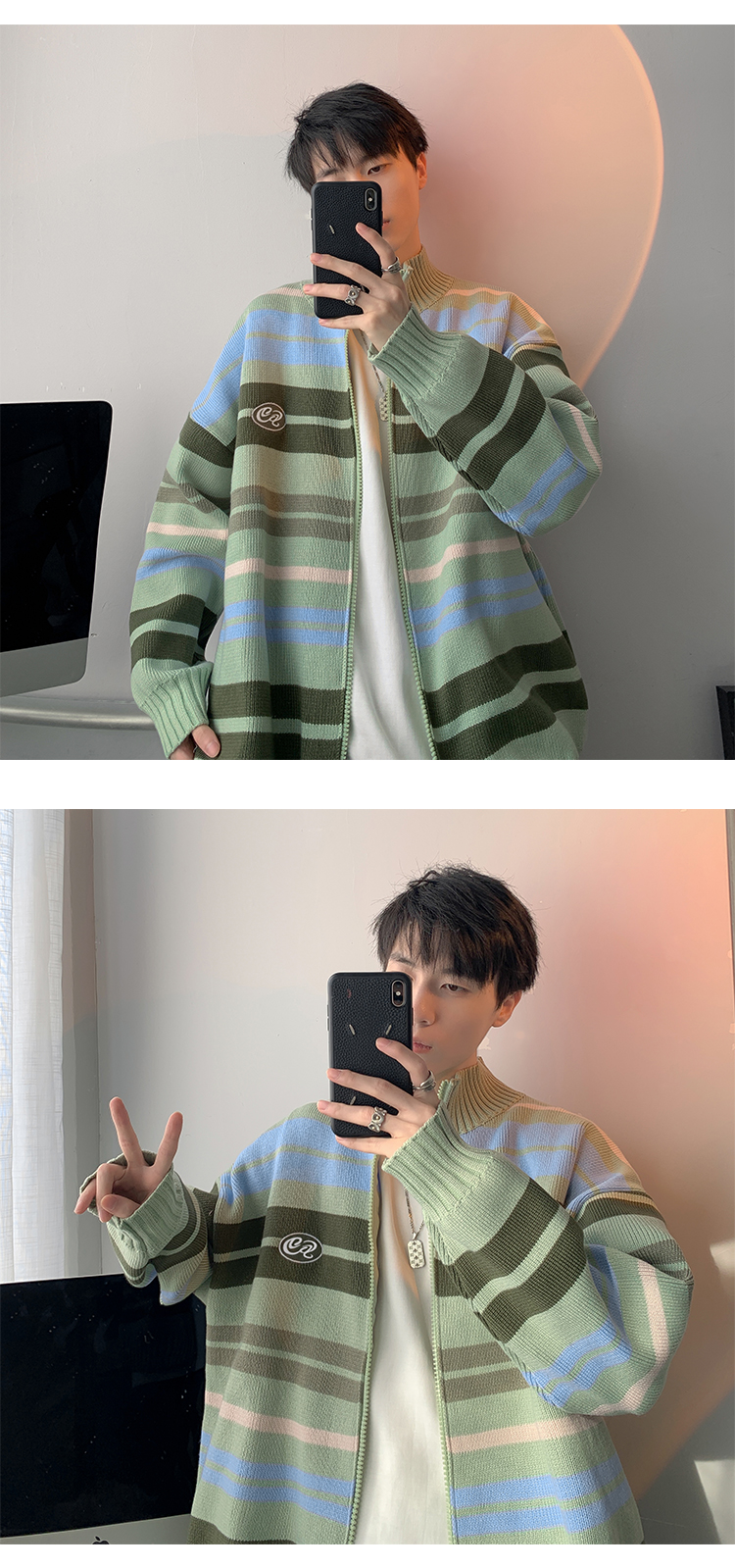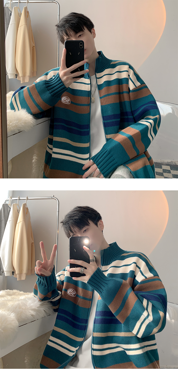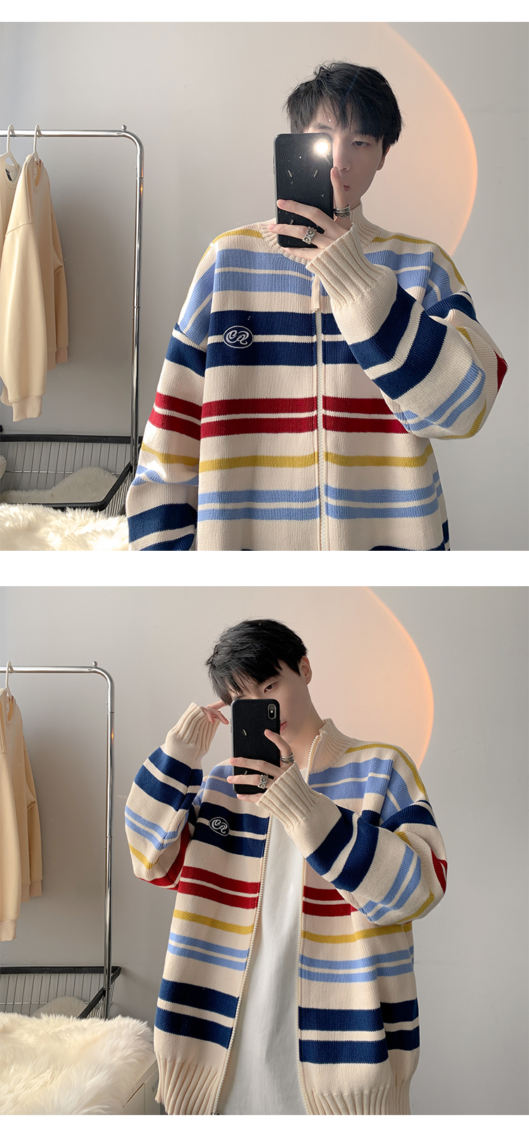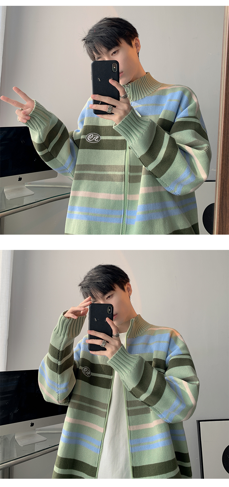 日系拼色條紋立領開衫毛衣男女潮牌ins情侶裝針織衫寬松秋冬外套